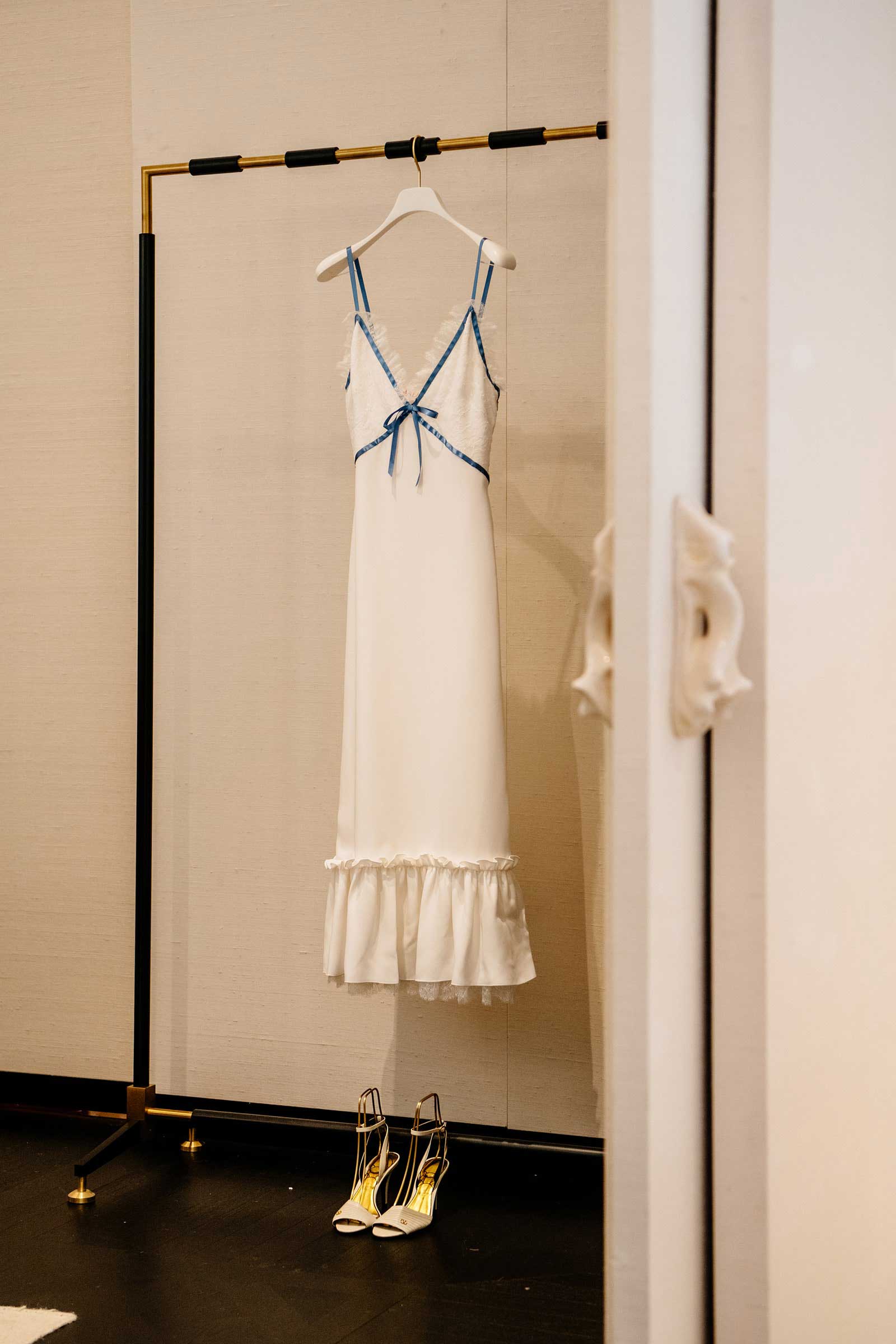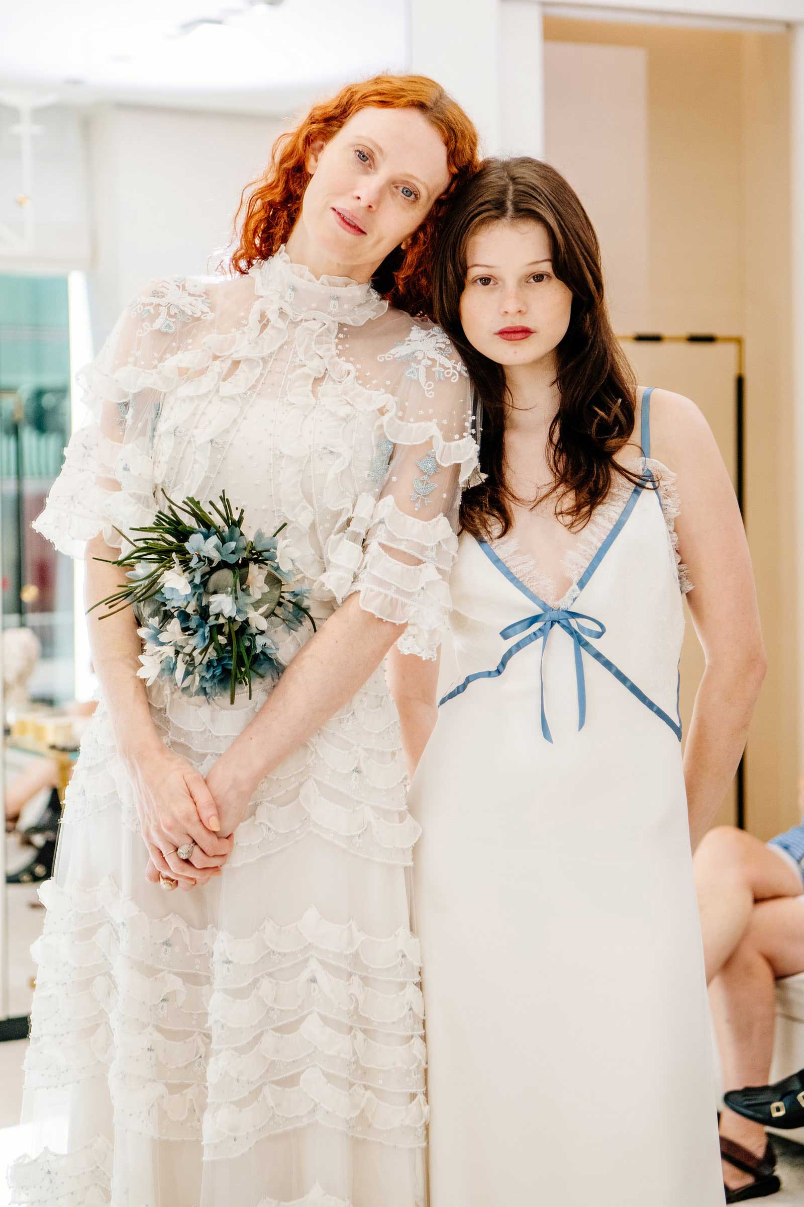 After stepping out of the changing room in her dress, Karen modeled the custom piece for her daughter and father as well as the Valentino and Vogue teams. “I am not a girl who wants to be uncomfortable in clothes. That’s what I do for a living. This is precious cargo!” Karen said, admiring the garment’s intricate embroideries. “We talked about having a pop of color—would it be a green or a yellow?” she recalled. “And actually, I was like: ‘It should be a pop of blue somewhere,’ for the traditional ‘something borrowed, something blue.’”