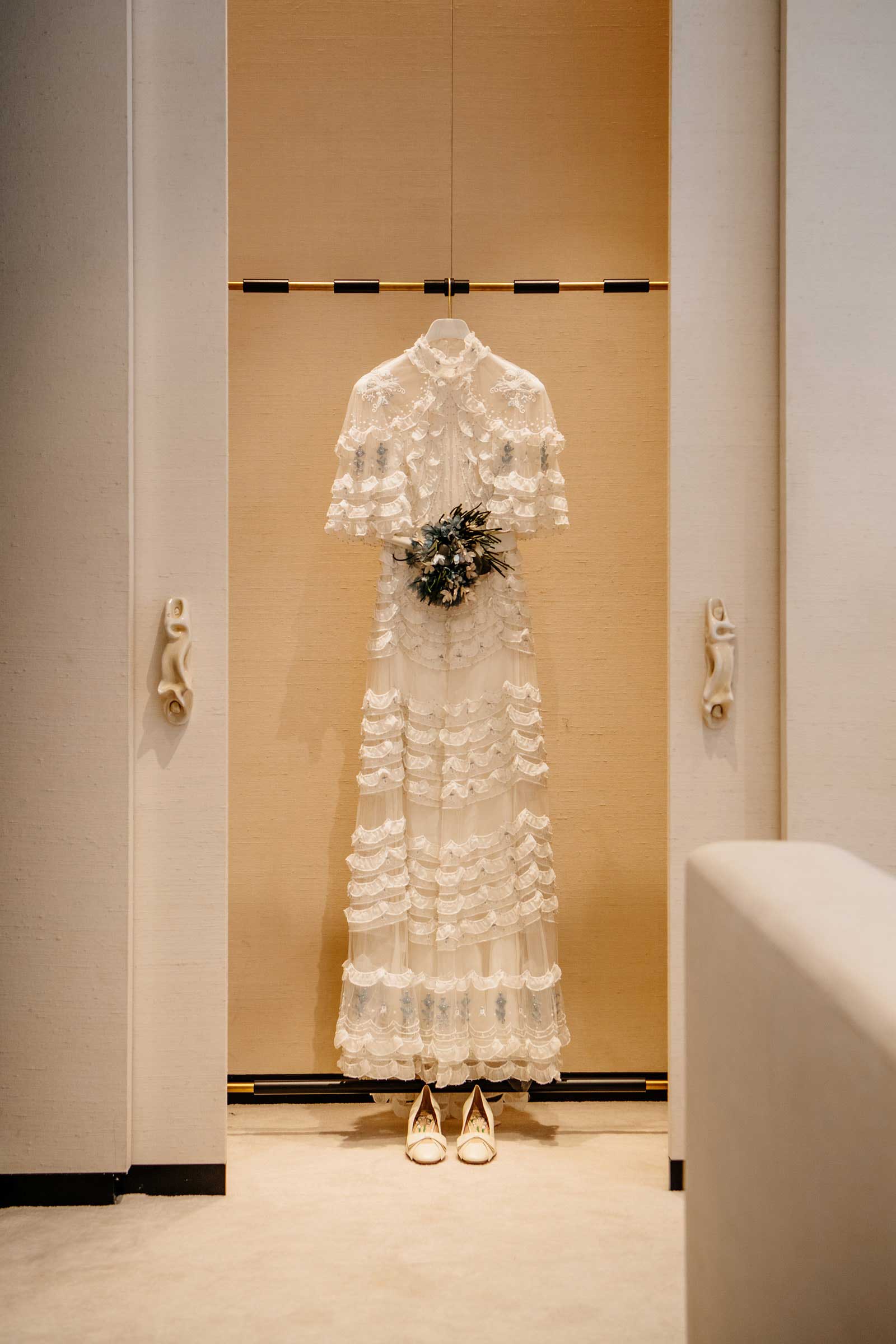 Months before setting foot into the atelier, the bride—who was discovered as a model at age 16 in Manchester and now has over 50 magazine covers to her name—wrote a love letter of sorts to Valentino creative director Alessandro Michele asking him to create her wedding dress, the first ever produced by the designer for the house. “I’ve known Alessandro for many years, and I knew his touch would be so dreamy and magical and very me,” Karen says. “I wrote to him asking if he would make me a wedding dress and be a part of this special time in my life. Lucky for me, he happily agreed.”
