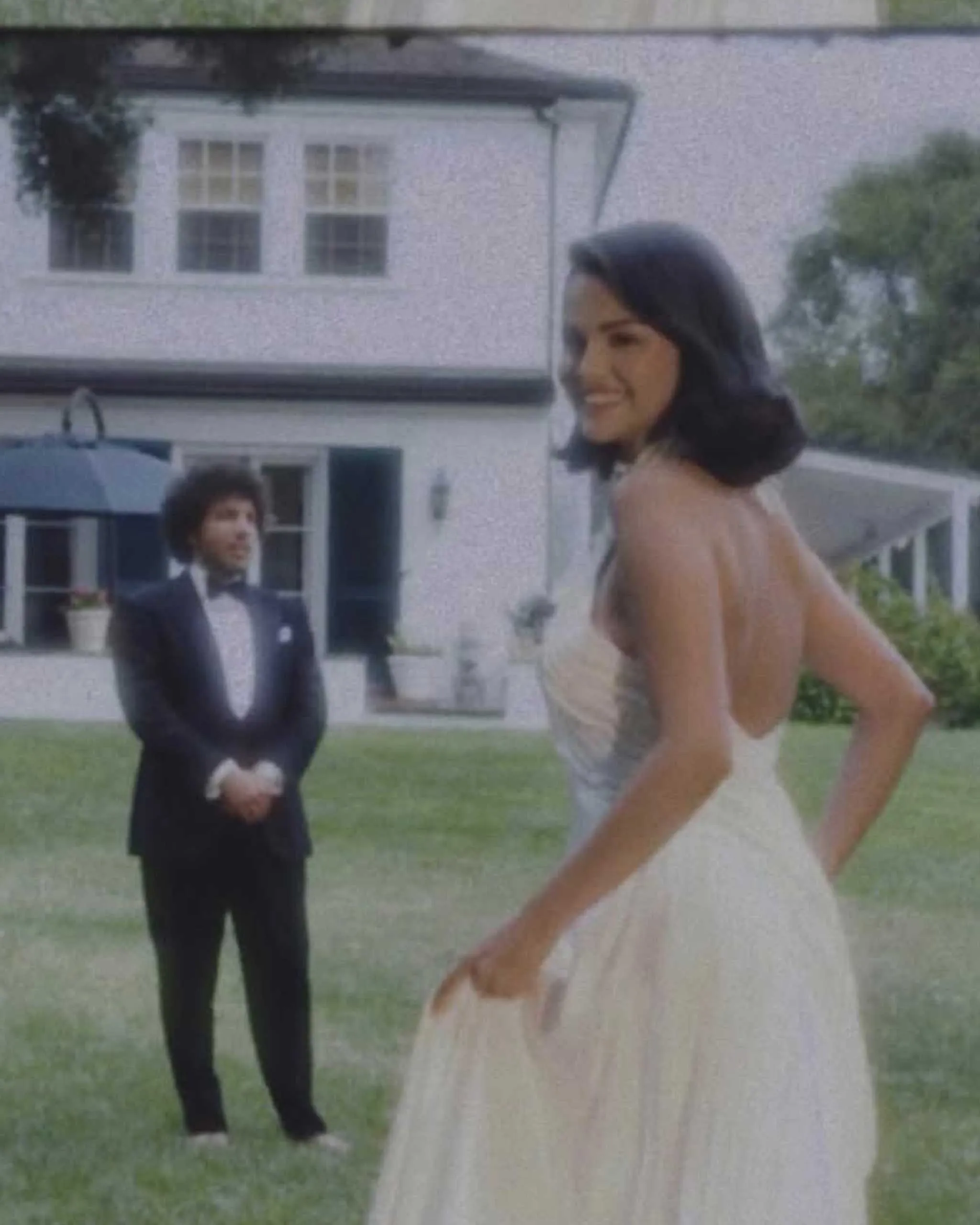The bride wore a custom hand-draped halter-neck satin dress with embroidery—and a small bouquet of lily of the valley—while the groom opted for a black tuxedo. Both were dressed by Ralph Lauren. Gomez’s platinum-and-diamond earrings were by Tiffany & Co. In a set of photos by photographer and longtime collaborator and friend Petra Collins, Gomez showed off the dress’s low, wrapped back and hourglass silhouette, fanning out her flowing silk skirt and long train.