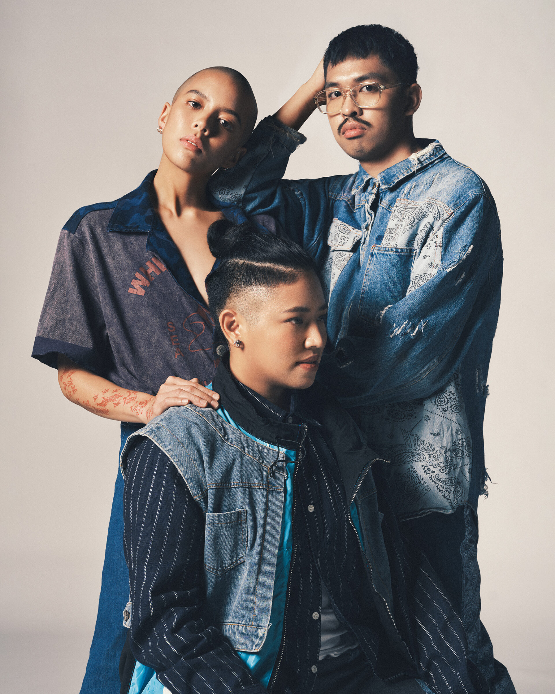 Sai Versailles wears a STRONGVILLAGE button-down and wrap trousers, H&M loafers, Cheska Cortez wears a STRONGVILLAGE vest and pants, BENCH tank top, CODE BLUE button-down from SM, ONITSUKA TIGER sneakers, Matt San Pedro wears a STRONGVILLAGE patchwork jacket and pants, SUNNIES STUDIOS glasses. Photo by Sharif Hamza
