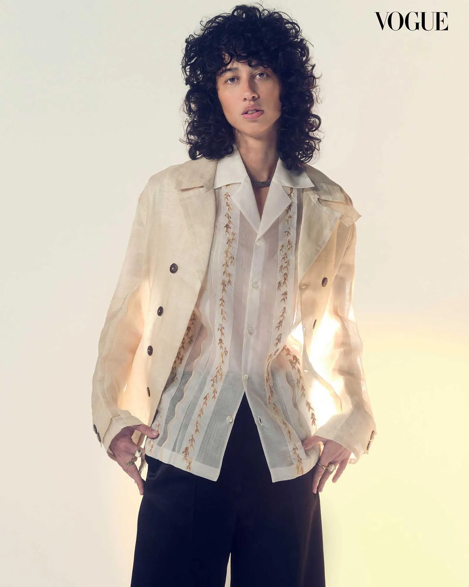 For her Vogue shoot, a key ensemble involved the barong, or traditional sheer embroidered menswear garment. The barong’s patterns are historically ornate and nature-inspired, often executed in the same hue as the textile. Modern interpretations have come to employ unconventional motifs or multi-colored threads, as was the case for the pieces sent by the Vogue team from Manila: Kelvin Morales’ pleated School of Fish barong and Mark Wilson’s abaca double-breasted jacket with Indian cotton gauze lining and coconut buttons. Humberto Leon, the Opening Ceremony alum and Katseye creative director, who was also behind the styling for this shoot, layered both and paired them with heeled boots for a novel take.