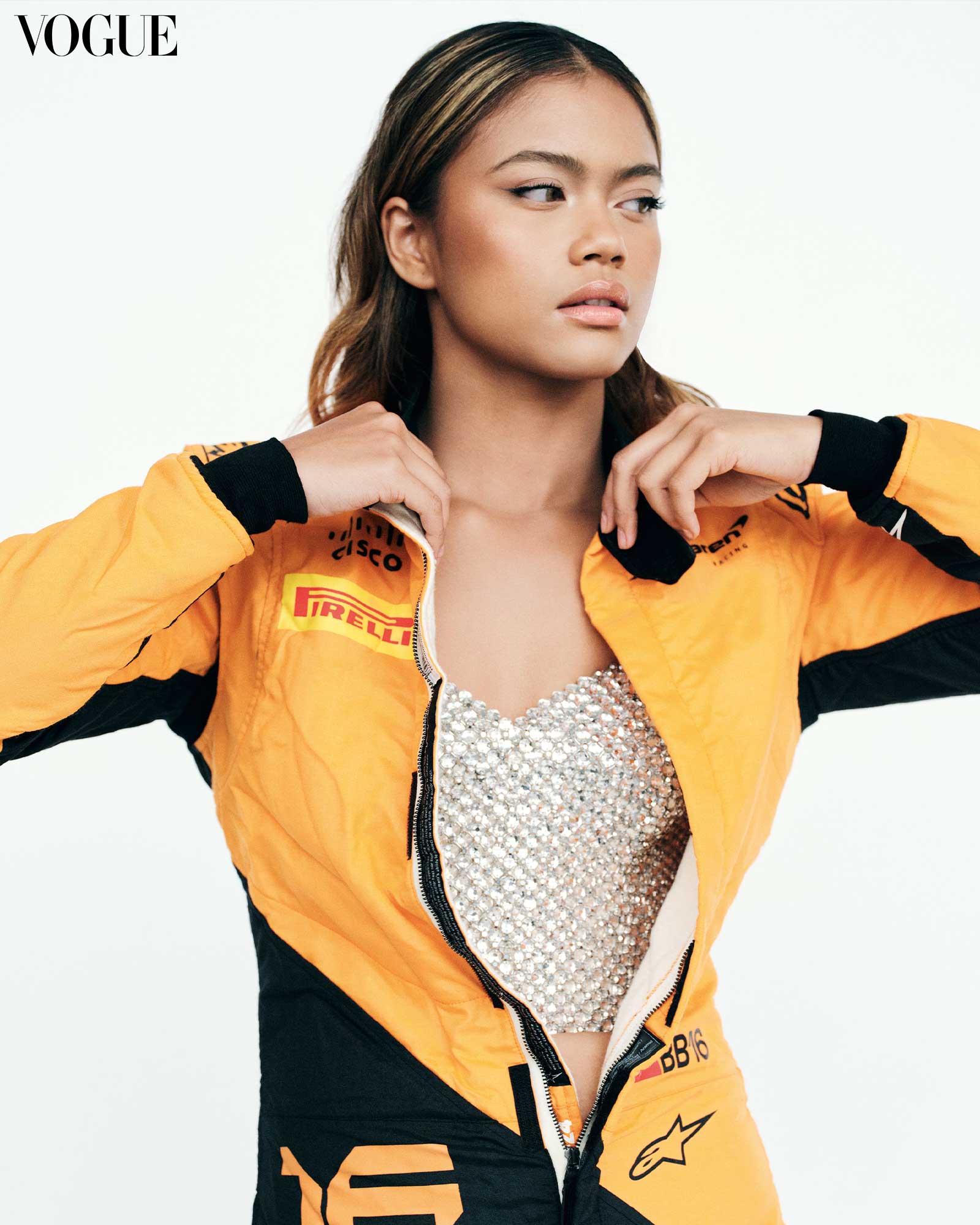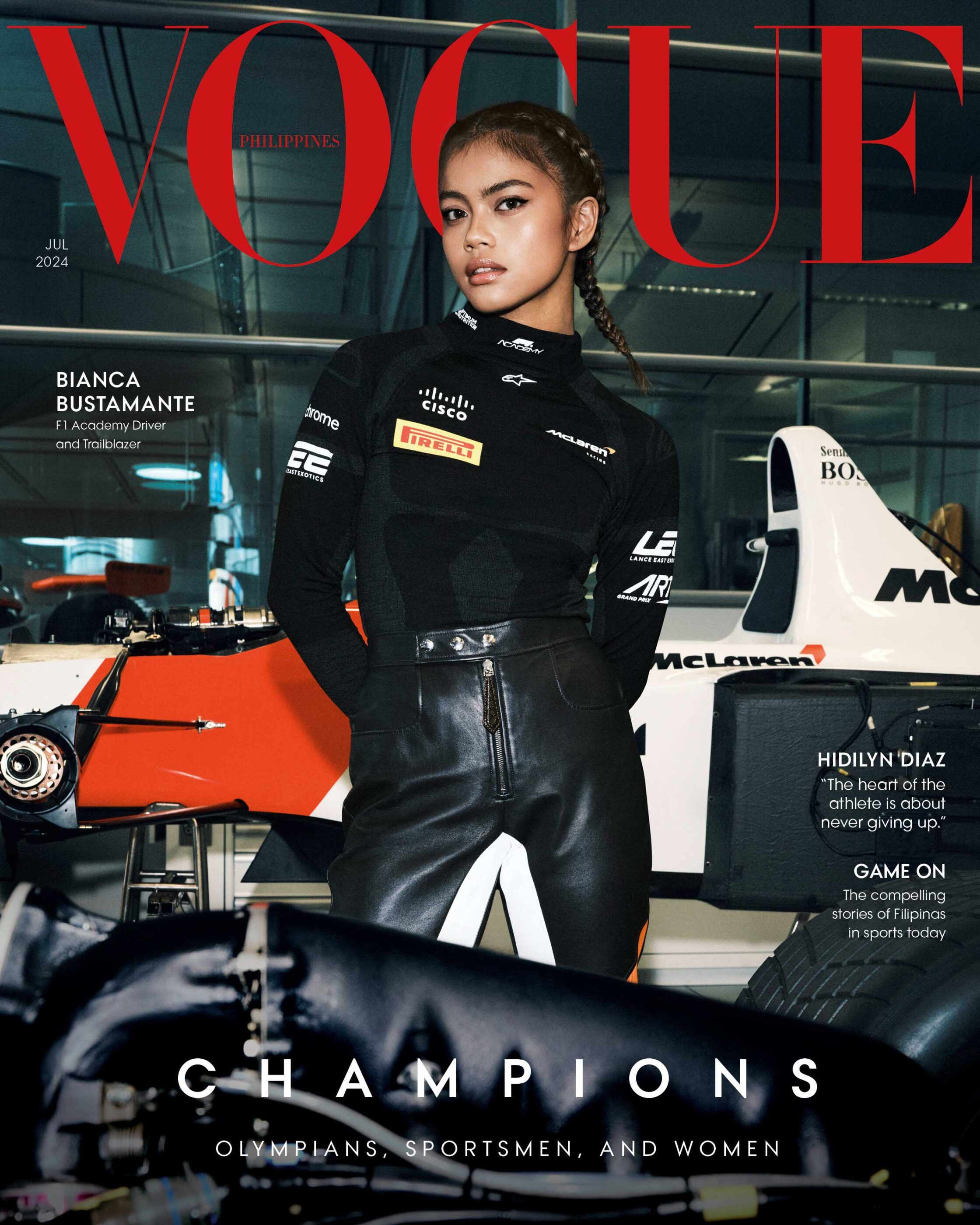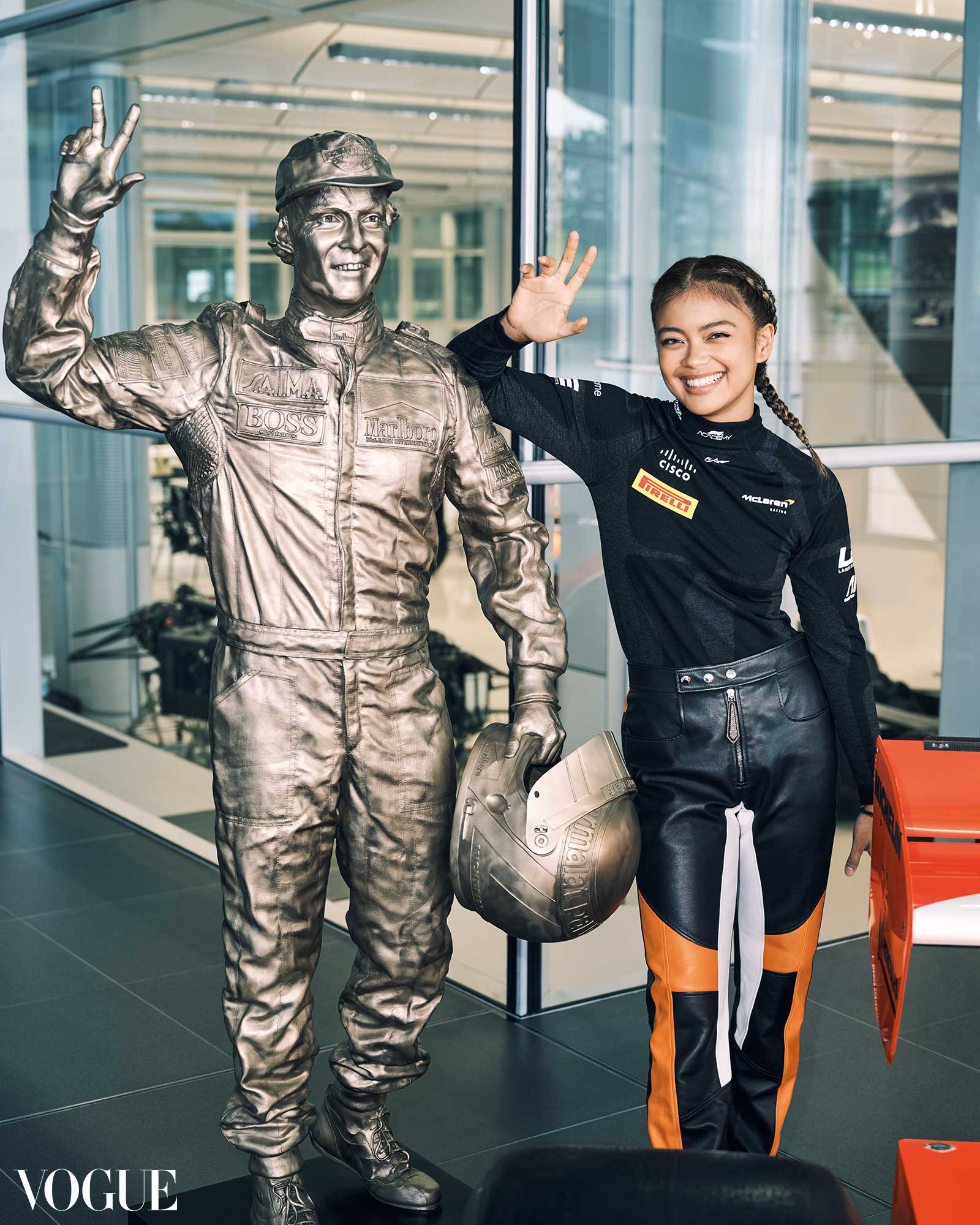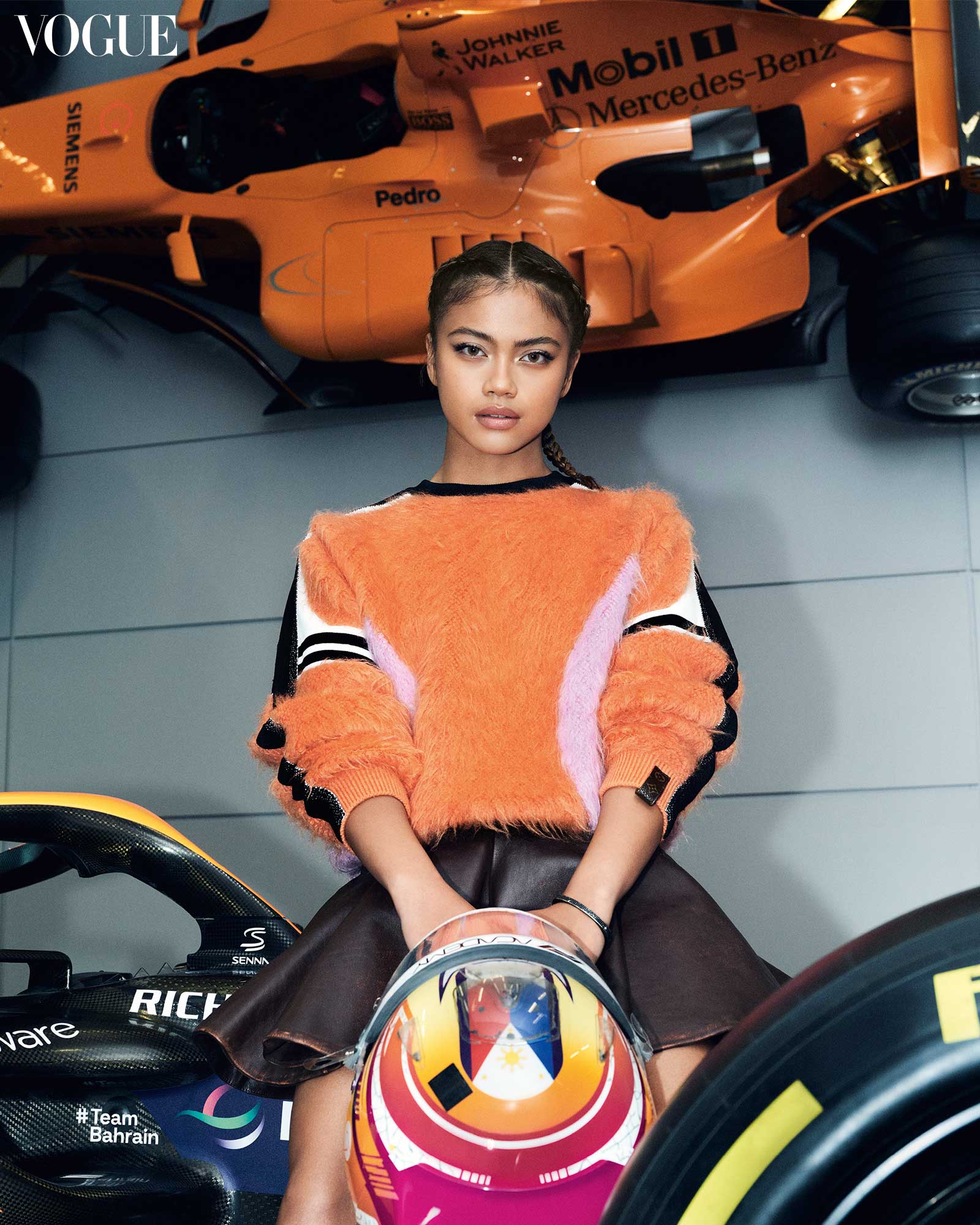 A year later, Vogue Philippines meets Bianca in the UK. The setting of the shoot is now the massive, ultramodern headquarters of the McLaren Technology Centre in Woking, England. She poses with the legendary Ayrton Senna’s red and white McLaren, a car that has the F1 fanboys in the crew geeking out. In the span of one year, Bianca has gone from having no seat and no money to becoming the first female driver in the McLaren Driver Development Program, among whose notable graduates include her role model, Lewis Hamilton.