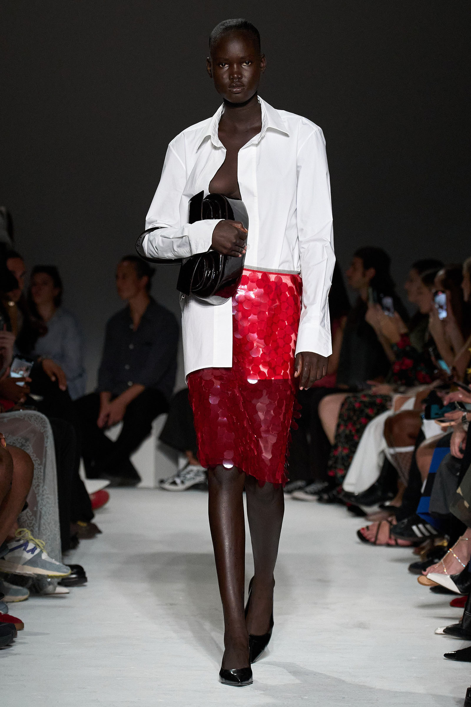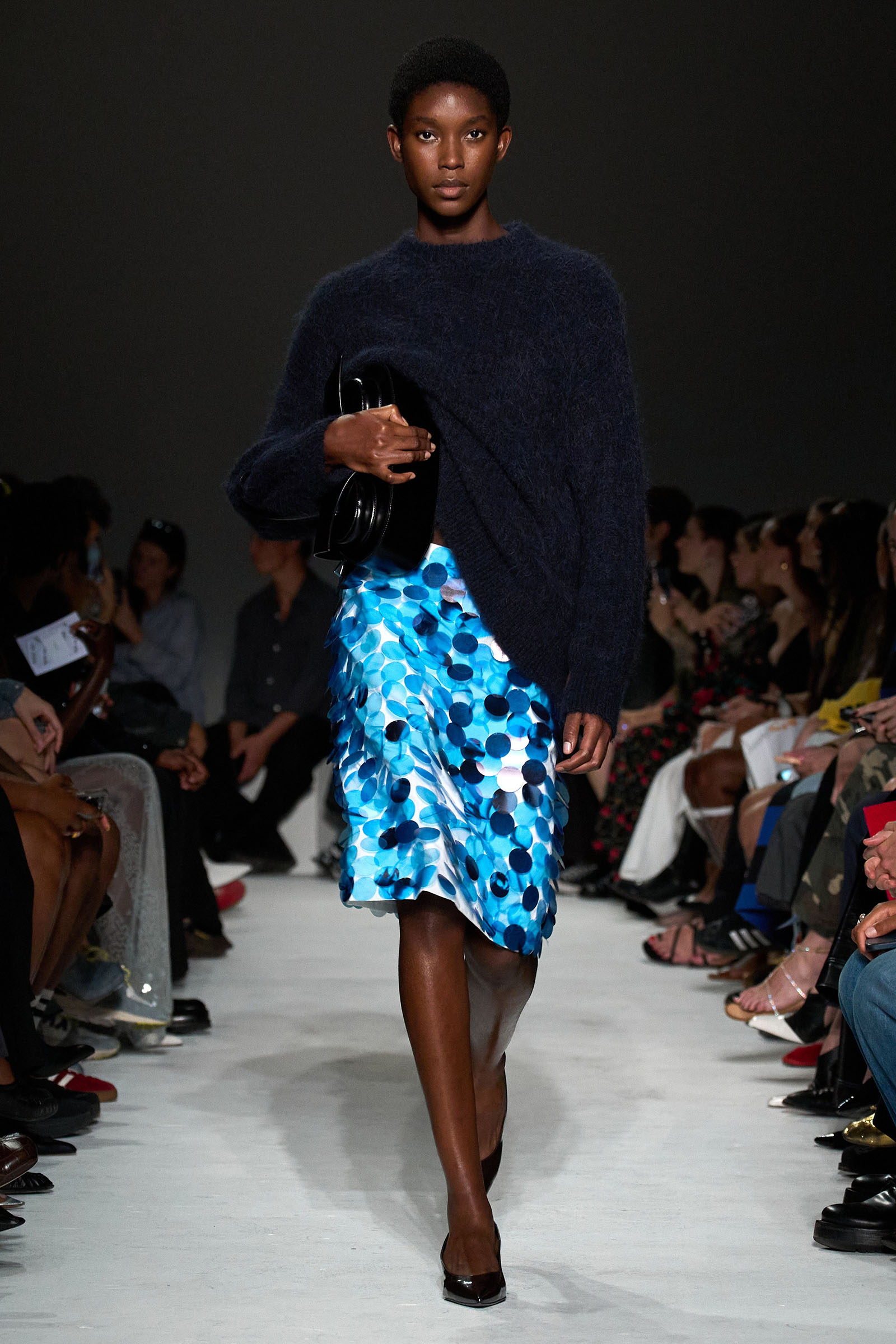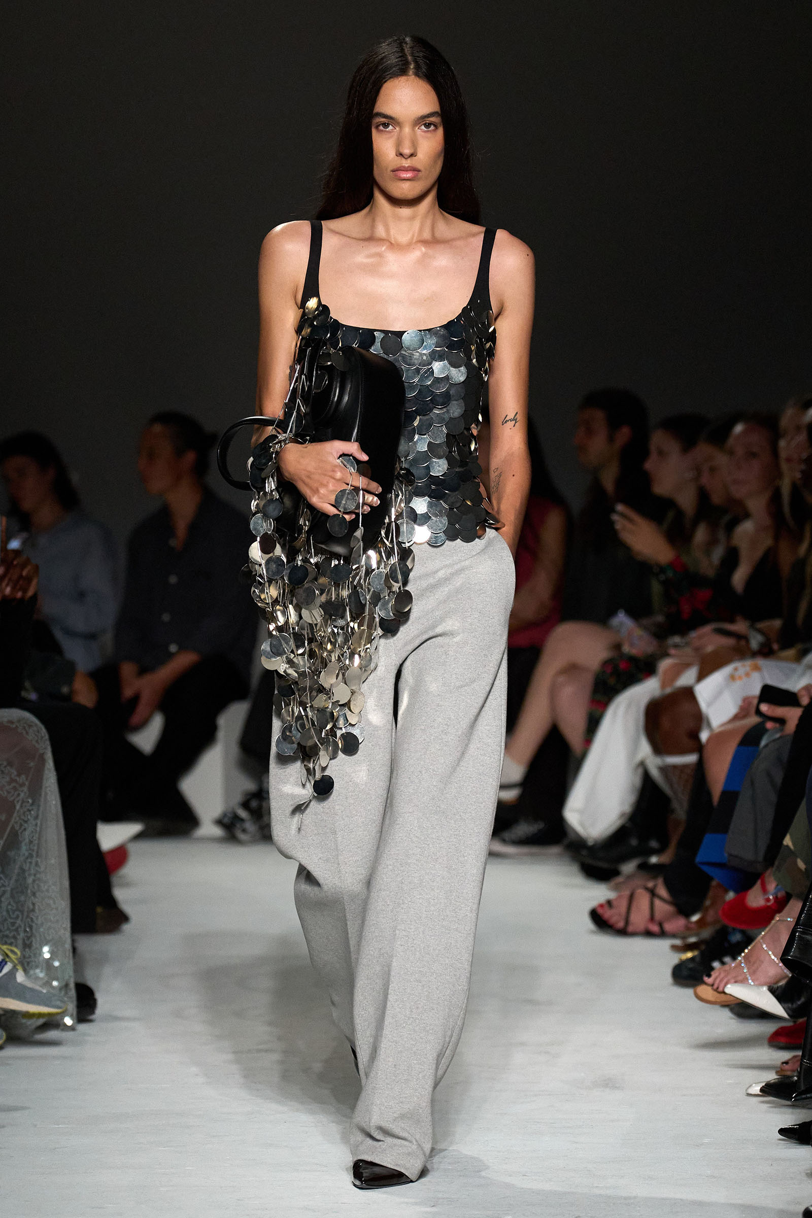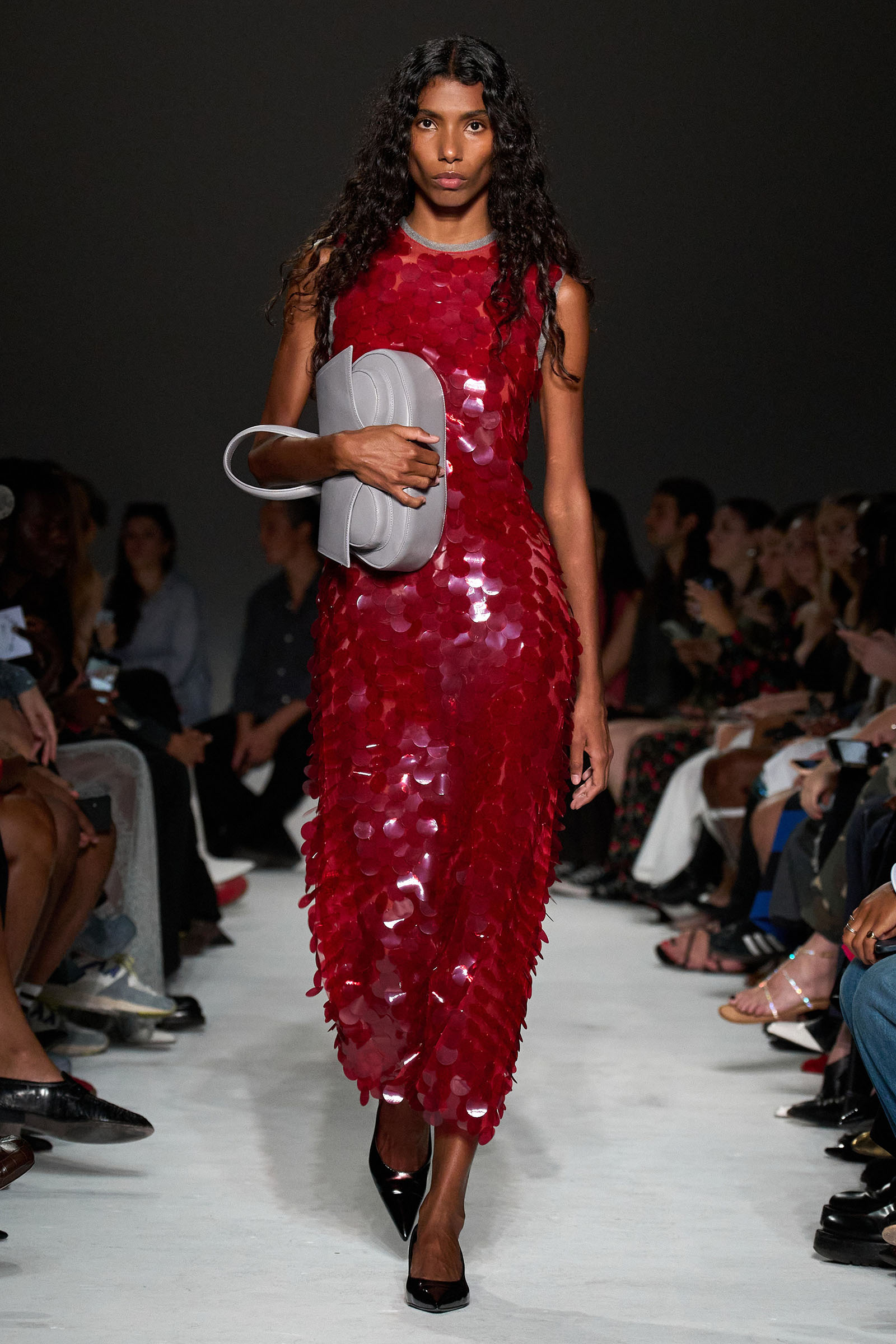 Equally notable was the looser, more relaxed styling this season: crisp Wall Street-inspired shirting paired with those jangly sequined skirts; sweatshirt fabrics transformed into elegant, meticulously-cut trousers; and new, oversized versions of the Kikka bag that the models held tightly to their chests. “We wanted it to be a shape that the models could carry like that,” Capaldo smiled. “Keeping Kikka close.” His cinematic starting point may have been a little more esoteric than usual, but Capaldo transformed it into clothes with a very practical appeal. Full speed ahead.
