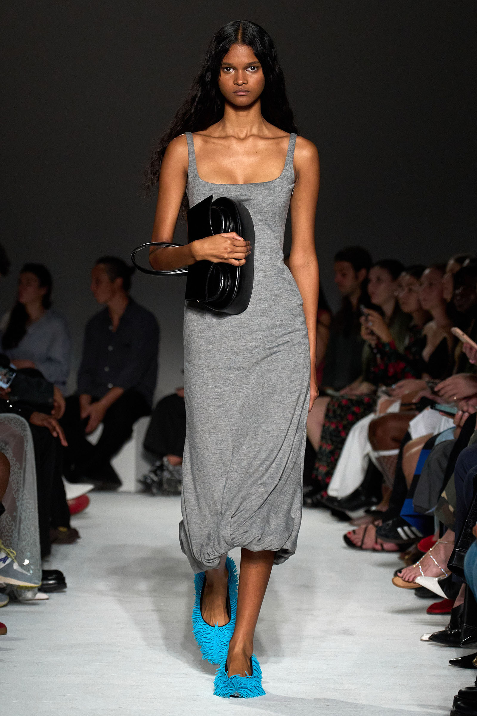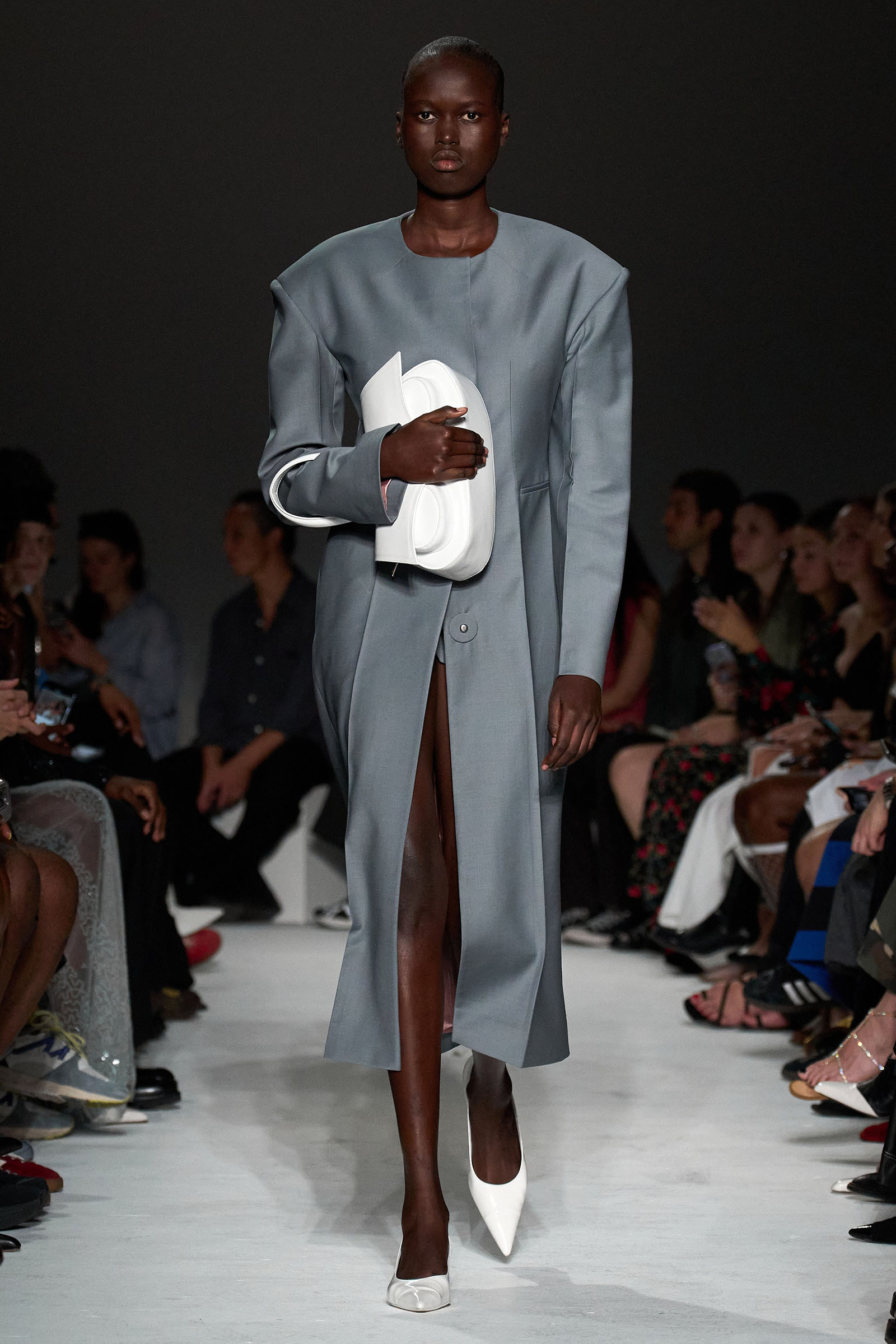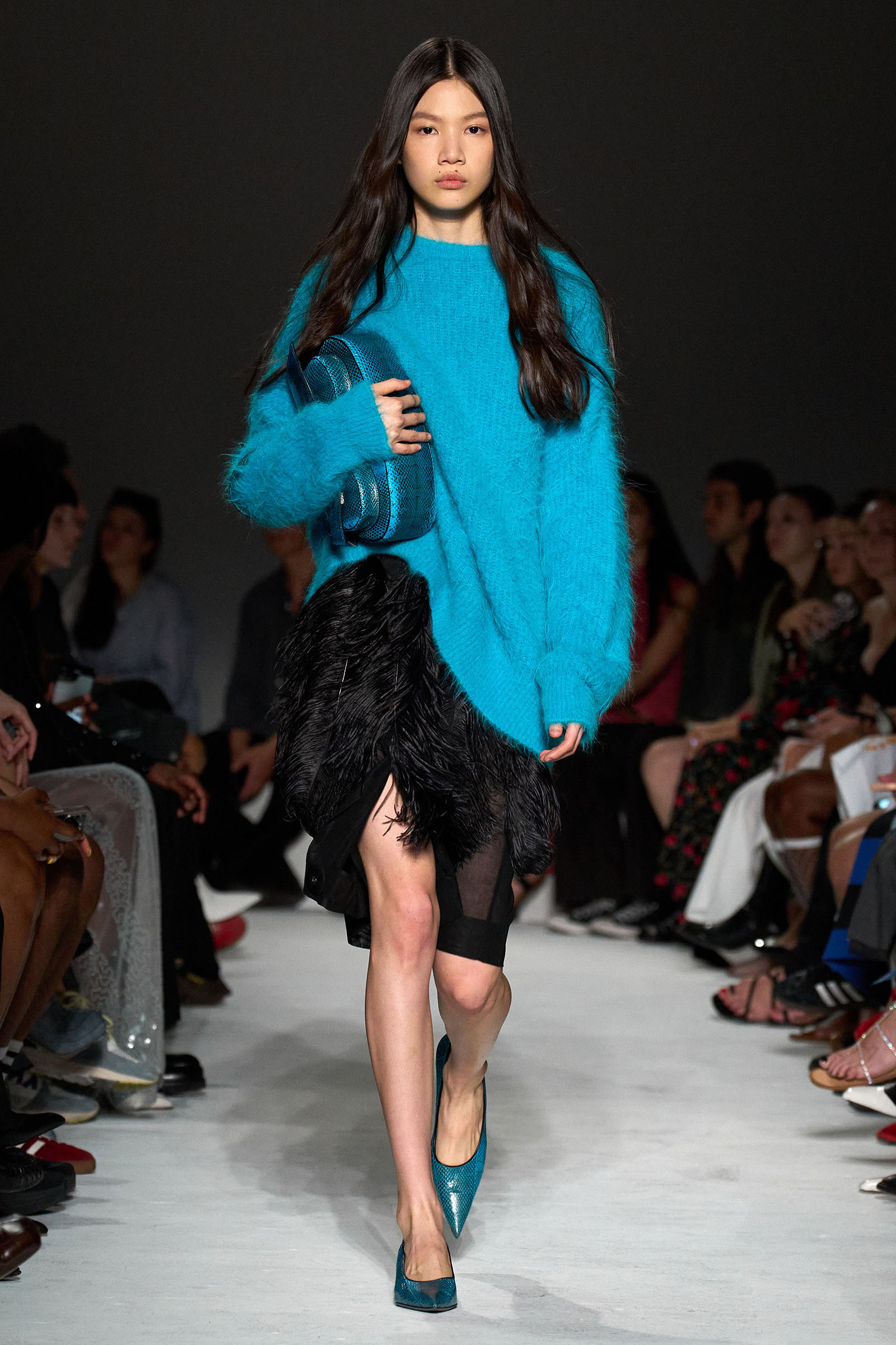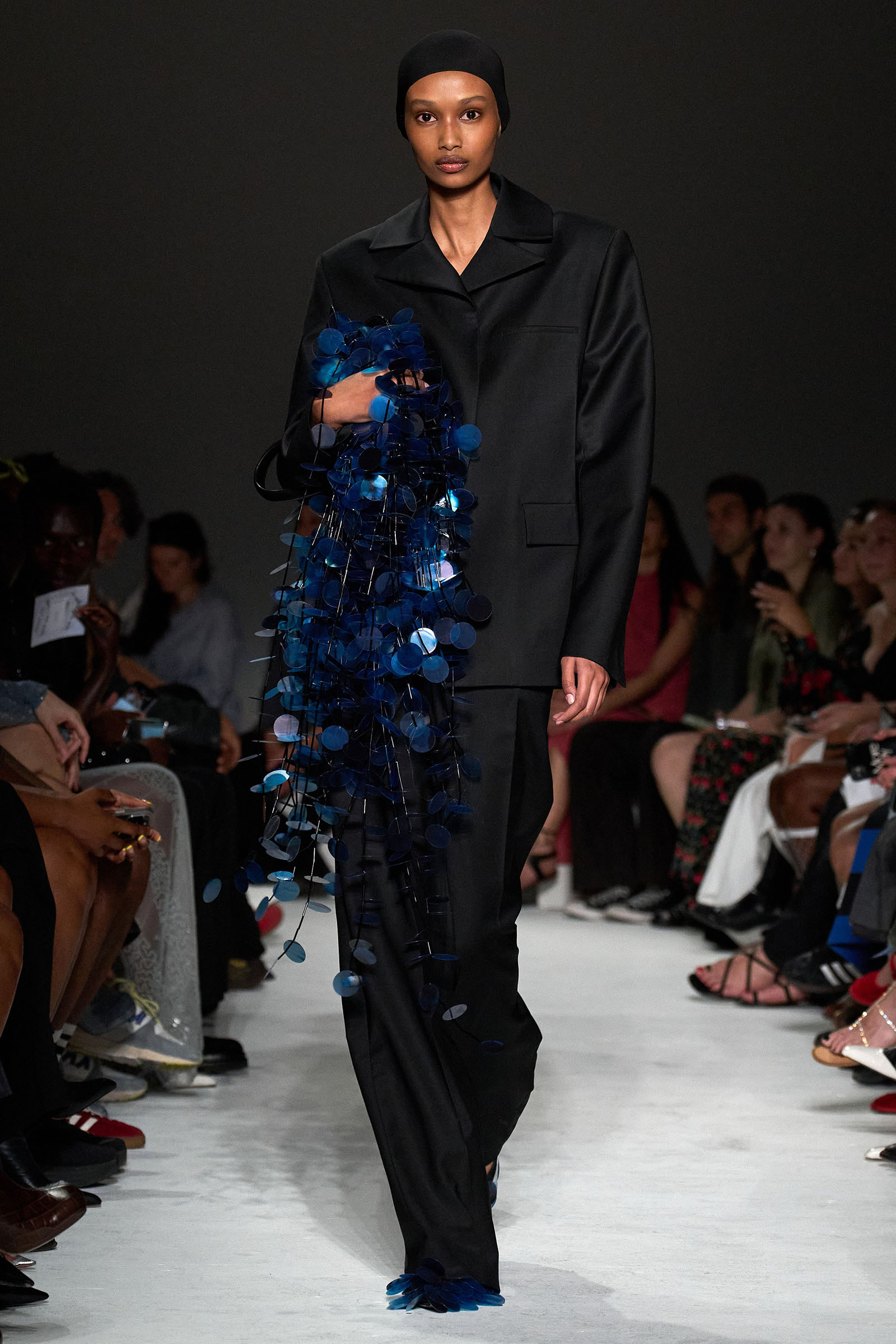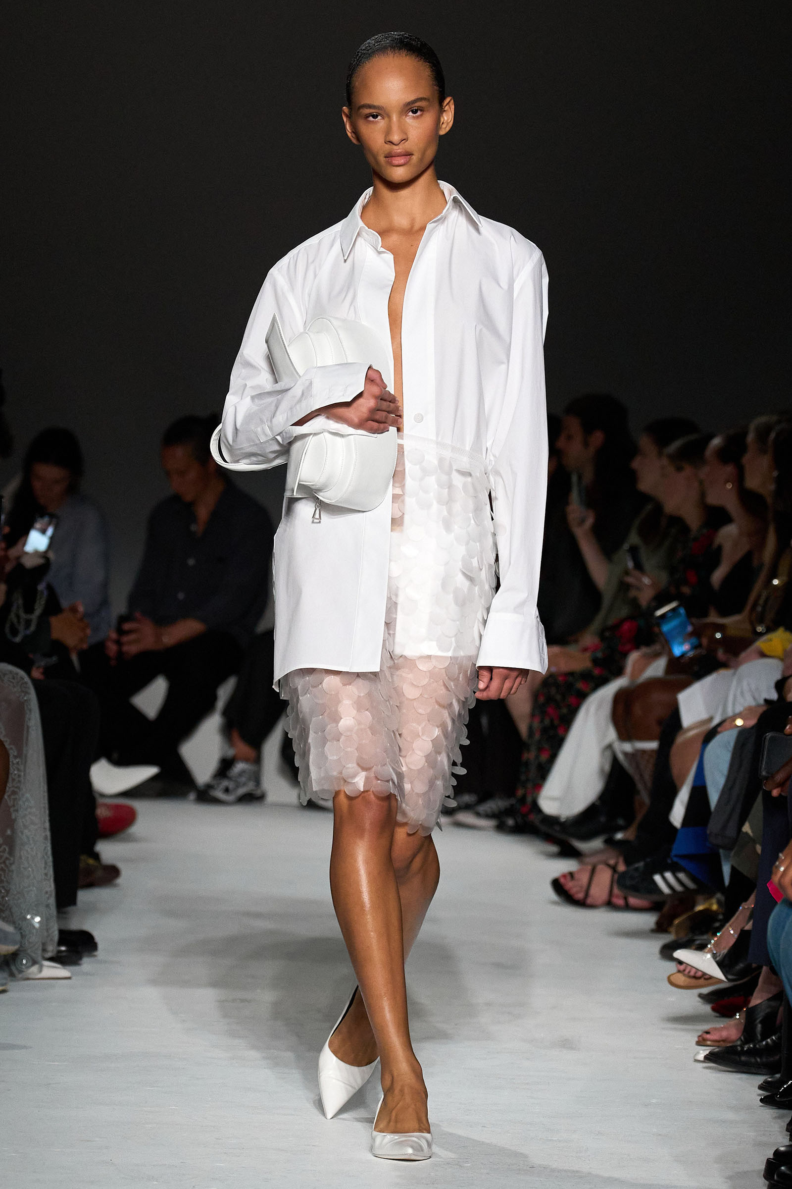 Equally notable was the looser, more relaxed styling this season: crisp Wall Street-inspired shirting paired with those jangly sequined skirts; sweatshirt fabrics transformed into elegant, meticulously-cut trousers; and new, oversized versions of the Kikka bag that the models held tightly to their chests. “We wanted it to be a shape that the models could carry like that,” Capaldo smiled. “Keeping Kikka close.” His cinematic starting point may have been a little more esoteric than usual, but Capaldo transformed it into clothes with a very practical appeal. Full speed ahead.