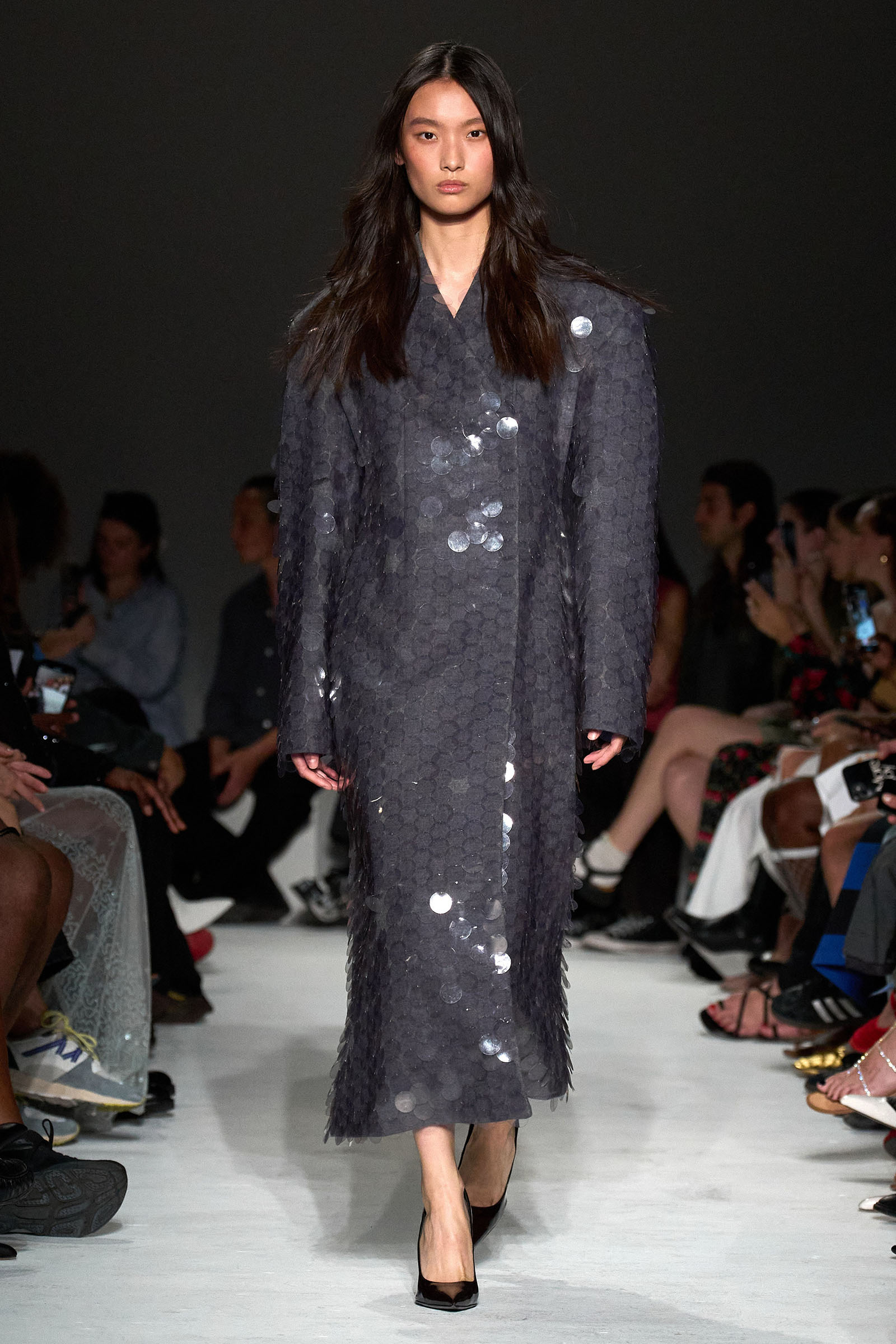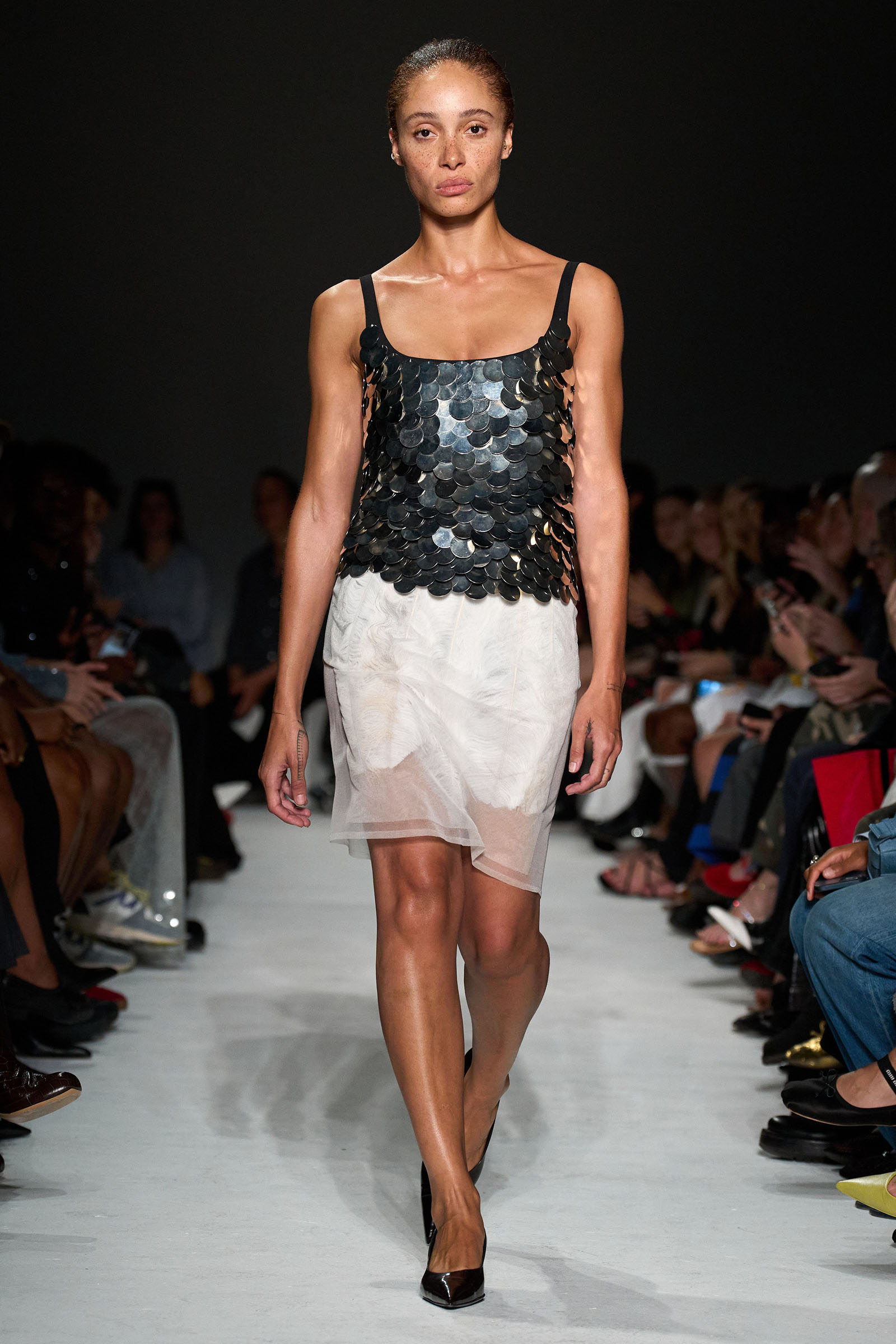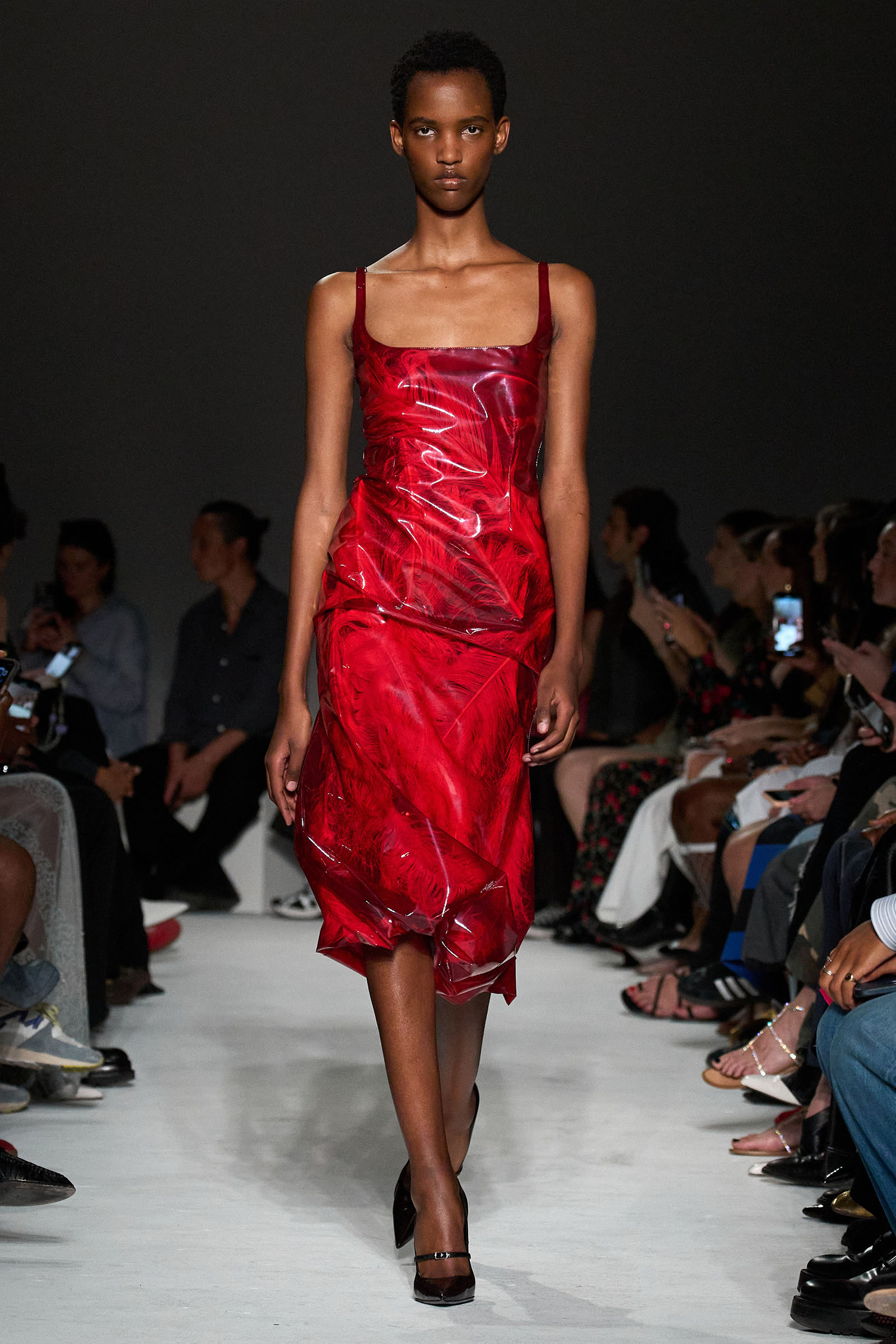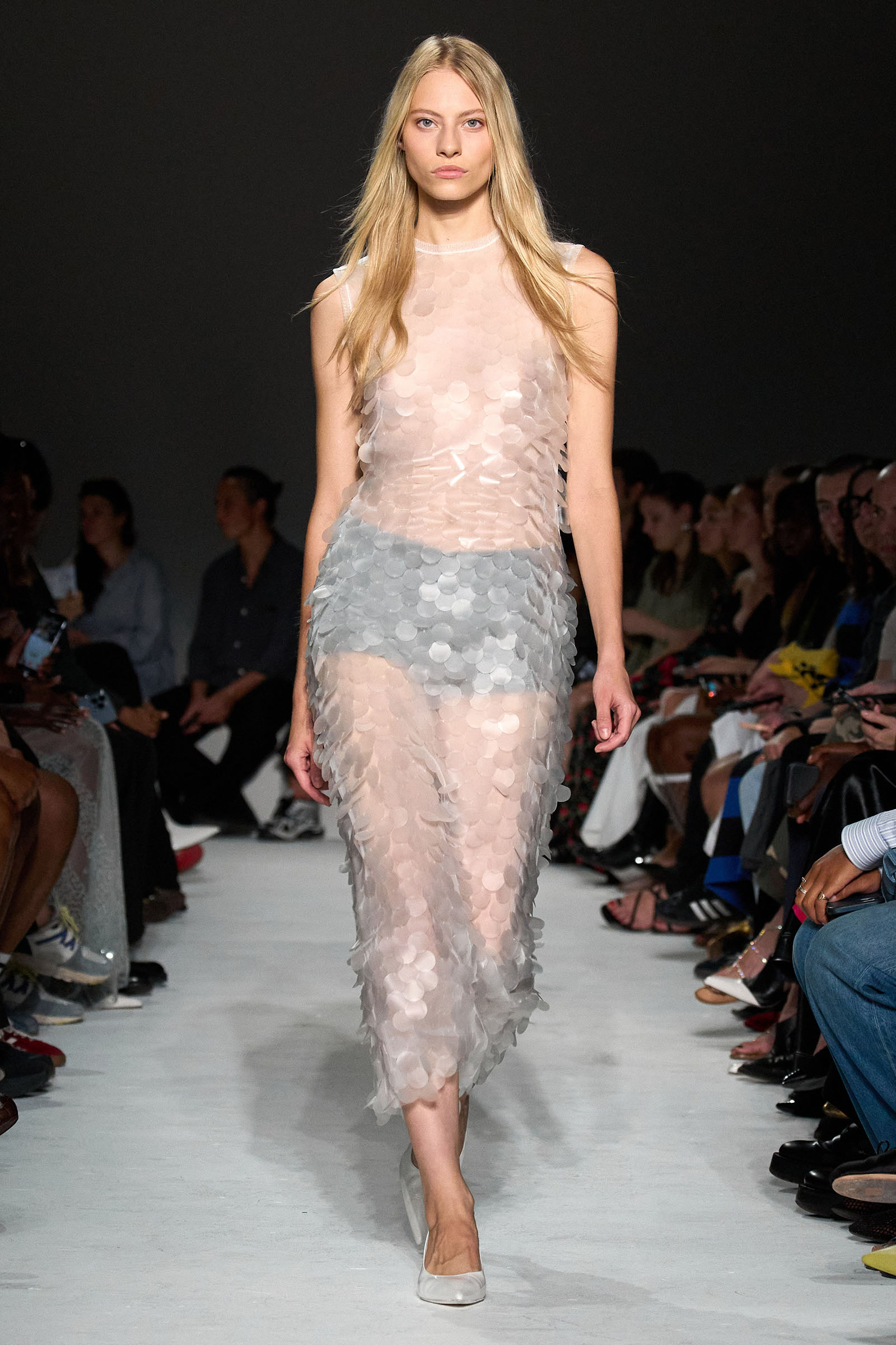 The first double take arrived early, with shimmering skirts and dresses covered in paillettes that revealed themselves to be made from translucent latex, beginning in white before moving into delicate shades of red, blue, and gray. Towards the end, a trio of looks appeared (at least from a distance) to be made of oversized silvery sequins—before, that is, the models walked by and you heard the unmistakable rustle of metal—while shoes were covered with fluttering circular cut-outs that featured graphics Capaldo lifted from a Japanese book he picked up about Lynch’s film.