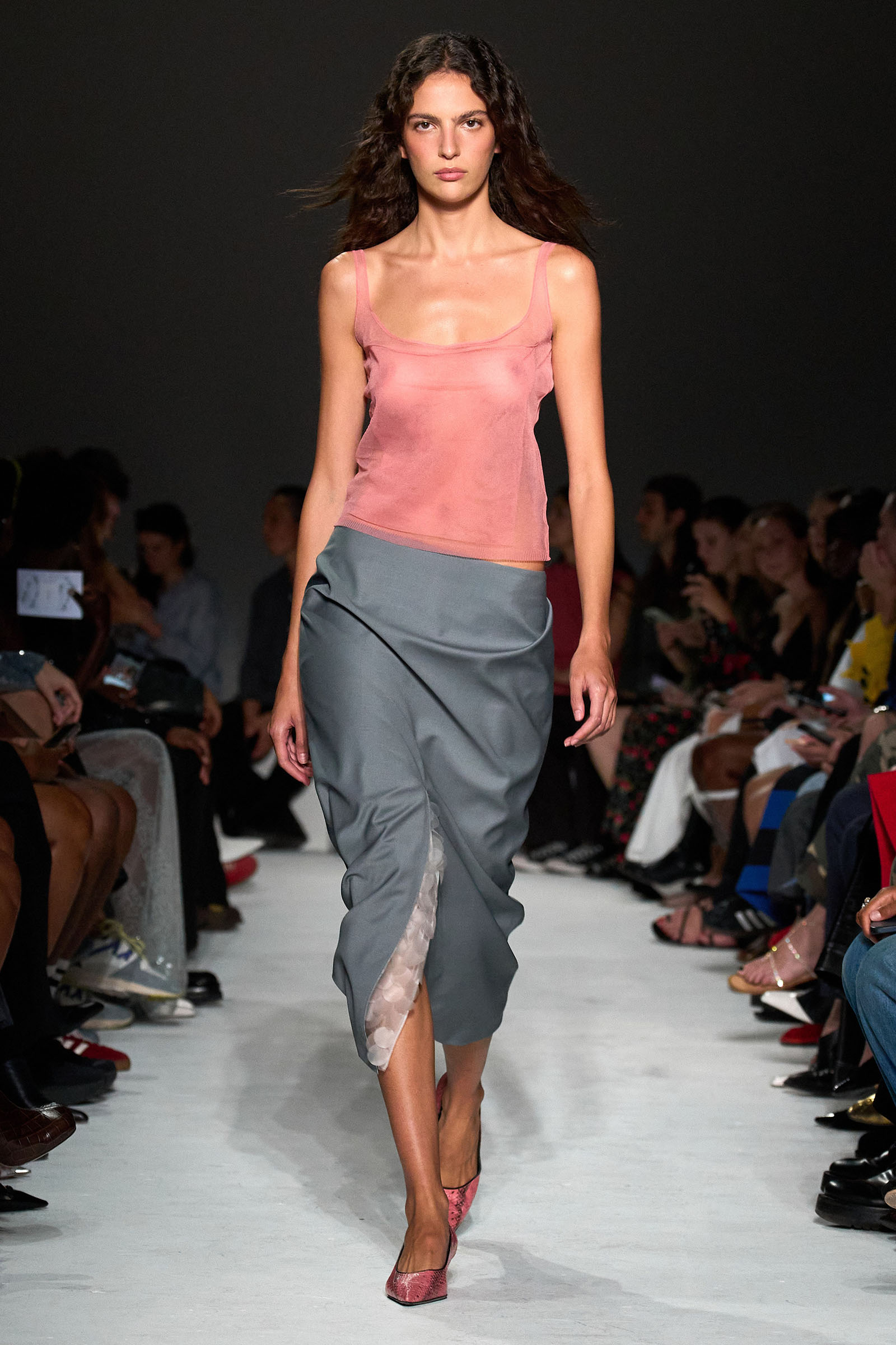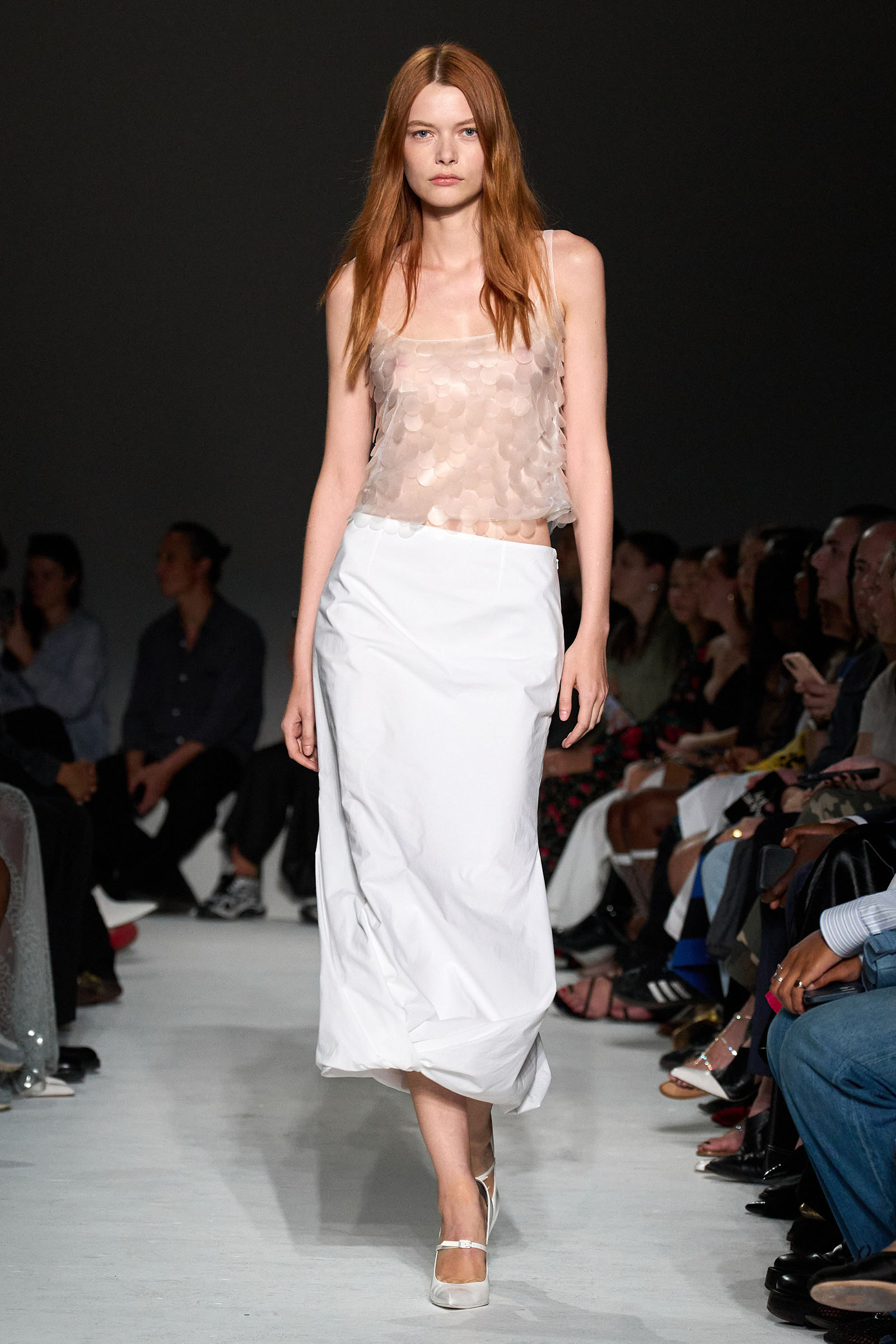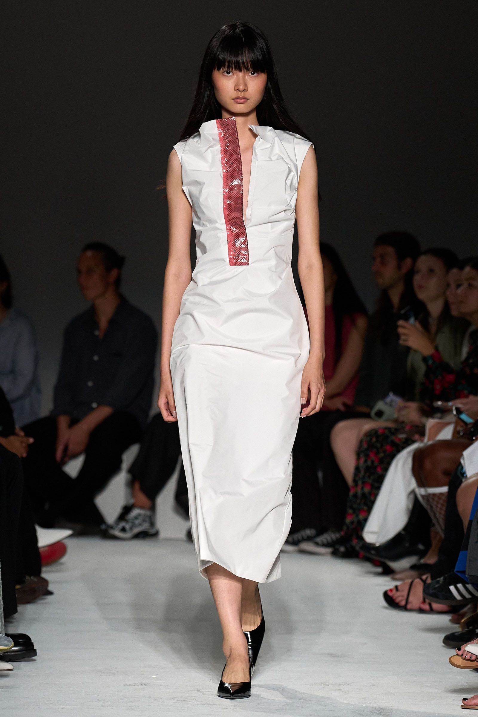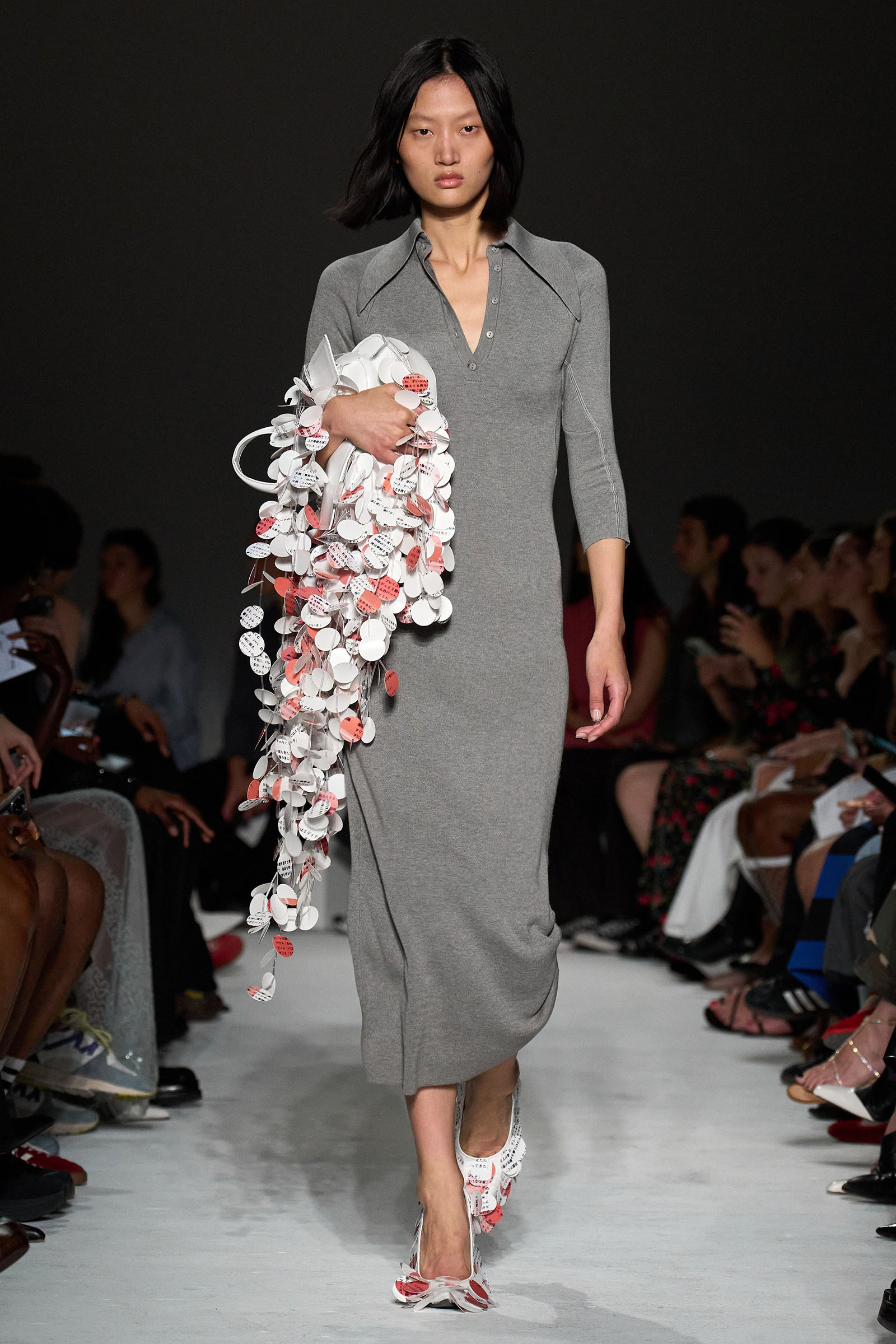 The first double take arrived early, with shimmering skirts and dresses covered in paillettes that revealed themselves to be made from translucent latex, beginning in white before moving into delicate shades of red, blue, and gray. Towards the end, a trio of looks appeared (at least from a distance) to be made of oversized silvery sequins—before, that is, the models walked by and you heard the unmistakable rustle of metal—while shoes were covered with fluttering circular cut-outs that featured graphics Capaldo lifted from a Japanese book he picked up about Lynch’s film.