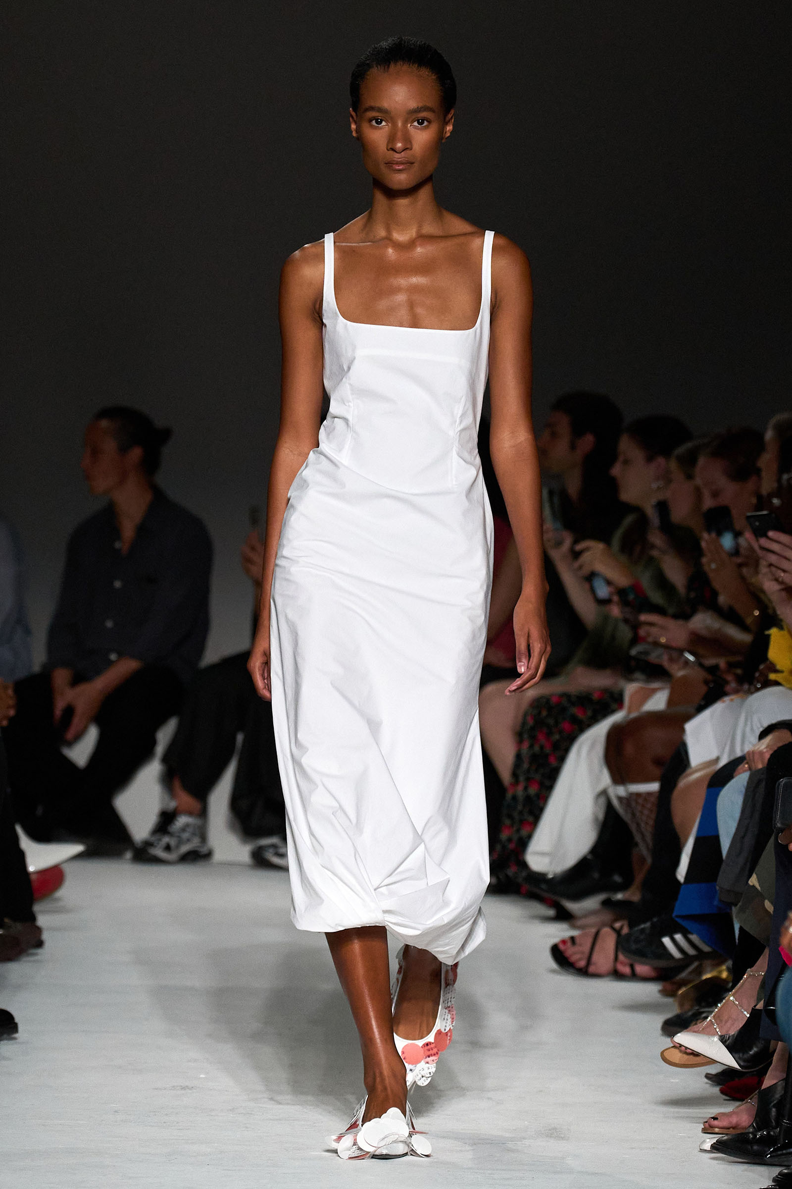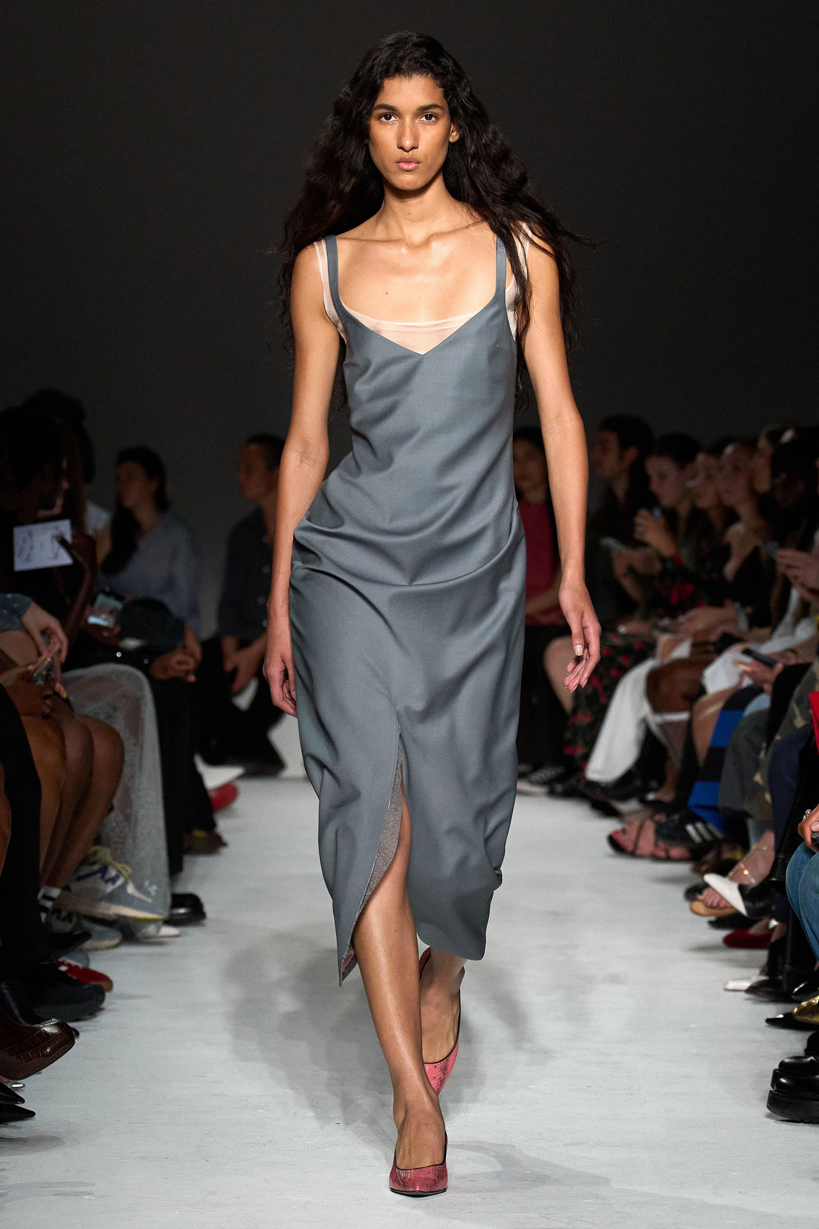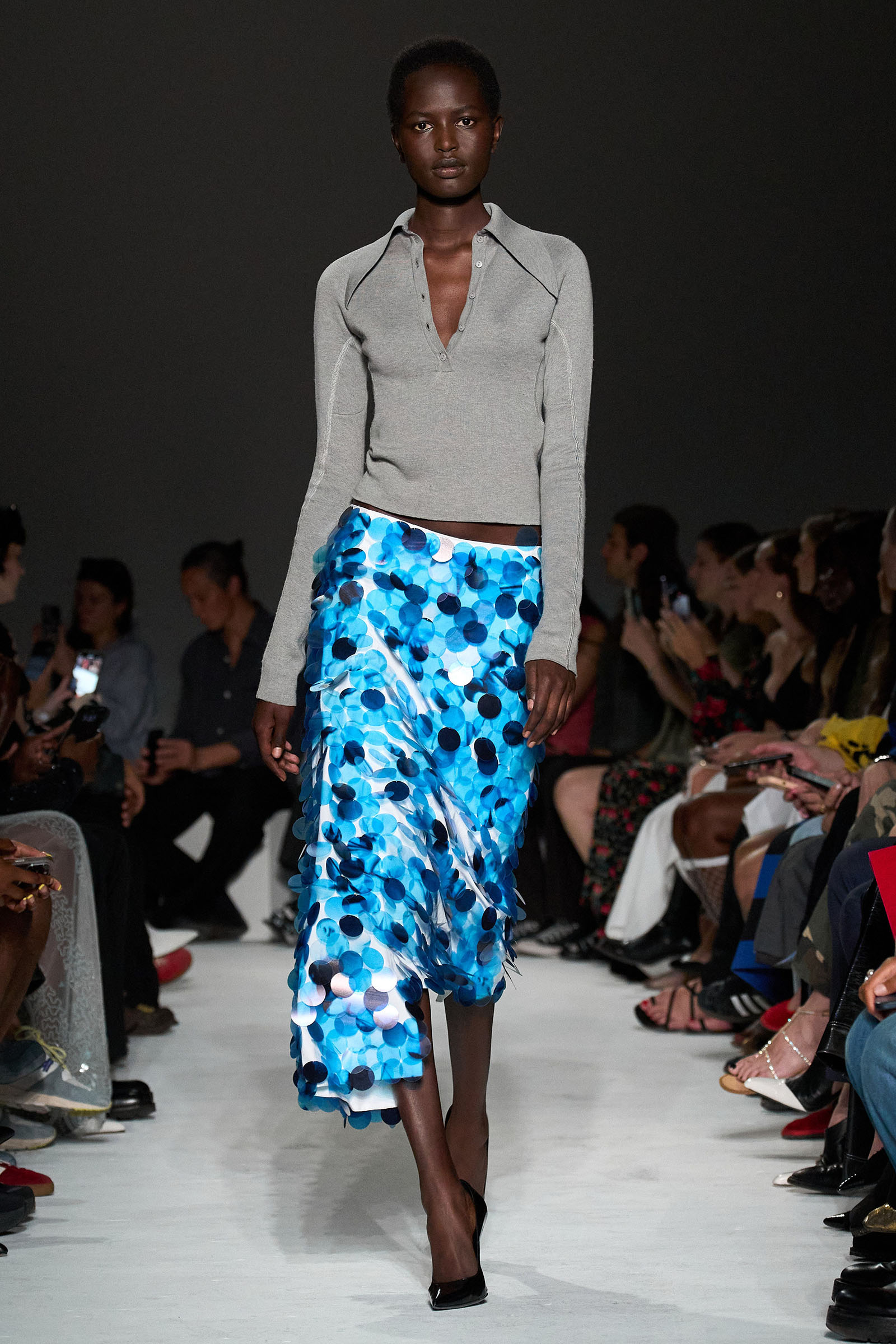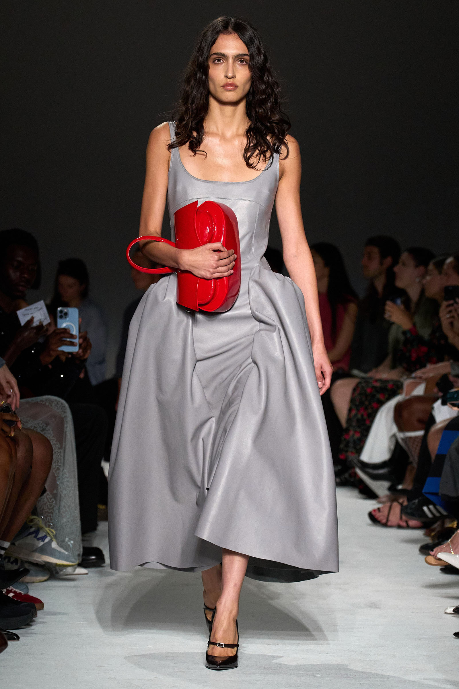 The first double take arrived early, with shimmering skirts and dresses covered in paillettes that revealed themselves to be made from translucent latex, beginning in white before moving into delicate shades of red, blue, and gray. Towards the end, a trio of looks appeared (at least from a distance) to be made of oversized silvery sequins—before, that is, the models walked by and you heard the unmistakable rustle of metal—while shoes were covered with fluttering circular cut-outs that featured graphics Capaldo lifted from a Japanese book he picked up about Lynch’s film.
