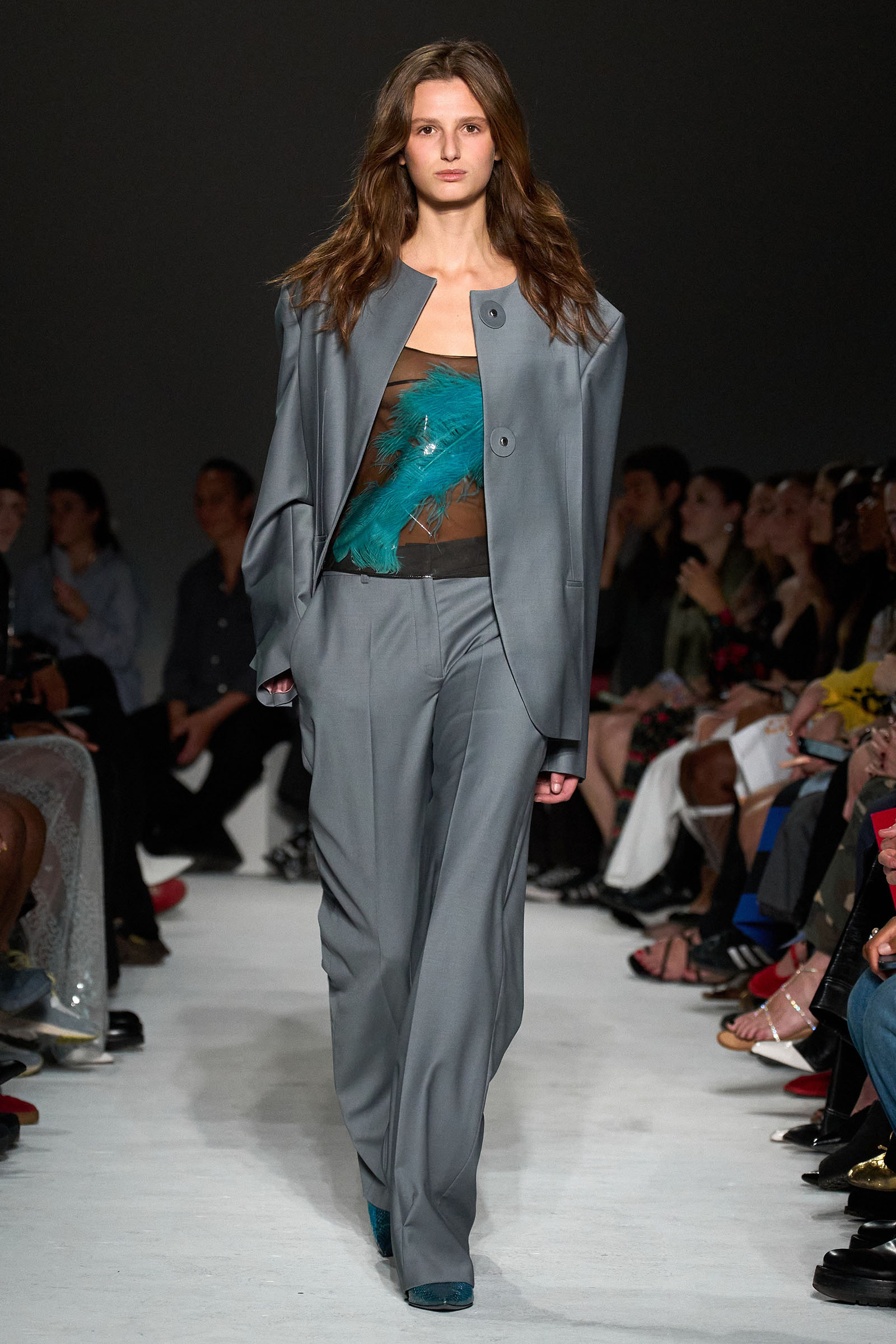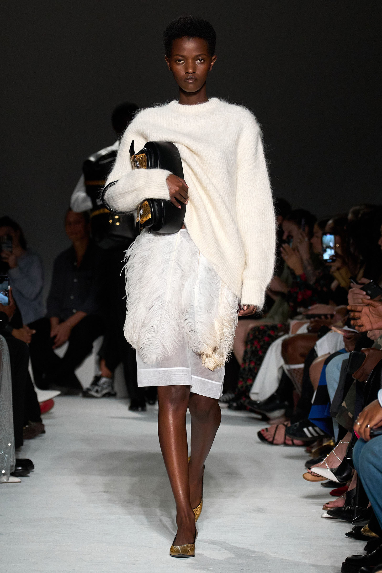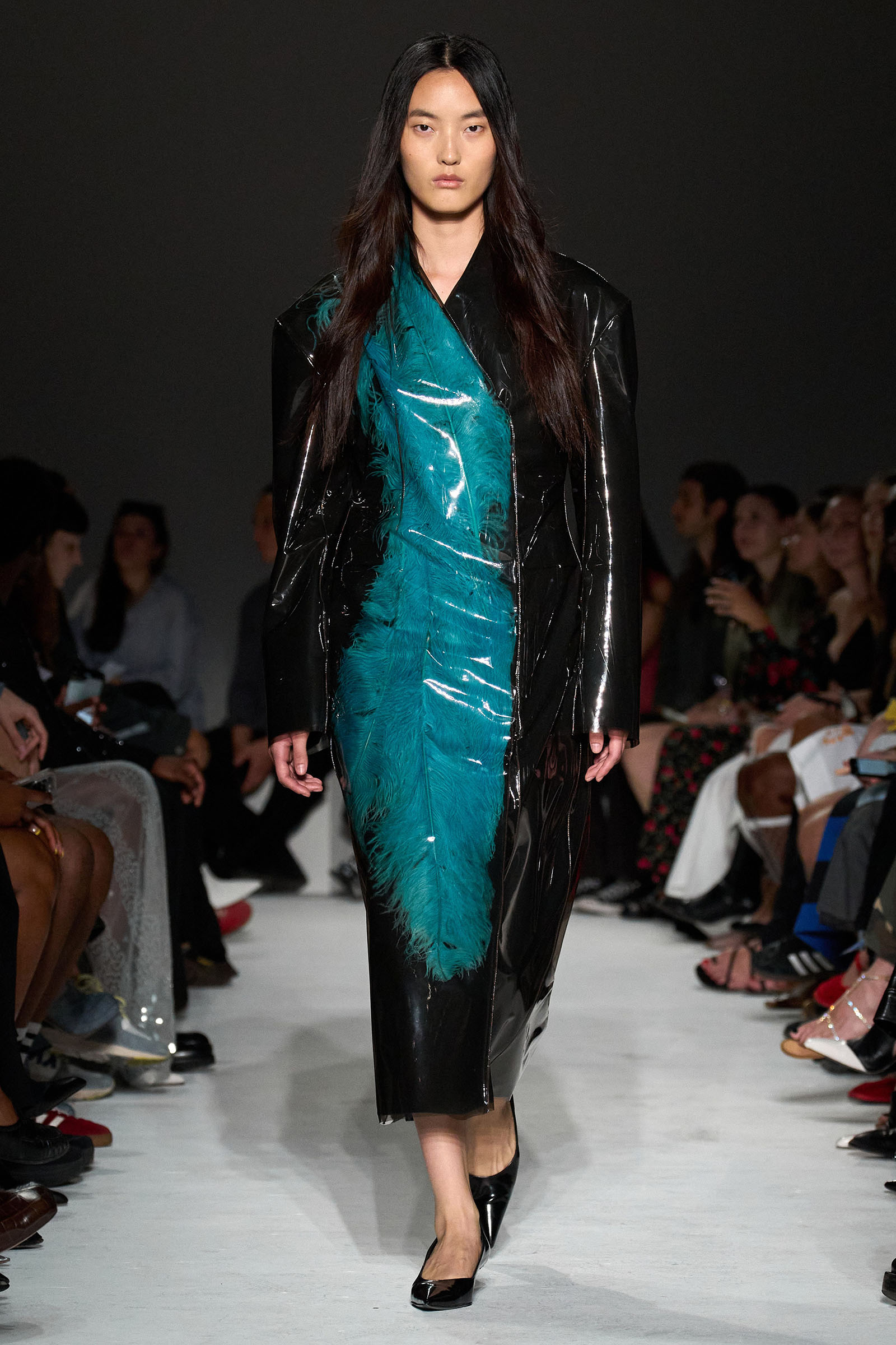 Elsewhere, a series of gowns—including one in a particularly ravishing pale gray leather—featured curved, pannier-like ridges at the sides resembling a molded car exterior, while others were cut from factory-curtain latex, with ostrich feathers hand-tacked to a layer of tulle to hold them in place beneath. It may have been “double-take trickery,” in Capaldo’s words, but it was a delight to look at and touch.