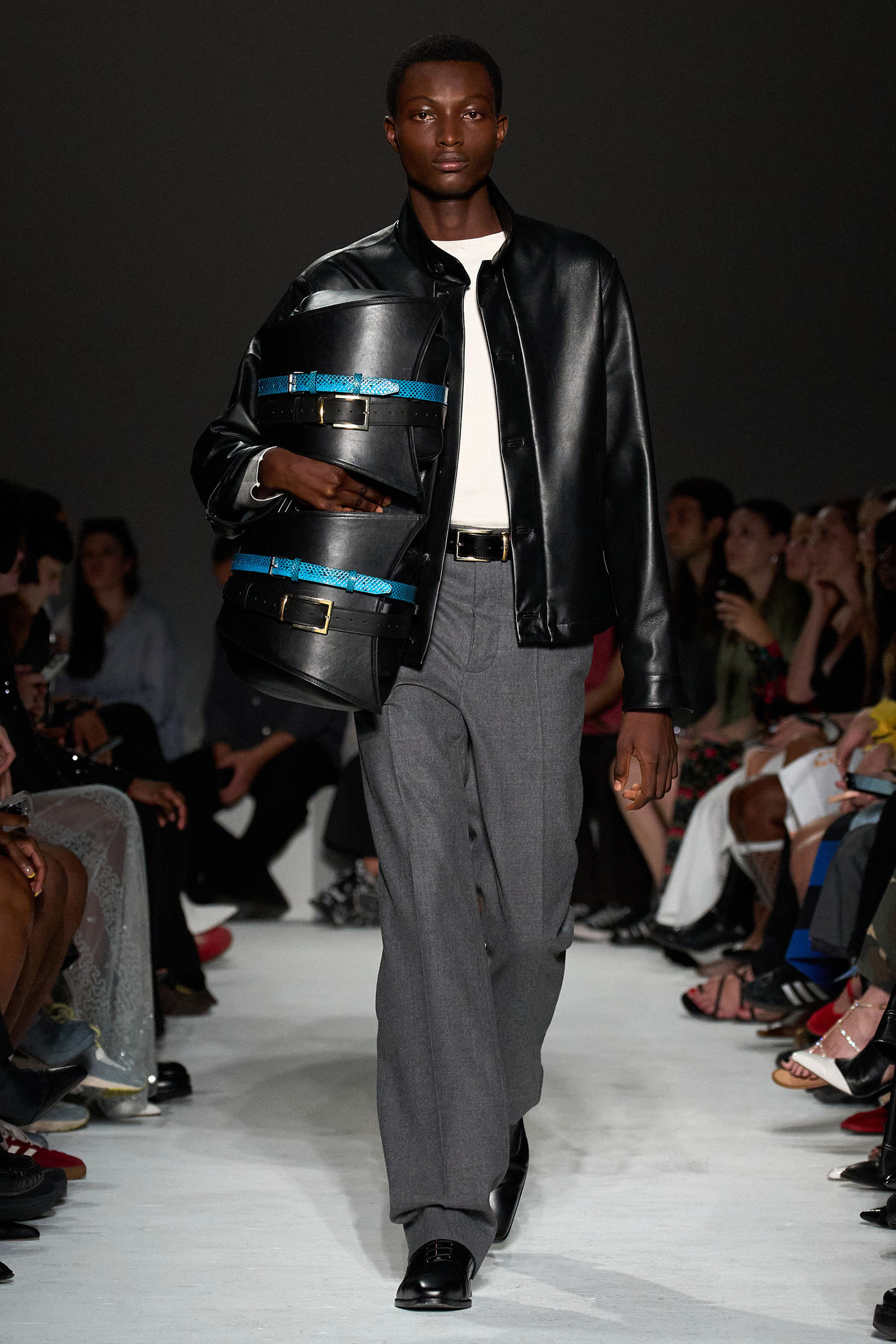 The polished metal details also spoke to another, more quotidian influence for Capaldo this season: the exhilarating experience of driving through the city at night. “It’s trying to capture that feeling of getting behind the wheel and realizing you can go anywhere,” he said. (It’s not hard to imagine his high-octane woman in the driver’s seat, after all.) The palette of manicure-glossy red and super-saturated cyan—“almost like it’s come straight out of an inkjet printer,” Capaldo said—echoed the blur of tinted halogen headlights on the highway, or raindrops on a windshield, while a pair of high heels were swathed in rubber tentacles like the brushes in an automatic car wash, striking a perfect balance between playful humor and fetishistic sex appeal.