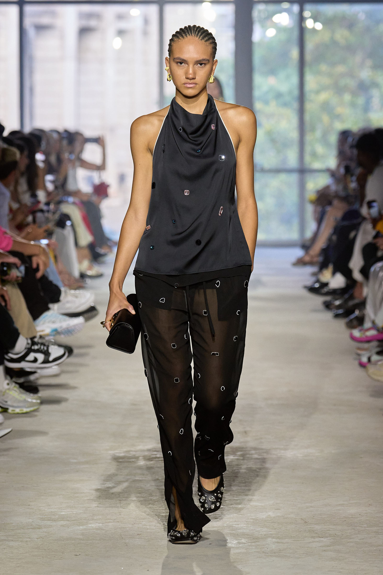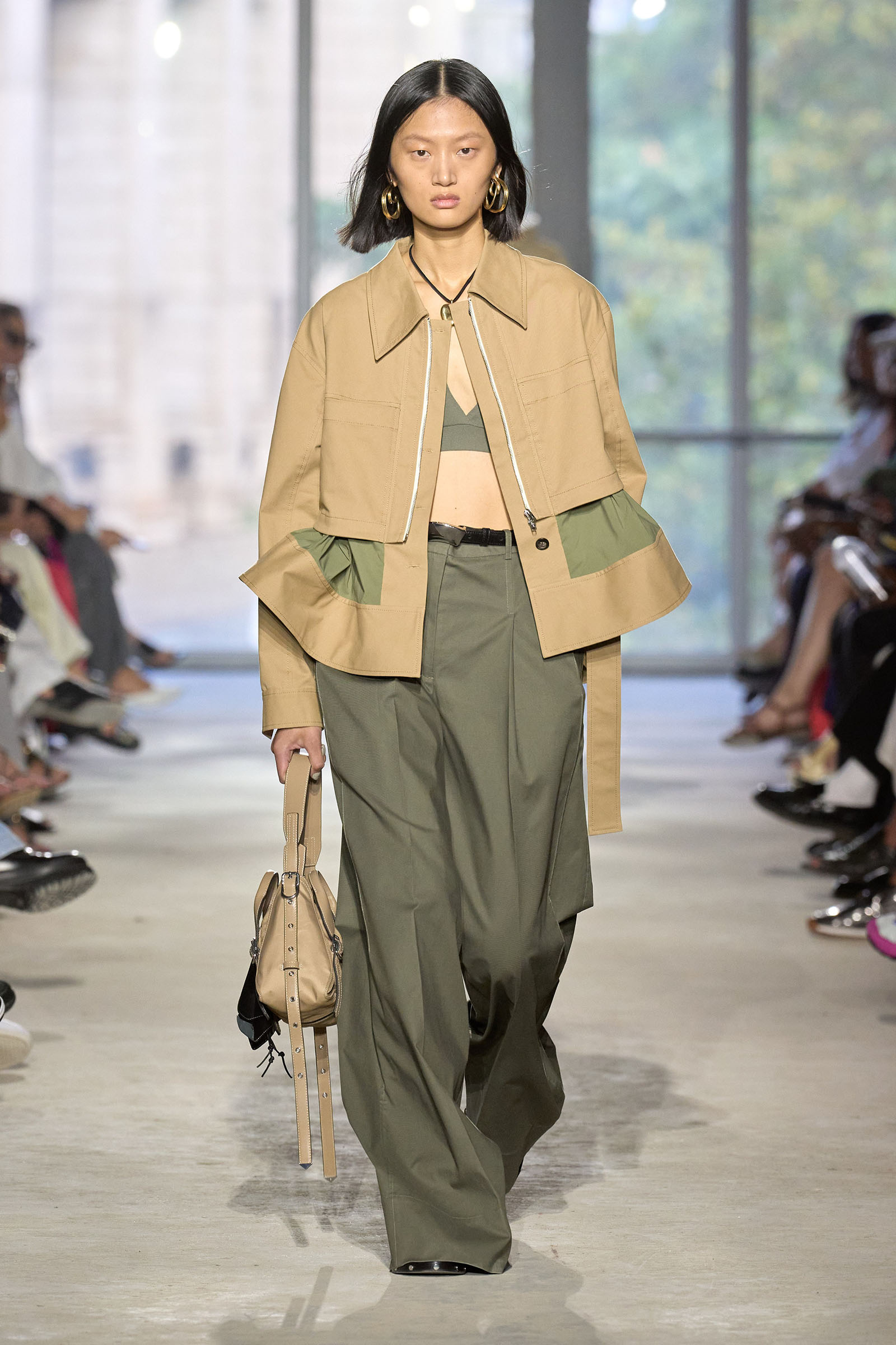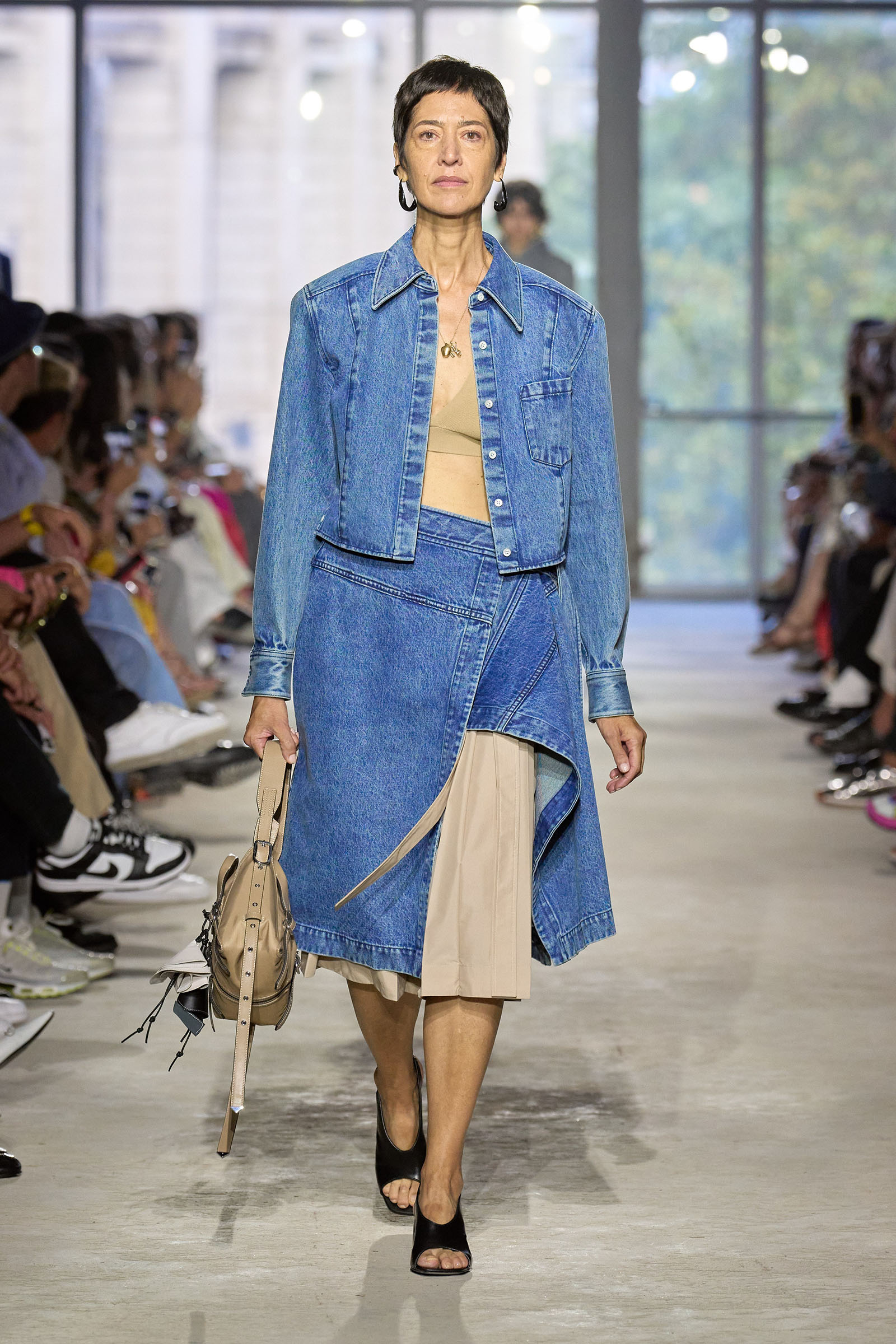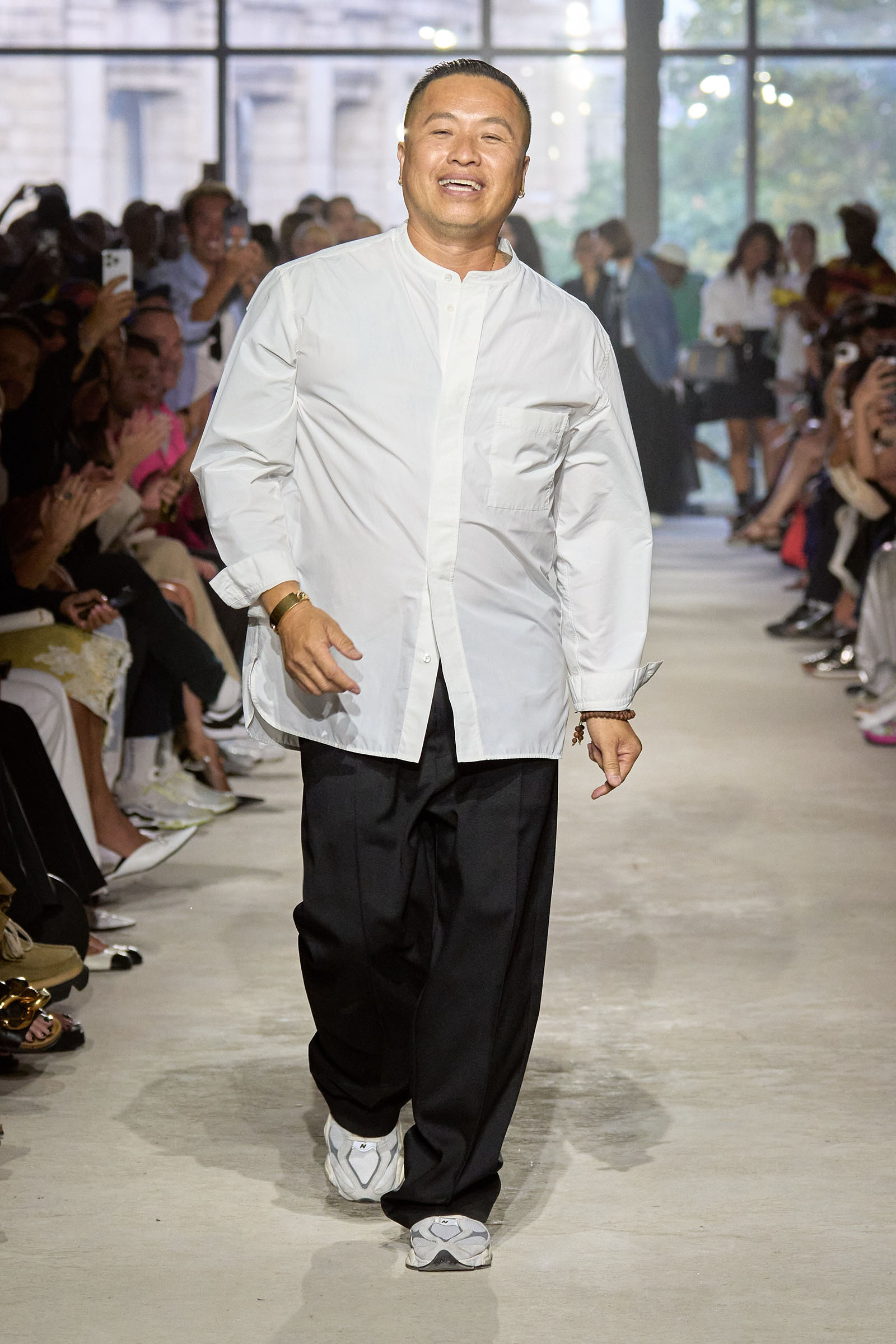 Today’s show was a chance to double down on 3.1’s New York–iness and Lim’s Asian American identity while reacquainting the fashion crowd with what he’s good at: American sportswear with a twist. It came in the form of smart, extra-wide-leg khakis and denim jackets cut in unconventional ways; in breezy scarf dresses whose graphic patterns were inspired by NYC architectural details; and in pajama sets studded playfully with crystals. It was also there in Lim’s nod to the omnipresence of workout gear on the streets; his leggings are cropped below the knee, with a deep folded-over waistline that elevates them above the gym.
