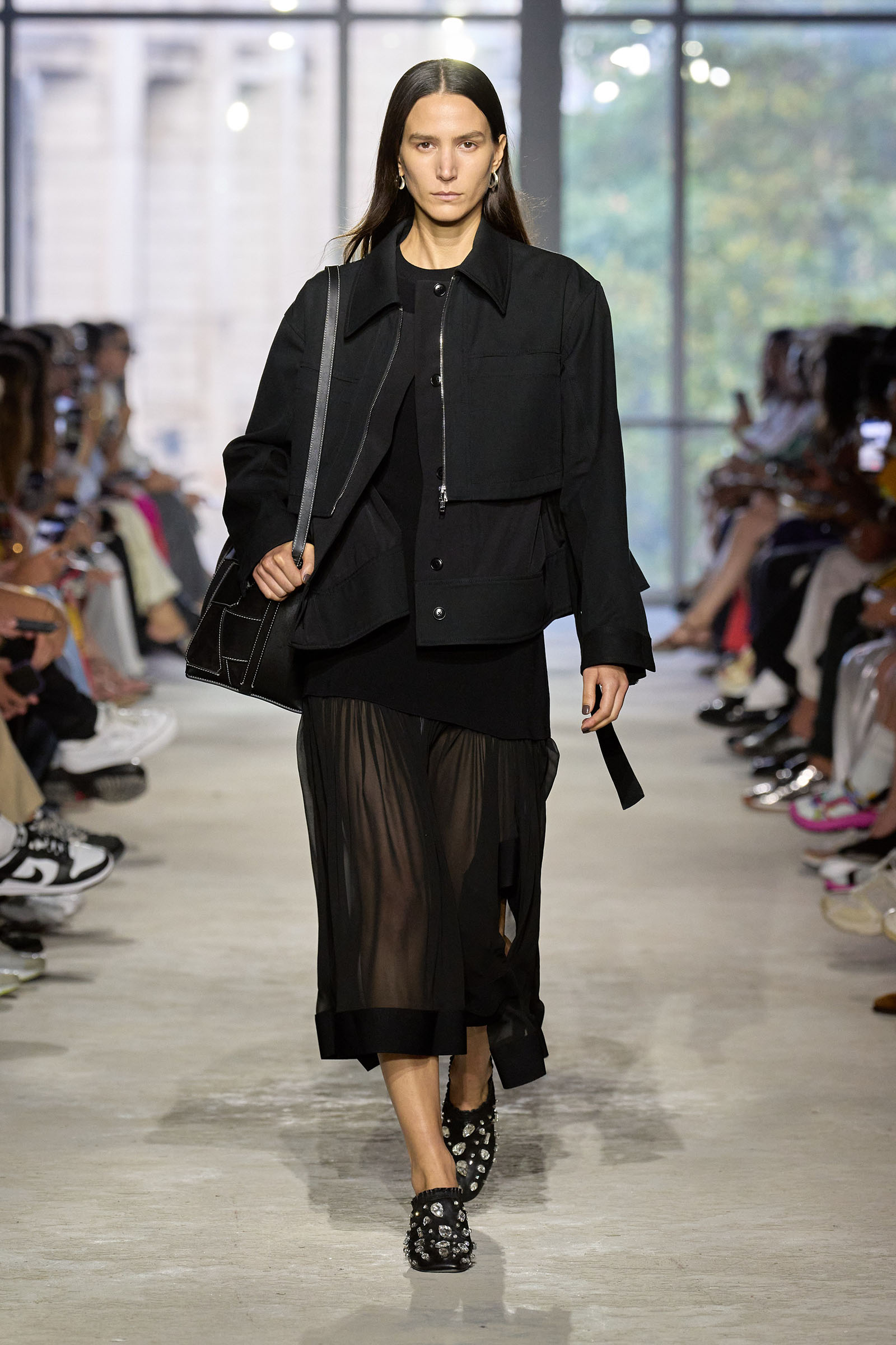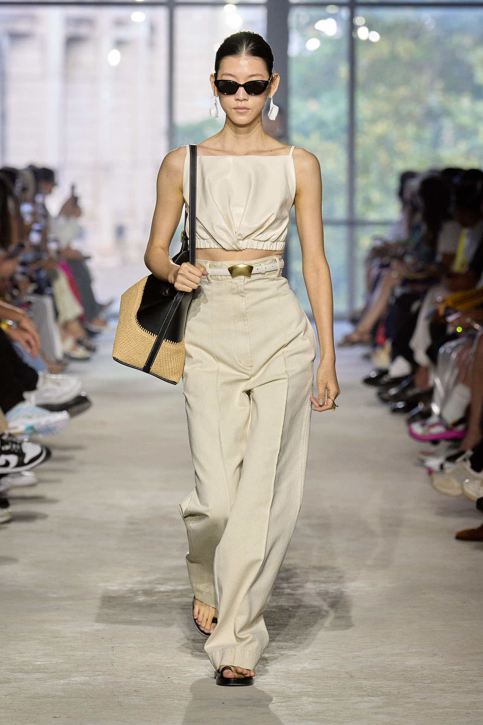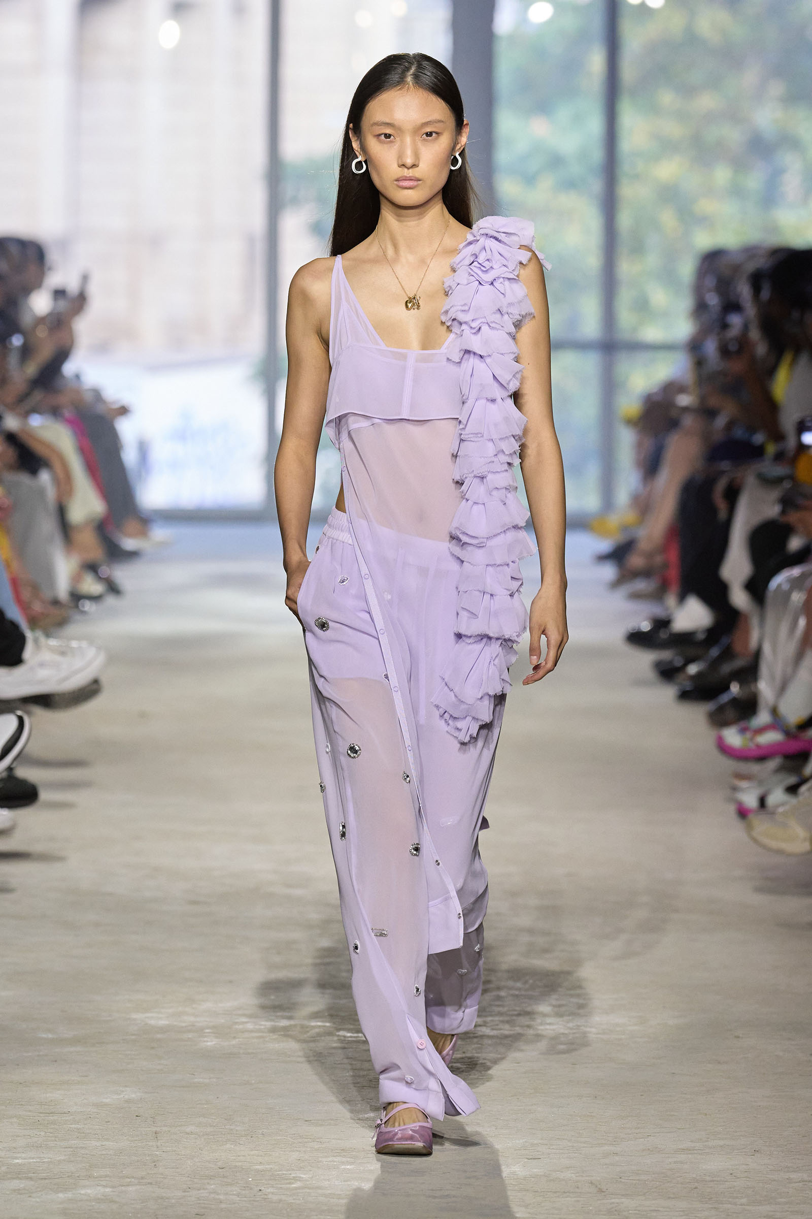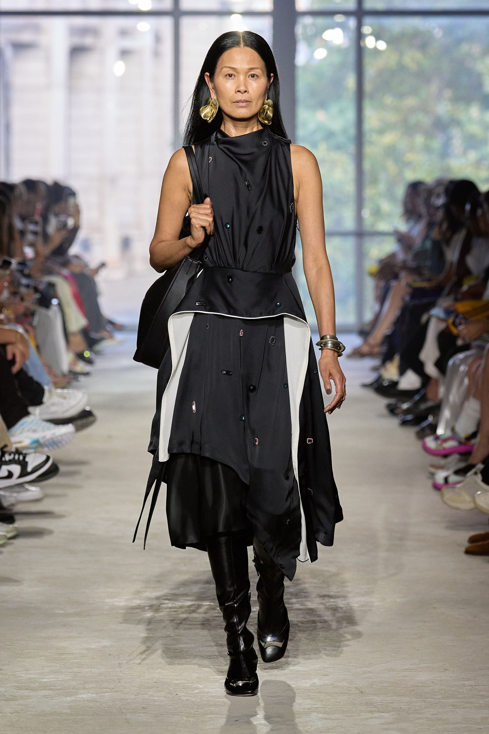 Today’s show was a chance to double down on 3.1’s New York–iness and Lim’s Asian American identity while reacquainting the fashion crowd with what he’s good at: American sportswear with a twist. It came in the form of smart, extra-wide-leg khakis and denim jackets cut in unconventional ways; in breezy scarf dresses whose graphic patterns were inspired by NYC architectural details; and in pajama sets studded playfully with crystals. It was also there in Lim’s nod to the omnipresence of workout gear on the streets; his leggings are cropped below the knee, with a deep folded-over waistline that elevates them above the gym.