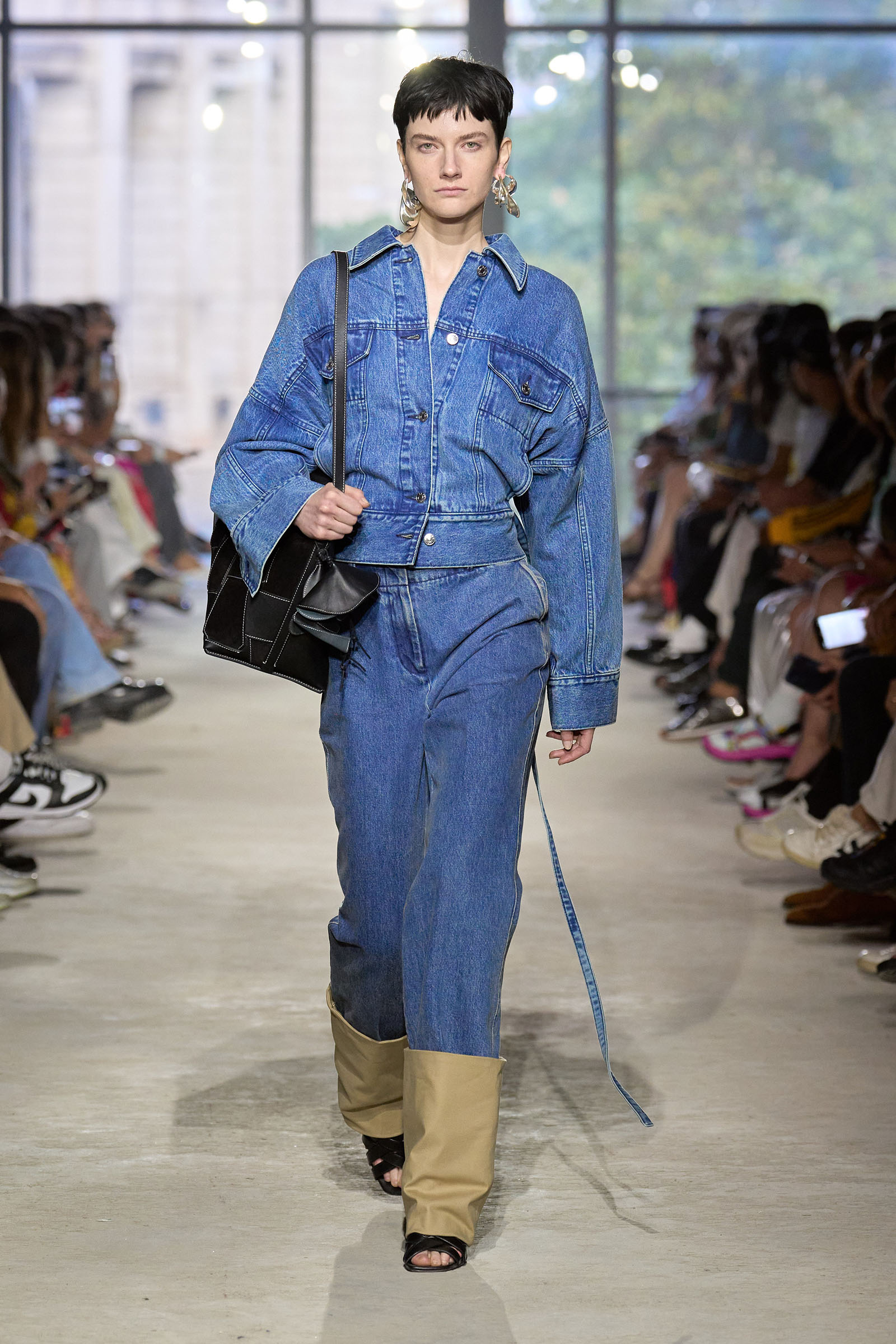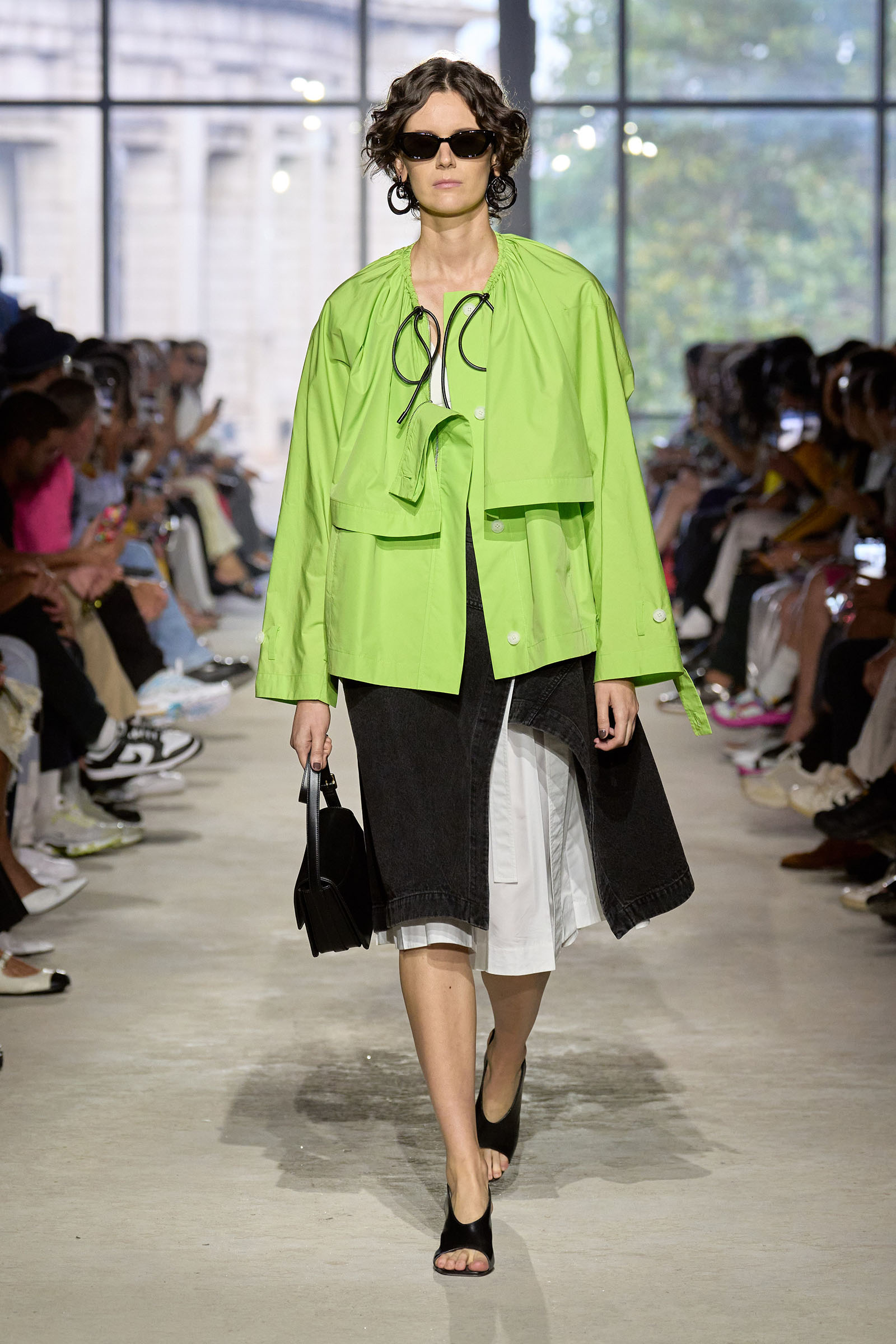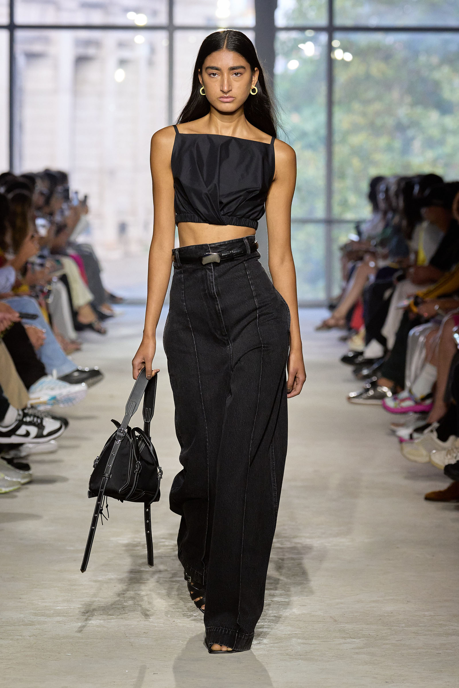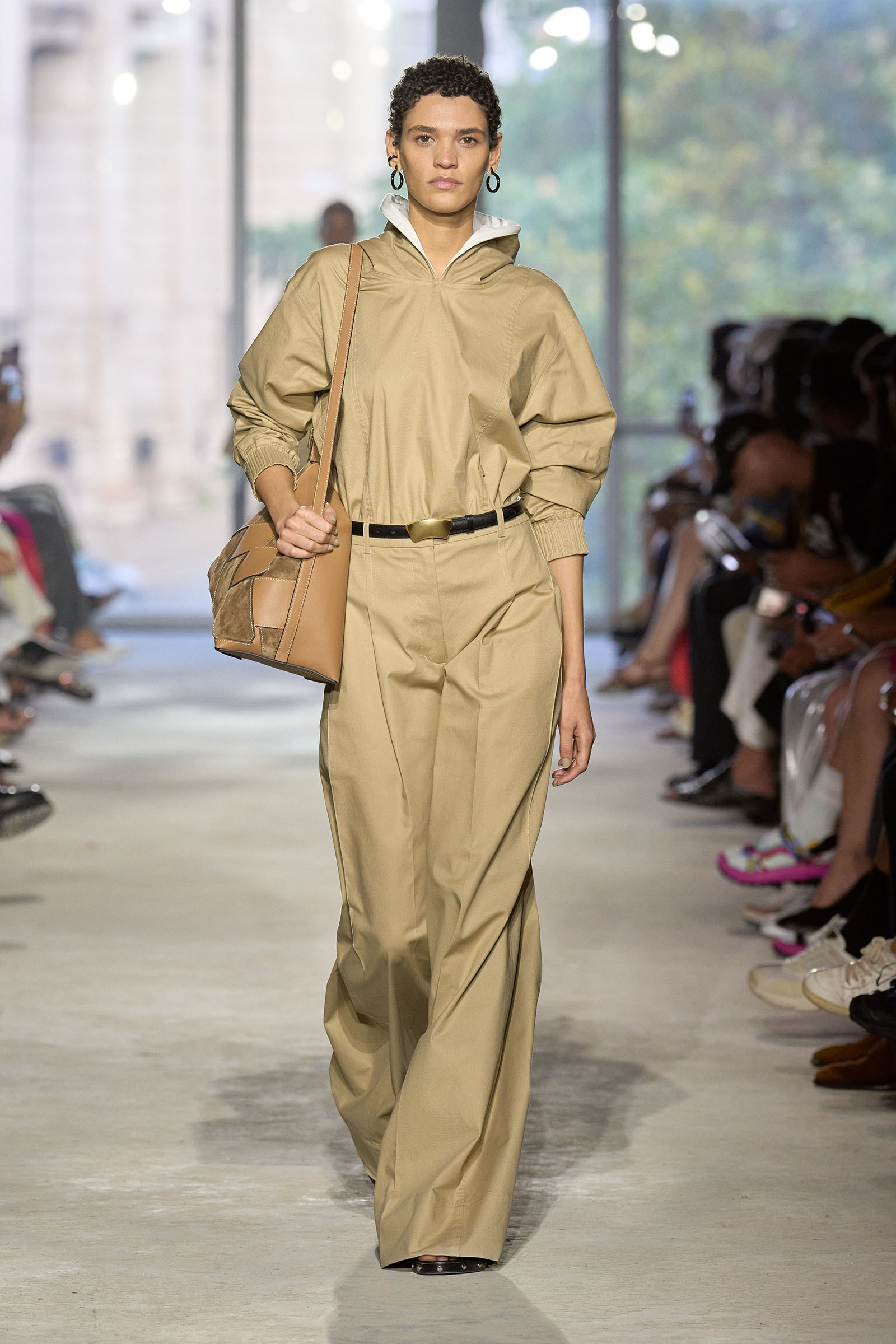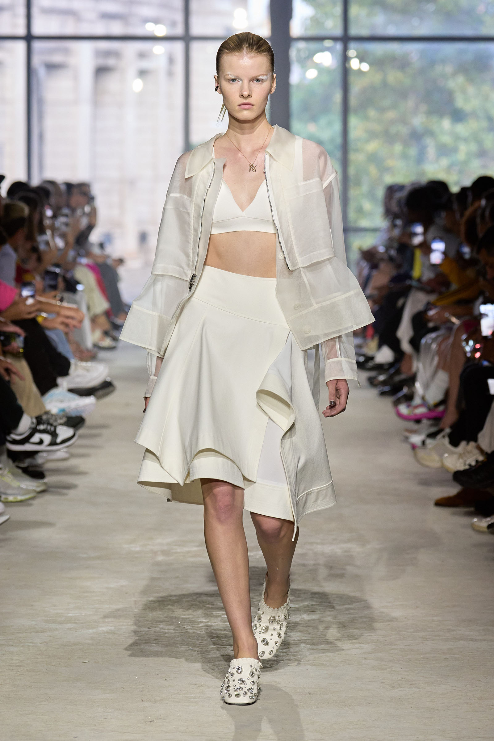 Today’s show was a chance to double down on 3.1’s New York–iness and Lim’s Asian American identity while reacquainting the fashion crowd with what he’s good at: American sportswear with a twist. It came in the form of smart, extra-wide-leg khakis and denim jackets cut in unconventional ways; in breezy scarf dresses whose graphic patterns were inspired by NYC architectural details; and in pajama sets studded playfully with crystals. It was also there in Lim’s nod to the omnipresence of workout gear on the streets; his leggings are cropped below the knee, with a deep folded-over waistline that elevates them above the gym.