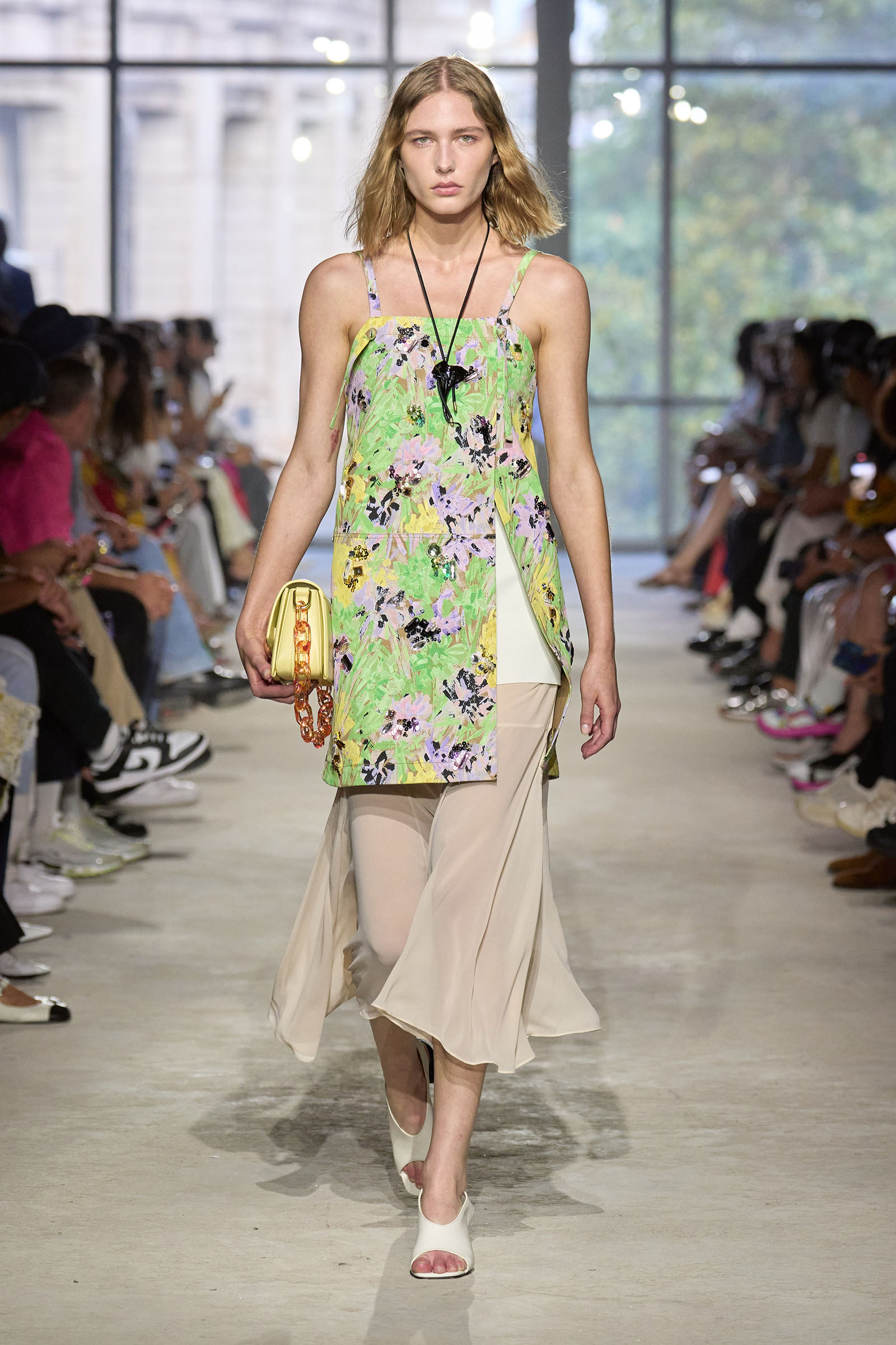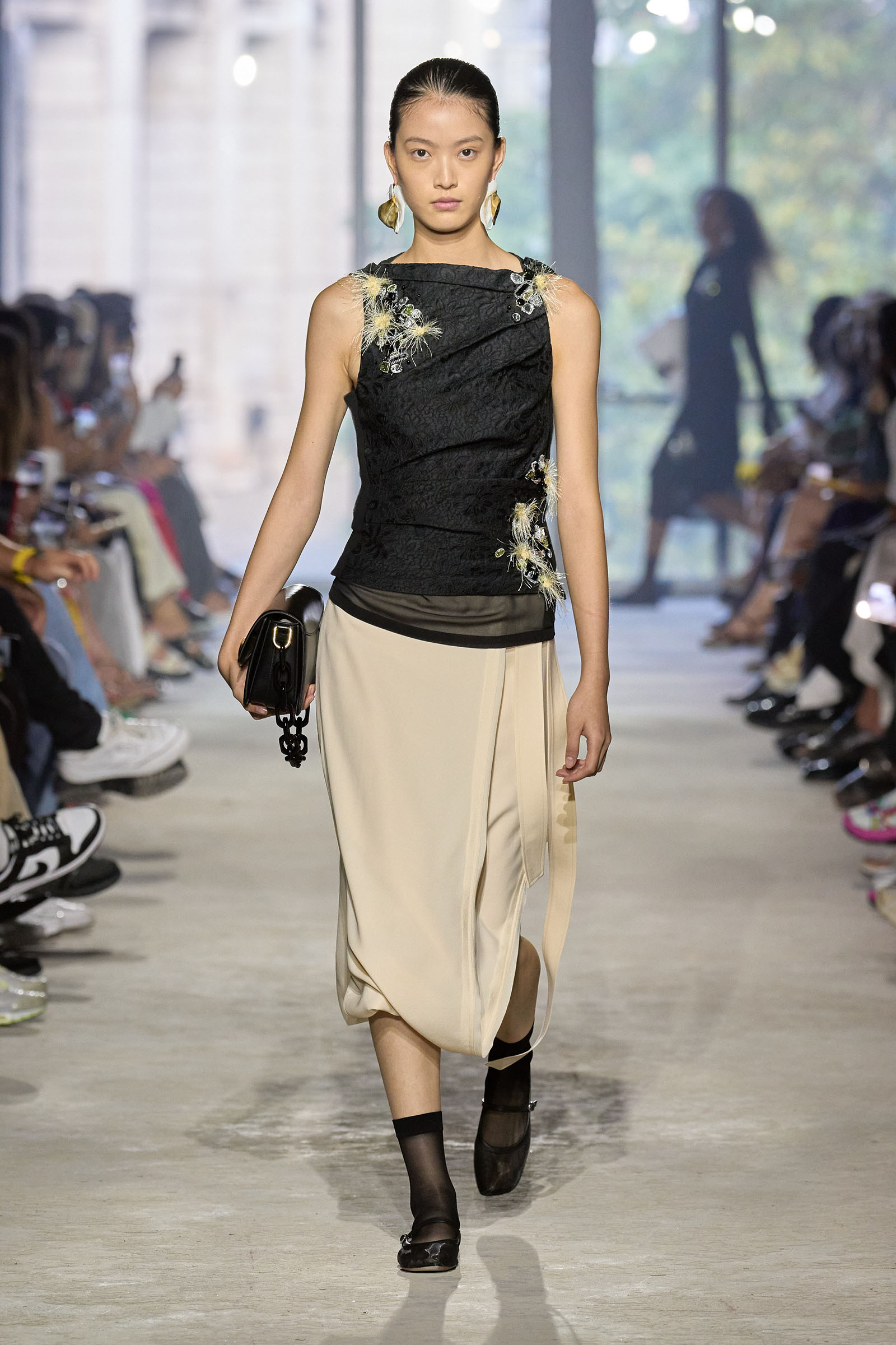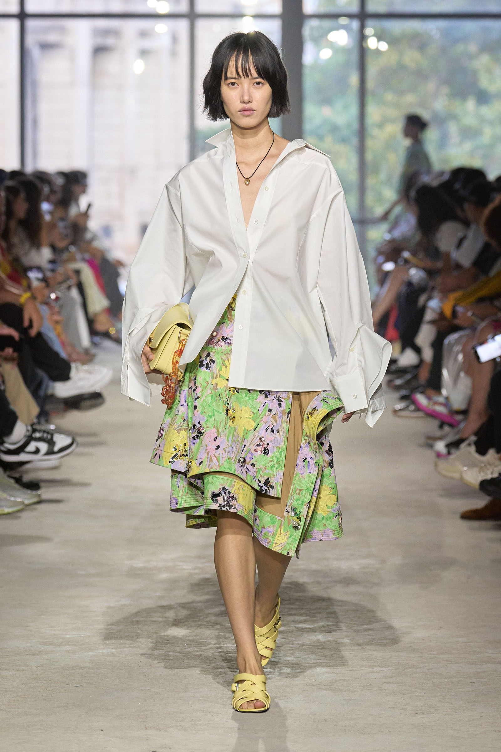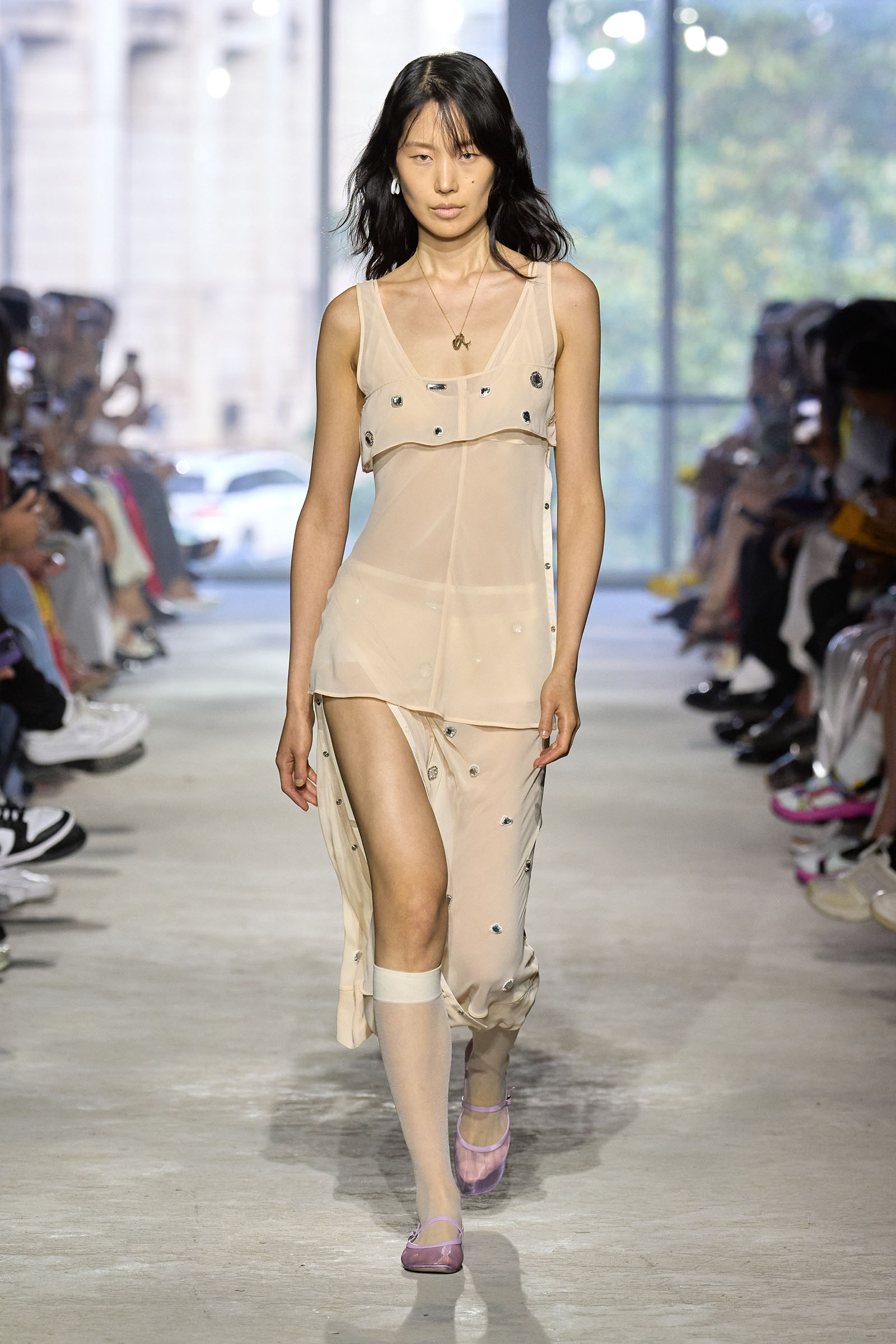 Today’s show was a chance to double down on 3.1’s New York–iness and Lim’s Asian American identity while reacquainting the fashion crowd with what he’s good at: American sportswear with a twist. It came in the form of smart, extra-wide-leg khakis and denim jackets cut in unconventional ways; in breezy scarf dresses whose graphic patterns were inspired by NYC architectural details; and in pajama sets studded playfully with crystals. It was also there in Lim’s nod to the omnipresence of workout gear on the streets; his leggings are cropped below the knee, with a deep folded-over waistline that elevates them above the gym.