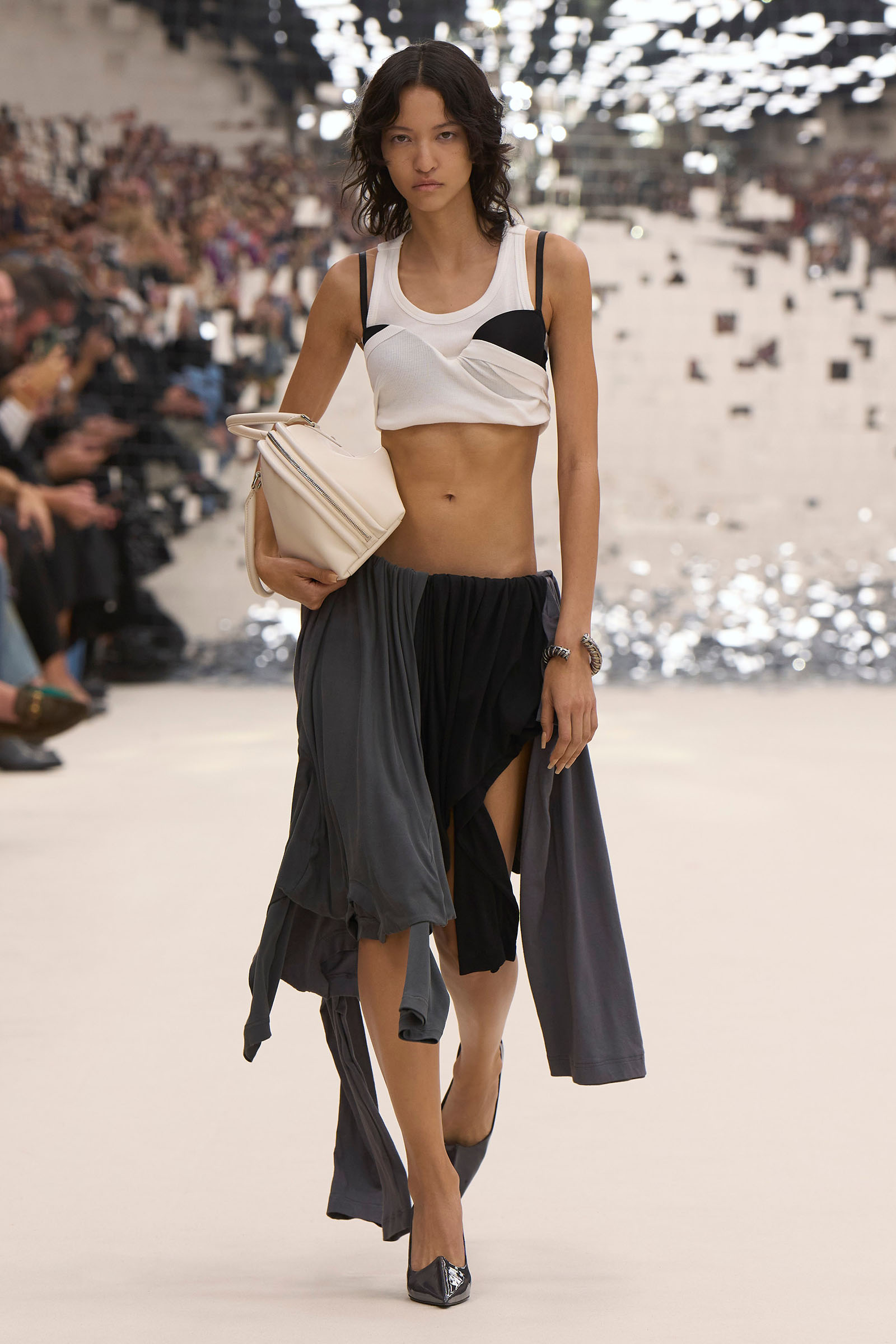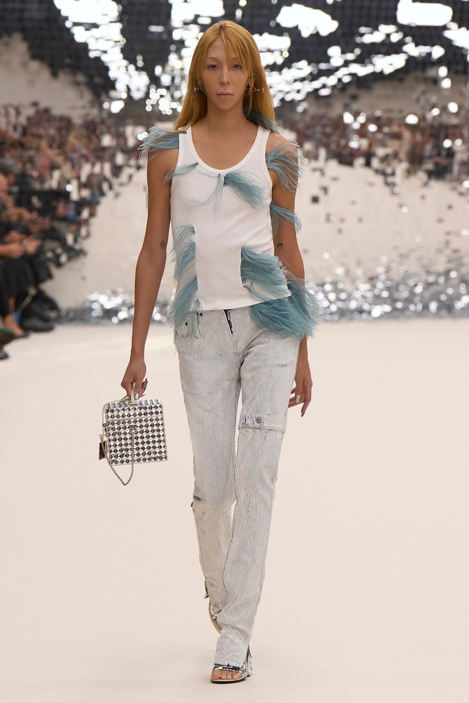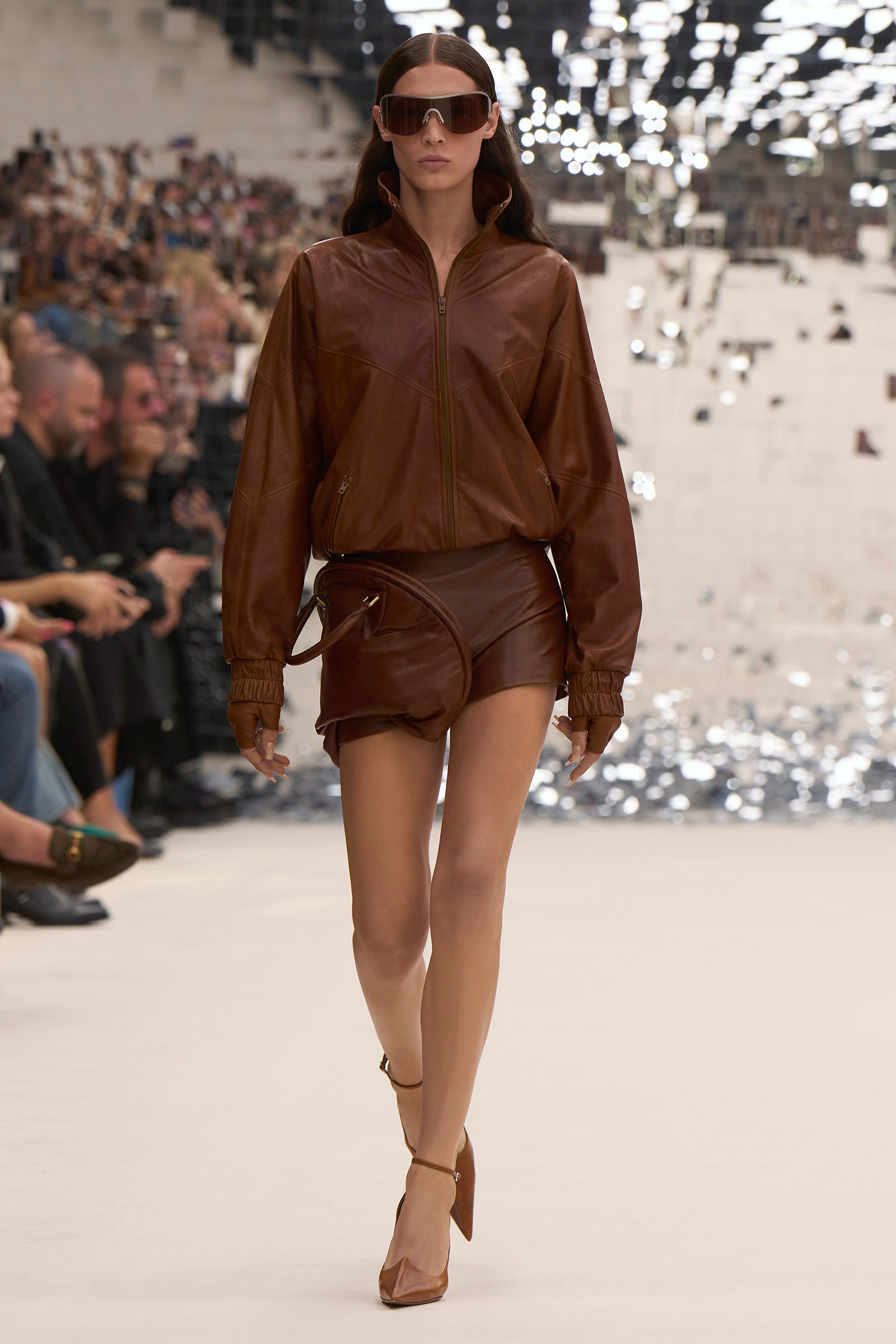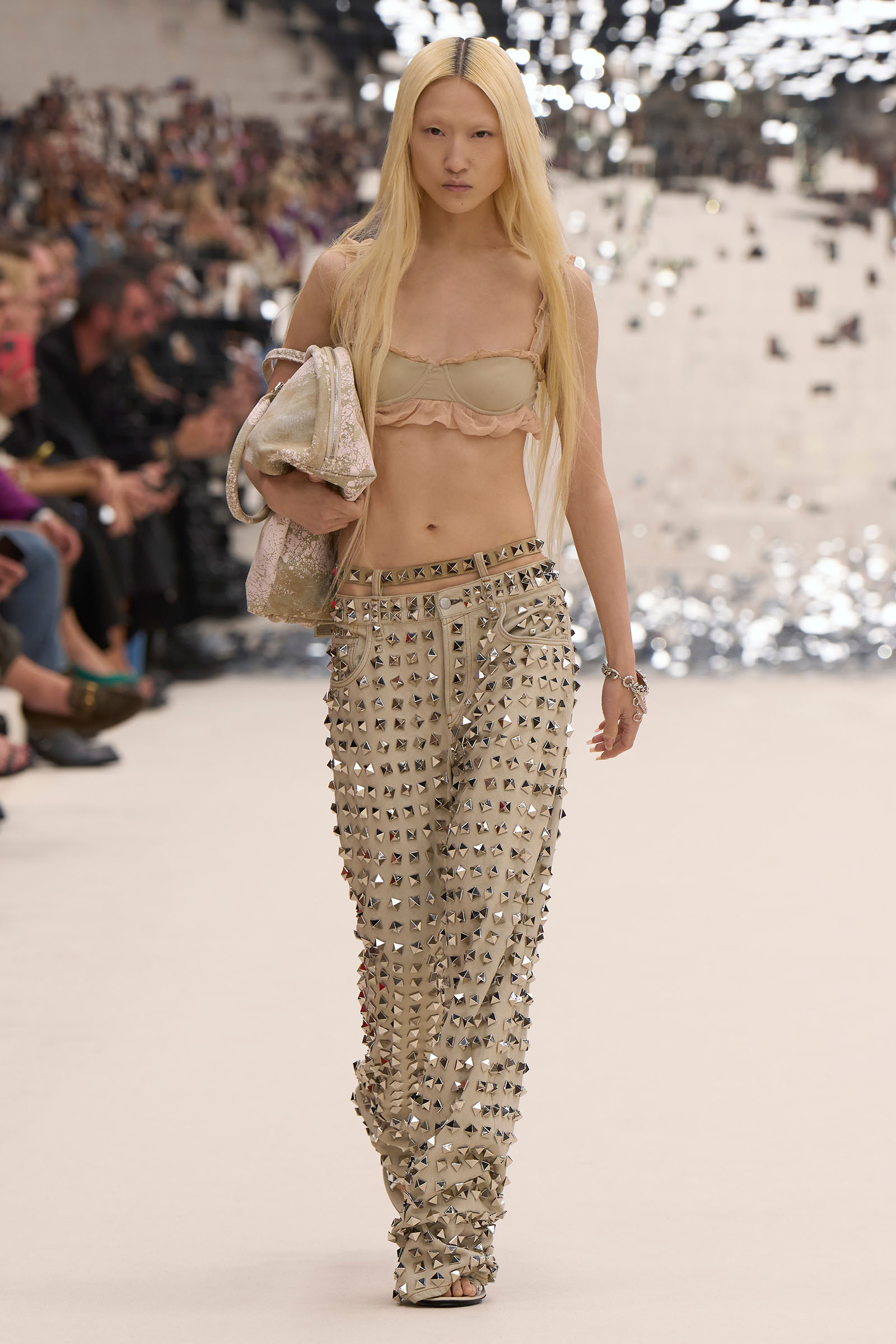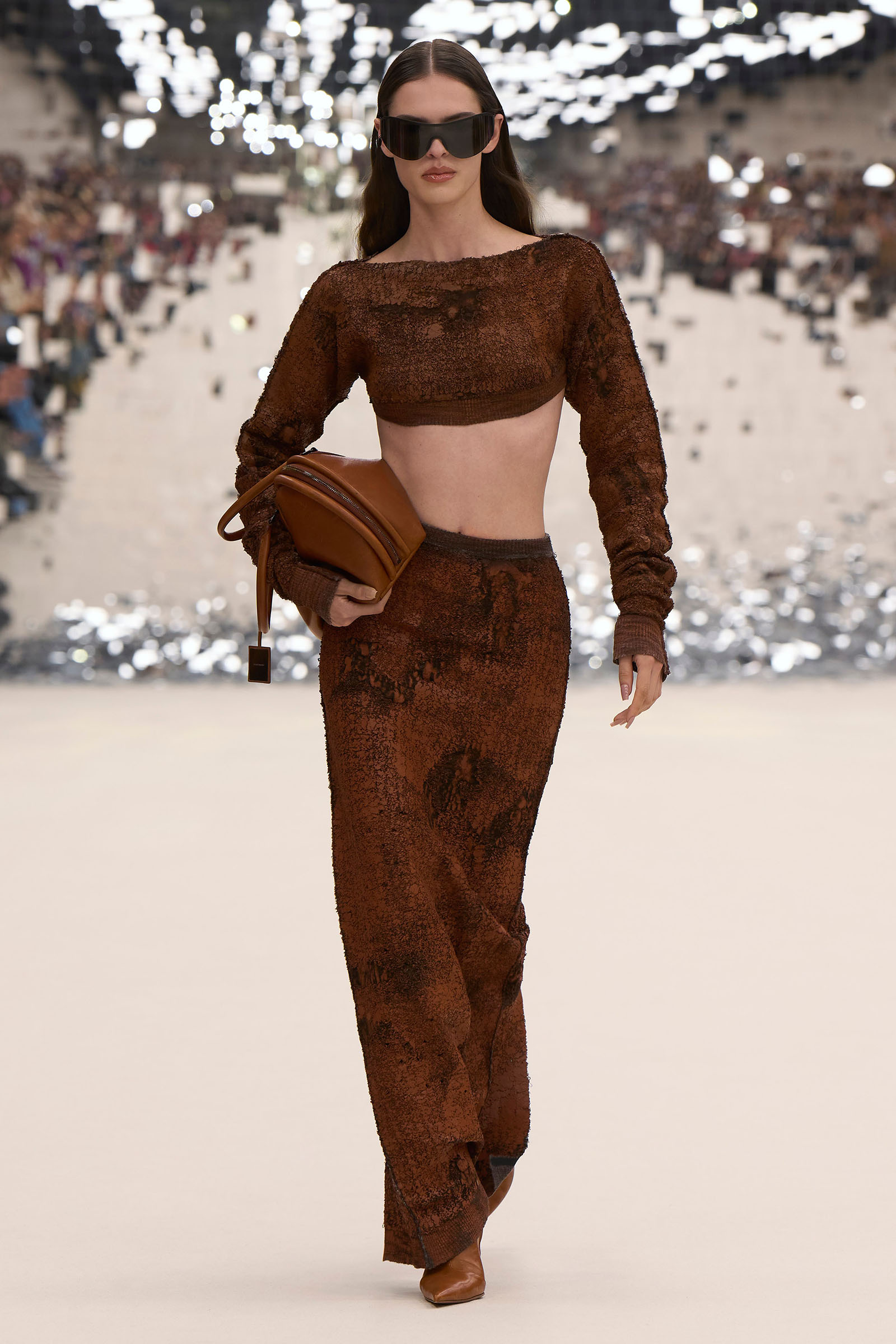 There was a fun trio of dark brown leather coat, teak leather skirt, and off-white leather minidress that came with conjoined hands-free handbags. Skirts of ragged jersey were articulated to sit off the hip, suspended. Vest tops and bras were entangled in a morning-after-the-night-before inversion of the conventional, reflected in the enormous sunken and fracturing disco ball from which the models came out to walk. The square-studded jeans that closed the show had a glint of a return toward something more conventionally put together. Kerfuffle-free—or at least almost—this Acne outing offered directionally disheveled and deconstructed womenswear paradigm pieces aplenty.