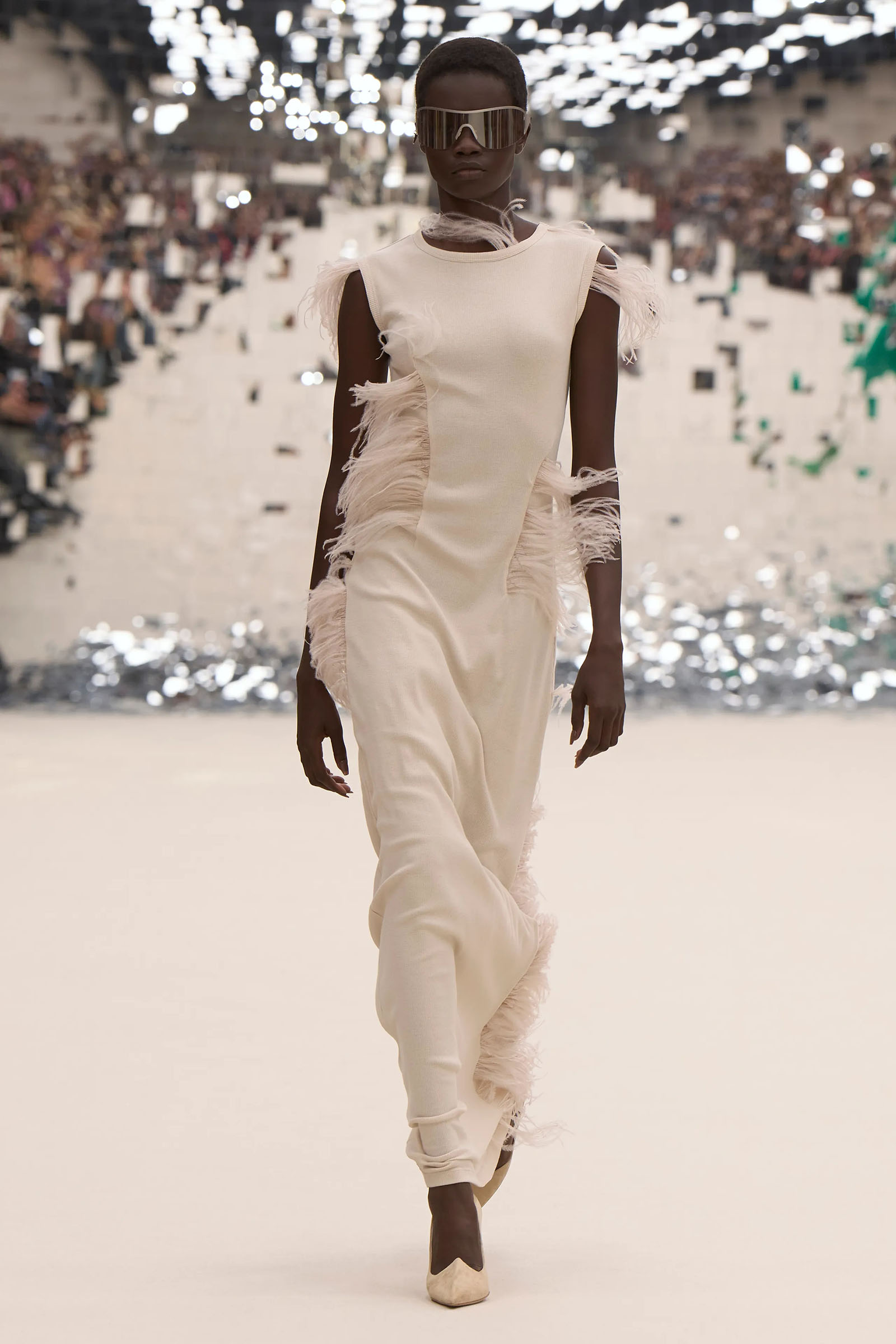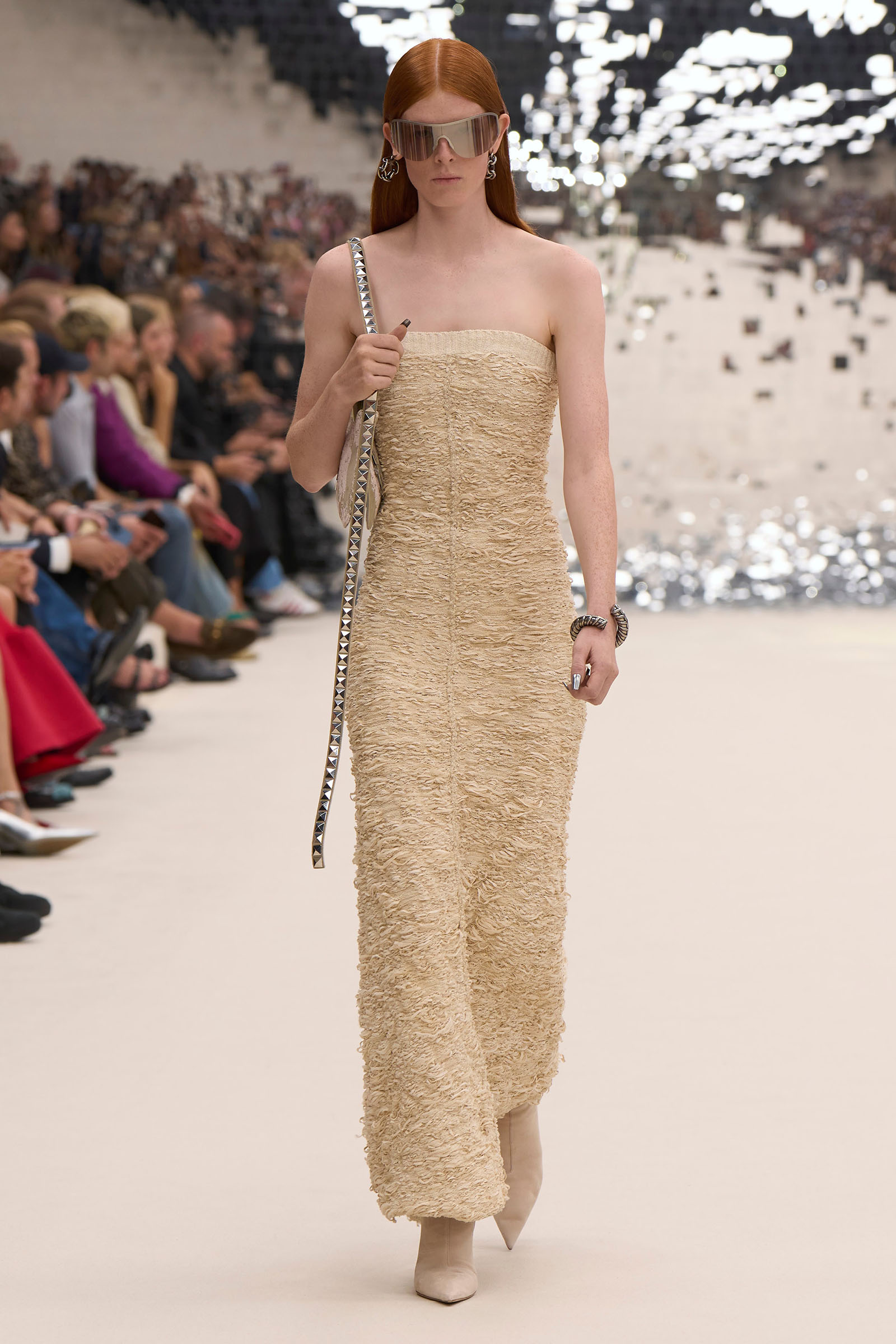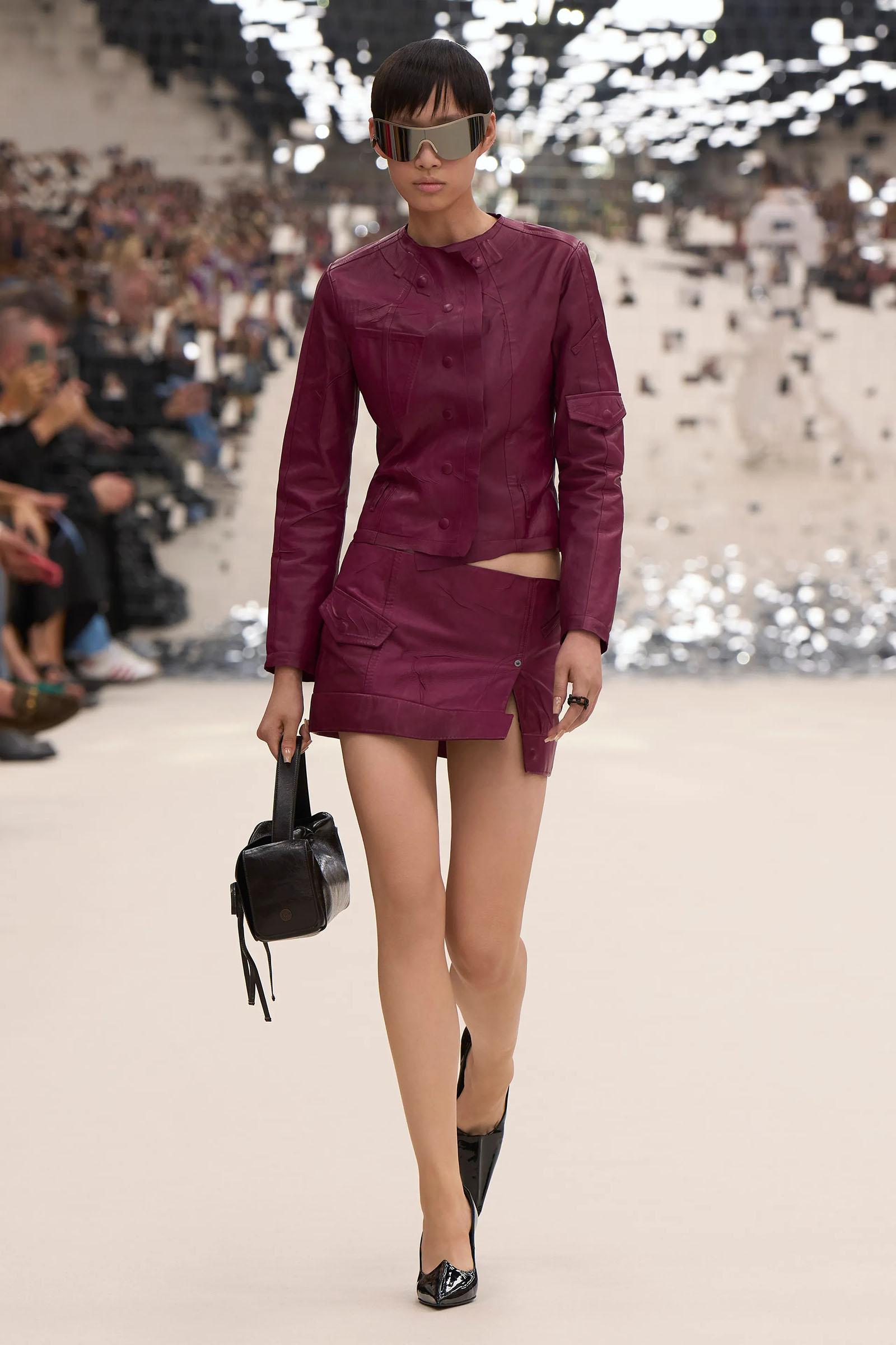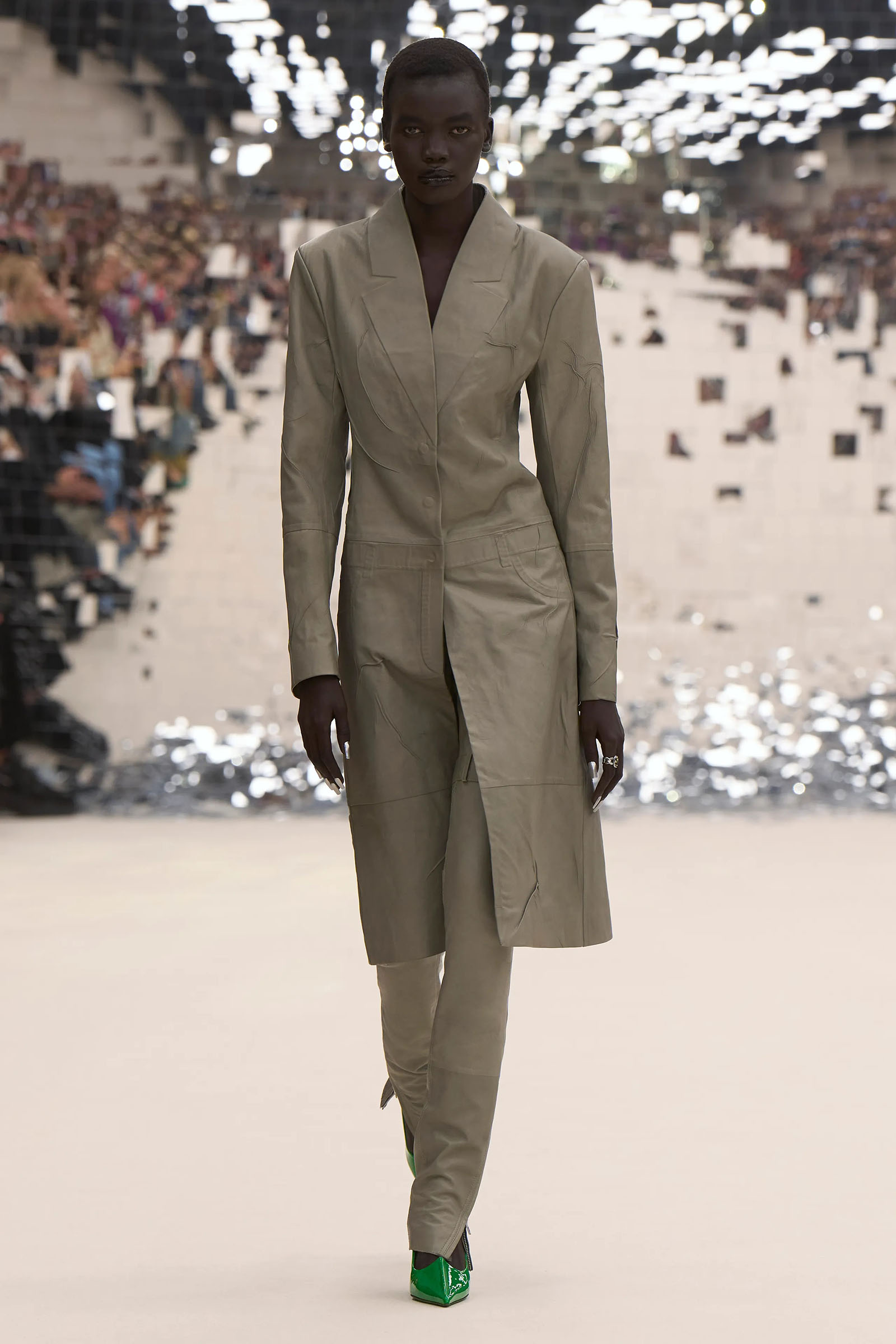 There was a fun trio of dark brown leather coat, teak leather skirt, and off-white leather minidress that came with conjoined hands-free handbags. Skirts of ragged jersey were articulated to sit off the hip, suspended. Vest tops and bras were entangled in a morning-after-the-night-before inversion of the conventional, reflected in the enormous sunken and fracturing disco ball from which the models came out to walk. The square-studded jeans that closed the show had a glint of a return toward something more conventionally put together. Kerfuffle-free—or at least almost—this Acne outing offered directionally disheveled and deconstructed womenswear paradigm pieces aplenty.
