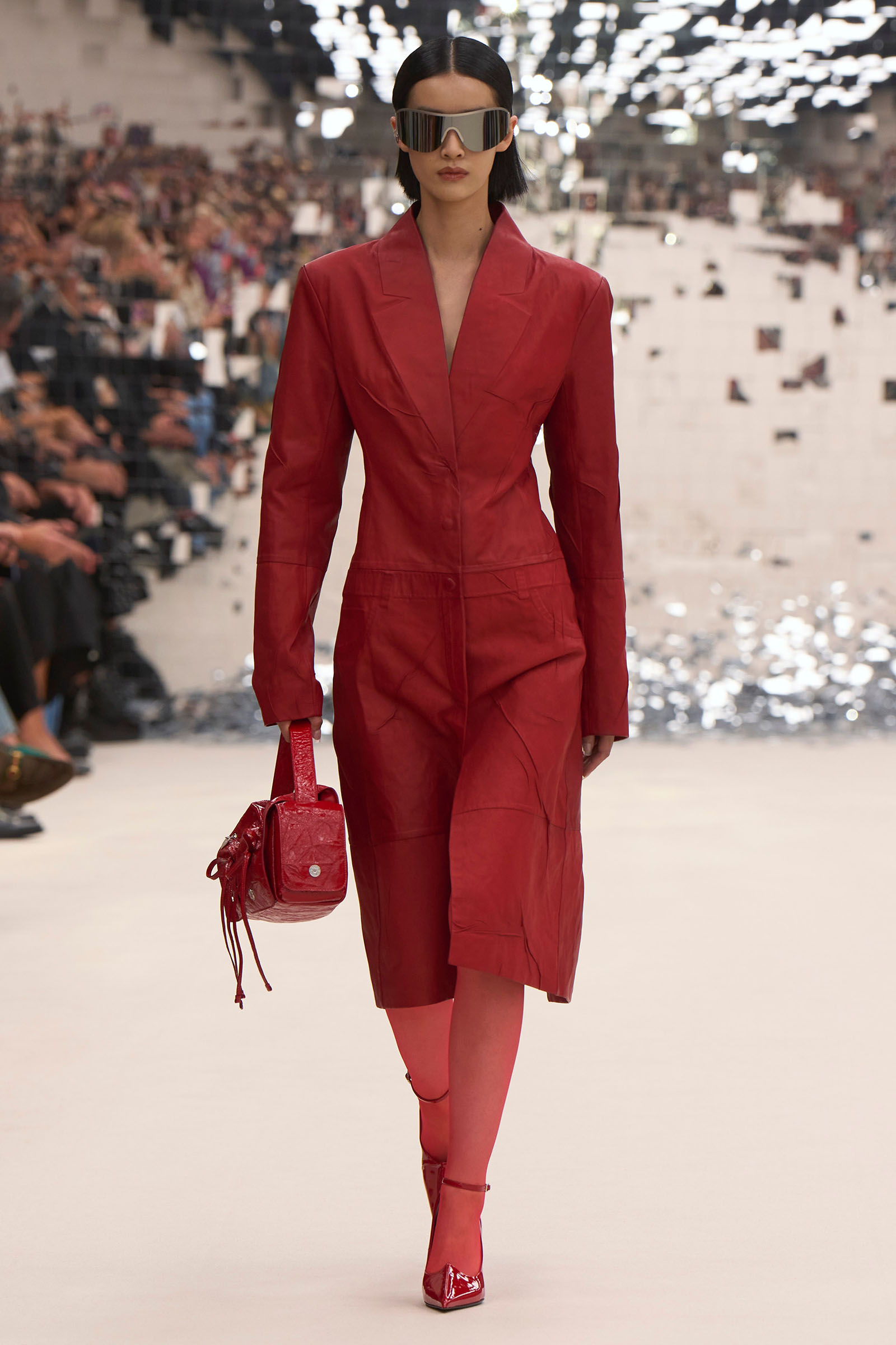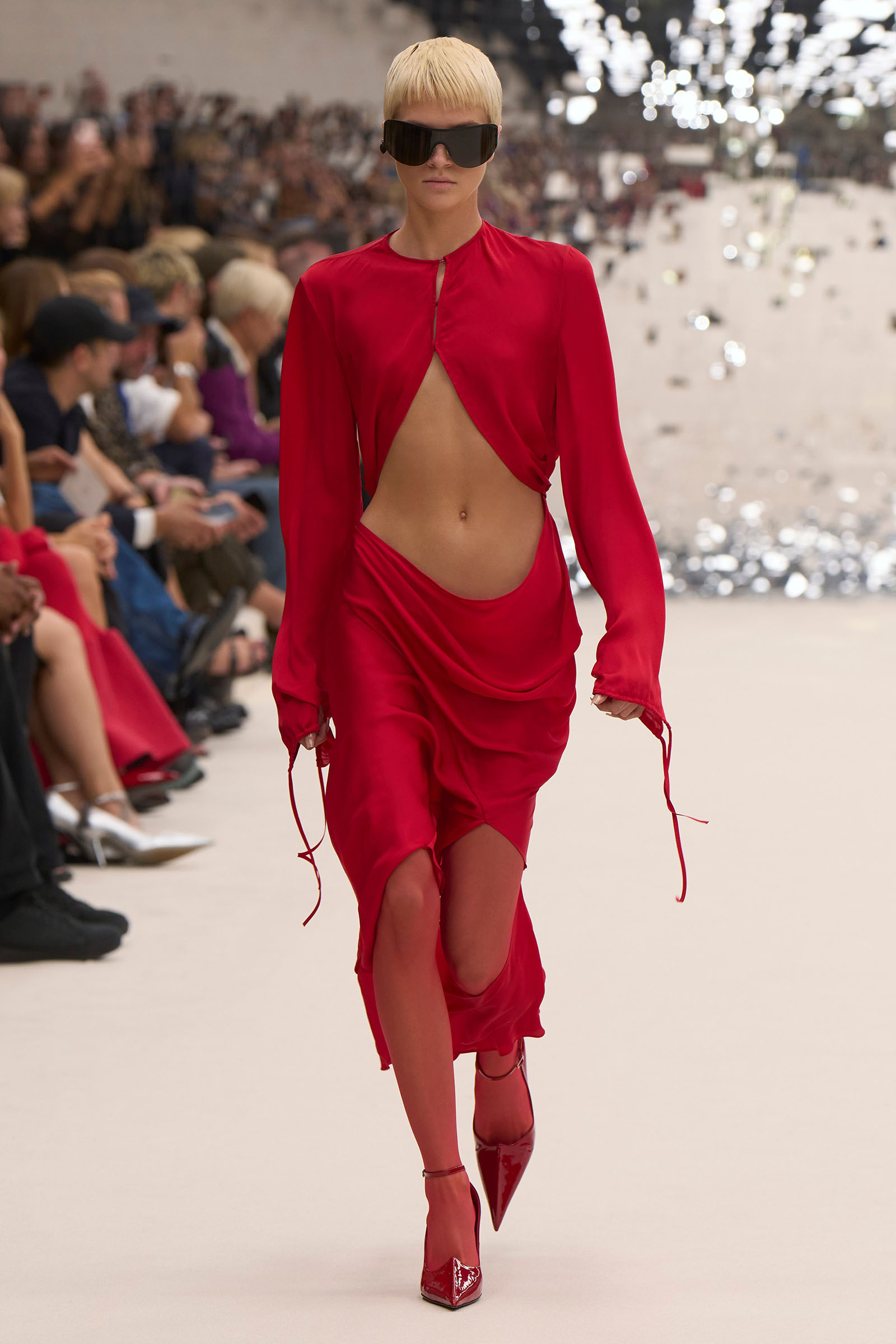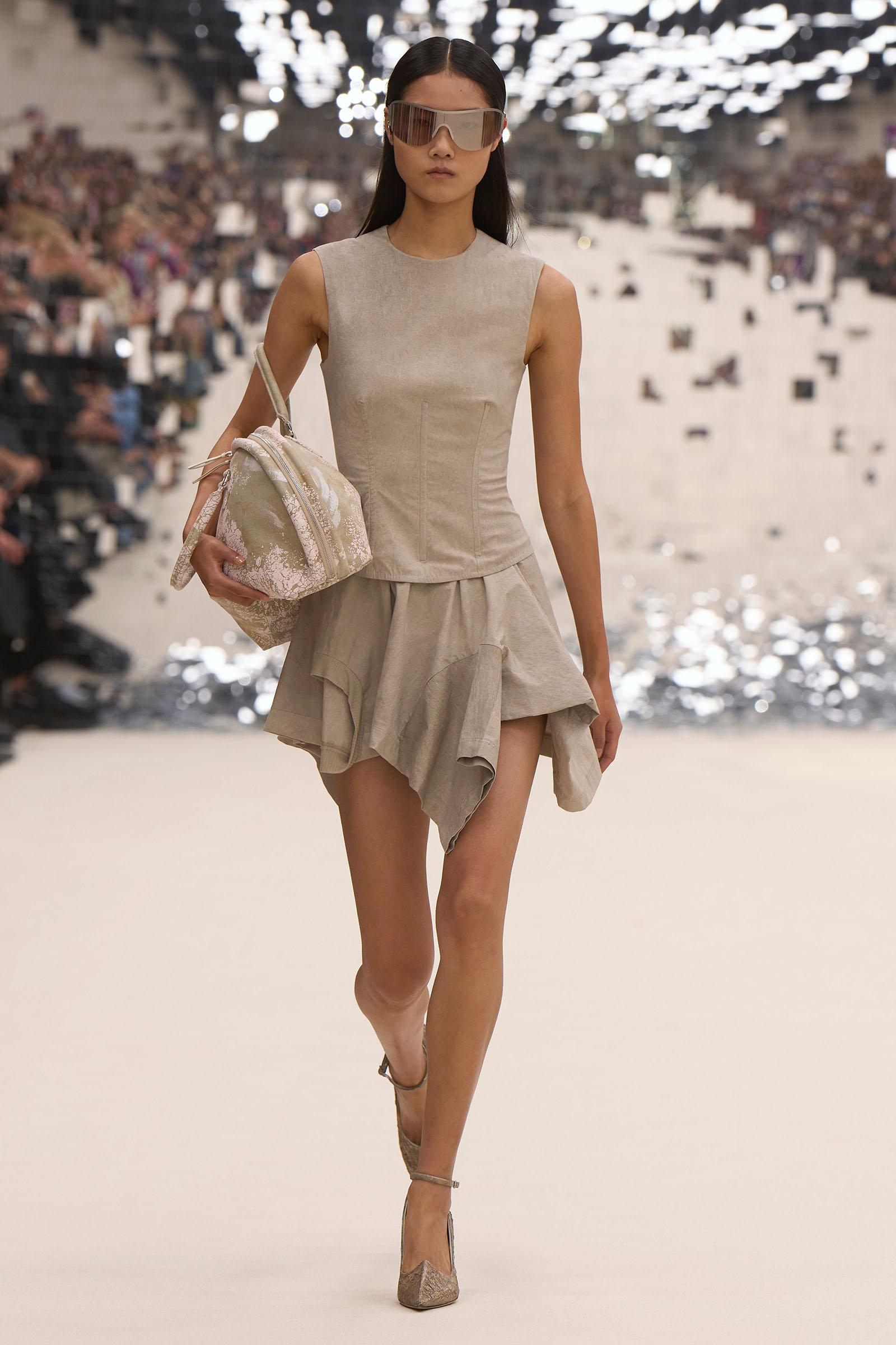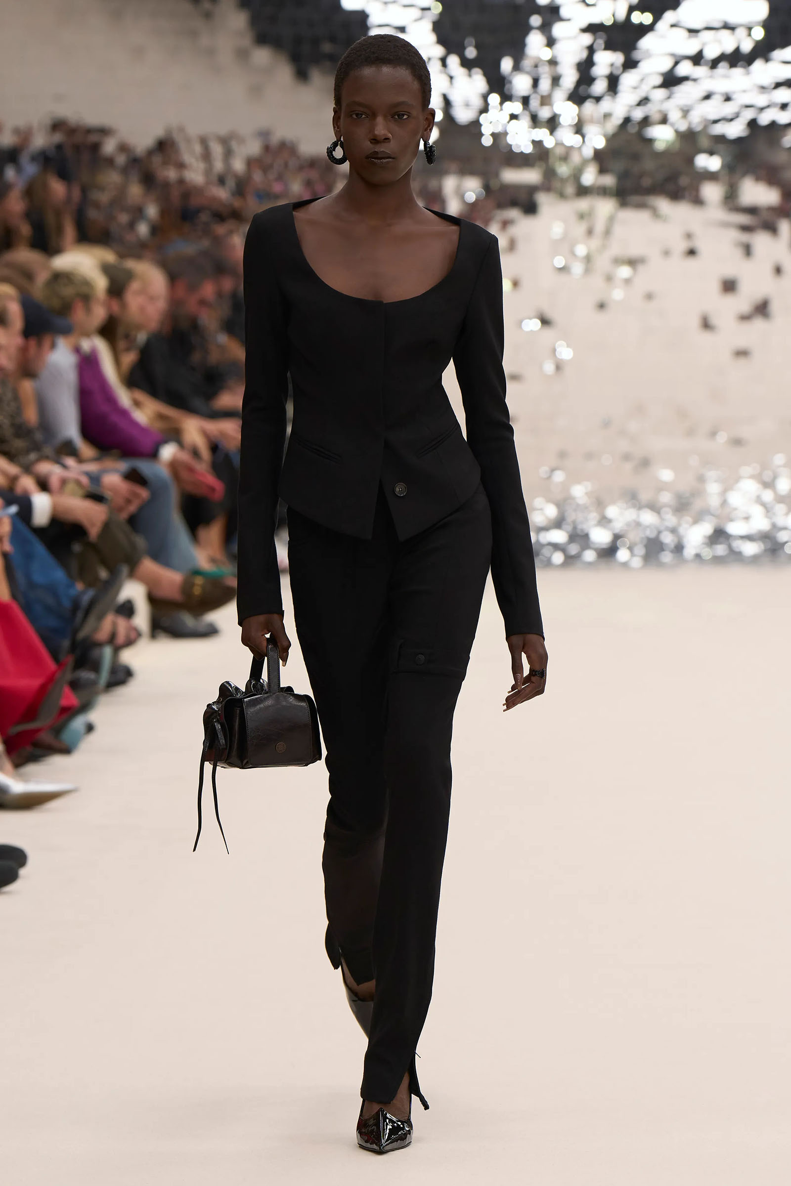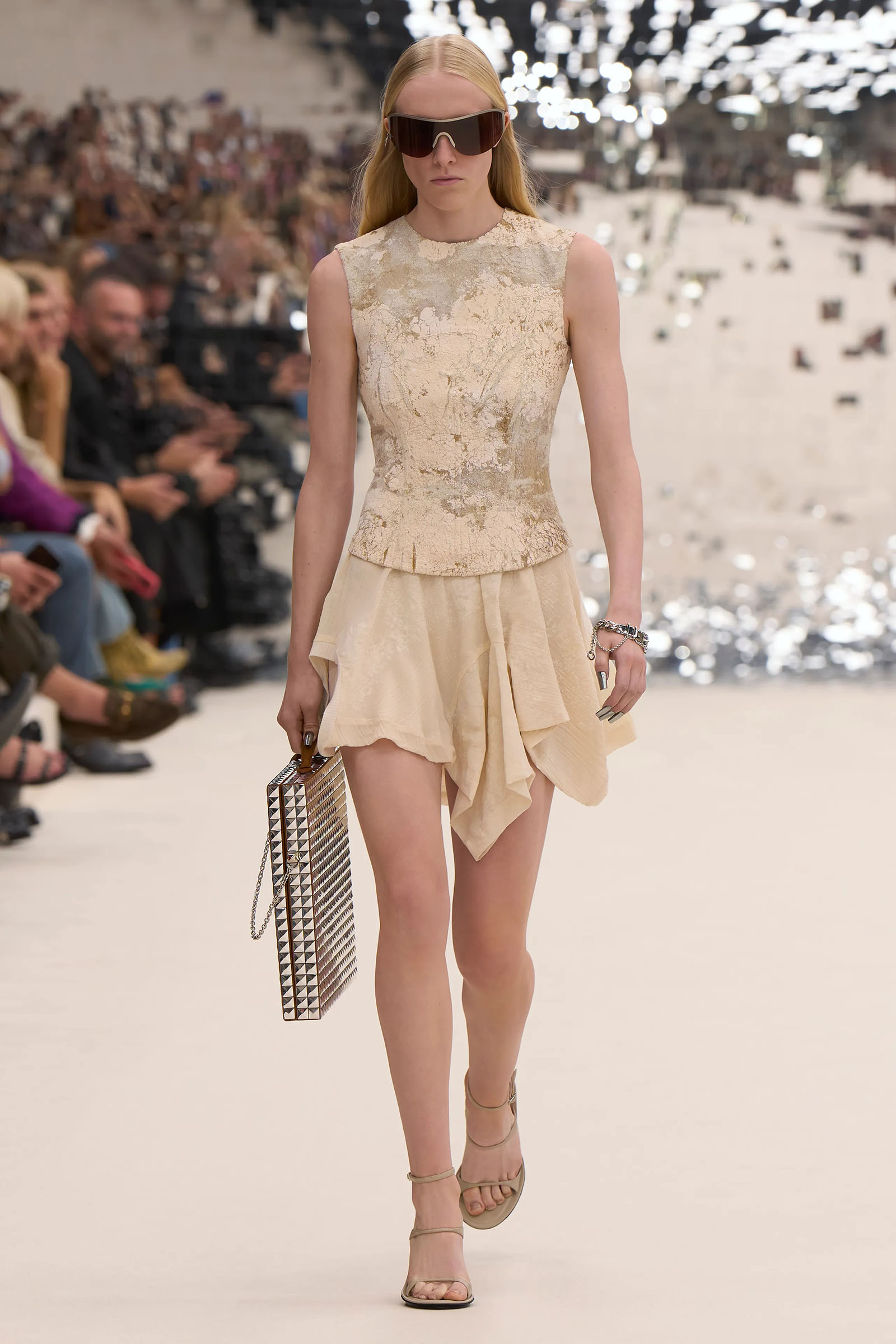 There was a fun trio of dark brown leather coat, teak leather skirt, and off-white leather minidress that came with conjoined hands-free handbags. Skirts of ragged jersey were articulated to sit off the hip, suspended. Vest tops and bras were entangled in a morning-after-the-night-before inversion of the conventional, reflected in the enormous sunken and fracturing disco ball from which the models came out to walk. The square-studded jeans that closed the show had a glint of a return toward something more conventionally put together. Kerfuffle-free—or at least almost—this Acne outing offered directionally disheveled and deconstructed womenswear paradigm pieces aplenty.