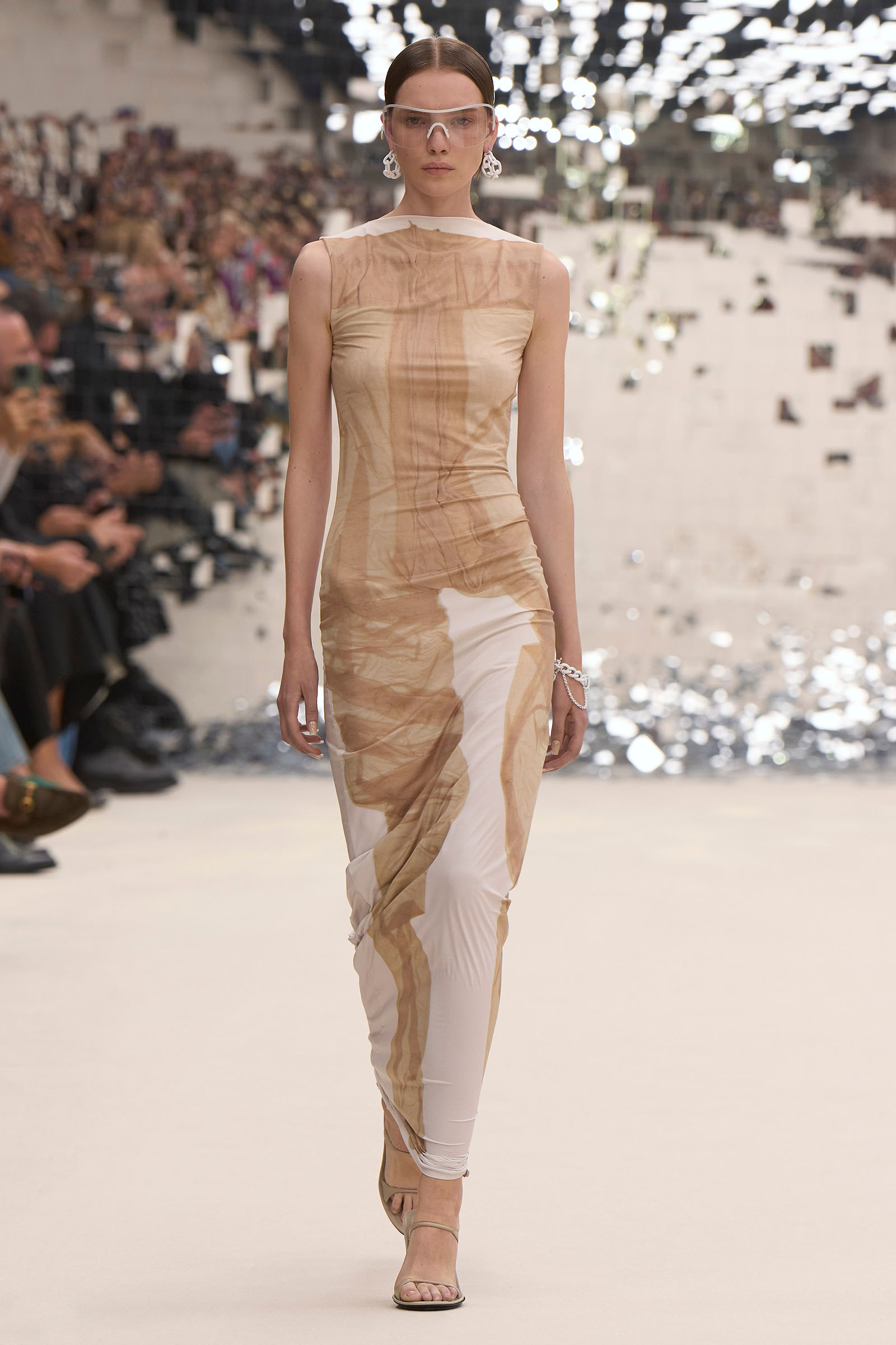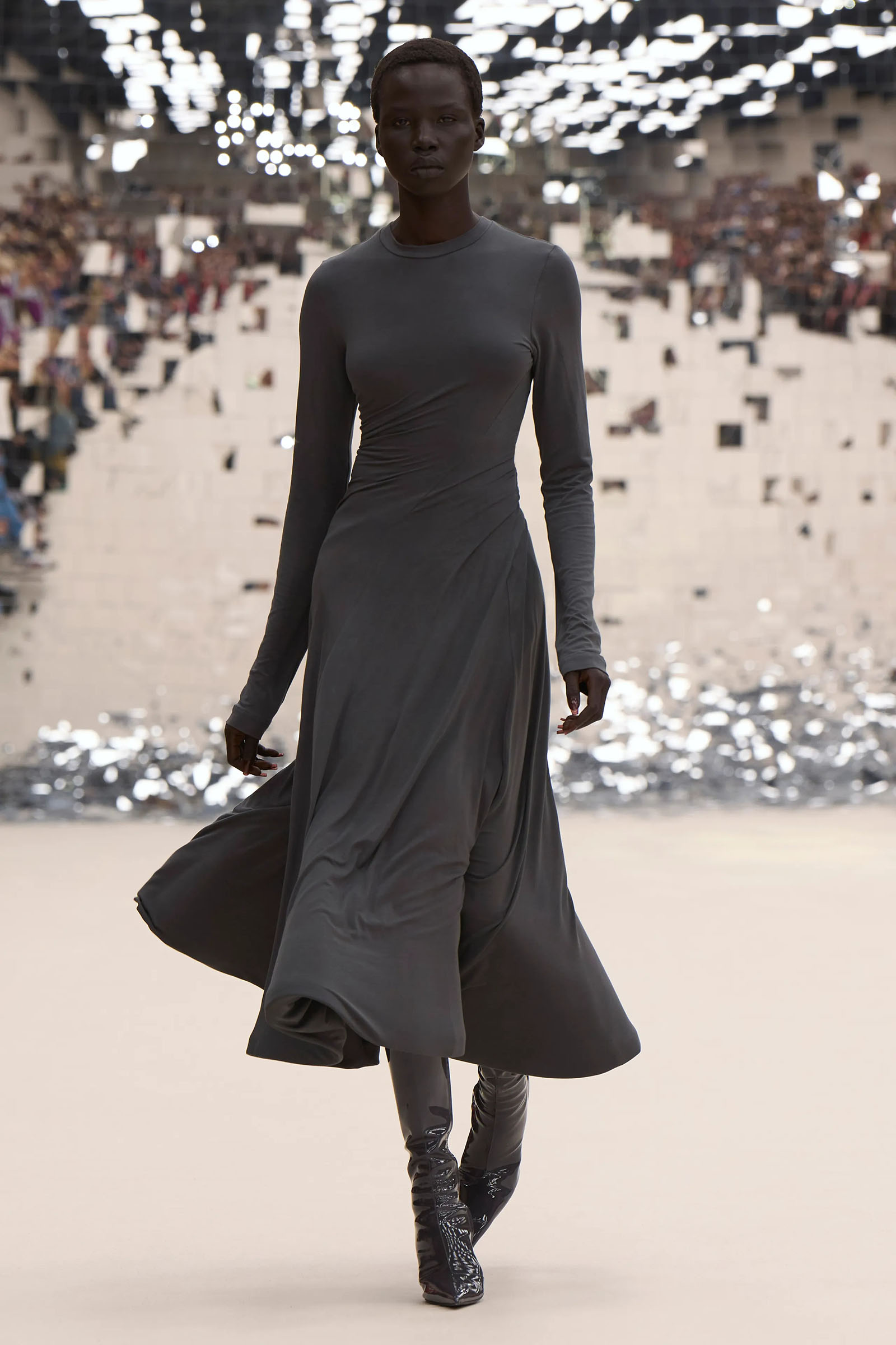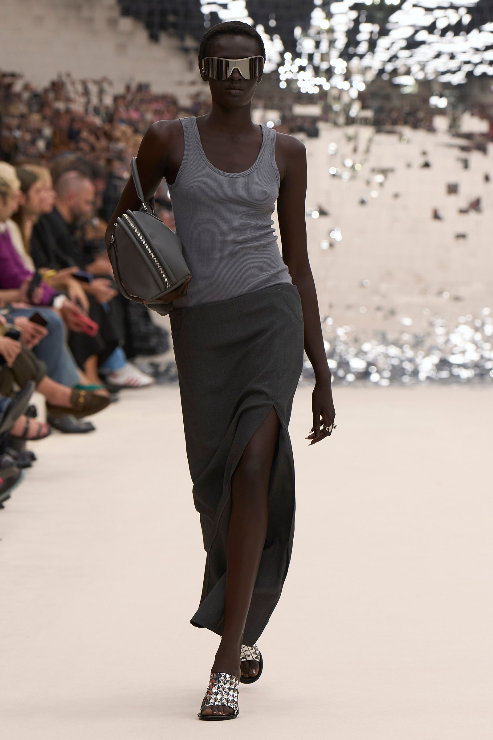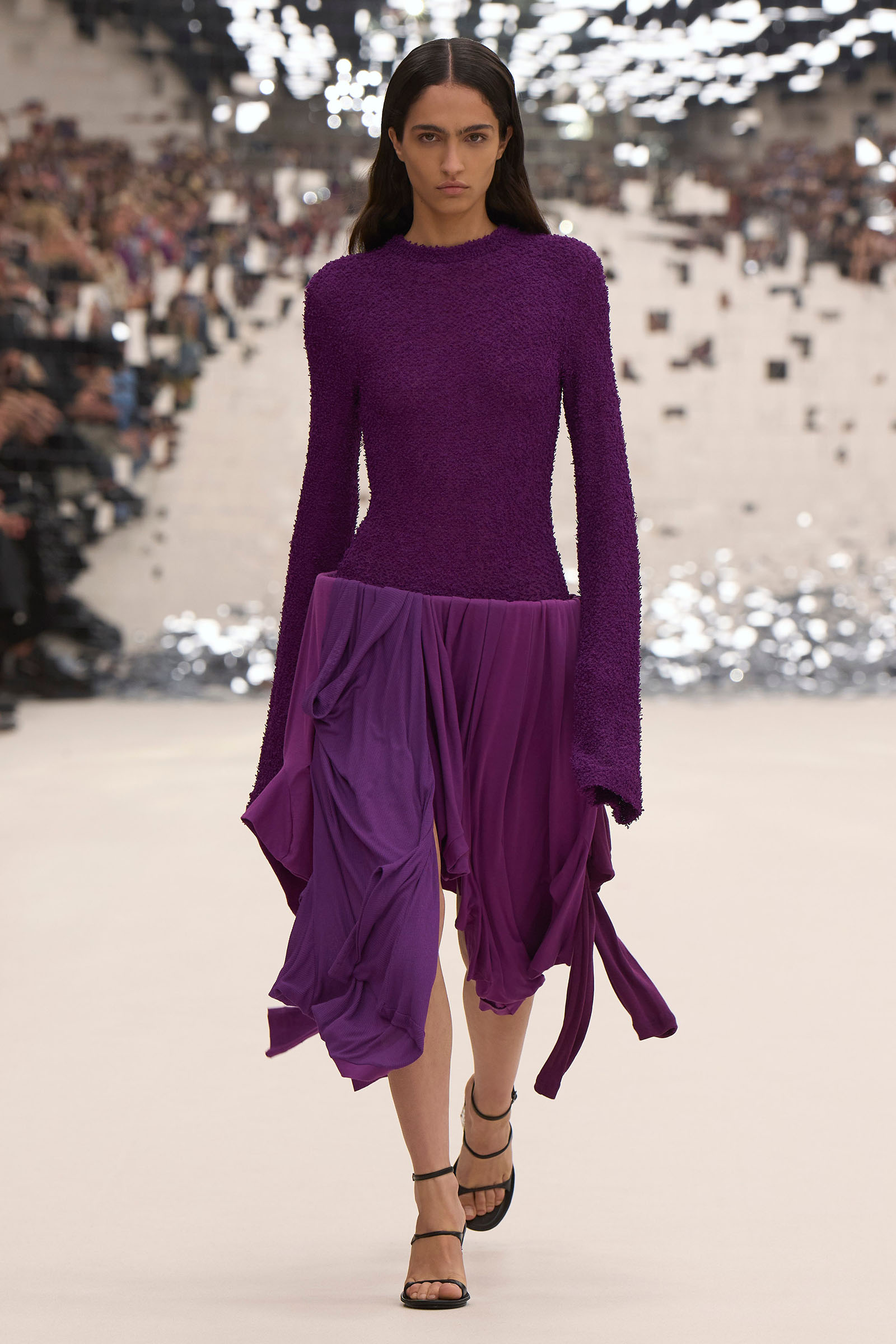 There was a fun trio of dark brown leather coat, teak leather skirt, and off-white leather minidress that came with conjoined hands-free handbags. Skirts of ragged jersey were articulated to sit off the hip, suspended. Vest tops and bras were entangled in a morning-after-the-night-before inversion of the conventional, reflected in the enormous sunken and fracturing disco ball from which the models came out to walk. The square-studded jeans that closed the show had a glint of a return toward something more conventionally put together. Kerfuffle-free—or at least almost—this Acne outing offered directionally disheveled and deconstructed womenswear paradigm pieces aplenty.