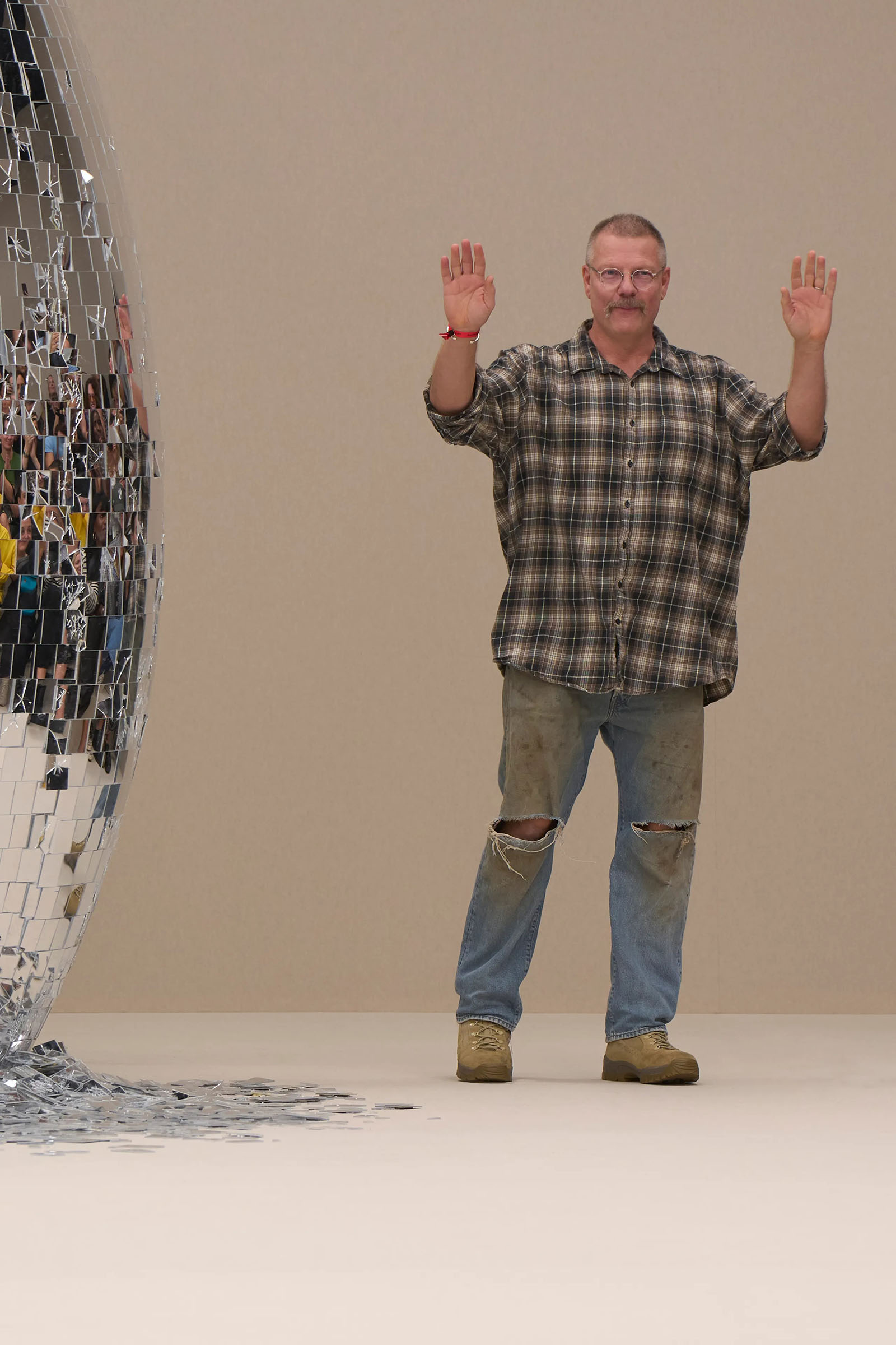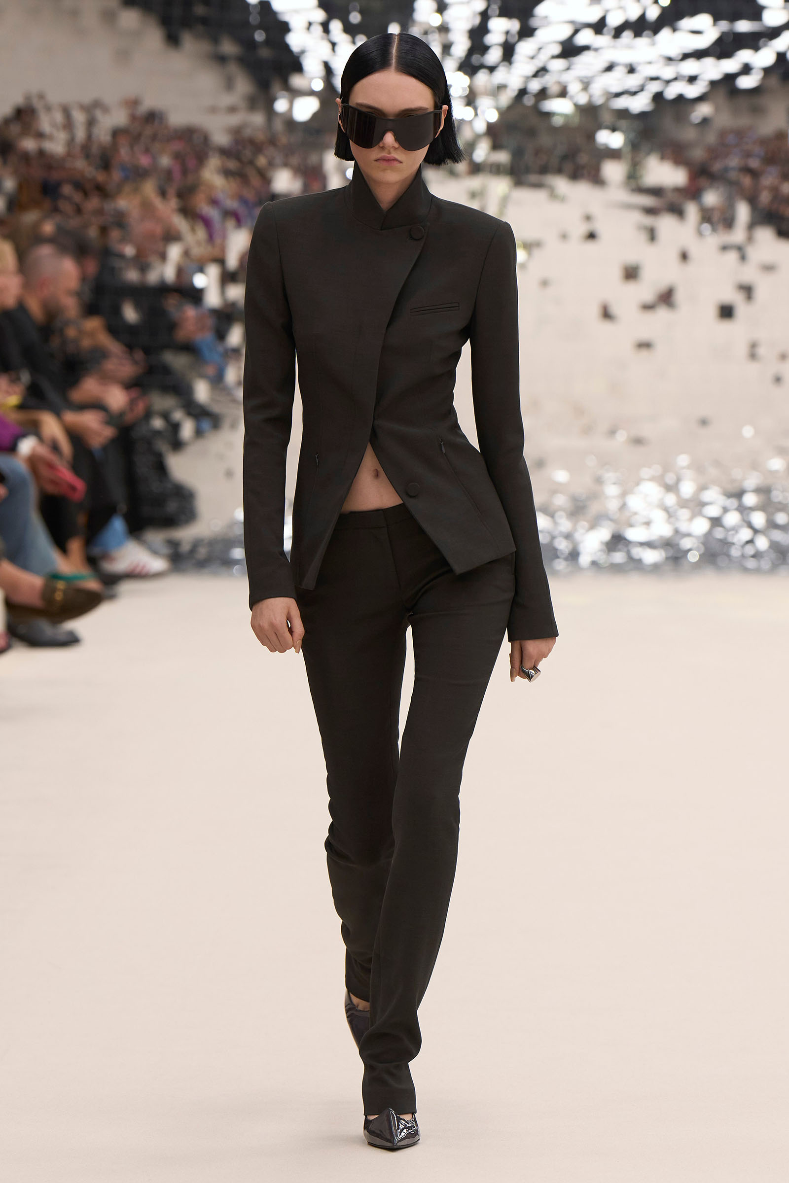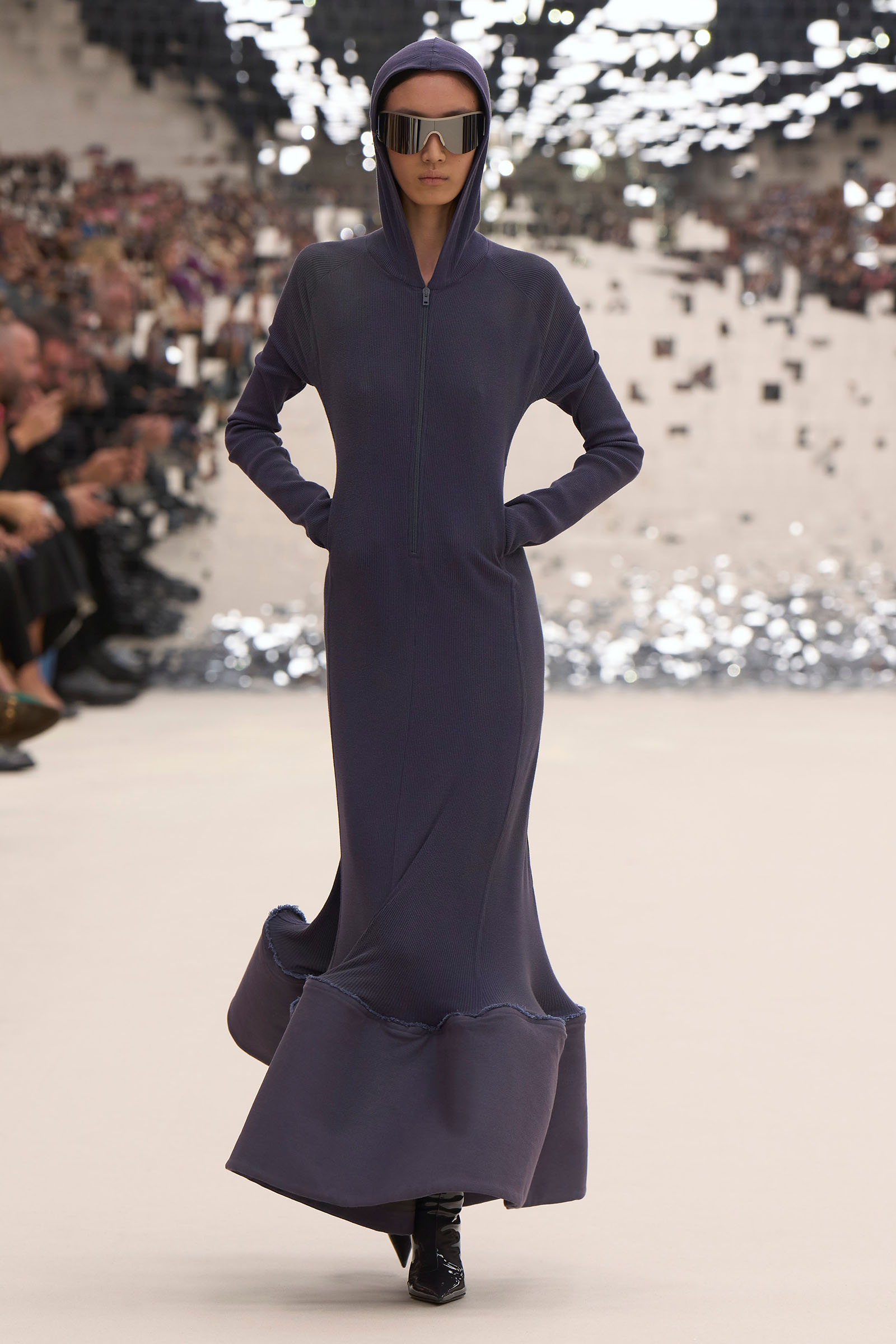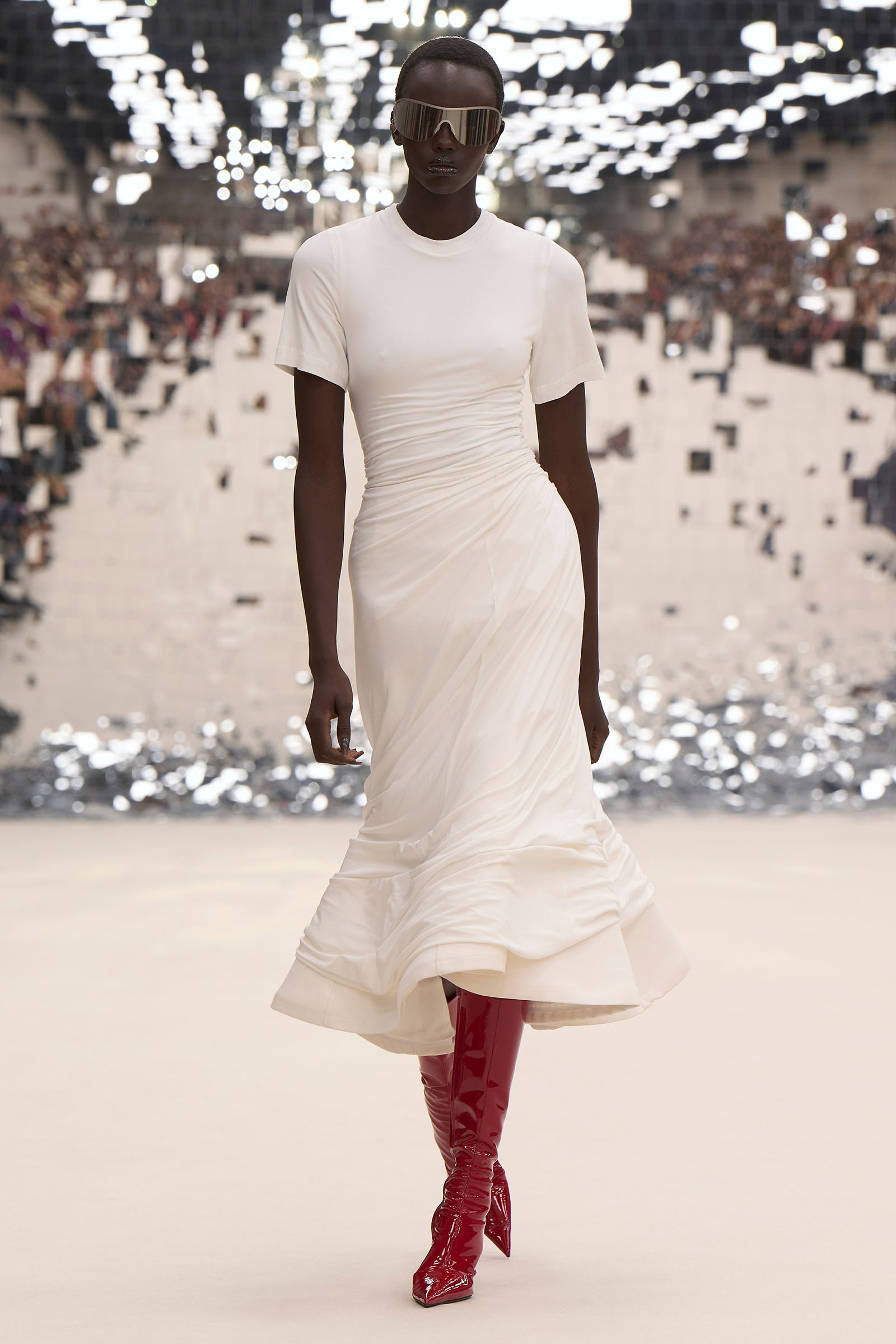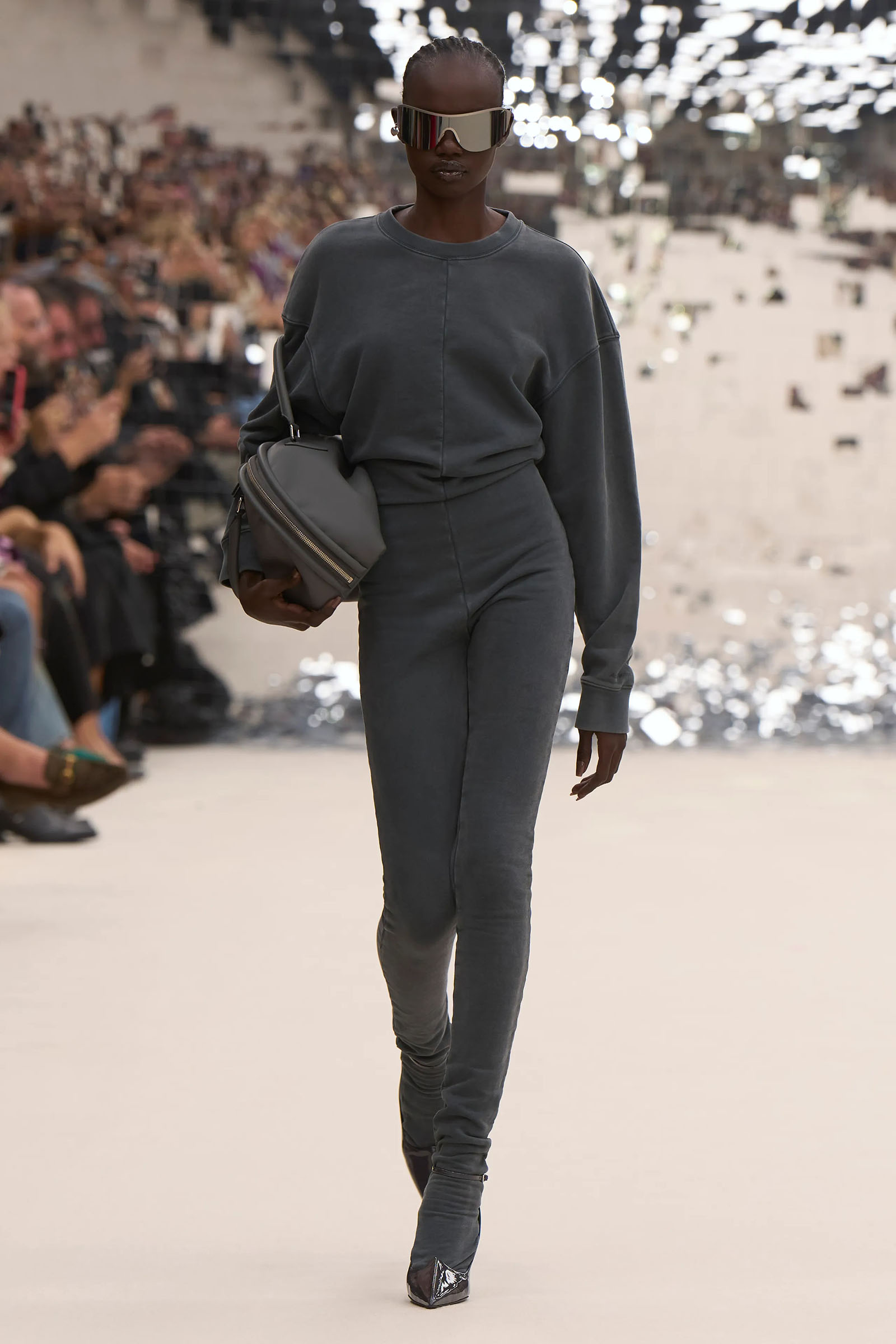 There was a fun trio of dark brown leather coat, teak leather skirt, and off-white leather minidress that came with conjoined hands-free handbags. Skirts of ragged jersey were articulated to sit off the hip, suspended. Vest tops and bras were entangled in a morning-after-the-night-before inversion of the conventional, reflected in the enormous sunken and fracturing disco ball from which the models came out to walk. The square-studded jeans that closed the show had a glint of a return toward something more conventionally put together. Kerfuffle-free—or at least almost—this Acne outing offered directionally disheveled and deconstructed womenswear paradigm pieces aplenty.