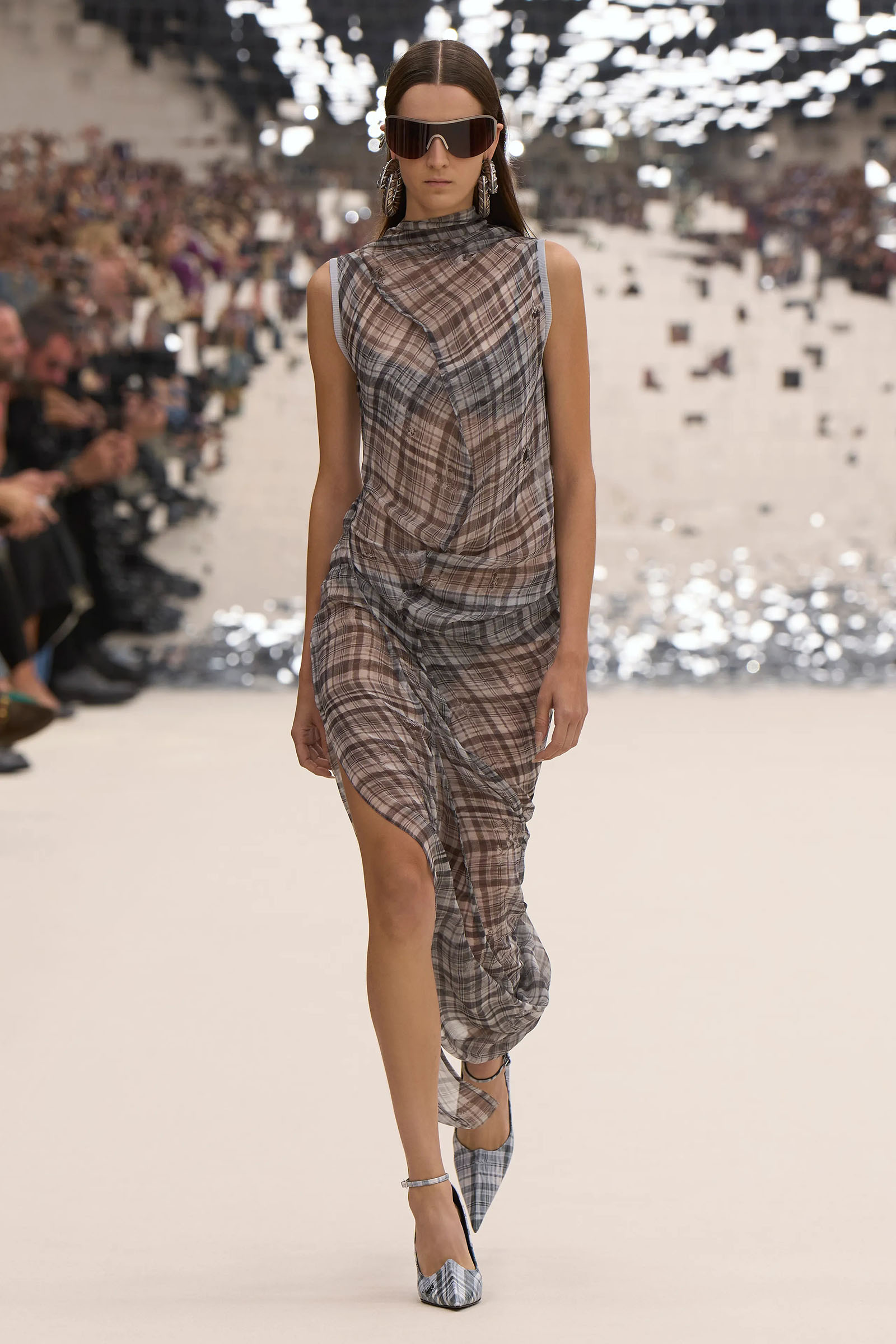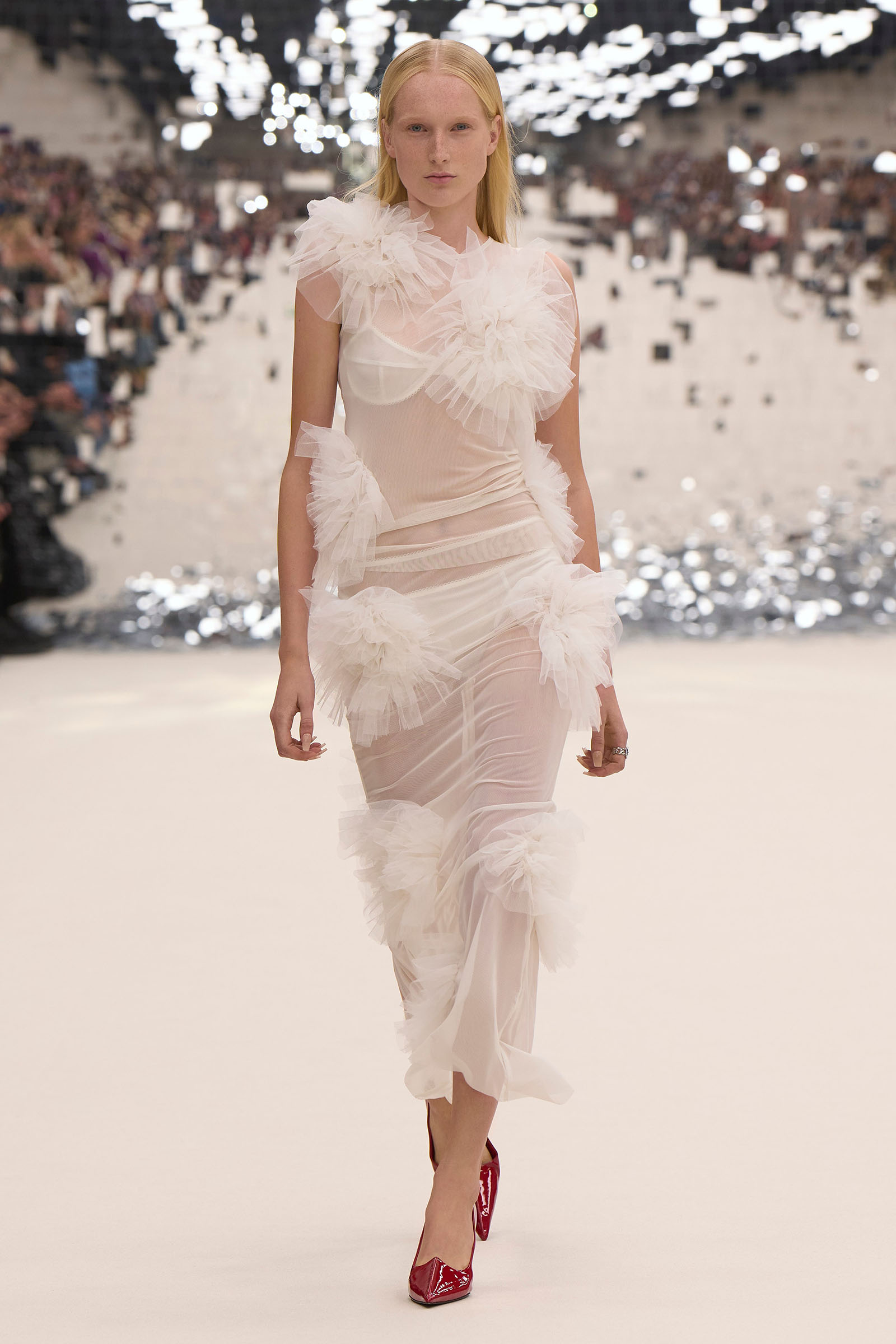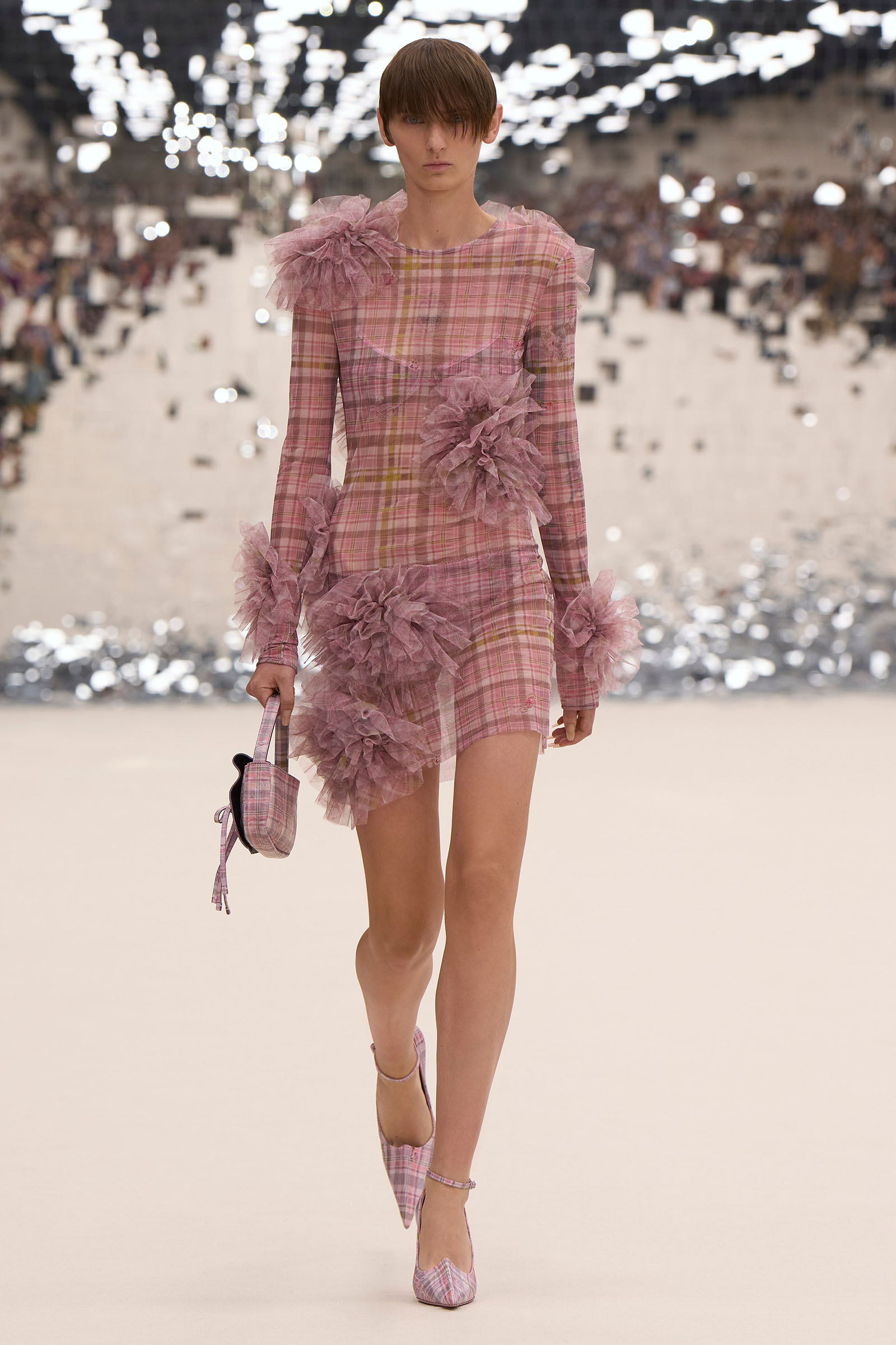 Elsewhere, scanned relics from Jebb’s suite Physical Evidence of a Woman (a pair of false eyelashes, some chaotically discarded pantyhose) were placed on garments as imprinted fossils of femininity. Tufts of feather sprouted from a ribbed jersey dress and vest; a trench was lumpily cut to look as if done up in the dark; and tulle pom-poms were dotted in disarray across sheer plain and check dresses.