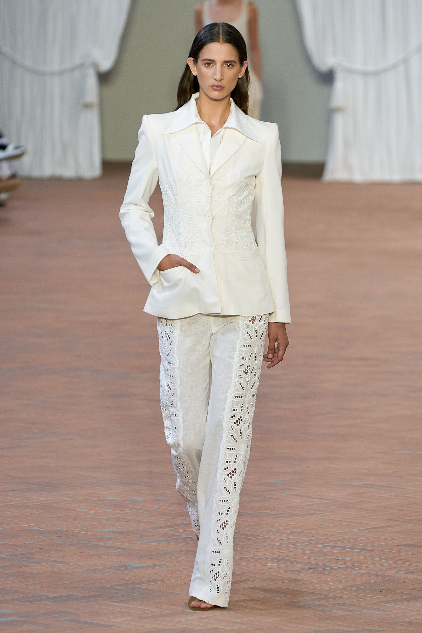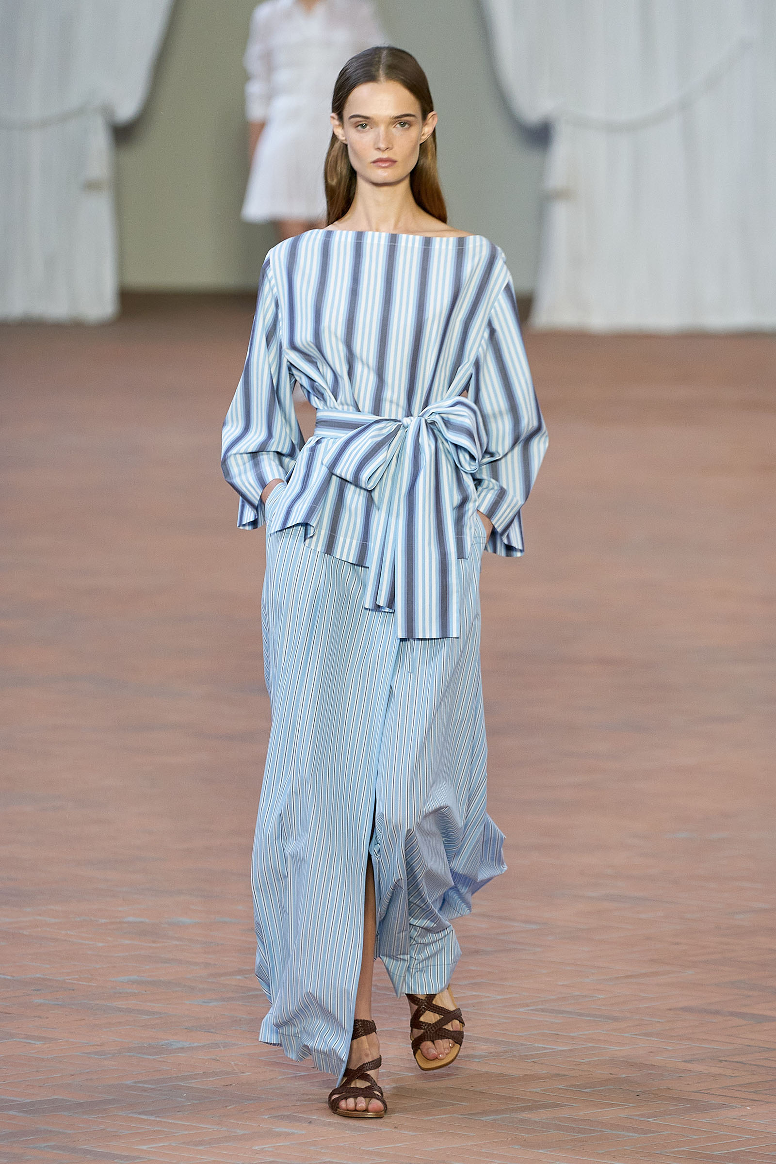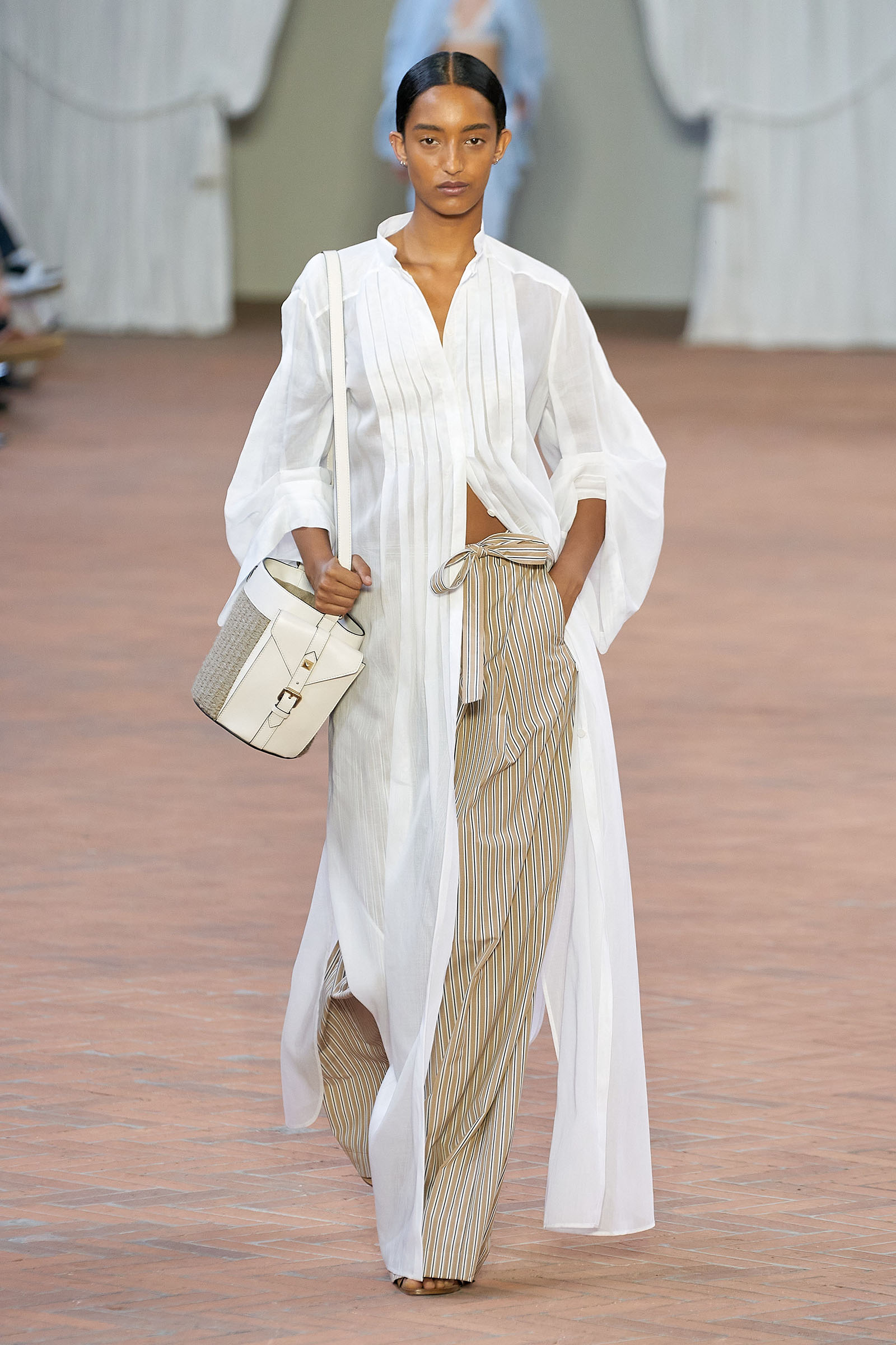 Since before the pandemic, Ferretti has been focused on expanding her range, because women can’t live in chiffon alone. The lightness that’s a hallmark of her evening styles hasn’t always translated to her daywear, but the chemisier dress spilling off one shoulder that opened the show and the long white dresses with hand-tucked pleats that followed it had the ease of resort clothes. She kept the vibe going with striped cotton pajama separates and a shirtdress cut as generous as a caftan. You could see women wearing these pieces on holiday.