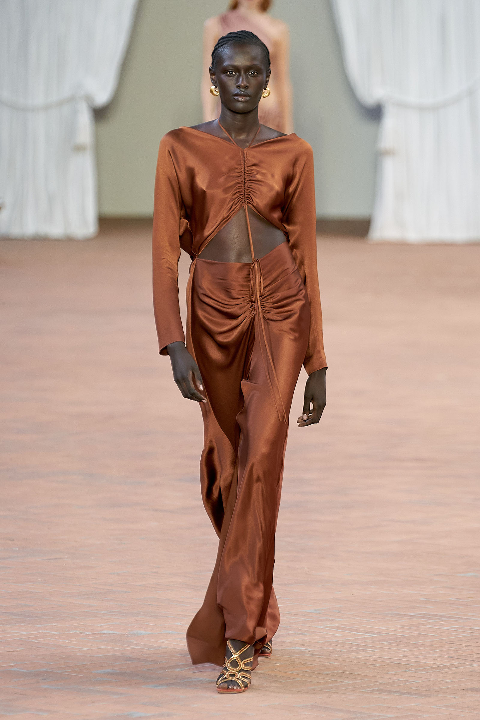 Ferretti made her name with goddess dresses more delicate than dramatic. Look 32’s white chiffon, with an asymmetric bodice ruched on one side and softly draped on the other, is exemplary, and given that its antecedents date to ancient Rome, it really is timeless. Others she gave a more contemporary spin with hardware ring details, as seen on a red number, or side cutouts trimmed with chunky metal chain, as on a blush pink style.