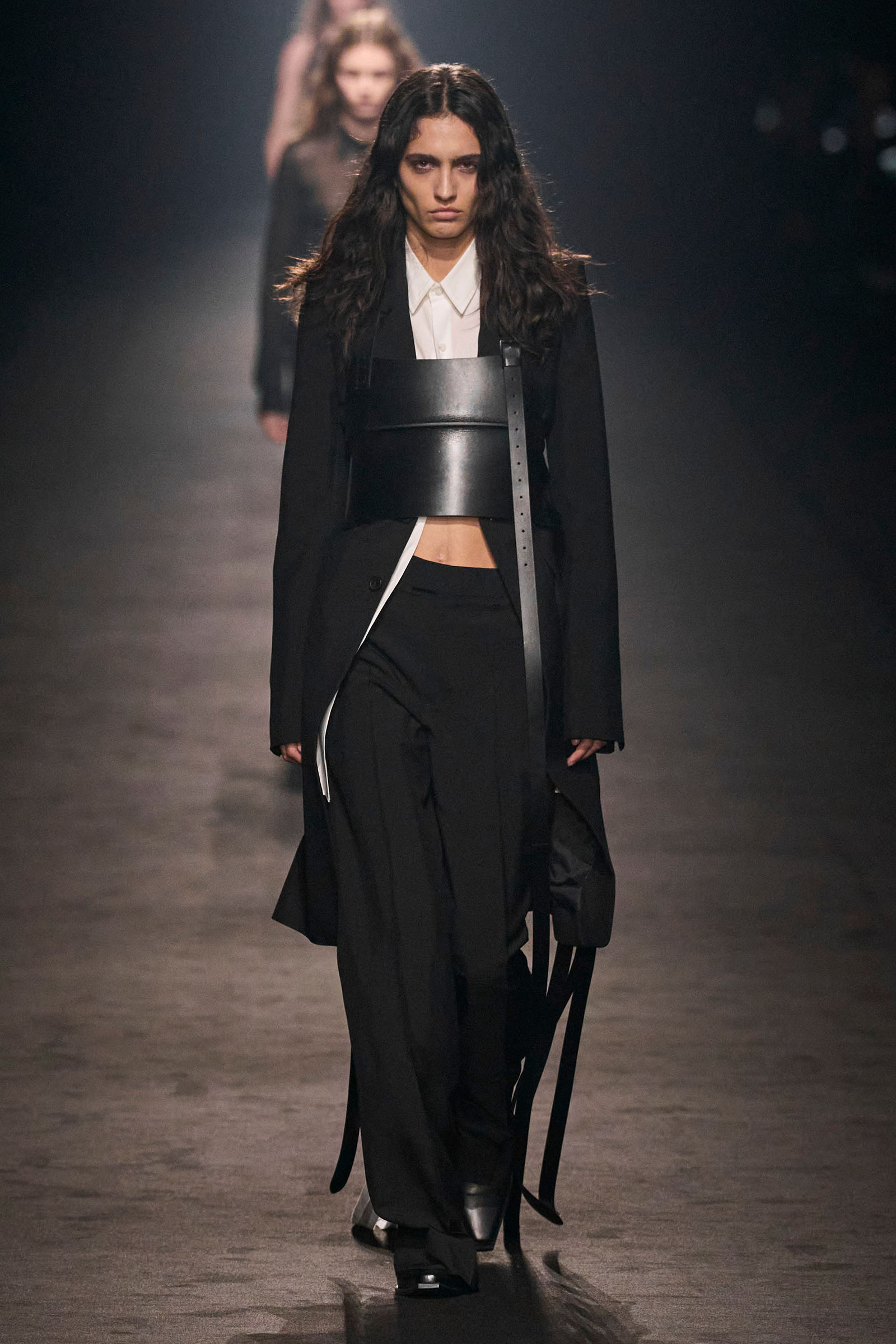 Having joined the brand in 2020, the 20-something Gallici does have a decent handle on Demeulemeester signatures like androgynous tailoring and white shirts and leather bibs and harnesses. The royal blue of a stretchy sheer dress looked like it was inspired by the same color in an iconic spring 1998 Demeulemeester show. Kirsten Owen, who appeared in the lineup tonight, walked that runway 25 years ago. But things were weighed down here by multipocketed pants and overskirts and the ribbons that trailed off many of the looks and dragged on the runway—all 100 meters of it. Demeulemeester was a most poetical designer, but she also stood for a kind of rigor.
