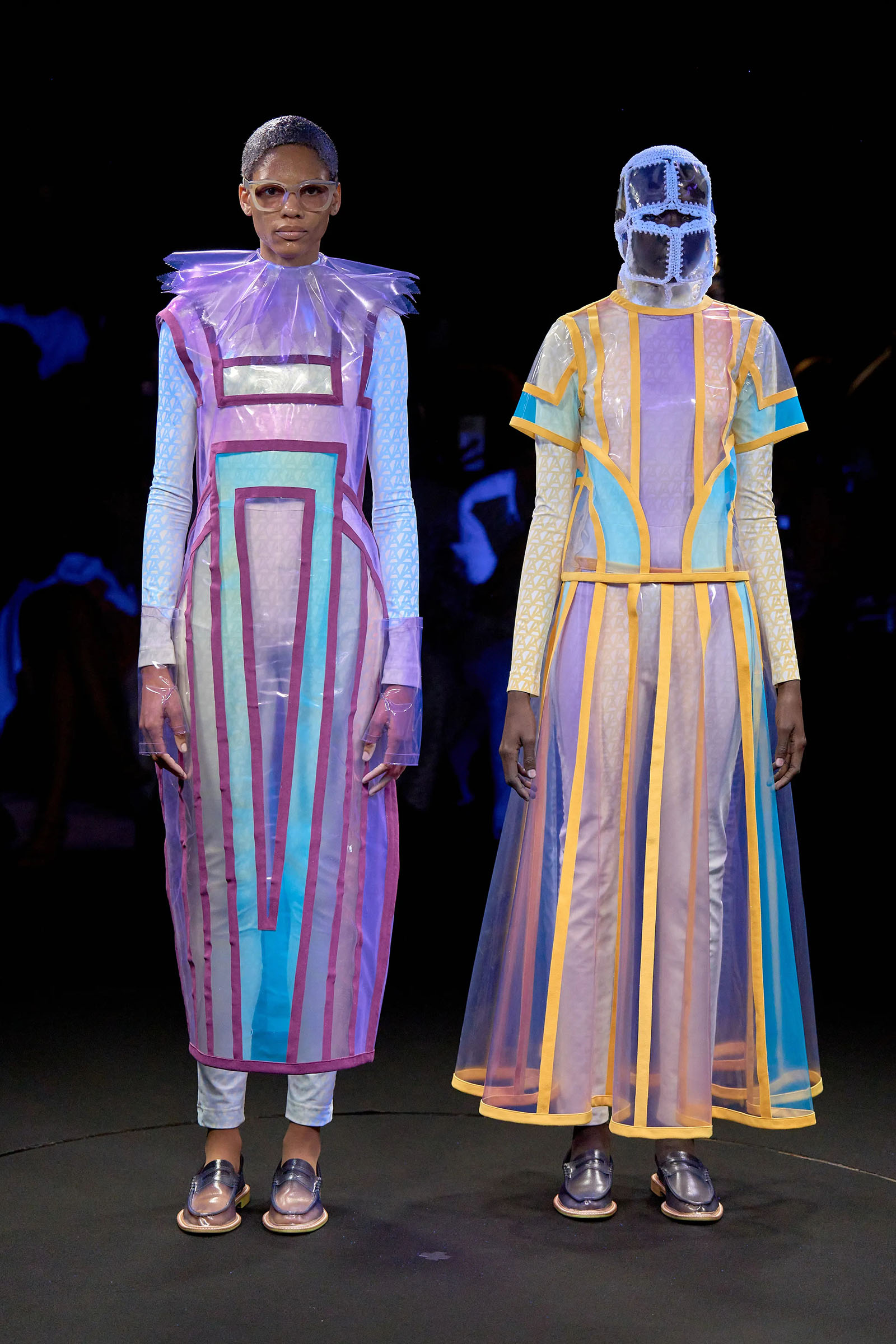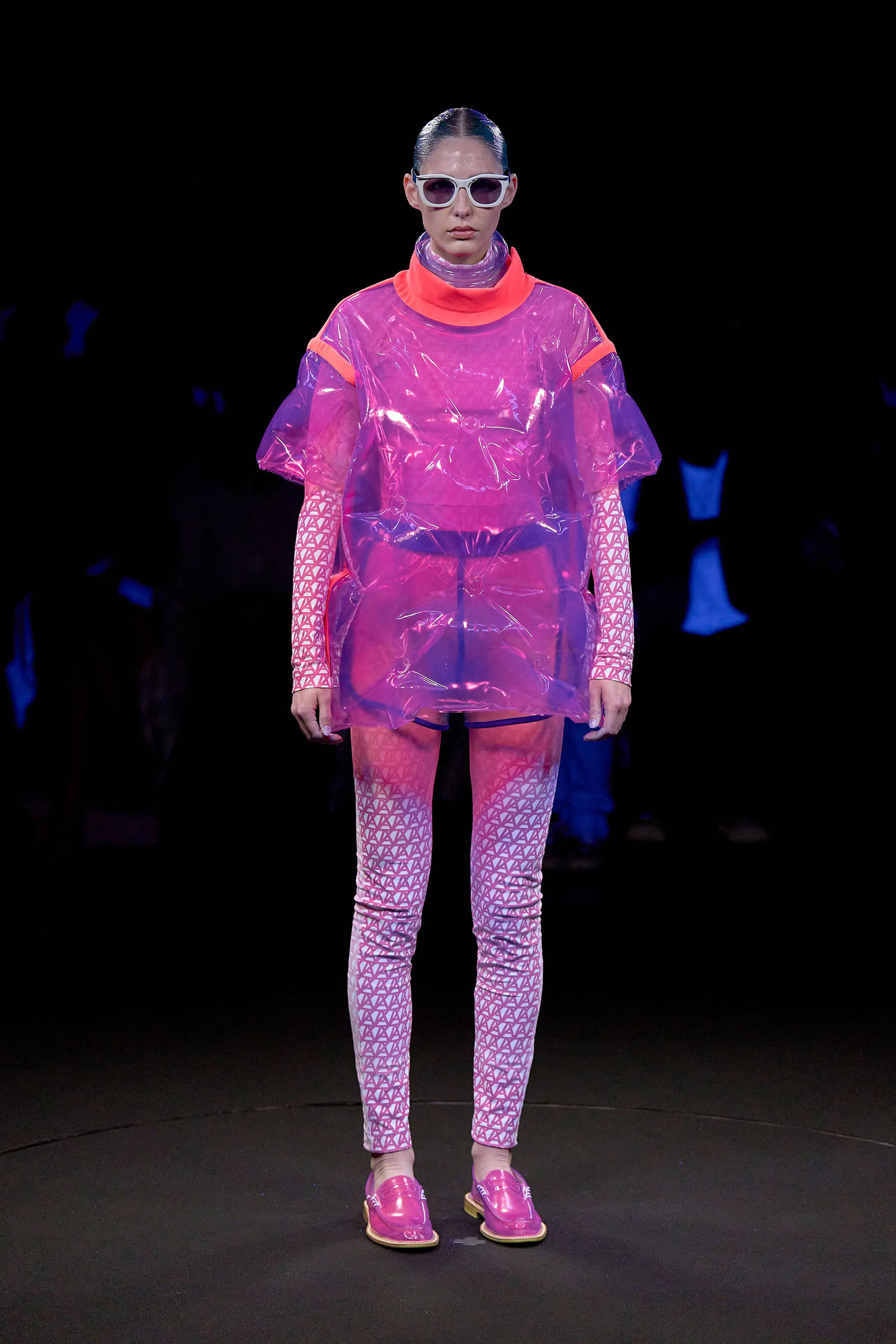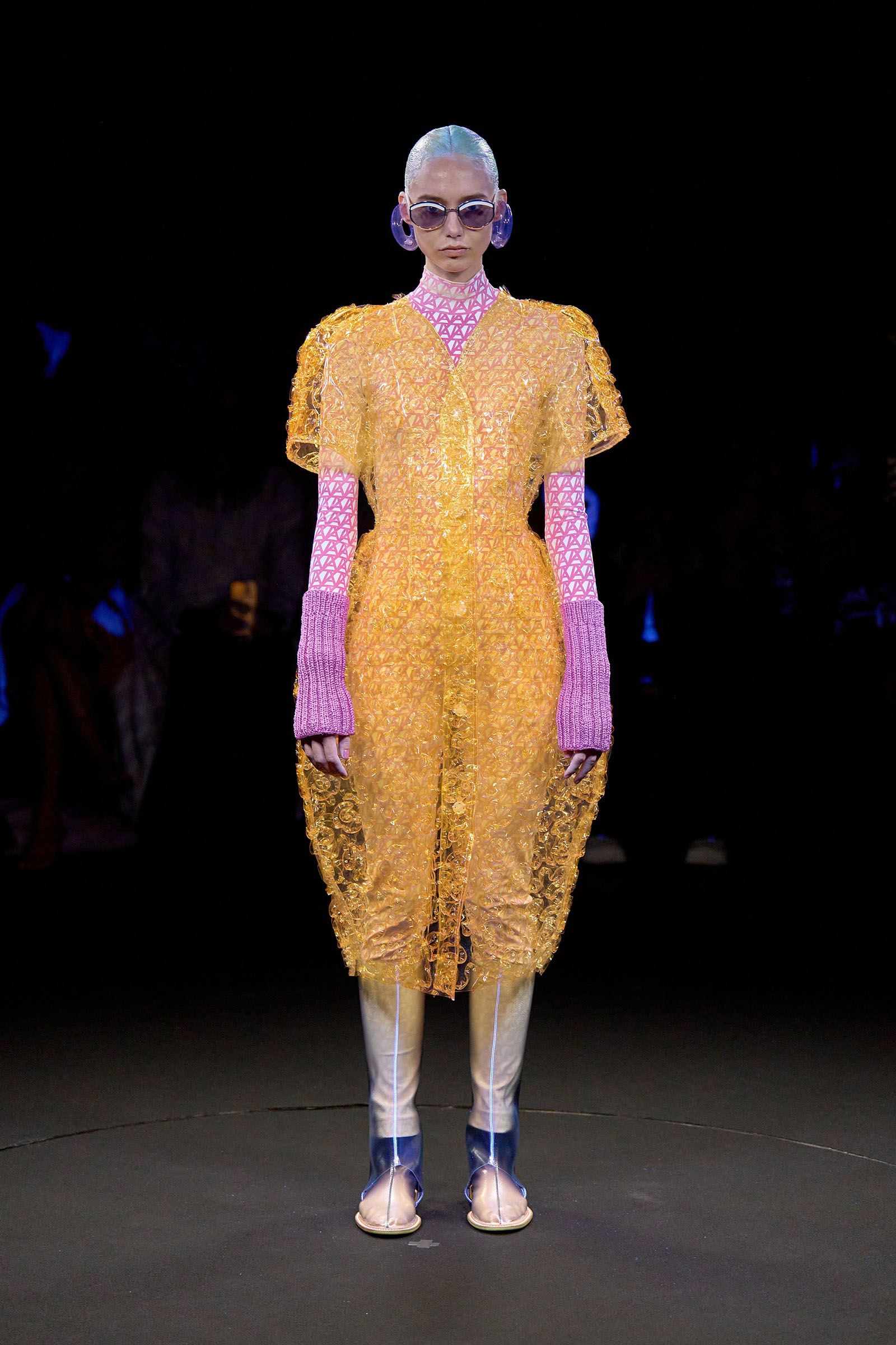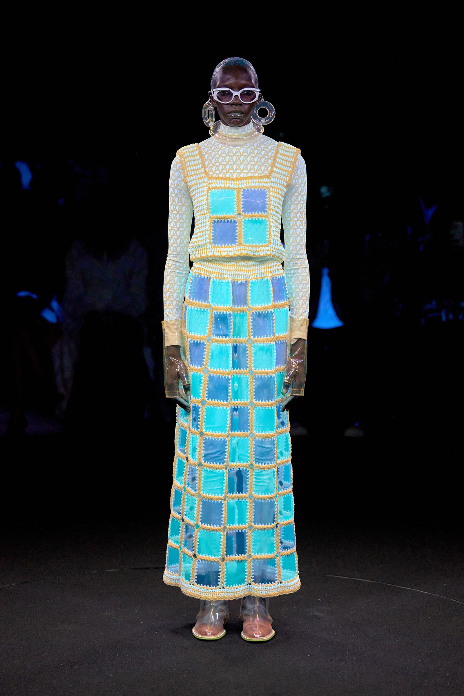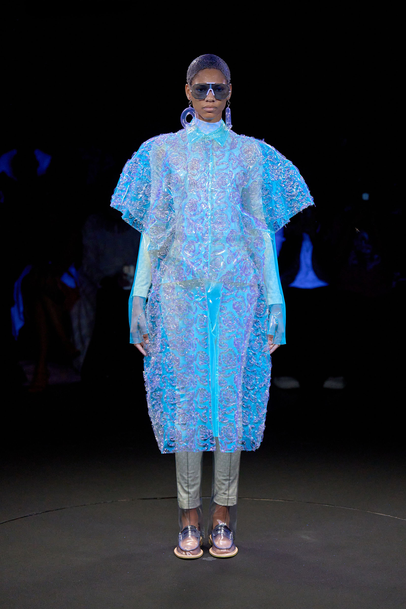 The models came out singly or in pairs in double layered looks; all-white Angrealage bodysuits under more voluminous transparent PVC garments in various shapes, some lined with strips of fabric or squares of crochet. Bags, boots and loafers were also made in the house’s new PVC, which Morinaga said was not only photochromatic but phthalate-free and therefore (relatively) environmentally friendly. Once they had been photographed in this all-white and transparent apparel, the models stood on a turntable set into the floor: this rotated, allowing the banks of UV and other lights in the gantry above to illuminate the garments—which of course changed color.