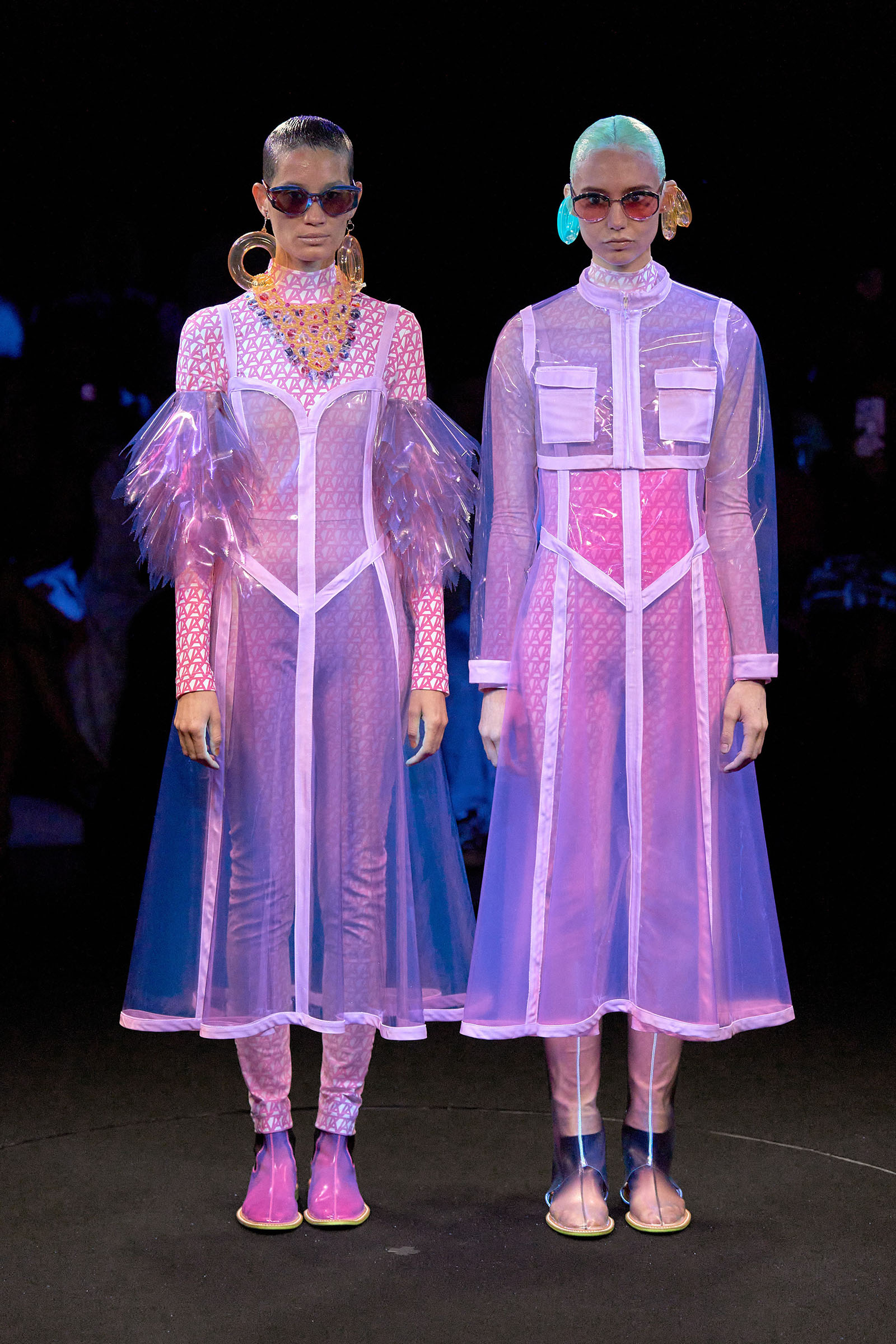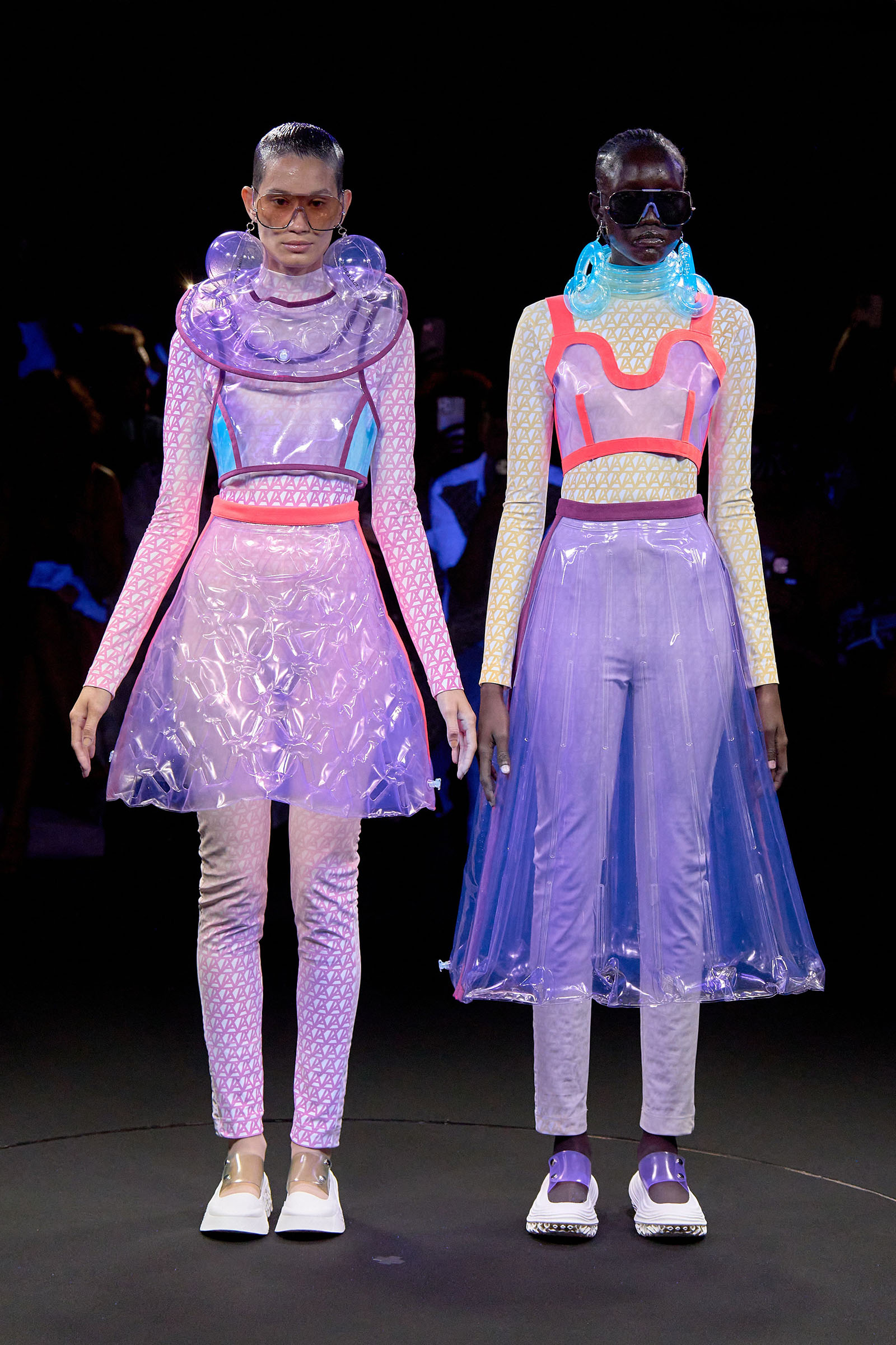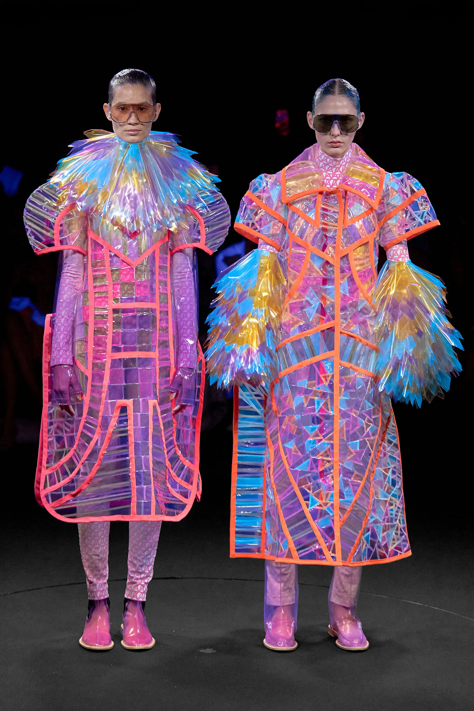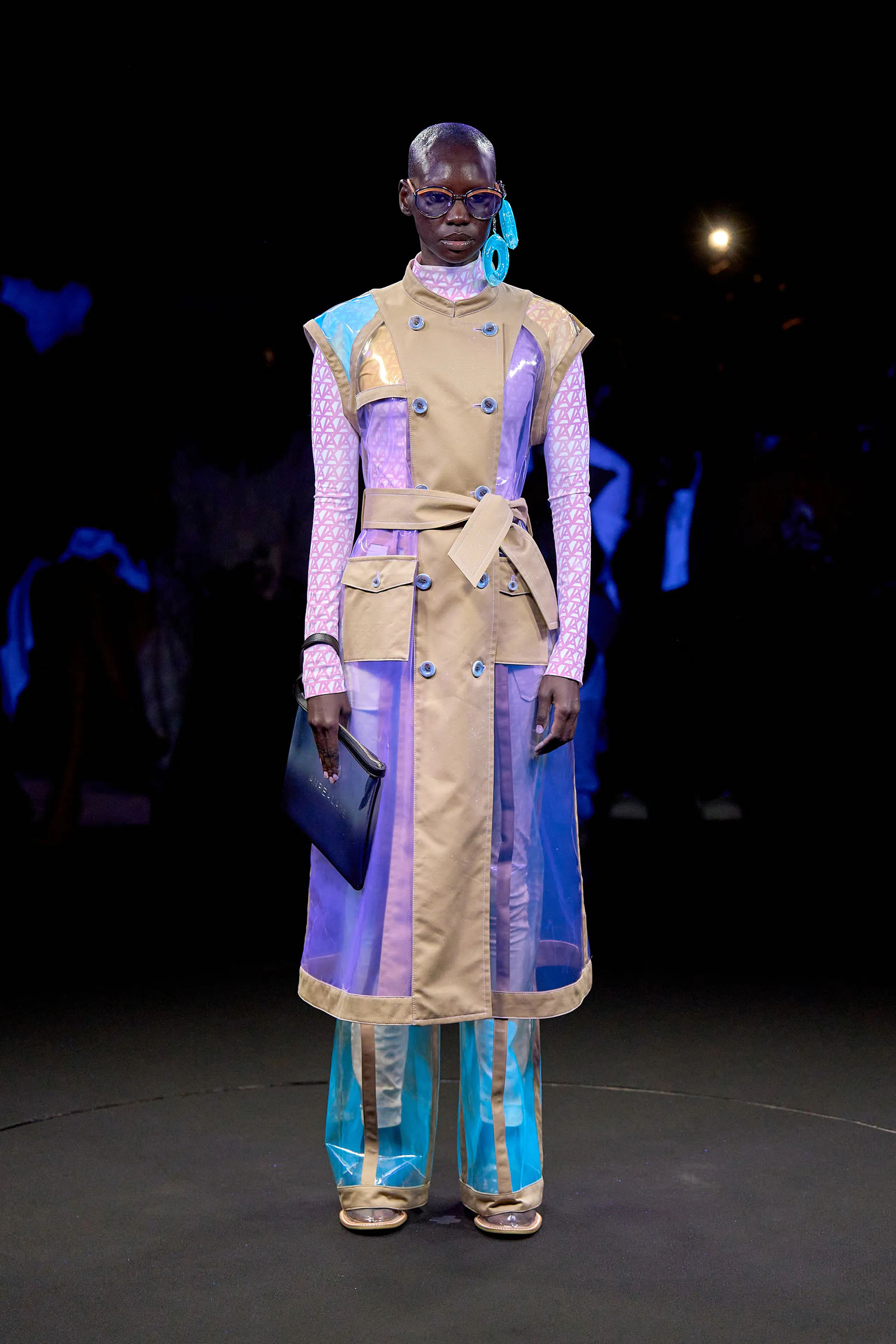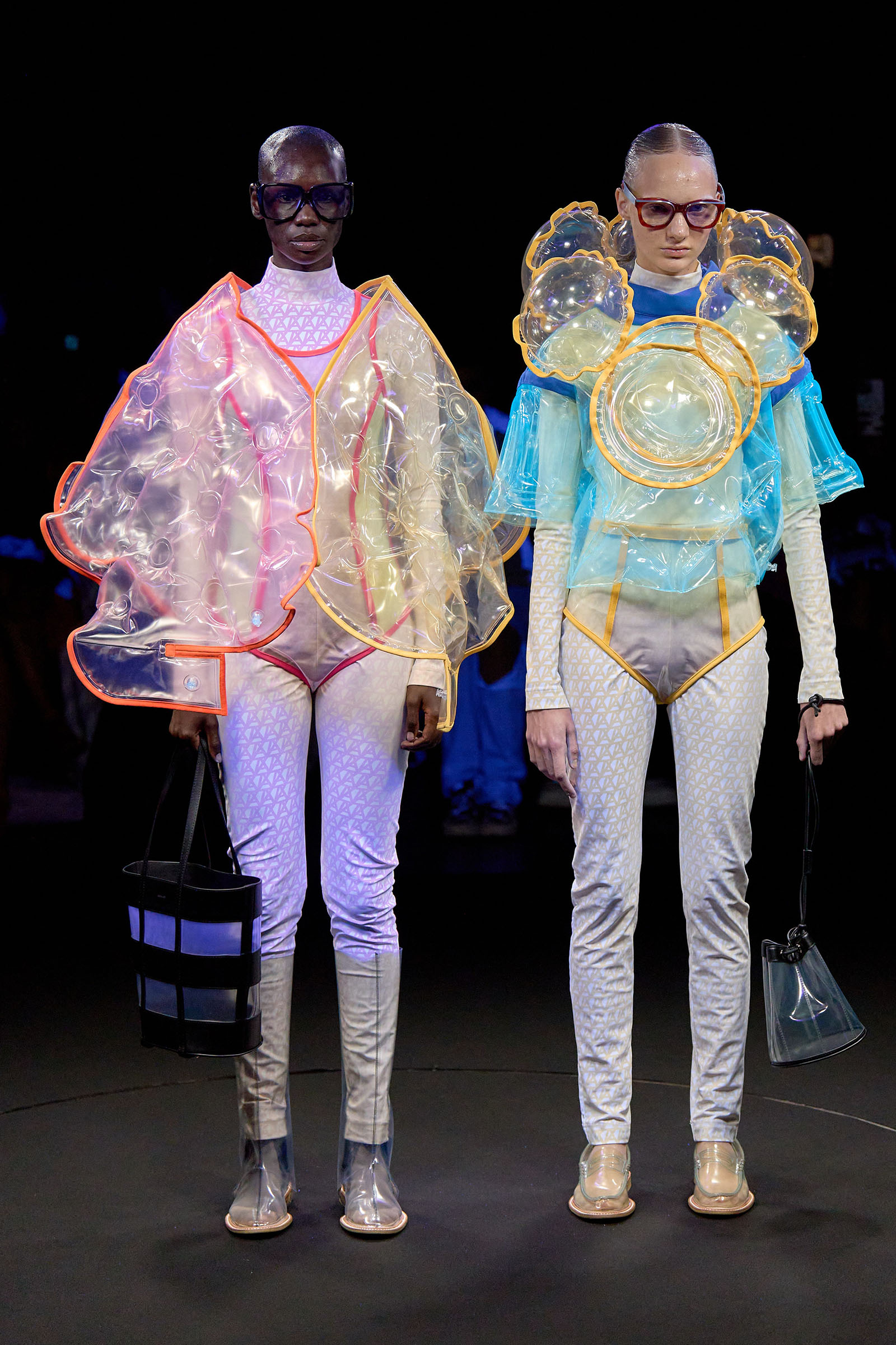 The models came out singly or in pairs in double layered looks; all-white Angrealage bodysuits under more voluminous transparent PVC garments in various shapes, some lined with strips of fabric or squares of crochet. Bags, boots and loafers were also made in the house’s new PVC, which Morinaga said was not only photochromatic but phthalate-free and therefore (relatively) environmentally friendly. Once they had been photographed in this all-white and transparent apparel, the models stood on a turntable set into the floor: this rotated, allowing the banks of UV and other lights in the gantry above to illuminate the garments—which of course changed color.