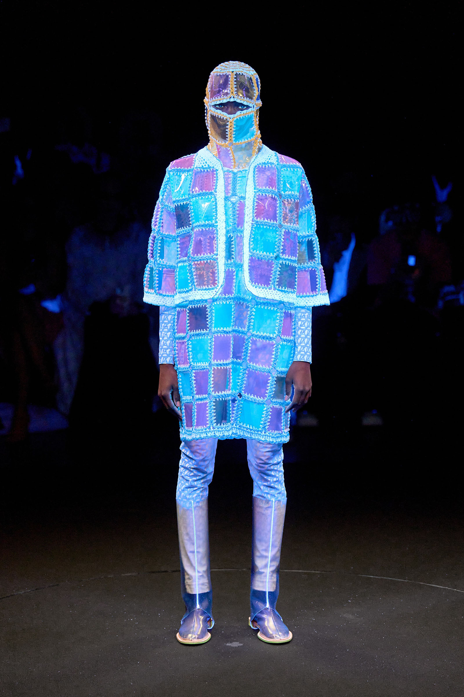 The collection teased at a new relationship between the time taken for color to bloom and then fade. Morinaga was interested in using the empty space between his body suits and PVC outer-layer as a kind of visible/invisible cladding—an atmosphere—of worn personal environment. Elsewhere he incorporated more conventionally color-filtered lights to mess with the impact made by the garments on the visible spectrum, prompting the crochet paneled garments to apparently change from one color to another.