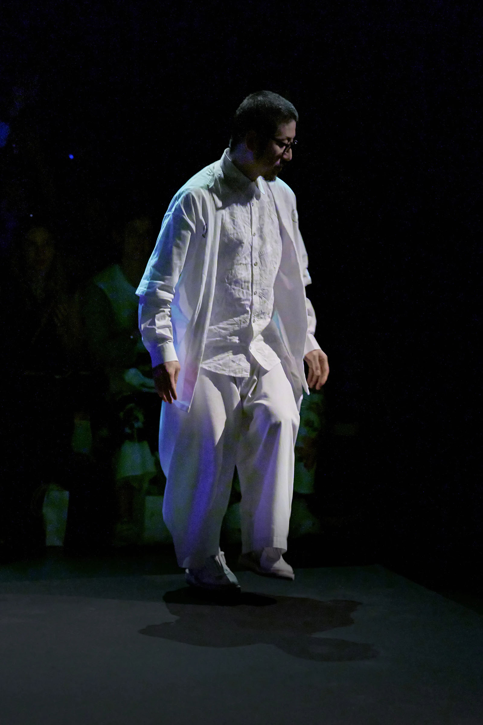 Last year’s line-up was so striking because UV light was applied to Morinaga’s looks in a quick top-to-bottom burst that changed the garments’ color in an instant—and so intensely that many Instagram commentators were misguidedly concerned that the models were at risk. This presentation saw the light applied more slowly, yet it was still potentially just a little unsettling, as new technologies so often are.