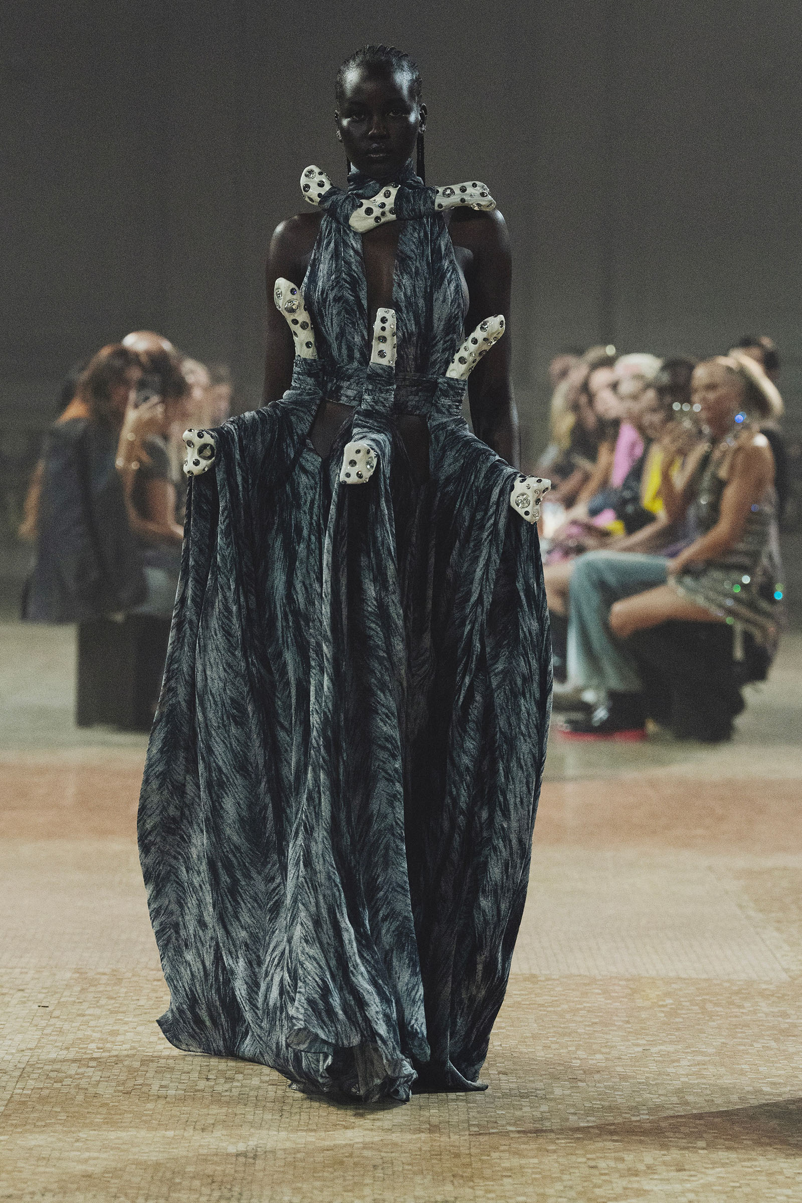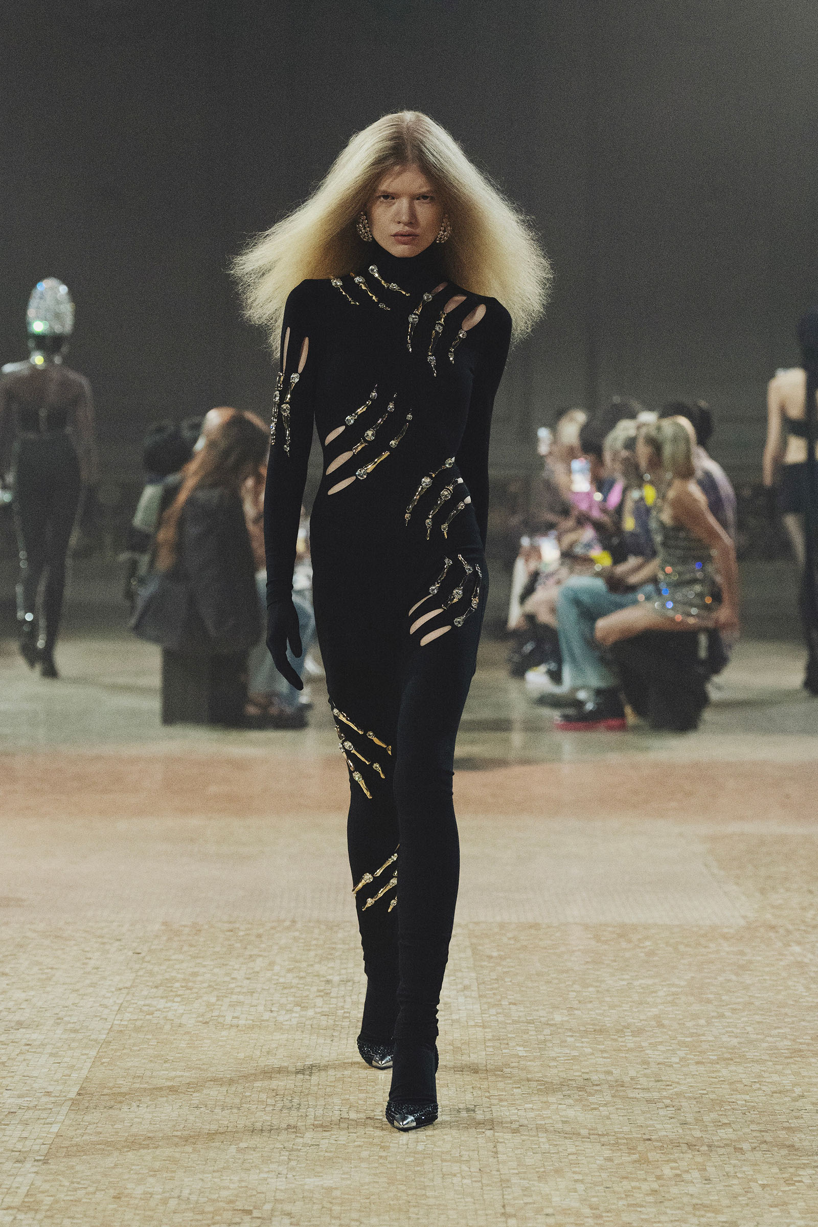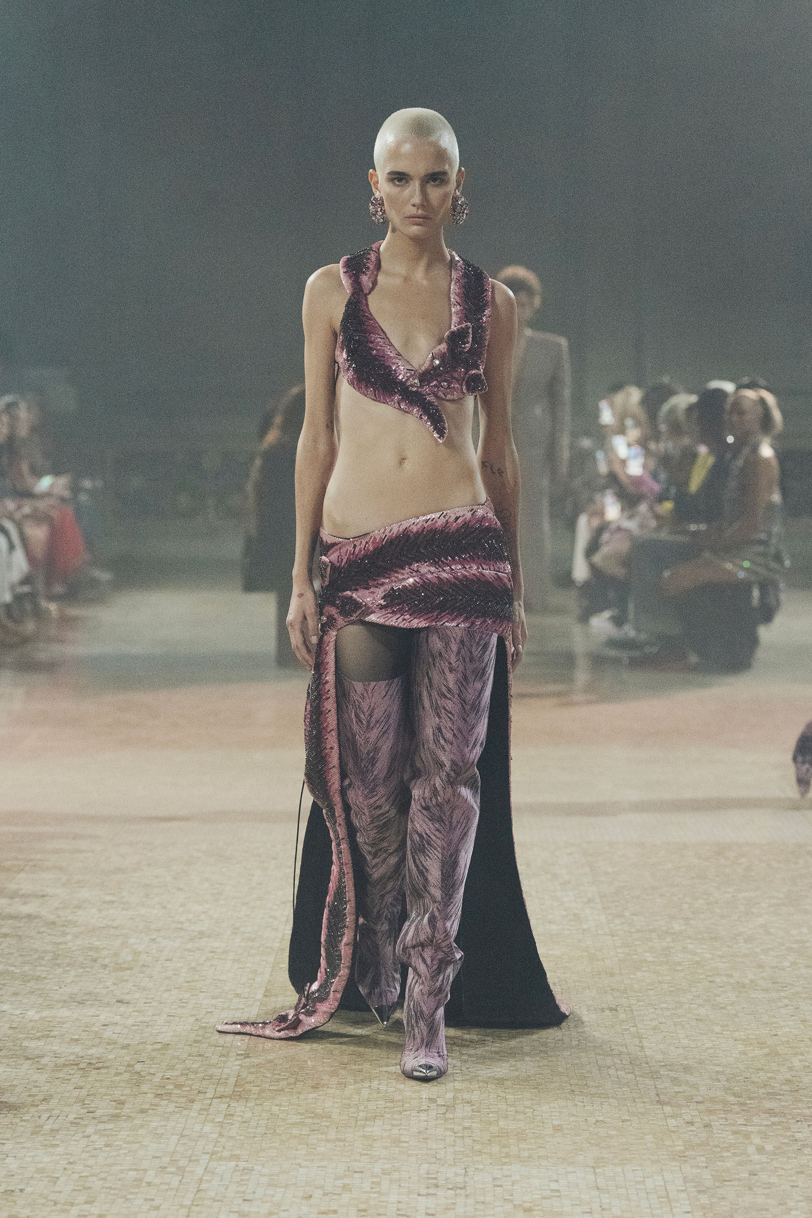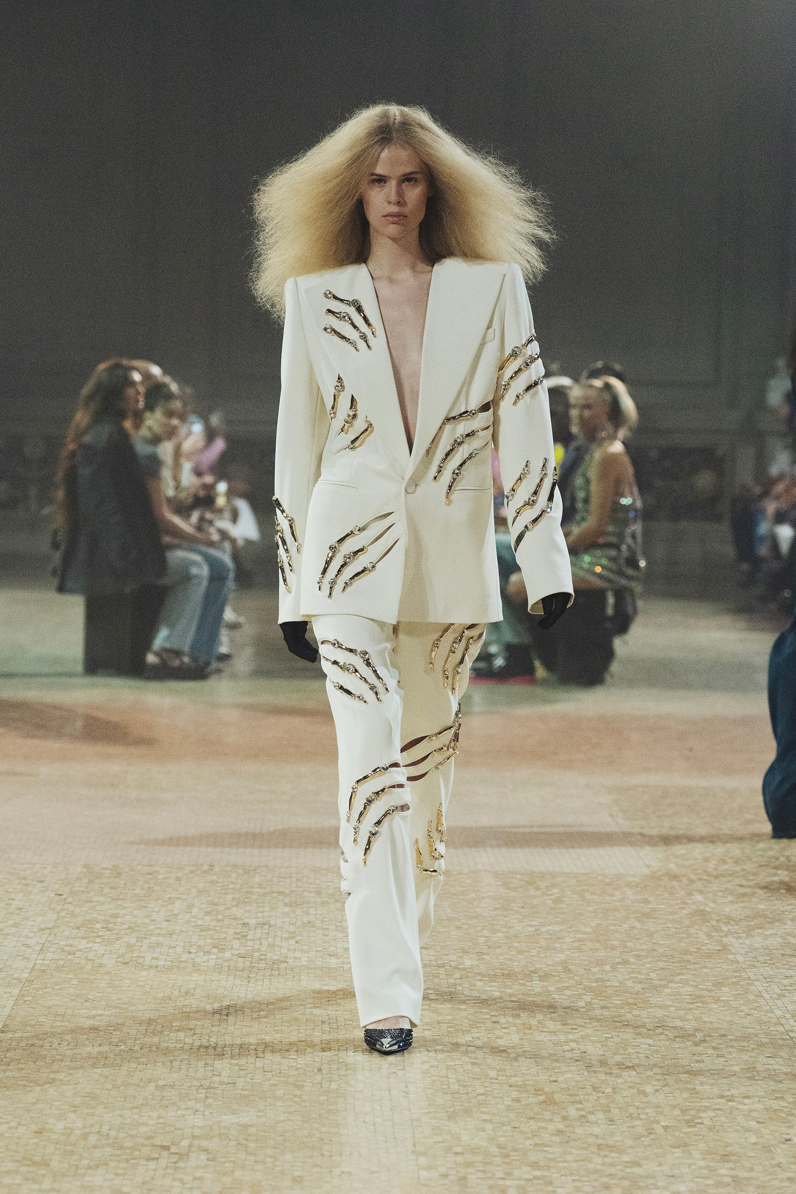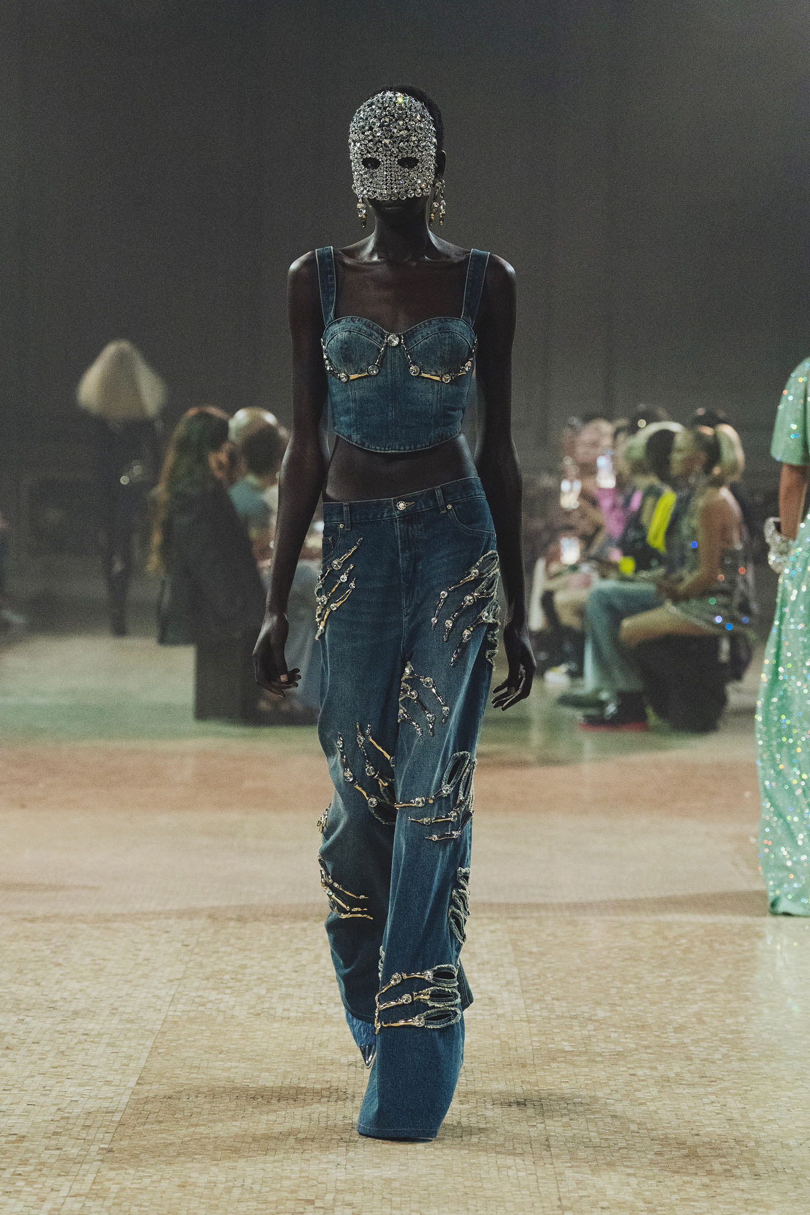 The idea was cleverly developed: there were “fur pelt” coats made from fur-printed denim in a variety of colors that delivered runway drama, fur-print, low-slung jeans, and a mini dress with bulbous little godets that spoke to Panszczyk’s commitment to offering real-world alternatives to fantasy. To a soundtrack of tools banging against each other, which eventually evolved into an industrial beat, came models in big-shouldered jackets or slinky jersey pieces punctuated by beastly rips, the gold-embellished bones of their attackers still elegantly attached to their clothes. Perhaps because the shapes were not instantly recognizable as belonging to any one specific animal, the effect remained decorative instead of reading as Halloween-y. “We wanted to hand sculpt these custom gold jewels, in an almost Elsa Peretti kind of way,” Panszczyk explained. “We always love this kind of notion of something that could be so ‘on the nose,’ almost like Halloween, but there’s also a beauty to it. In Elizabethan times, people had diamond skull rings, and it was almost like a secret code to the underworld.”
