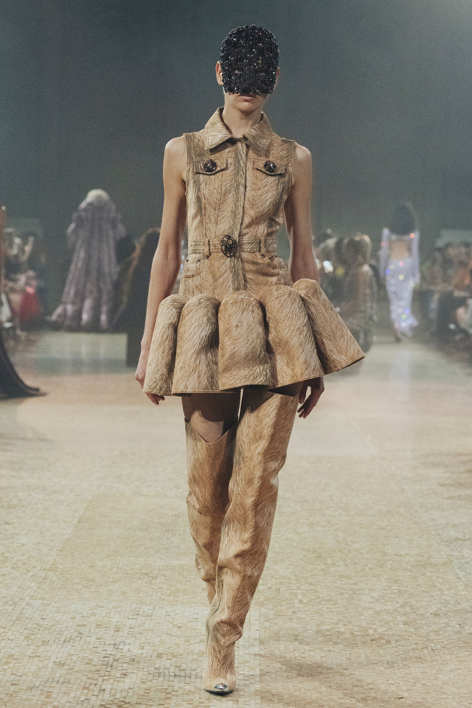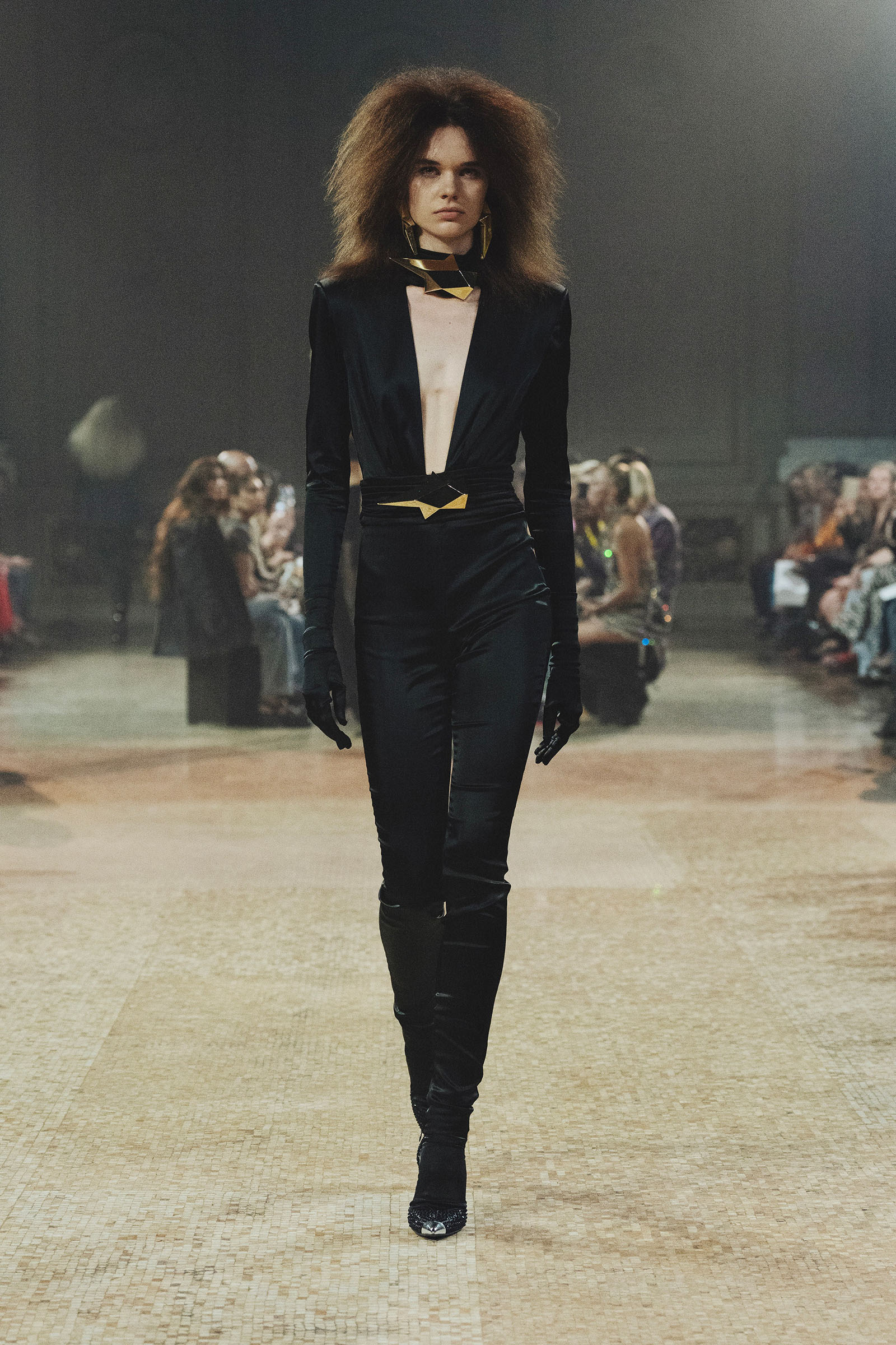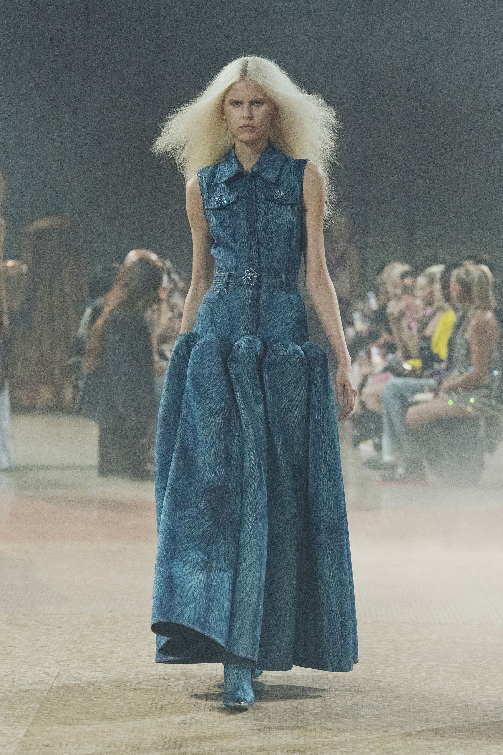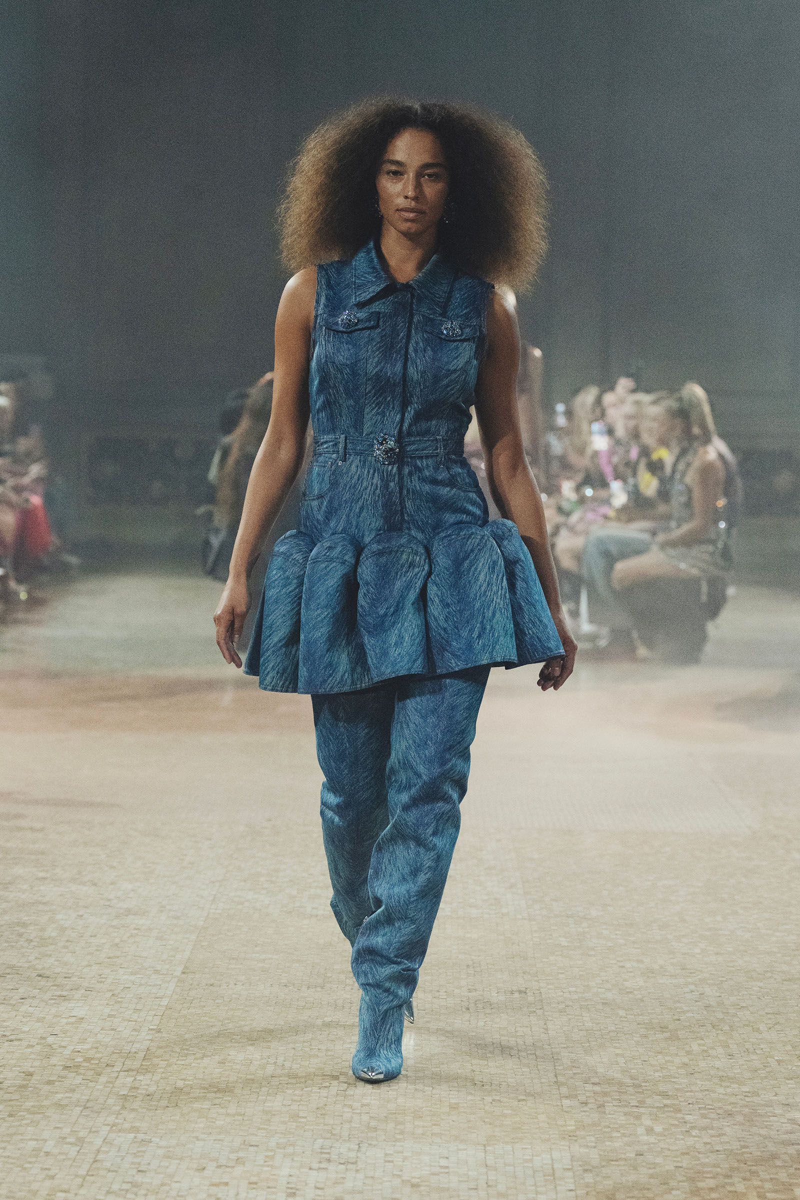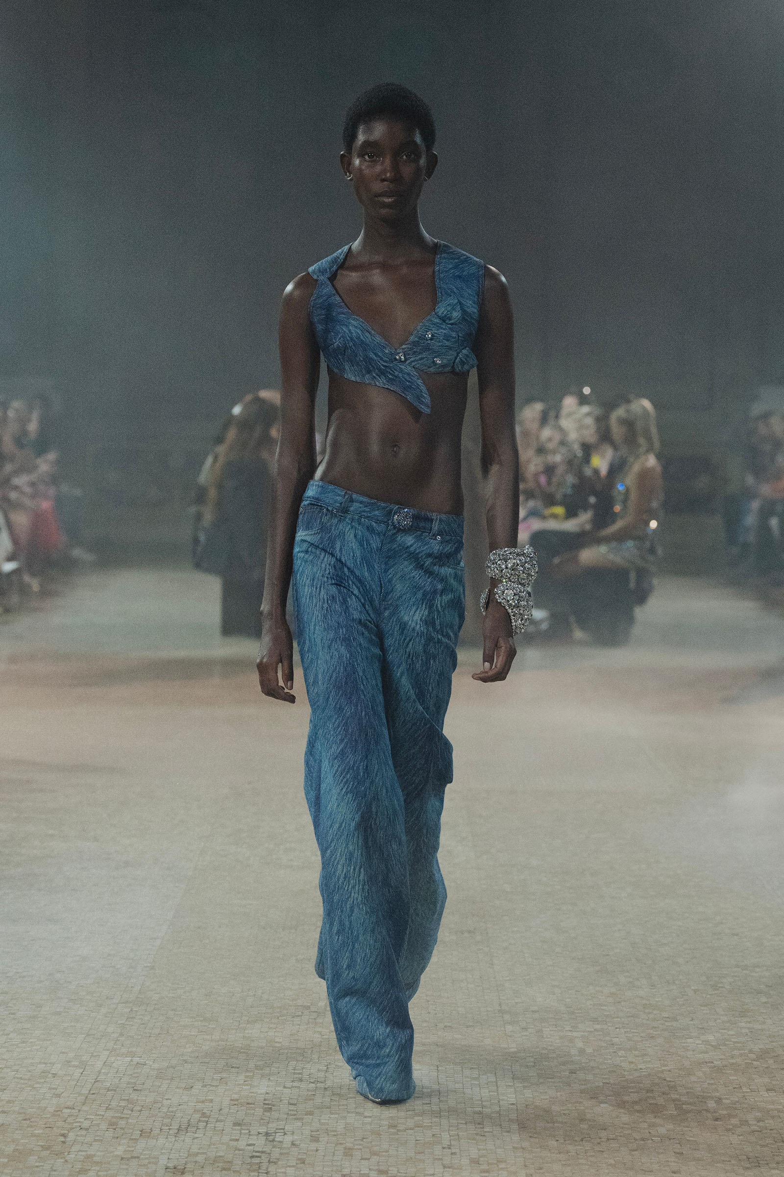 The idea was cleverly developed: there were “fur pelt” coats made from fur-printed denim in a variety of colors that delivered runway drama, fur-print, low-slung jeans, and a mini dress with bulbous little godets that spoke to Panszczyk’s commitment to offering real-world alternatives to fantasy. To a soundtrack of tools banging against each other, which eventually evolved into an industrial beat, came models in big-shouldered jackets or slinky jersey pieces punctuated by beastly rips, the gold-embellished bones of their attackers still elegantly attached to their clothes. Perhaps because the shapes were not instantly recognizable as belonging to any one specific animal, the effect remained decorative instead of reading as Halloween-y. “We wanted to hand sculpt these custom gold jewels, in an almost Elsa Peretti kind of way,” Panszczyk explained. “We always love this kind of notion of something that could be so ‘on the nose,’ almost like Halloween, but there’s also a beauty to it. In Elizabethan times, people had diamond skull rings, and it was almost like a secret code to the underworld.”