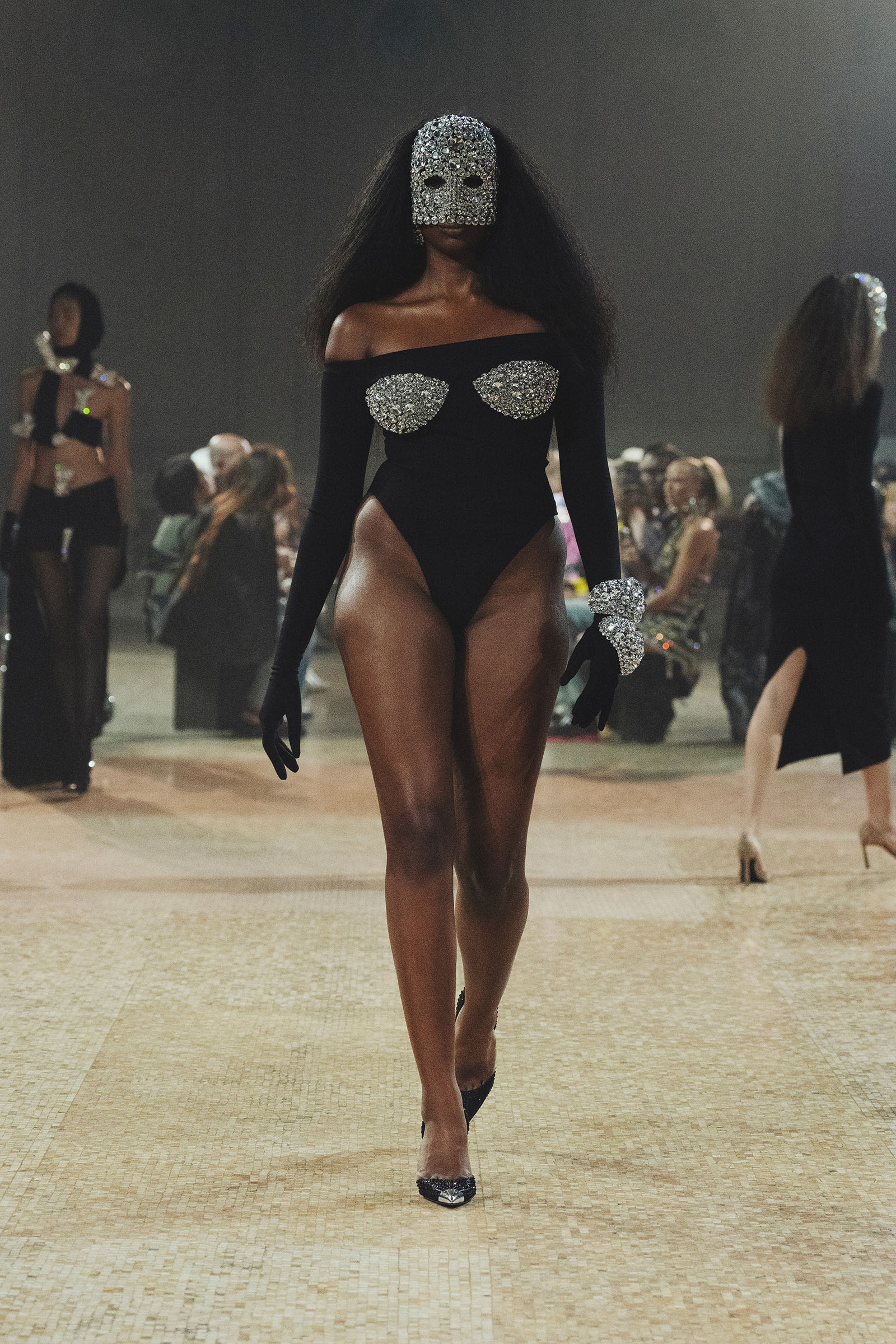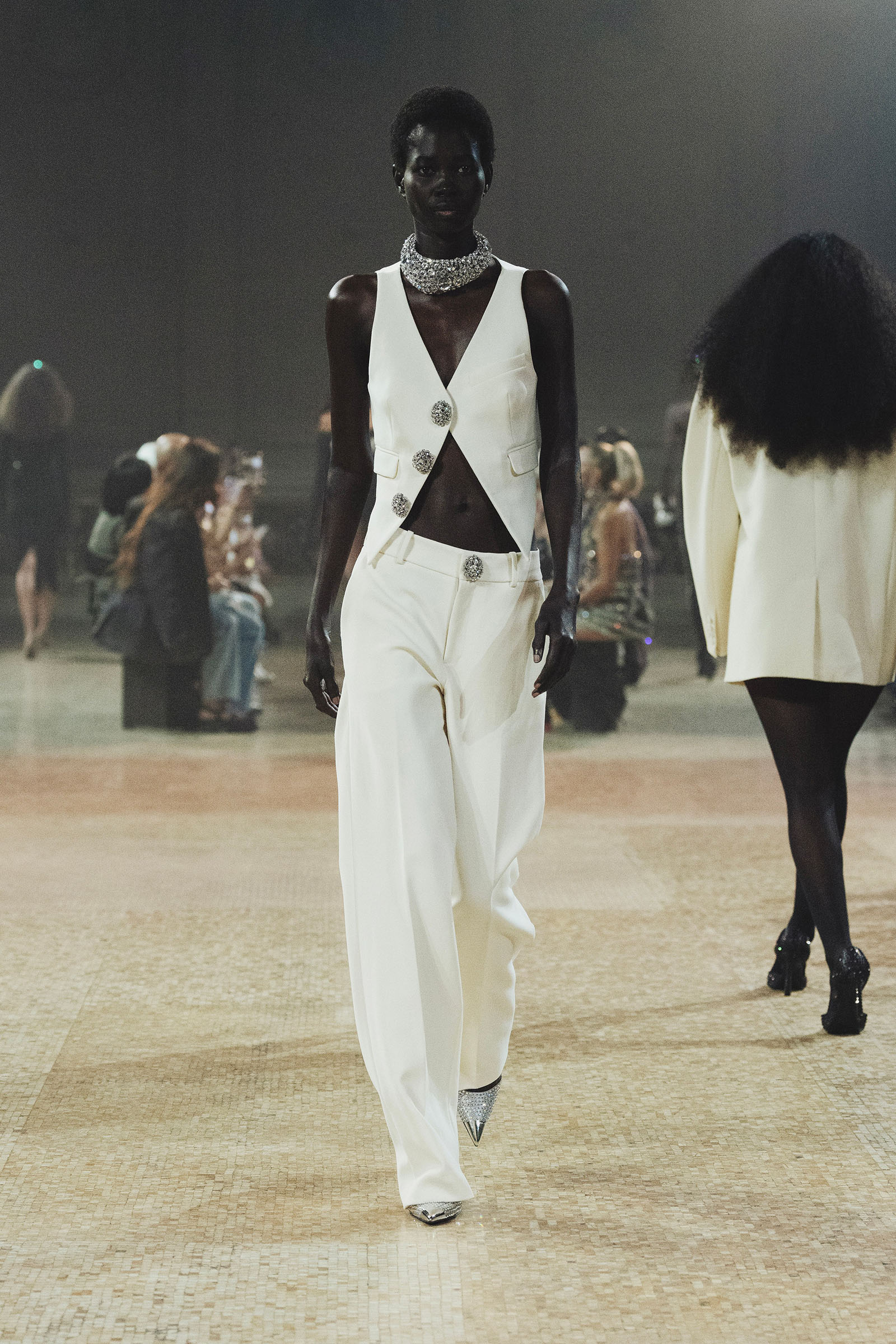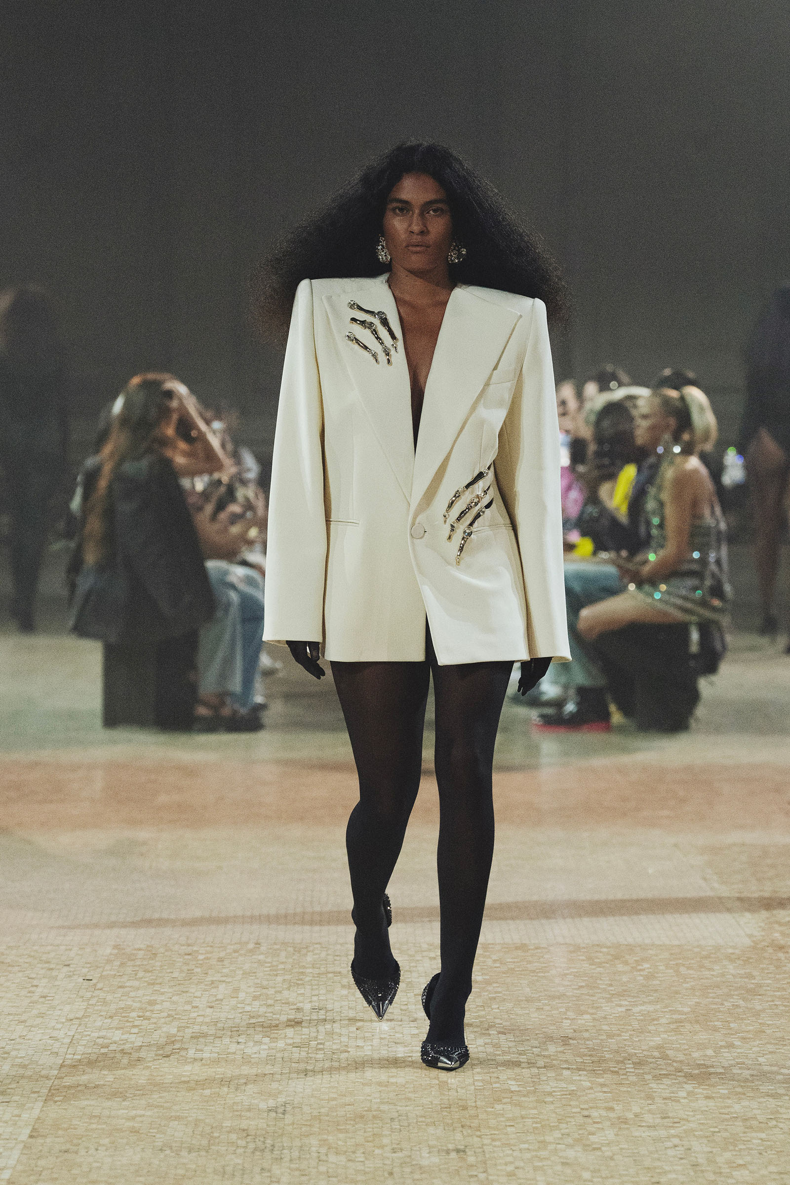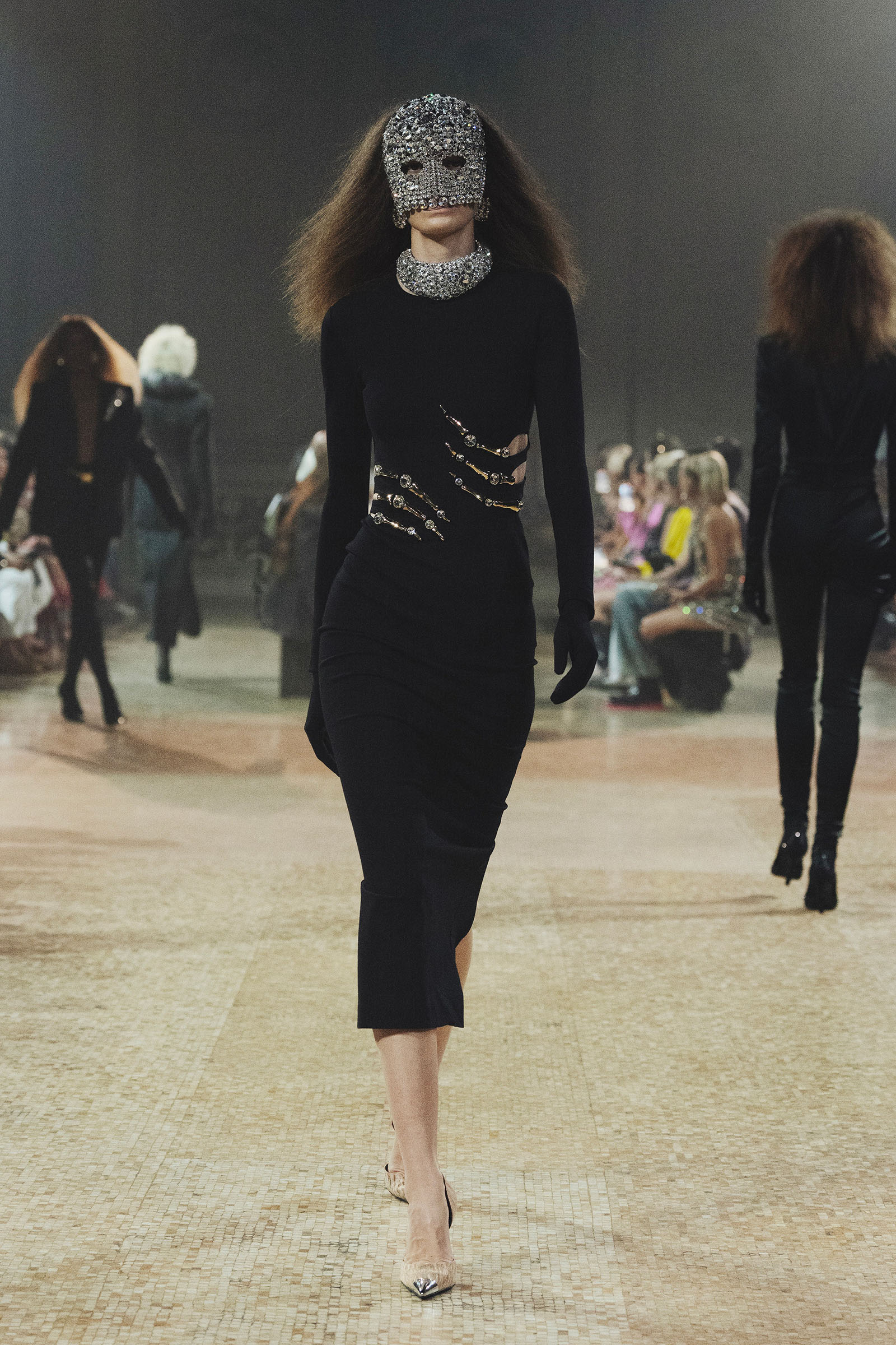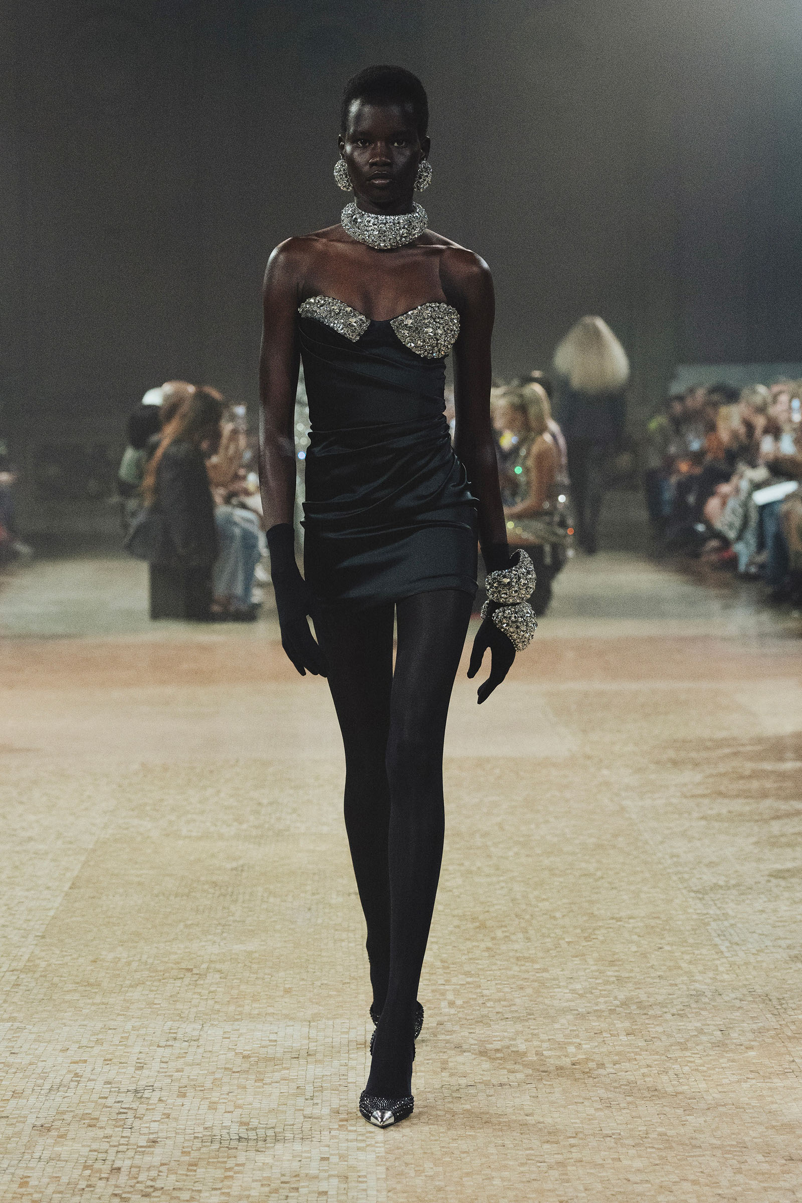 The idea was cleverly developed: there were “fur pelt” coats made from fur-printed denim in a variety of colors that delivered runway drama, fur-print, low-slung jeans, and a mini dress with bulbous little godets that spoke to Panszczyk’s commitment to offering real-world alternatives to fantasy. To a soundtrack of tools banging against each other, which eventually evolved into an industrial beat, came models in big-shouldered jackets or slinky jersey pieces punctuated by beastly rips, the gold-embellished bones of their attackers still elegantly attached to their clothes. Perhaps because the shapes were not instantly recognizable as belonging to any one specific animal, the effect remained decorative instead of reading as Halloween-y. “We wanted to hand sculpt these custom gold jewels, in an almost Elsa Peretti kind of way,” Panszczyk explained. “We always love this kind of notion of something that could be so ‘on the nose,’ almost like Halloween, but there’s also a beauty to it. In Elizabethan times, people had diamond skull rings, and it was almost like a secret code to the underworld.”