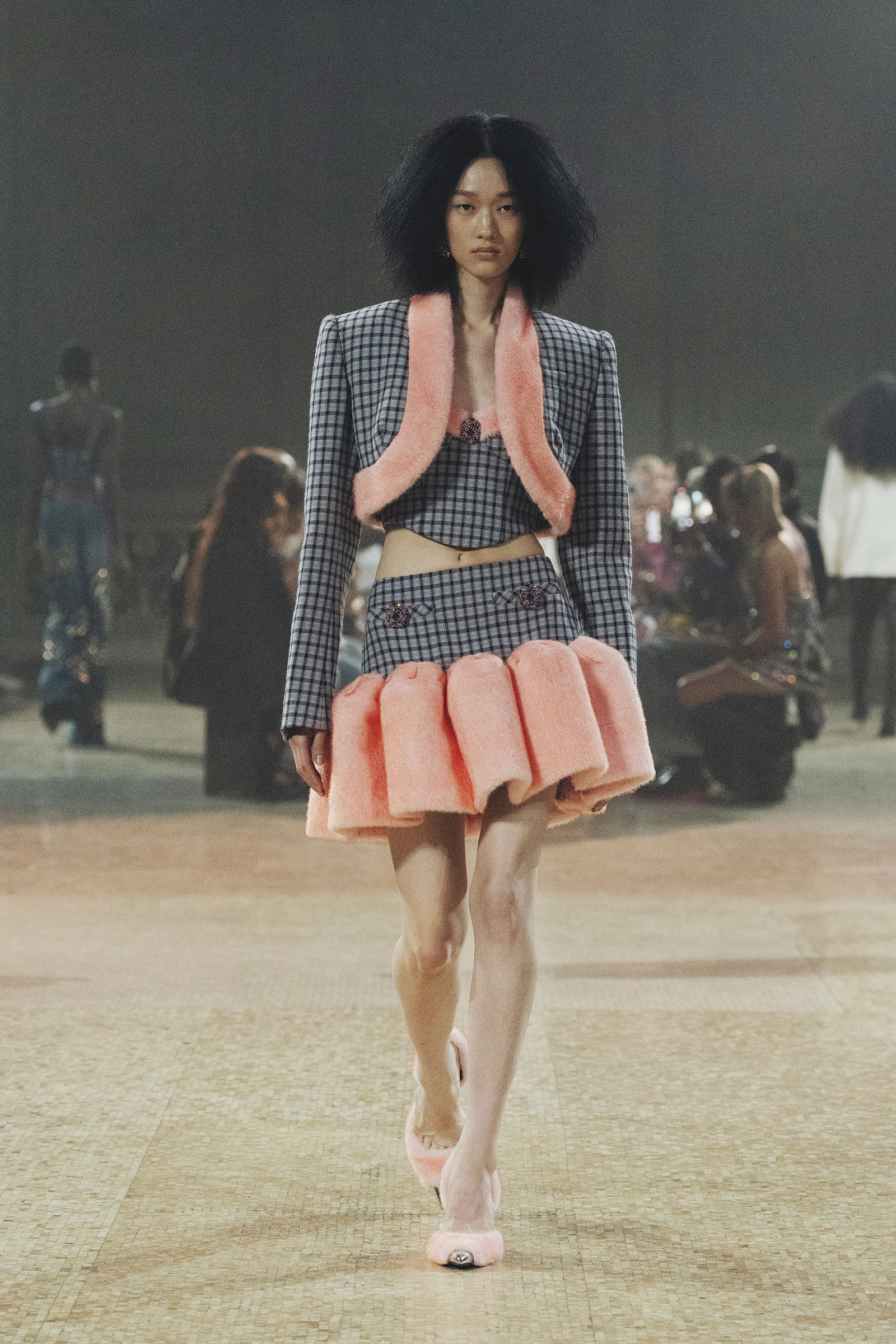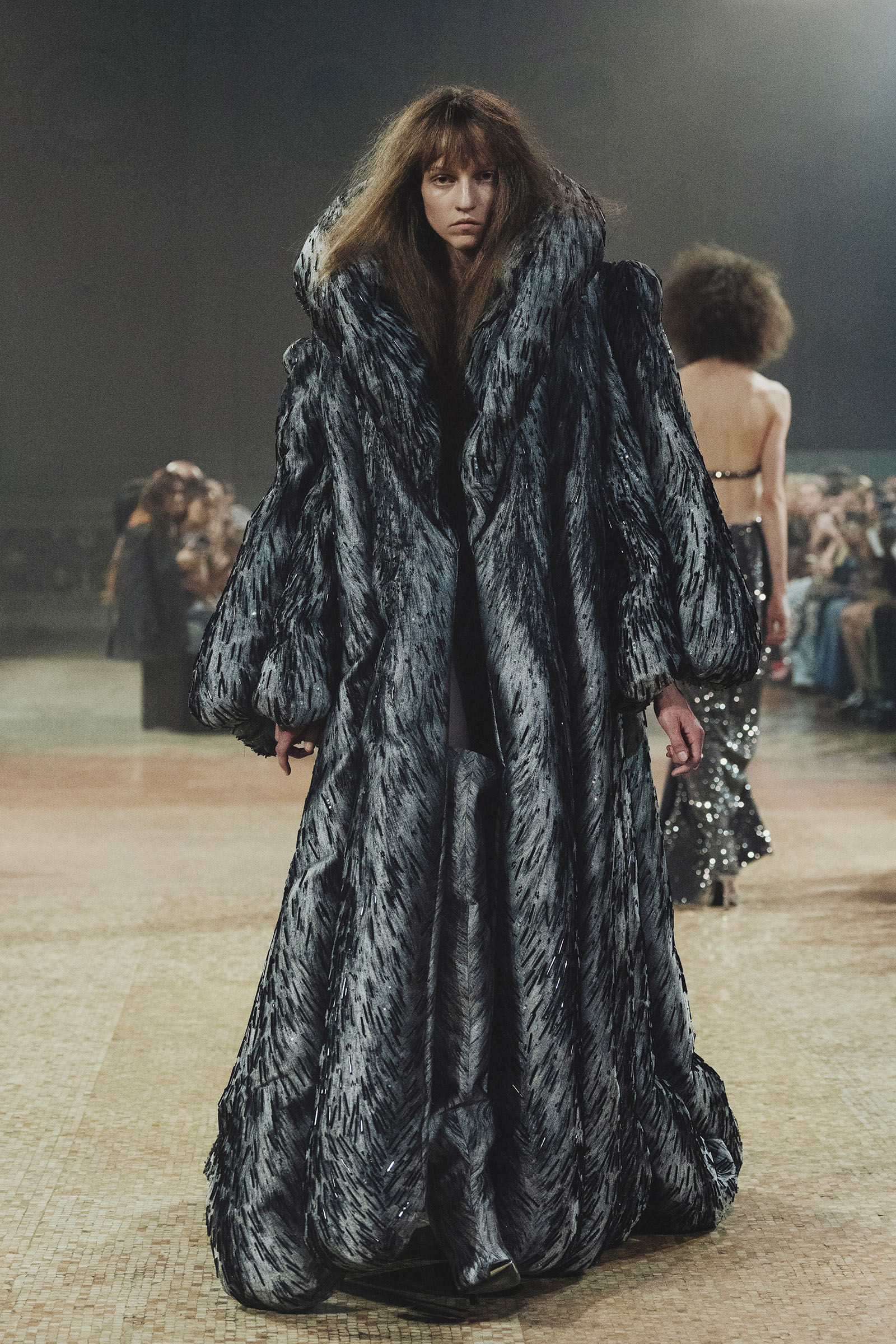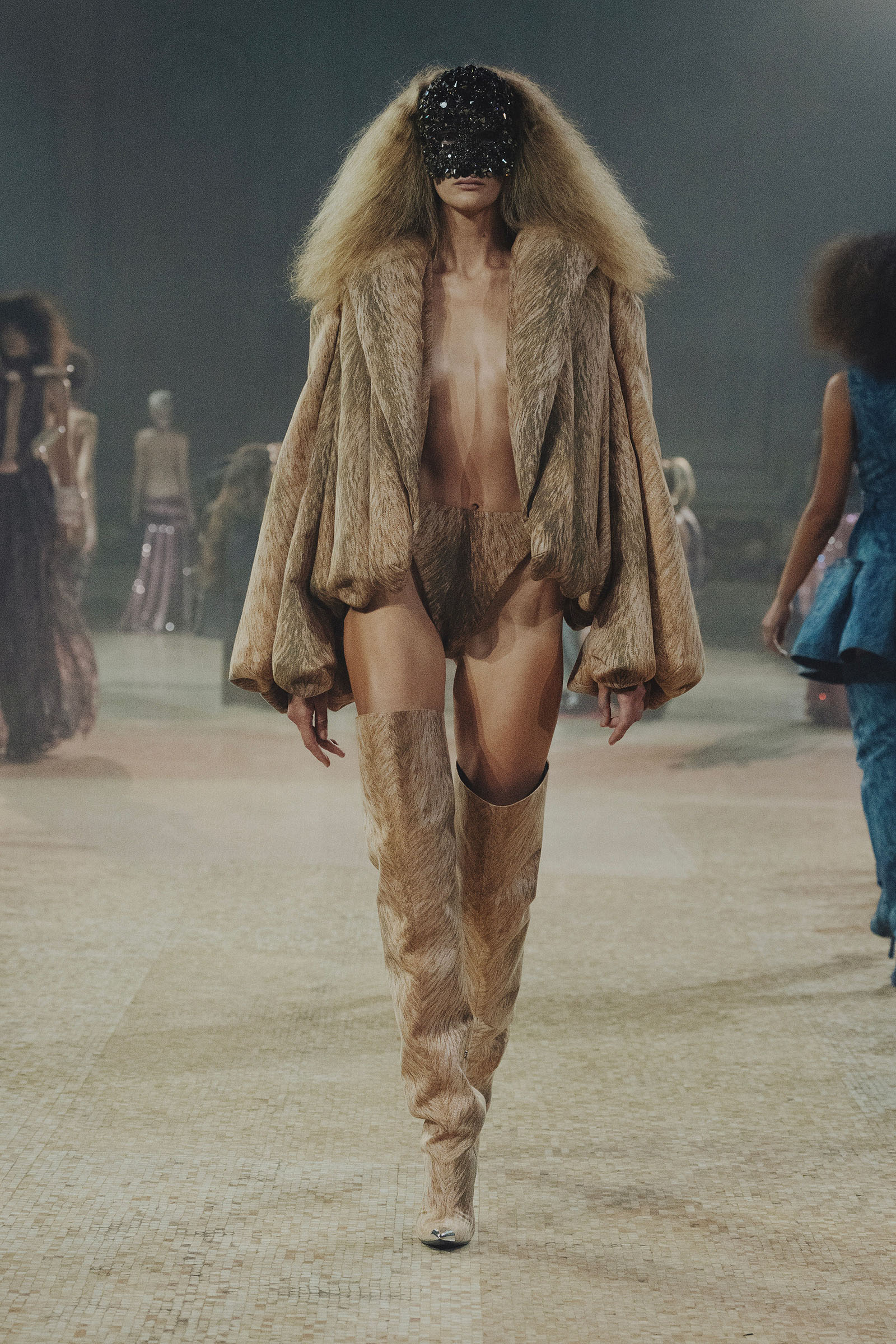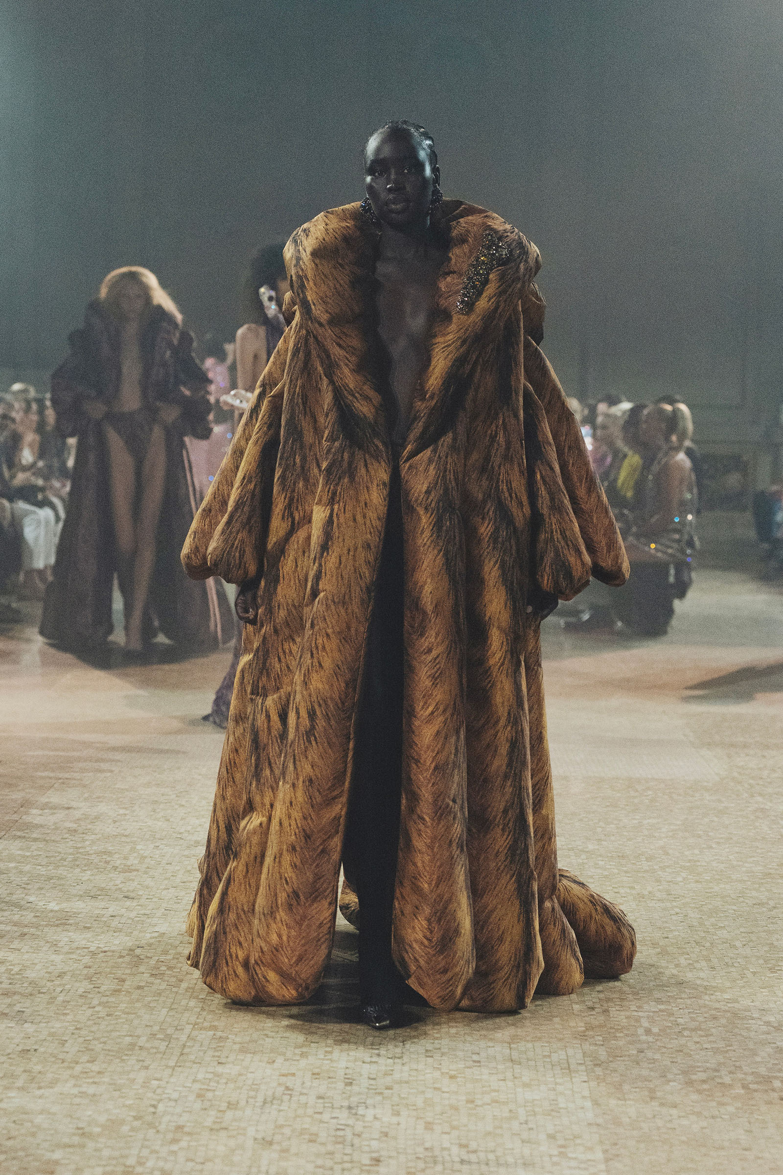 “Where did it all begin?” was the question on Piotrek Panszczyk’s mind as he worked on Area’s fall collection. “It” being the human race. He’d been “thinking about prehistoric times and how pelts and bones were kind of the first things humans had to build an identity around,” he said a few days ahead of the show at his Chinatown studio. “It started with this idea of the primal instinct that through the centuries morphed into desire, and then eventually a kind of excess and the life cycle of luxury.”