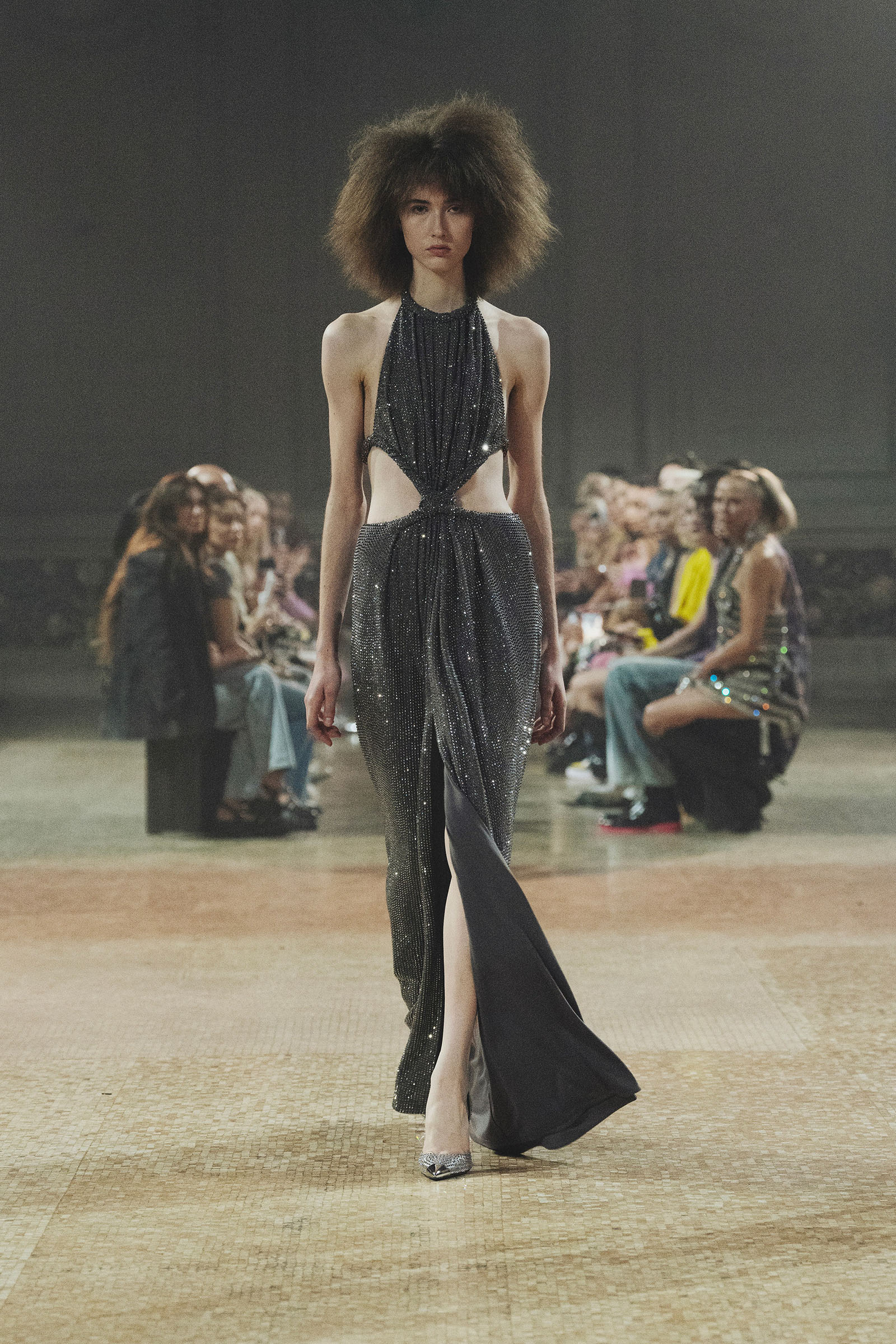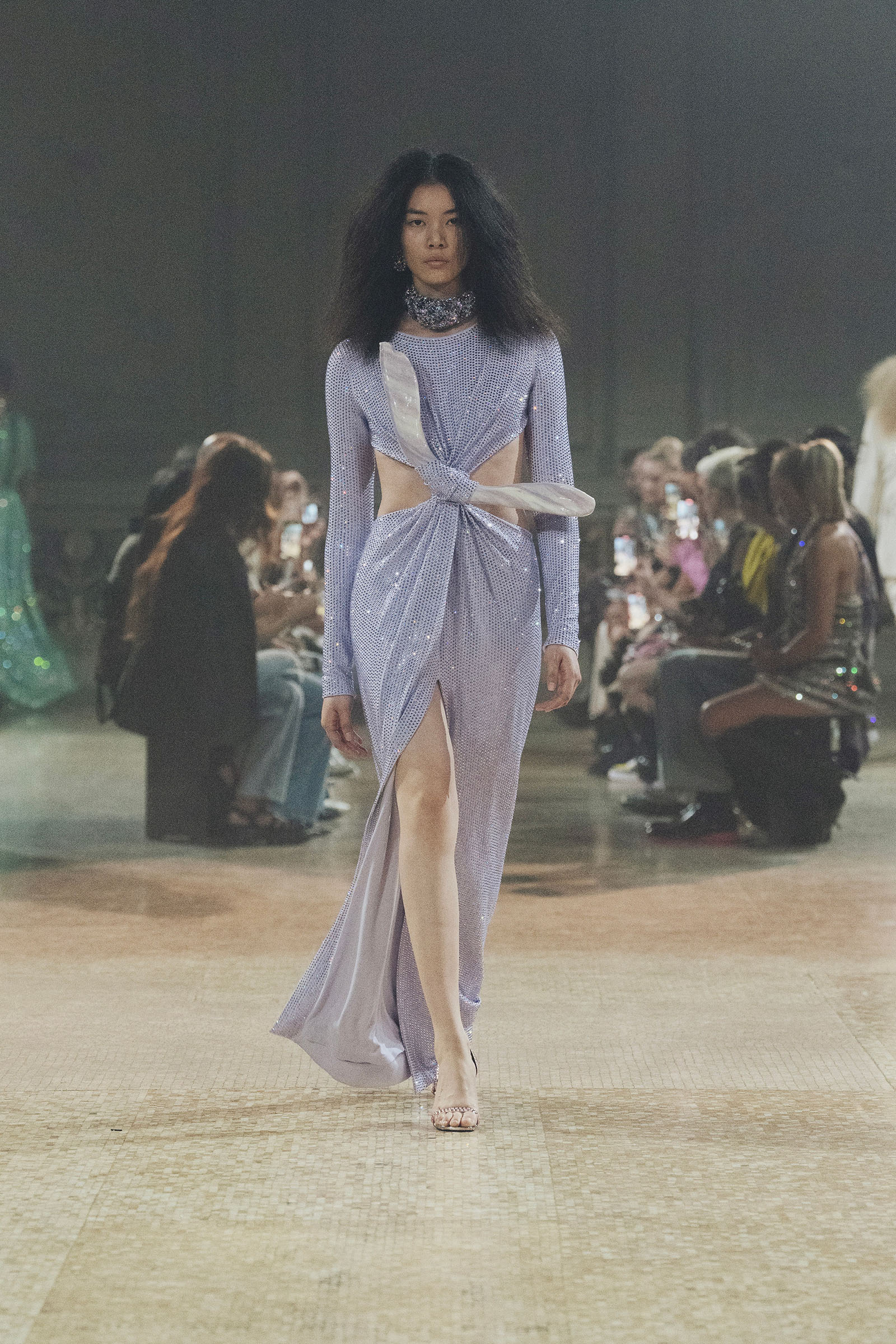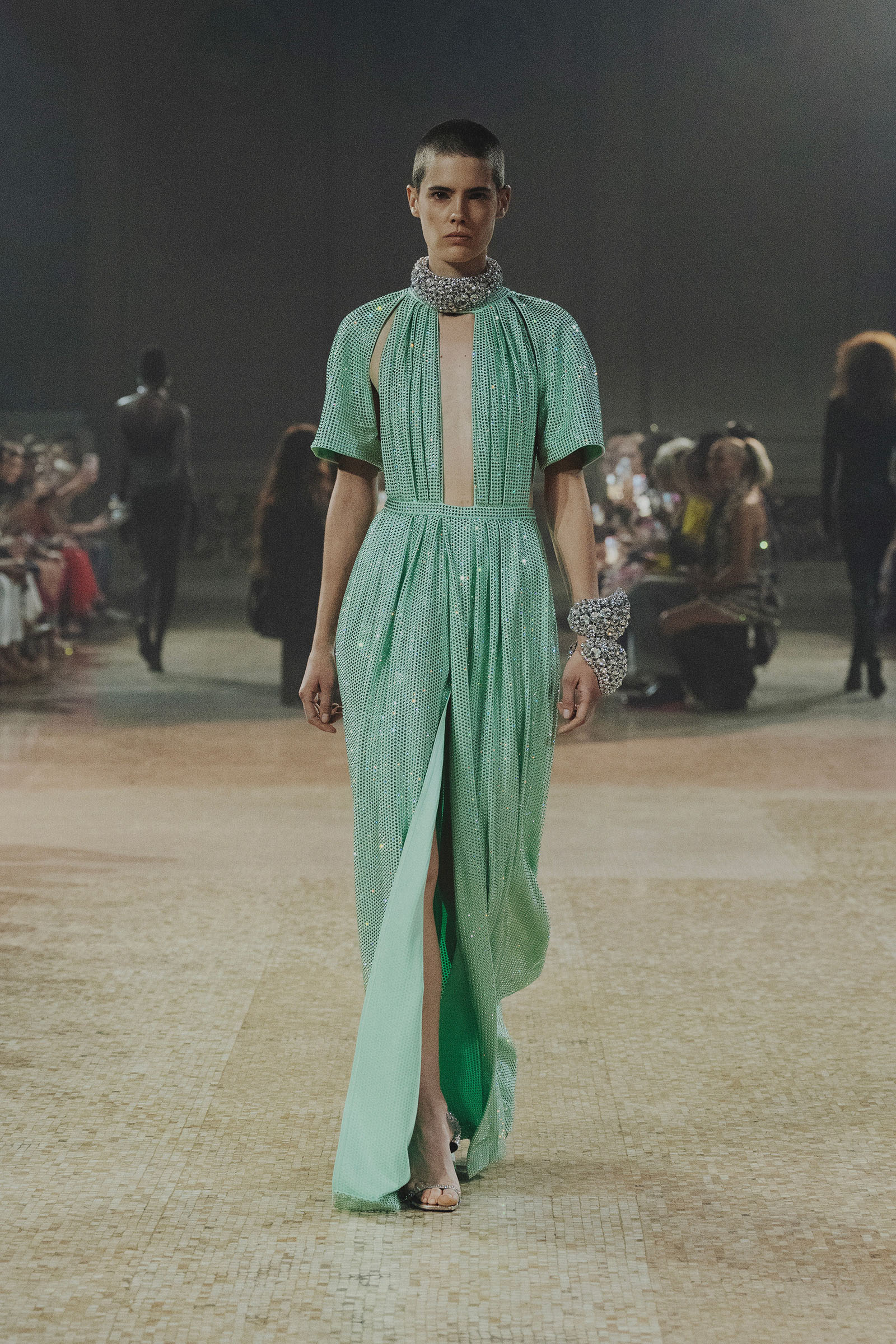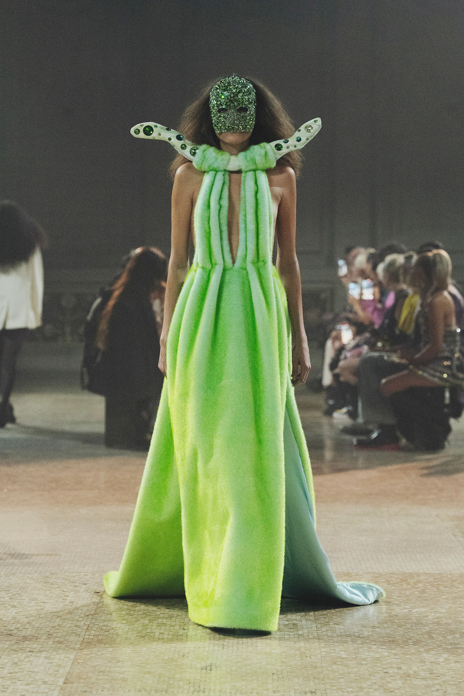 It wouldn’t be an Area show without some over-the-top crystal embellishment moments, which came through a series of elegantly draped all-over embroidered gowns inspired by Vionnet—one of Panszczyk’s constant points of reference—decorated with shiny “bones” hand sculpted from resin á la Wilma and Betty from The Flintstones. A version done in fur didn’t quite hit the mark (though it was a beautiful shade of blueish green), but a purple iteration did: it had a curved bone whose placement in the middle of the body created a beautiful line that hit Panszczyk’s desire for a little humor and a little glam. The most elegant piece was a mint green gown with short sleeves, a plunging neckline, and cutouts around the armpits: it was beautiful in the simplicity of its cut, no bones required.