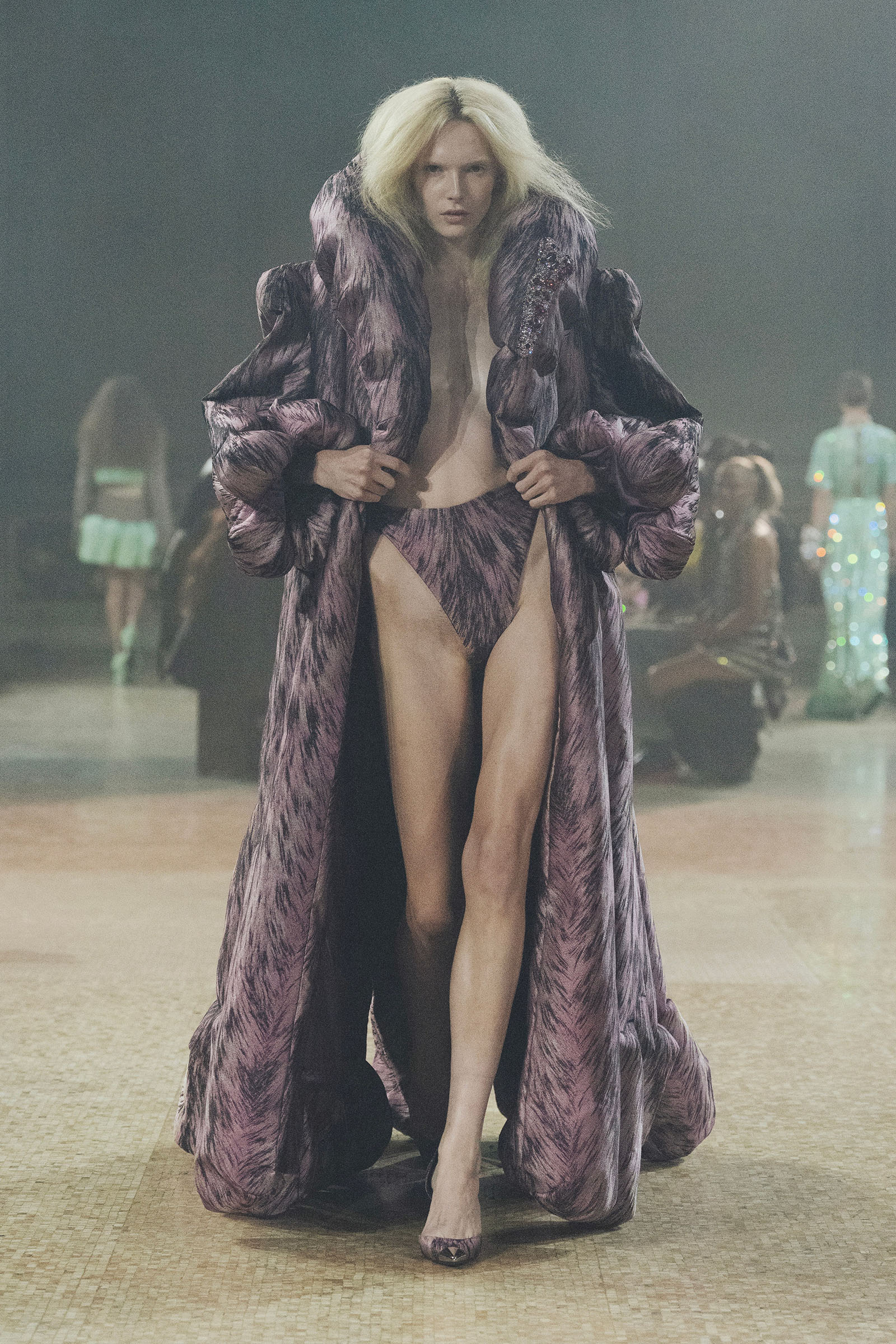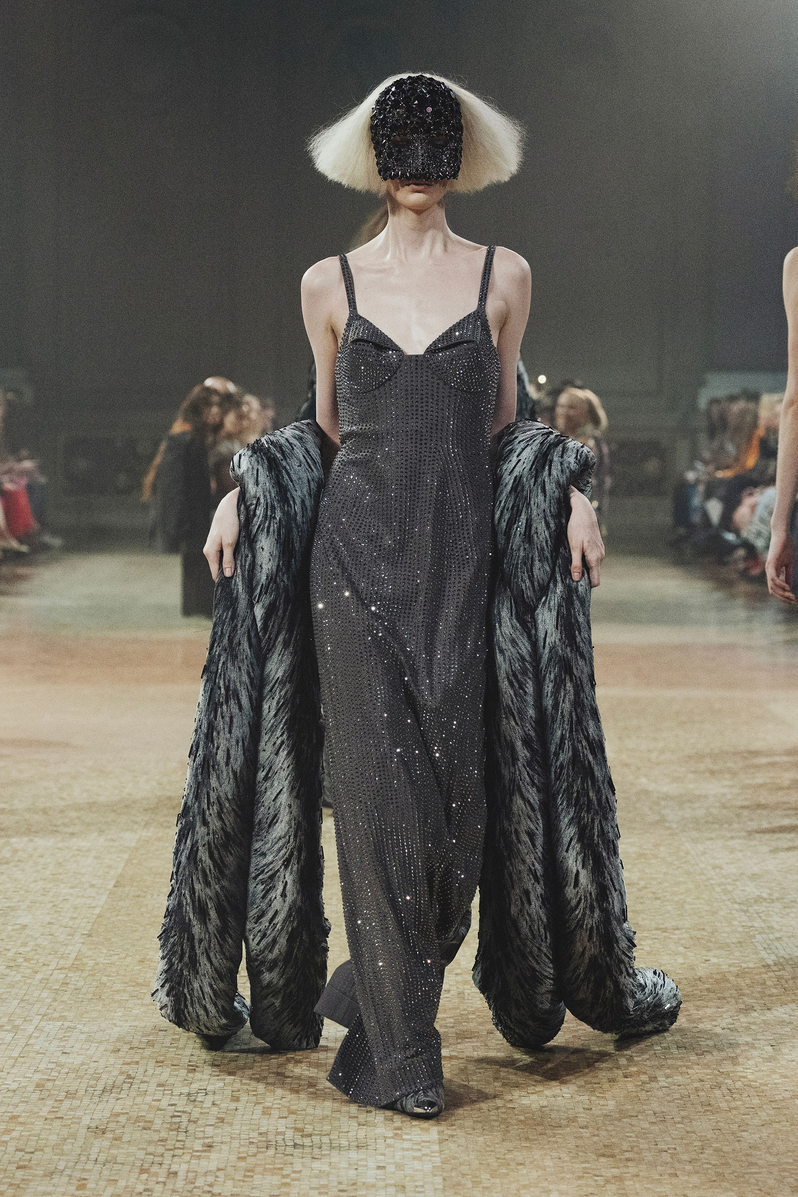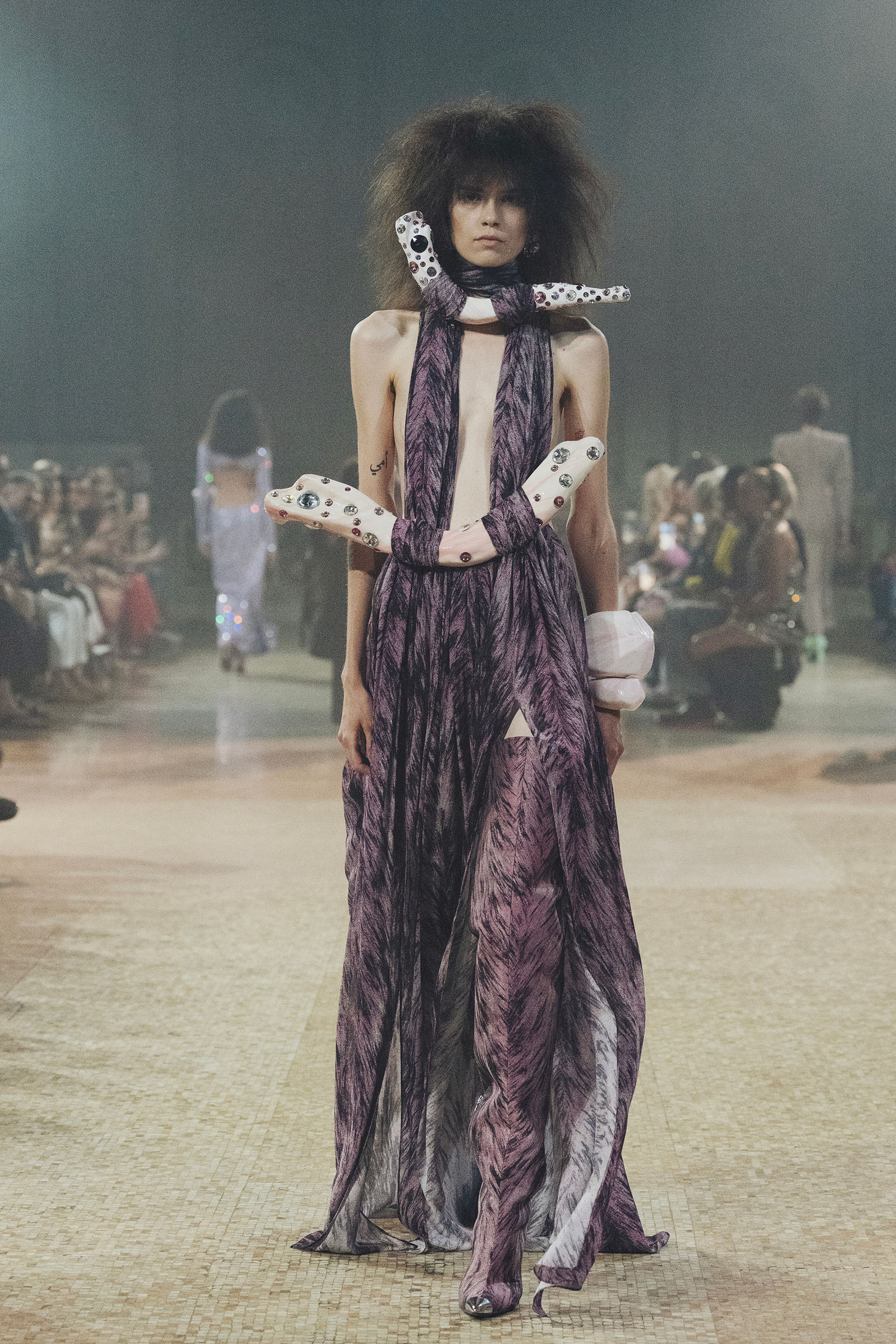 It wouldn’t be an Area show without some over-the-top crystal embellishment moments, which came through a series of elegantly draped all-over embroidered gowns inspired by Vionnet—one of Panszczyk’s constant points of reference—decorated with shiny “bones” hand sculpted from resin á la Wilma and Betty from The Flintstones. A version done in fur didn’t quite hit the mark (though it was a beautiful shade of blueish green), but a purple iteration did: it had a curved bone whose placement in the middle of the body created a beautiful line that hit Panszczyk’s desire for a little humor and a little glam. The most elegant piece was a mint green gown with short sleeves, a plunging neckline, and cutouts around the armpits: it was beautiful in the simplicity of its cut, no bones required.