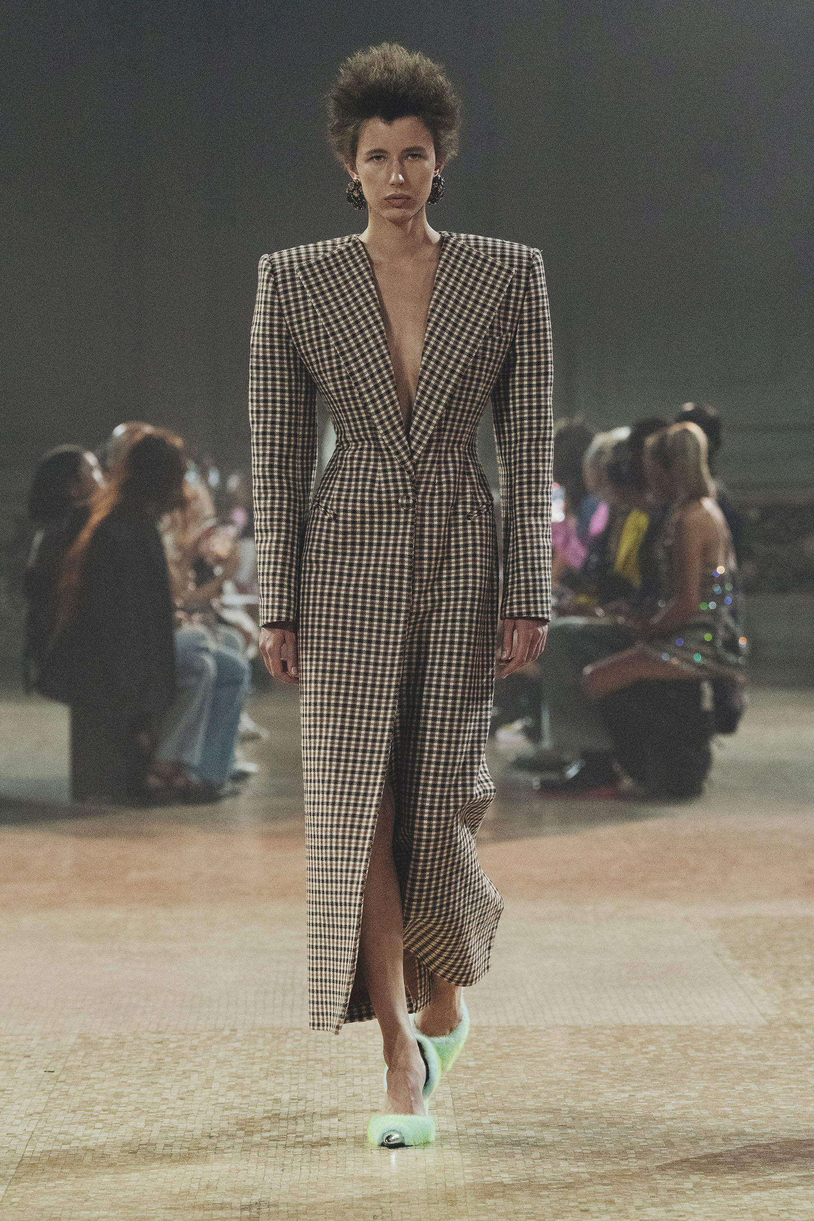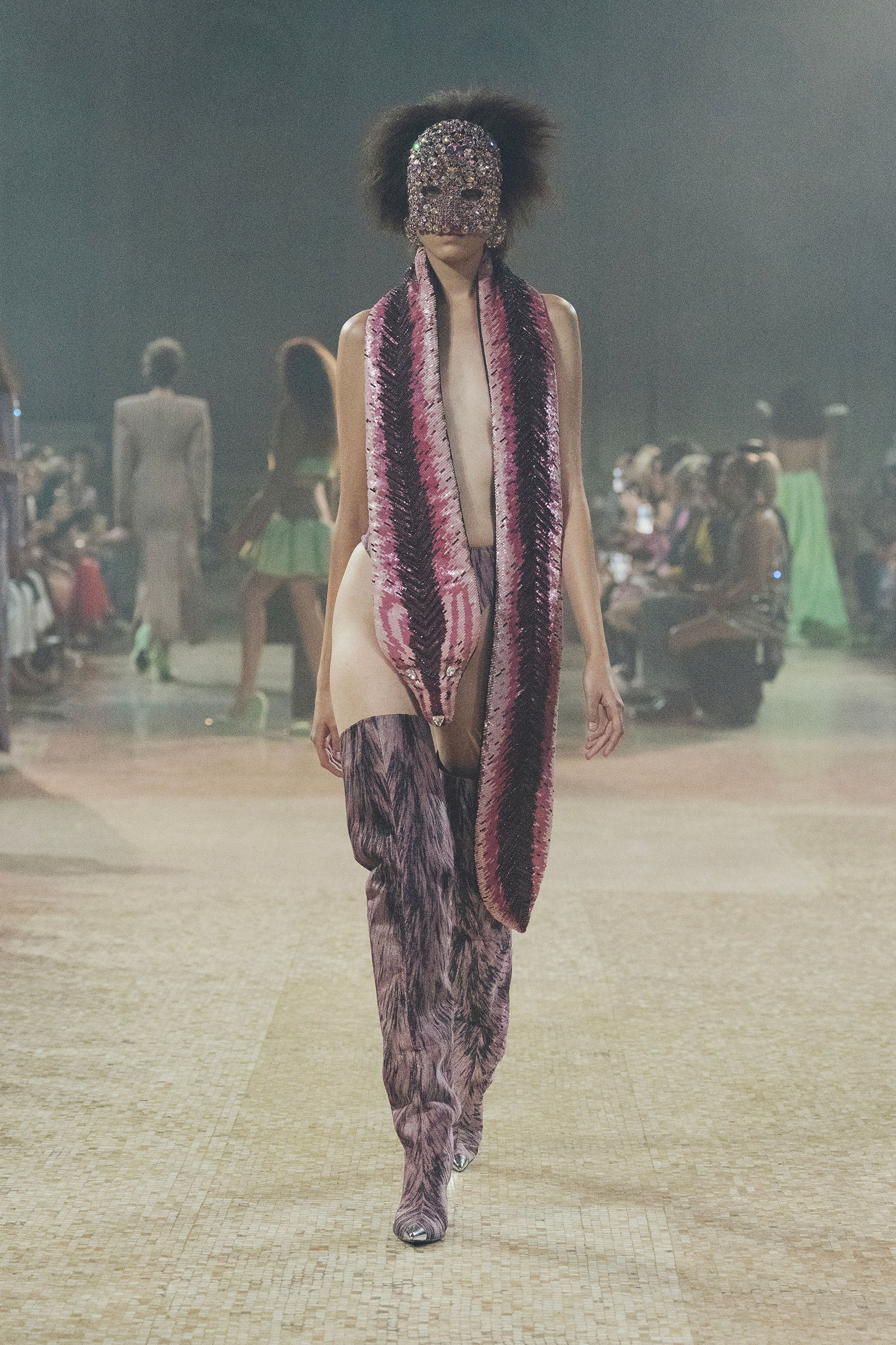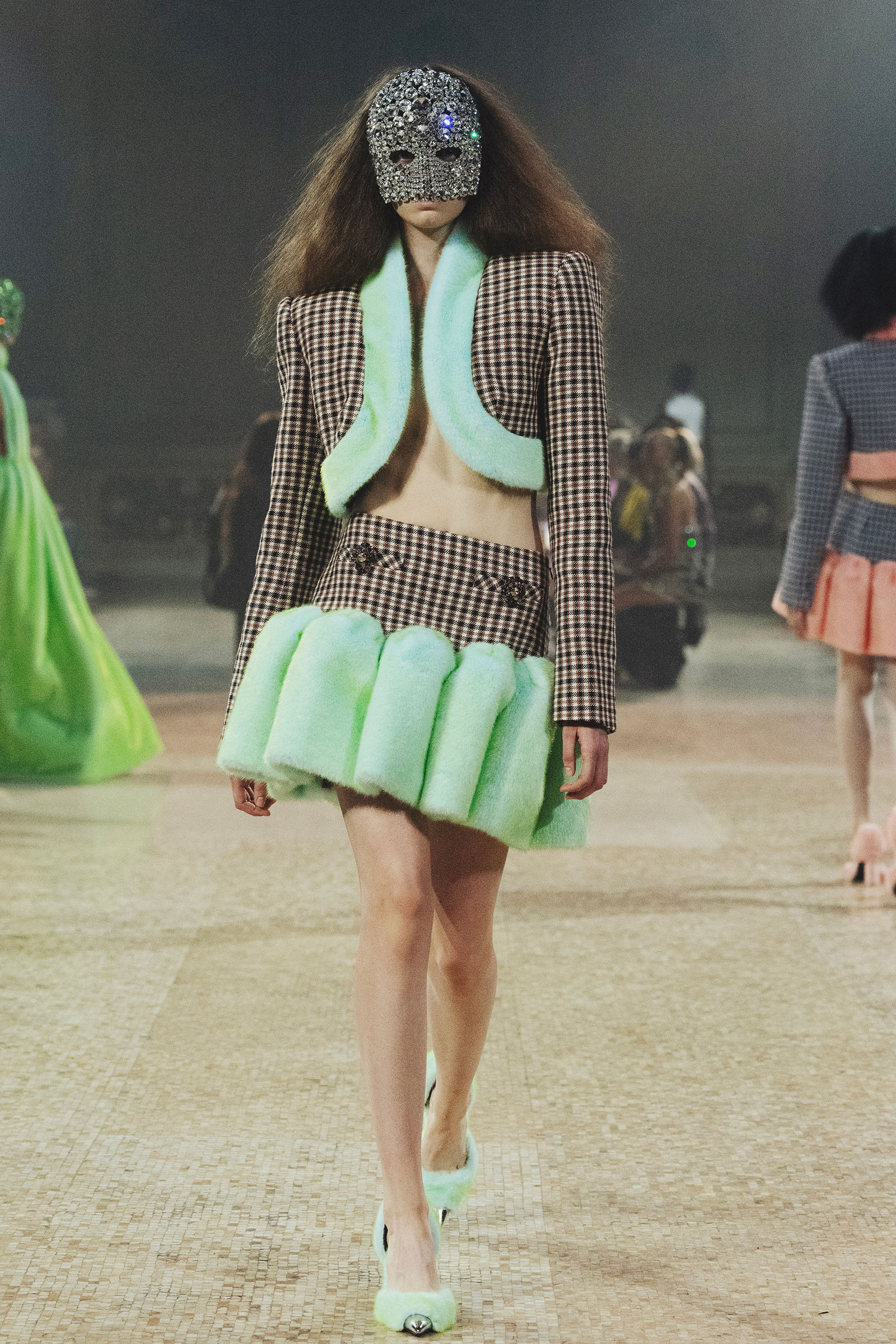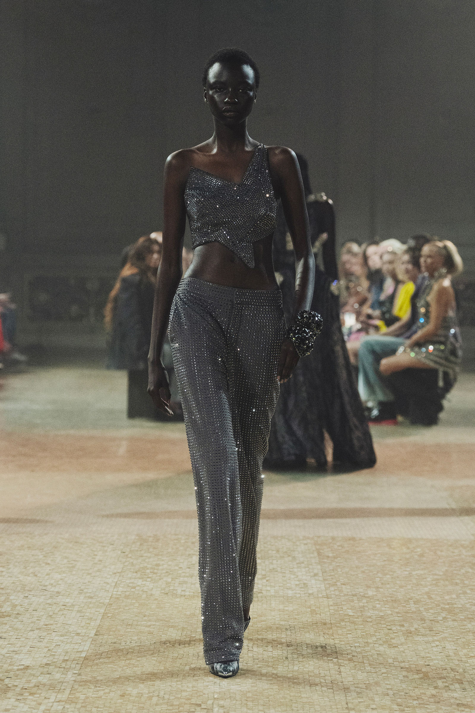 It wouldn’t be an Area show without some over-the-top crystal embellishment moments, which came through a series of elegantly draped all-over embroidered gowns inspired by Vionnet—one of Panszczyk’s constant points of reference—decorated with shiny “bones” hand sculpted from resin á la Wilma and Betty from The Flintstones. A version done in fur didn’t quite hit the mark (though it was a beautiful shade of blueish green), but a purple iteration did: it had a curved bone whose placement in the middle of the body created a beautiful line that hit Panszczyk’s desire for a little humor and a little glam. The most elegant piece was a mint green gown with short sleeves, a plunging neckline, and cutouts around the armpits: it was beautiful in the simplicity of its cut, no bones required.