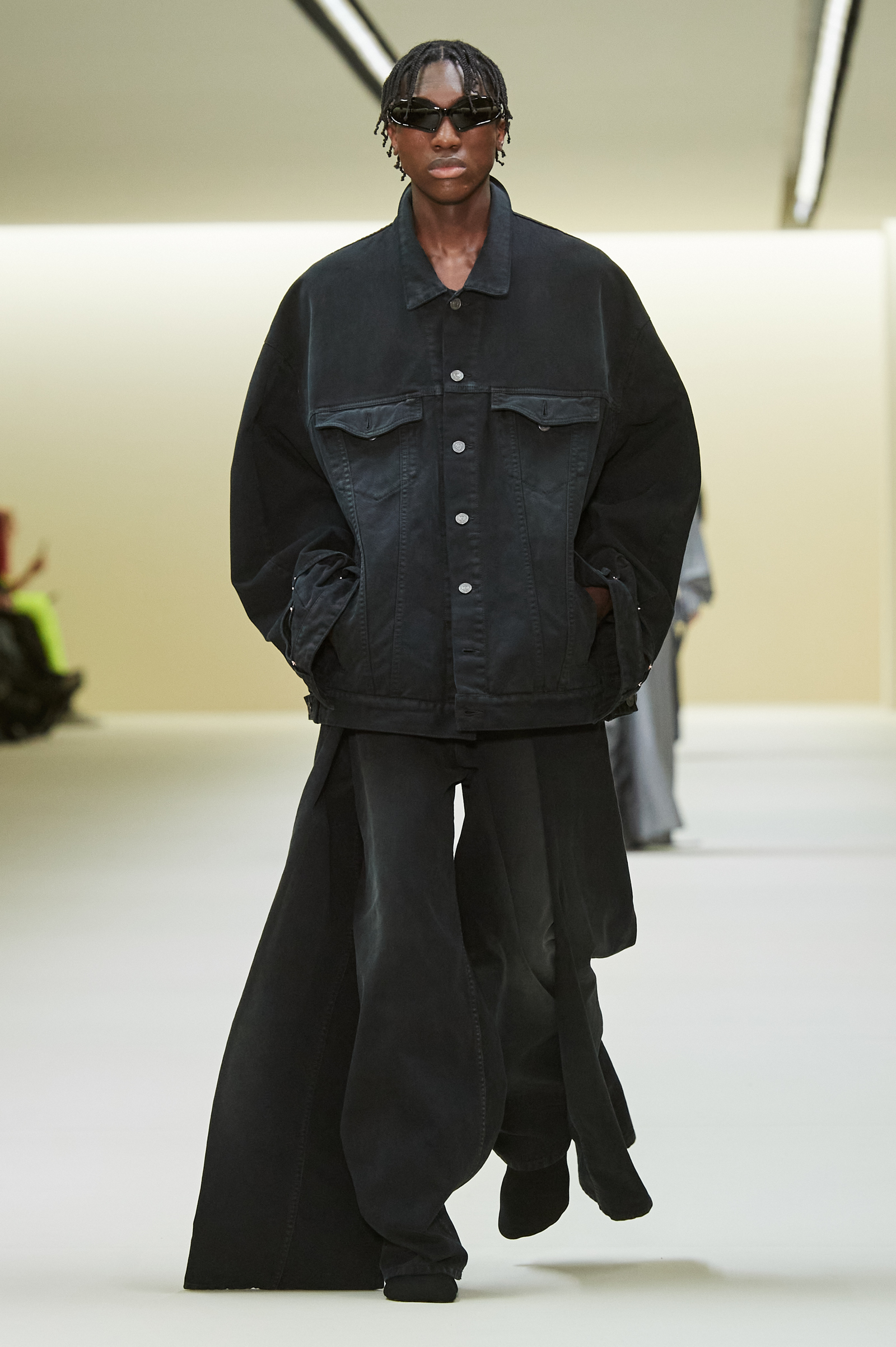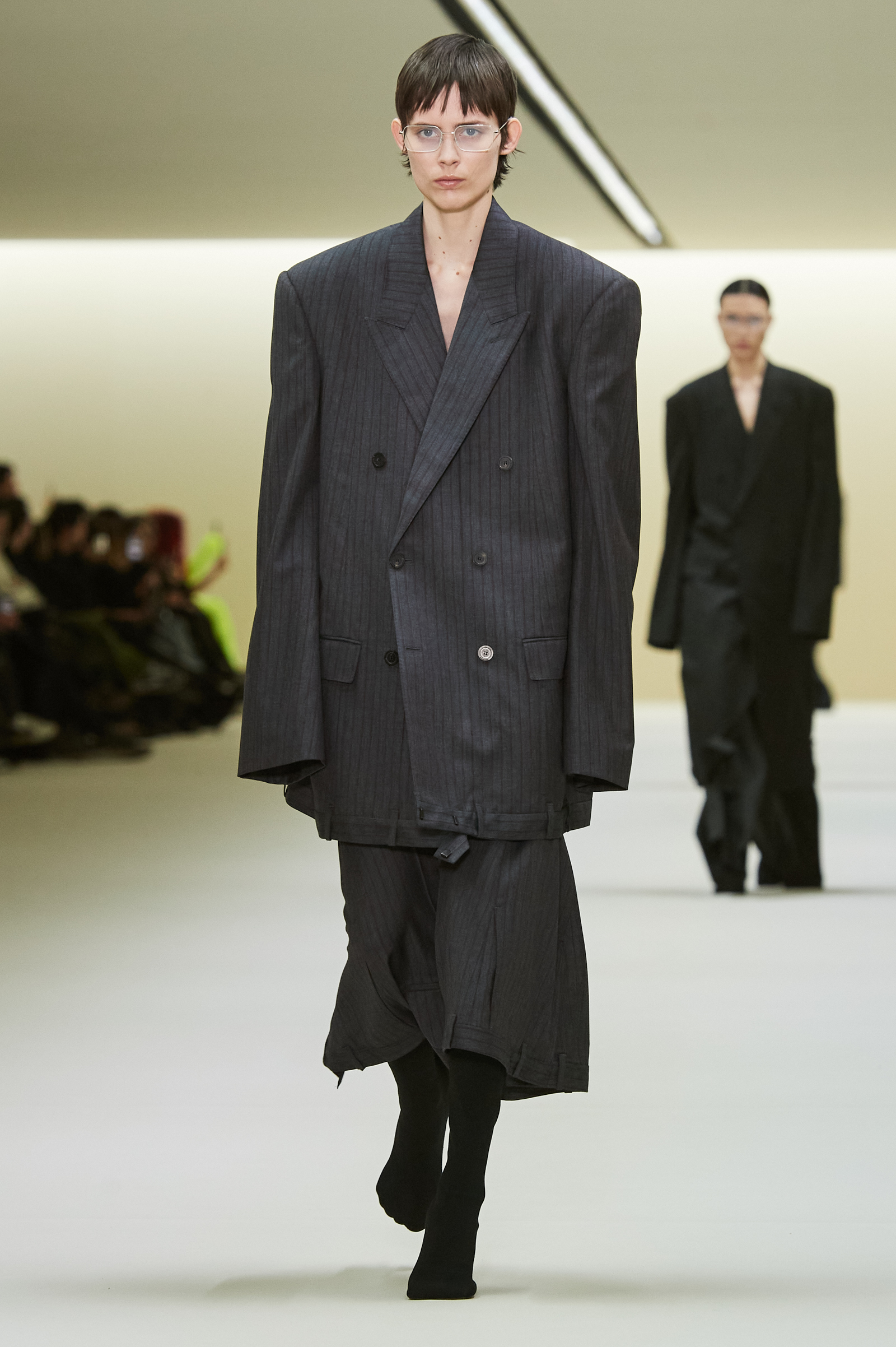 Who he is, and where he is now: It was hard not to read the imagery of a world turned upside down in the makings of the long, somber sequence of 17 black oversized tailoring looks that opened the show. Black is a Balenciaga core non-shade; it syncs with the mood of fashion at large, and it was a reminder that Demna was, after all, the progenitor of the super-sizing that’s swept fashion in the last decade. Nothing new there. What was different: all these pieces were constructed from reverse-tailored trousers. There were coats and jackets with pant-loops and pockets in the hems. And below them hung doubled pairs of trousers, giving, from the side, the surreal illusion that the people were walking on four legs.