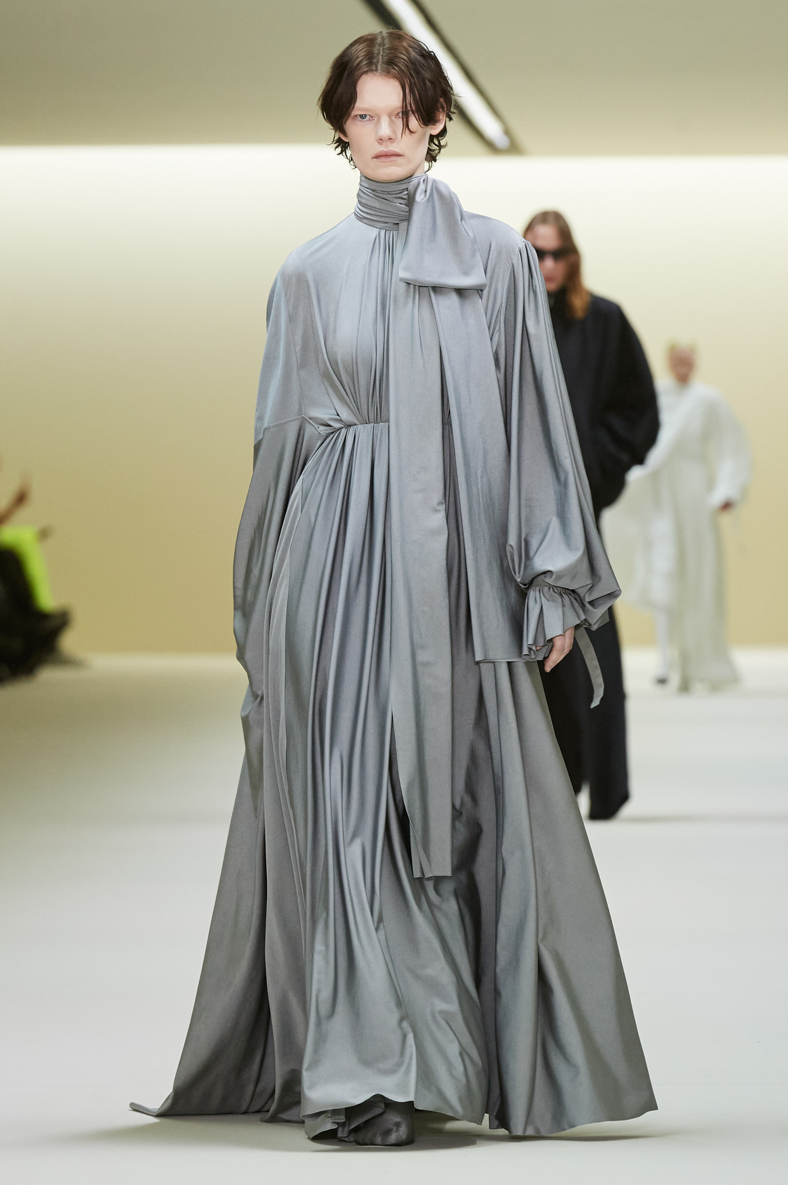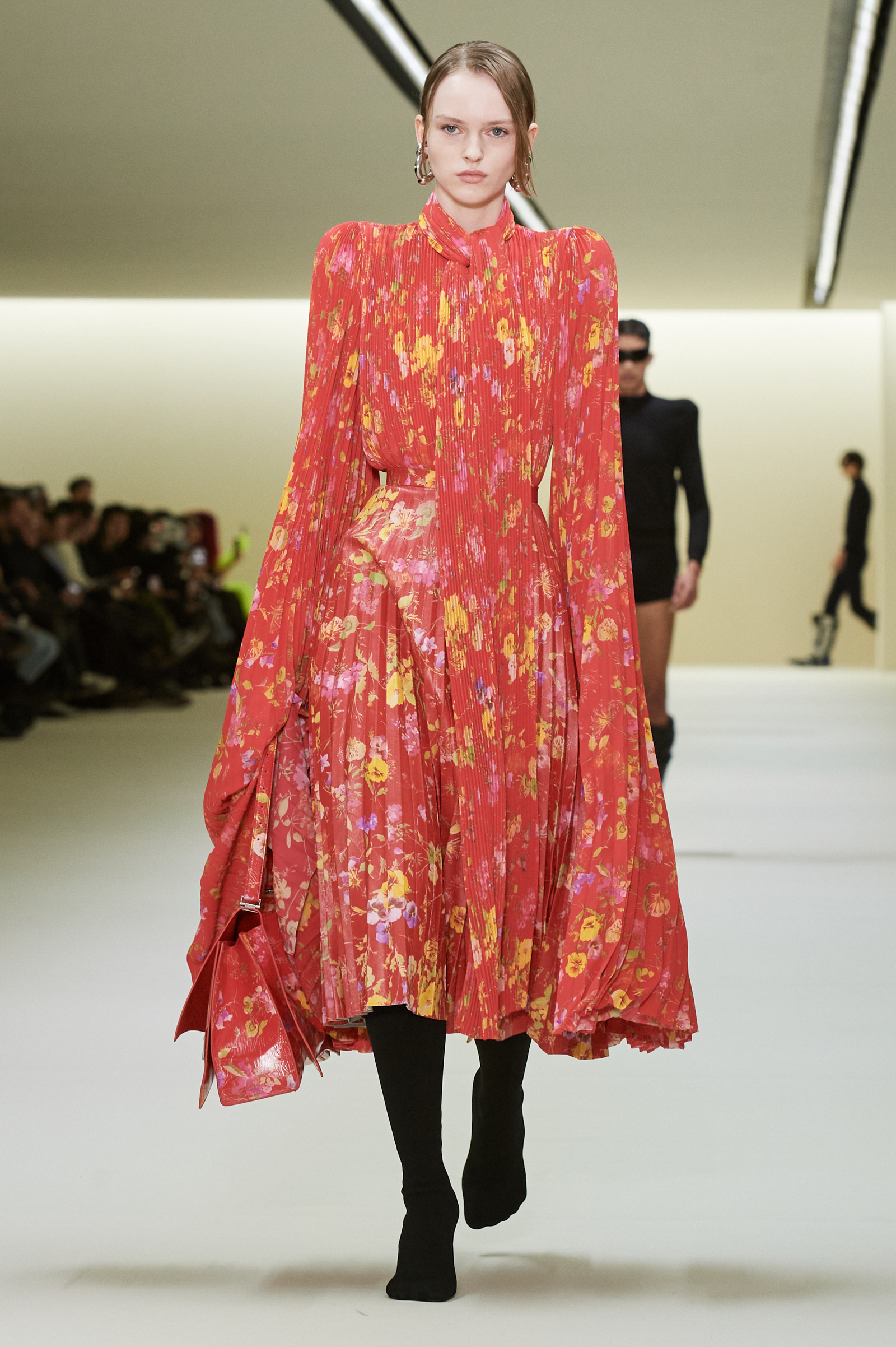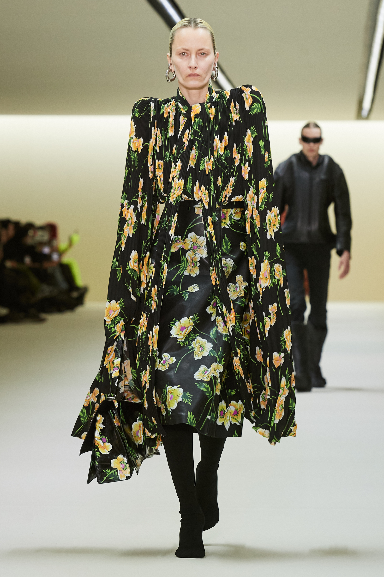 “Evolving it is the number one reason why I am here,” as he’d commented to Vogue earlier. Shorn of distractions, critically, the collection could be seen as a hybrid of Demna-isms—cyber-avatar menswear, his familiar flower-printed knife-pleated dresses—segueing into more of a distinct homage to the founder’s archival evening gowns. These were long, slim, covered-up dresses, minutely embellished, and with a new signature rounded-bump of a shoulderline.