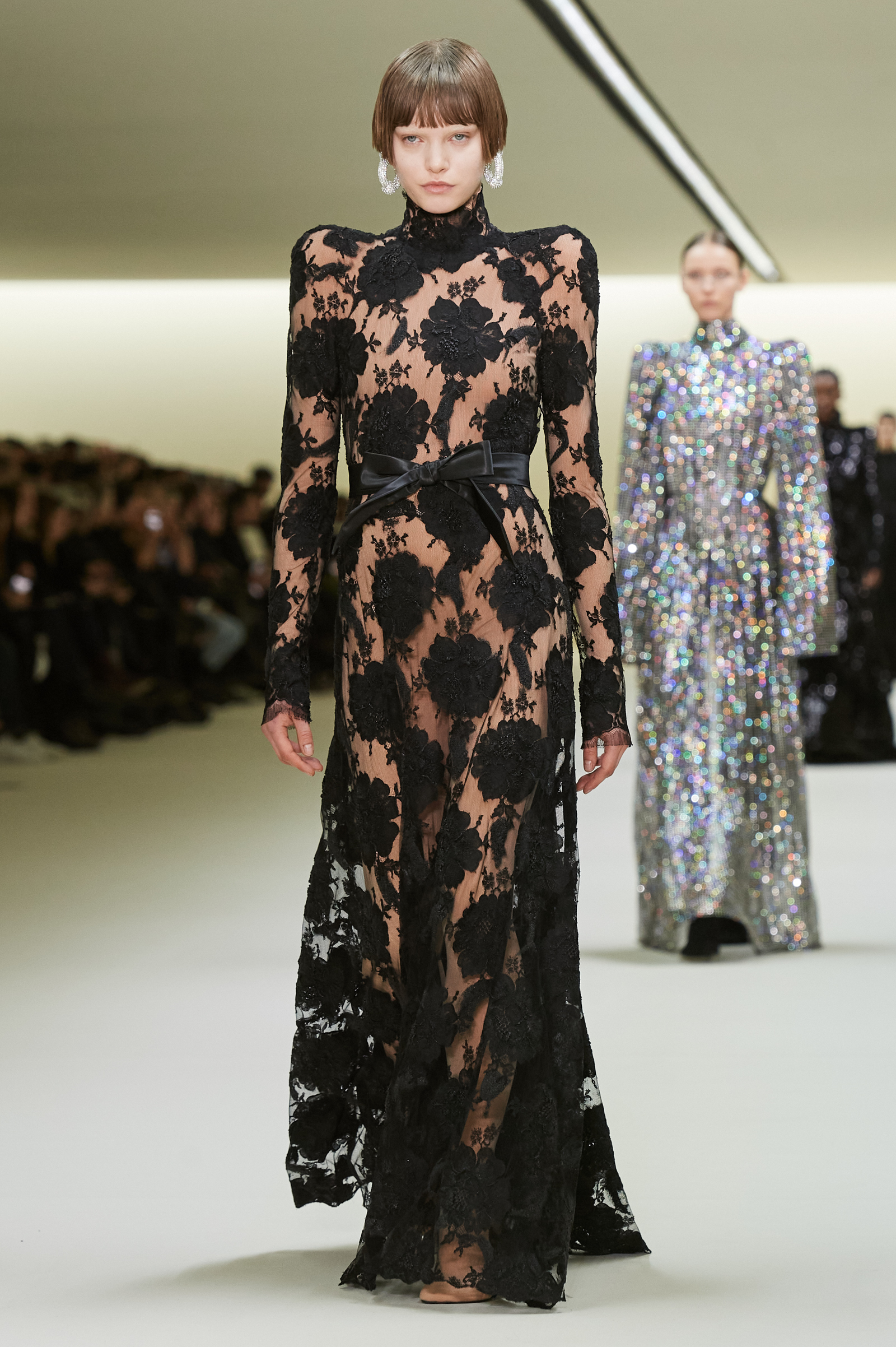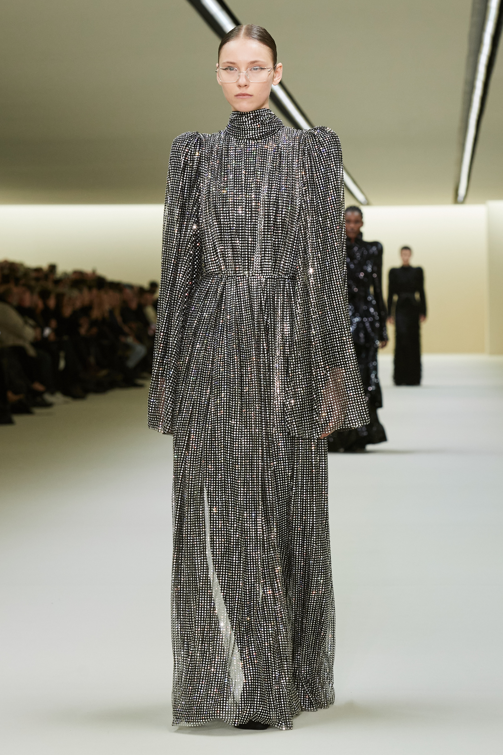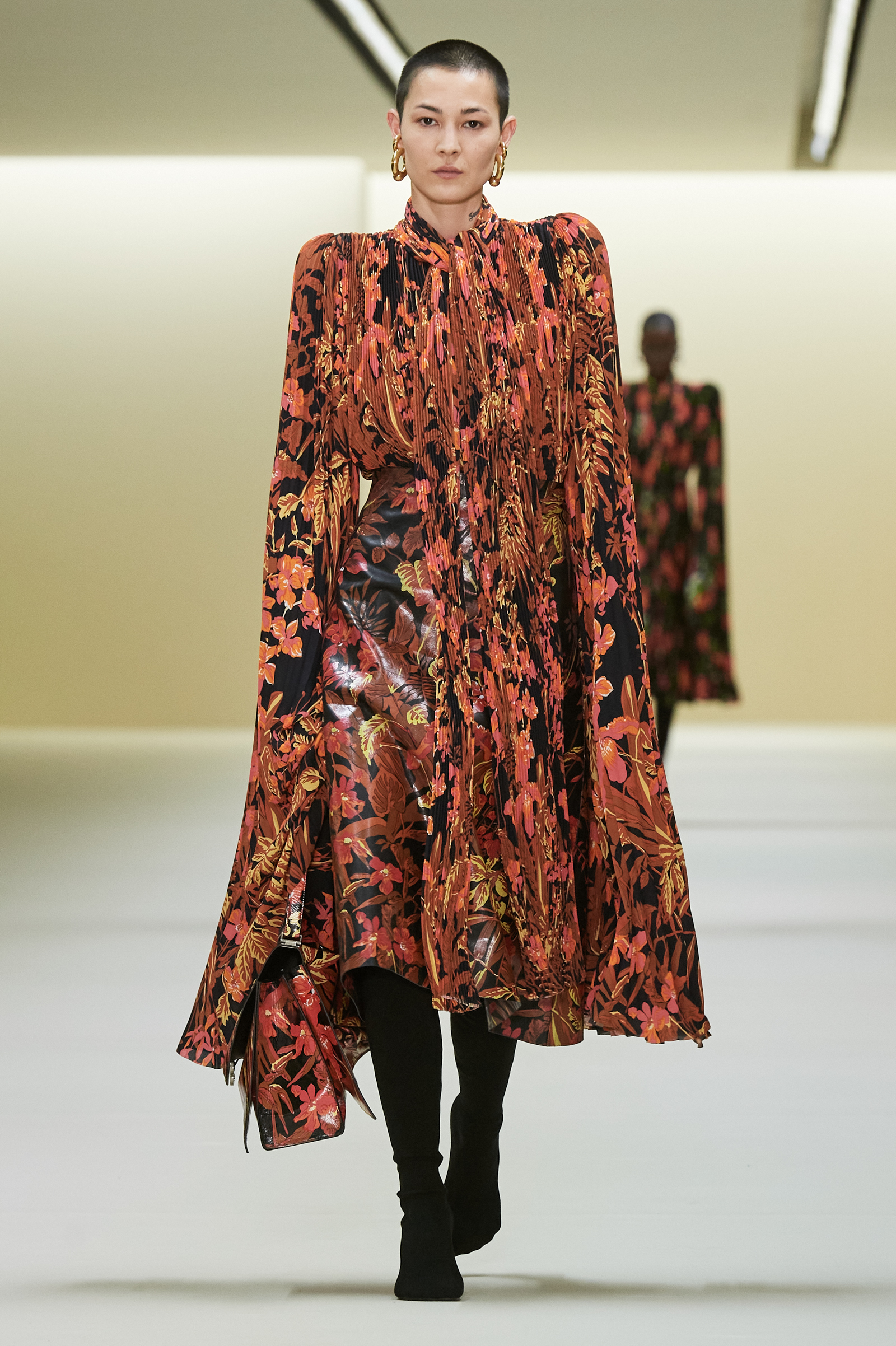 “Evolving it is the number one reason why I am here,” as he’d commented to Vogue earlier. Shorn of distractions, critically, the collection could be seen as a hybrid of Demna-isms—cyber-avatar menswear, his familiar flower-printed knife-pleated dresses—segueing into more of a distinct homage to the founder’s archival evening gowns. These were long, slim, covered-up dresses, minutely embellished, and with a new signature rounded-bump of a shoulderline.