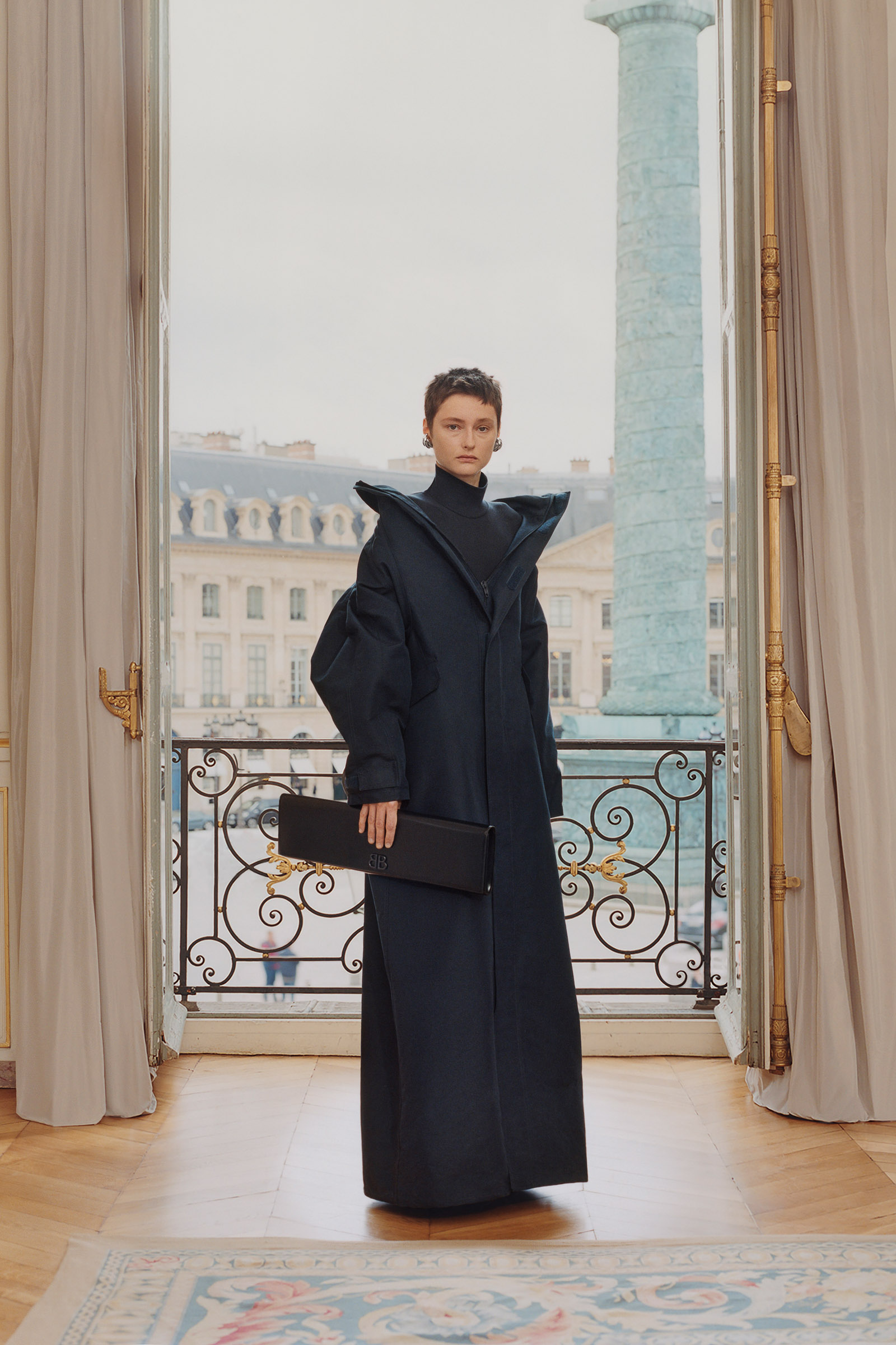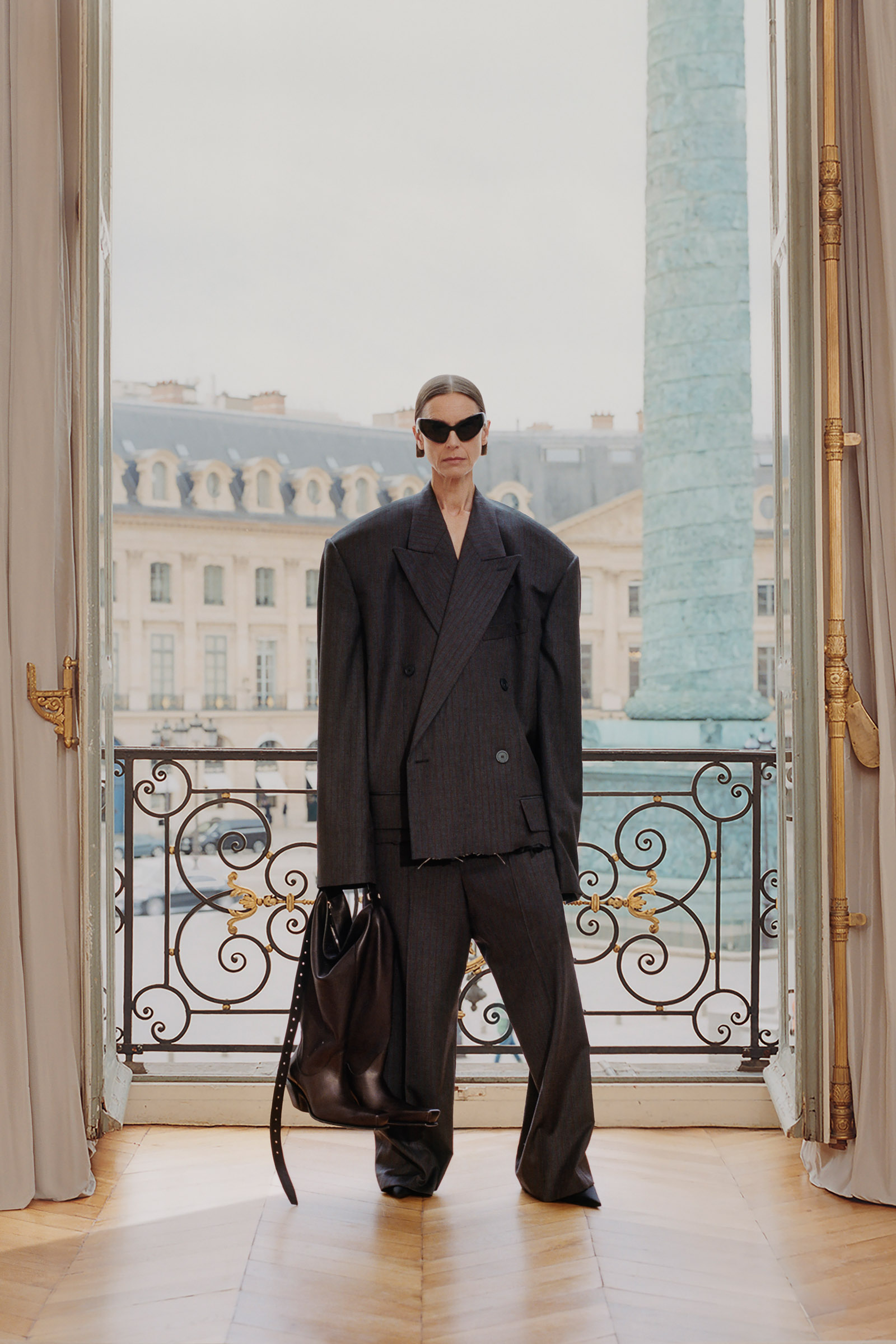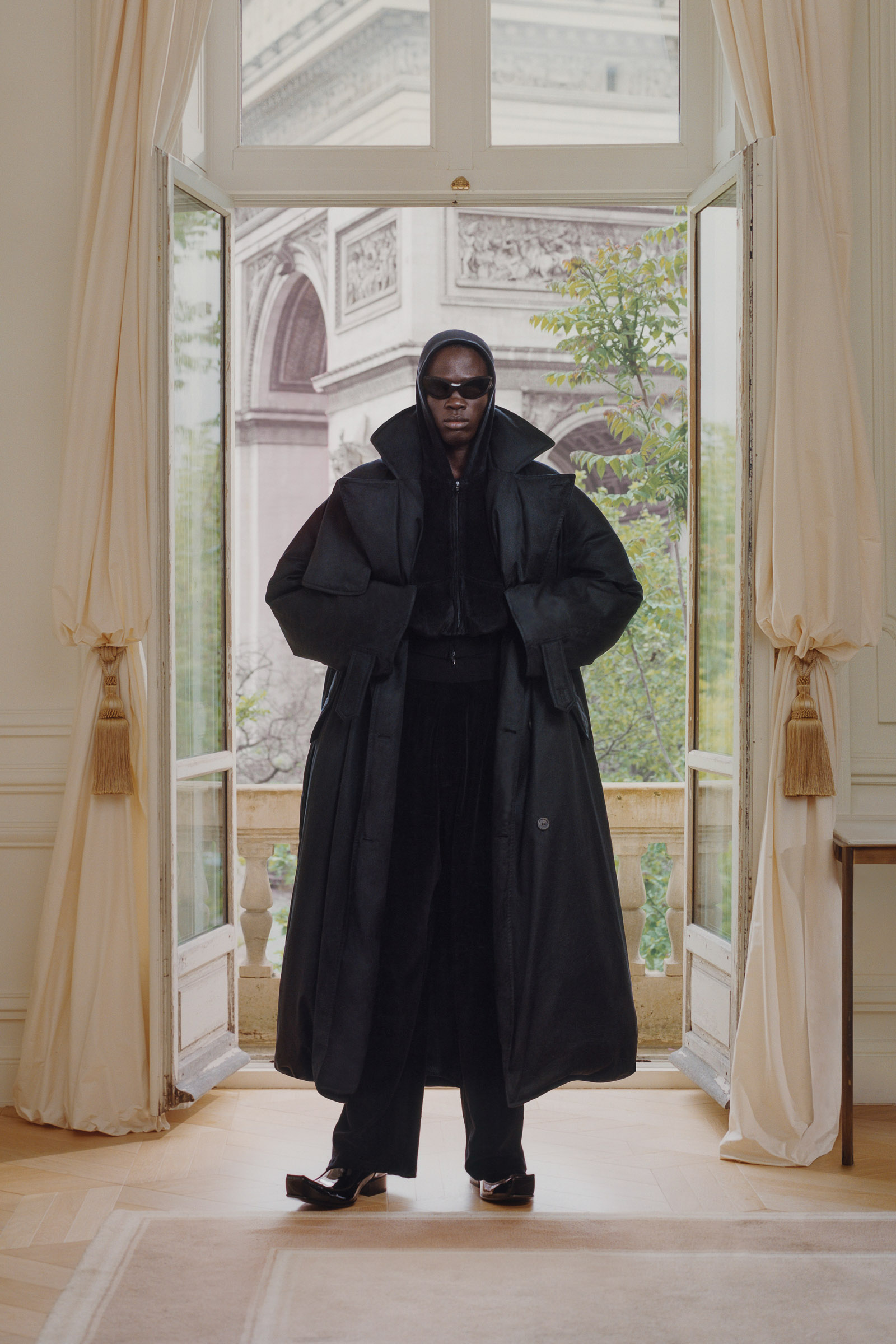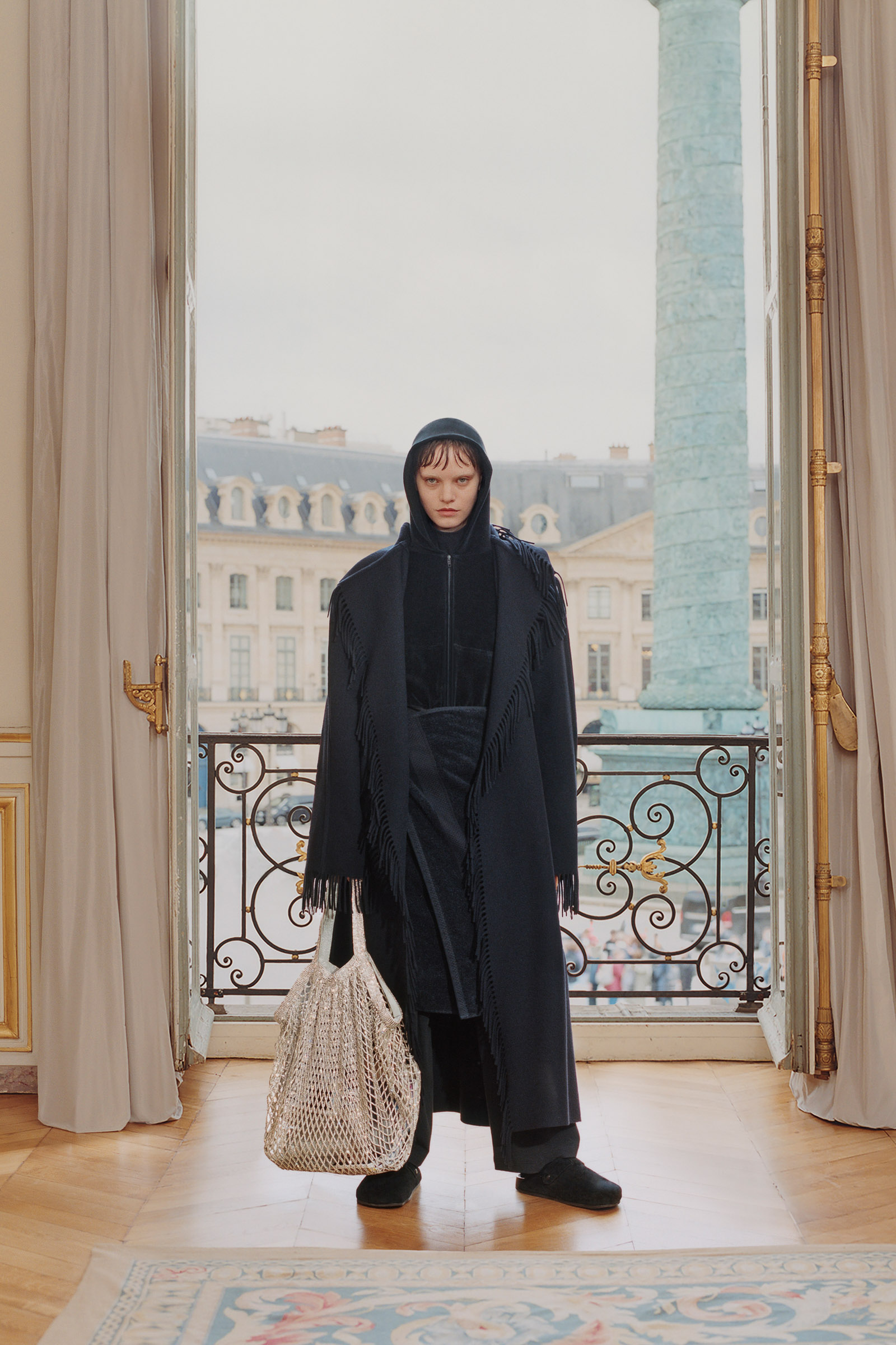Underlining the fact that Demna is steering the brand narrative back to Paris, and to the house, he punningly named the collection Capital B. His second take on the collection is by way of a lookbook, apparently shot in grand rooms that variously overlook the Place Vendome and the Arc de Triomphe. Here, his perma-silhouettes are clearly in view: the oversized suiting, enveloping trapezoid coats and puffed-up trenches, the hoodies, and the bug-eyed ‘Dynamo round’ shades with almost everything. As a pre-collection it encompasses every Balenciaga category, womenswear and menswear, formal black tailoring to denim, motorcycle leathers and sweatpants. Interspersed are also pieces from the high-luxe ‘Garde-Robe’ collection, which are an annual release, such as the silver-fringed embroidered dress at the end.