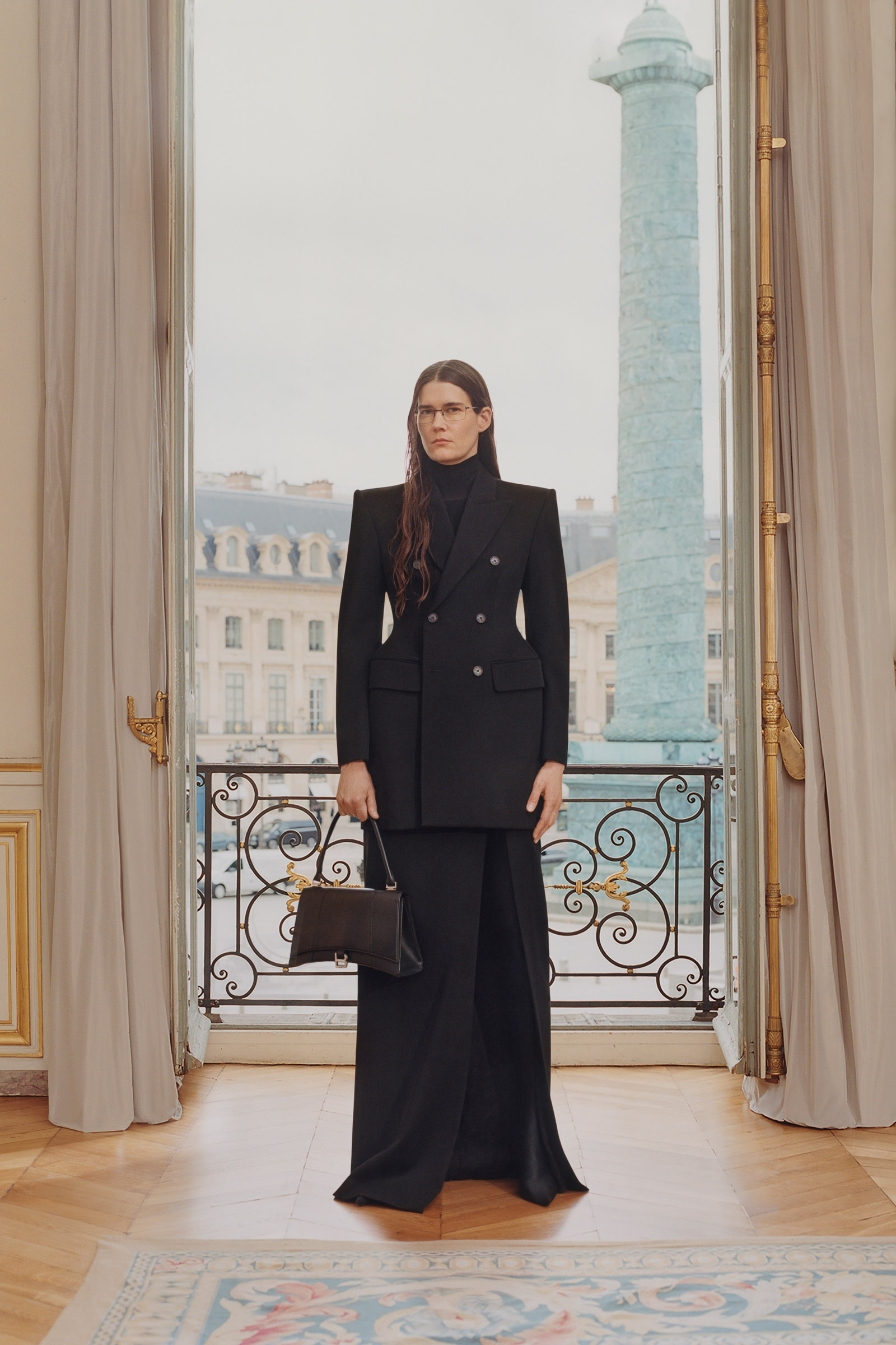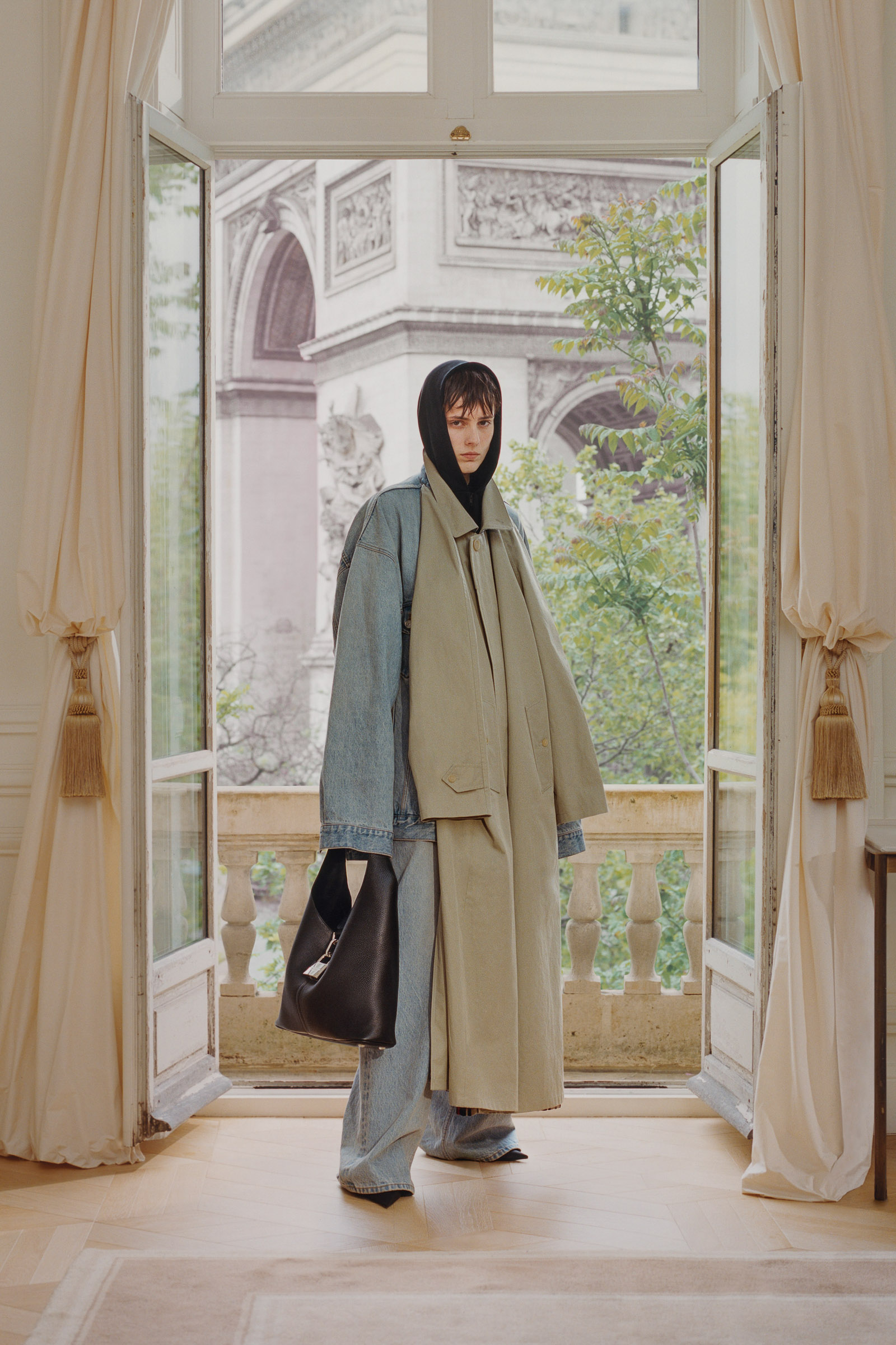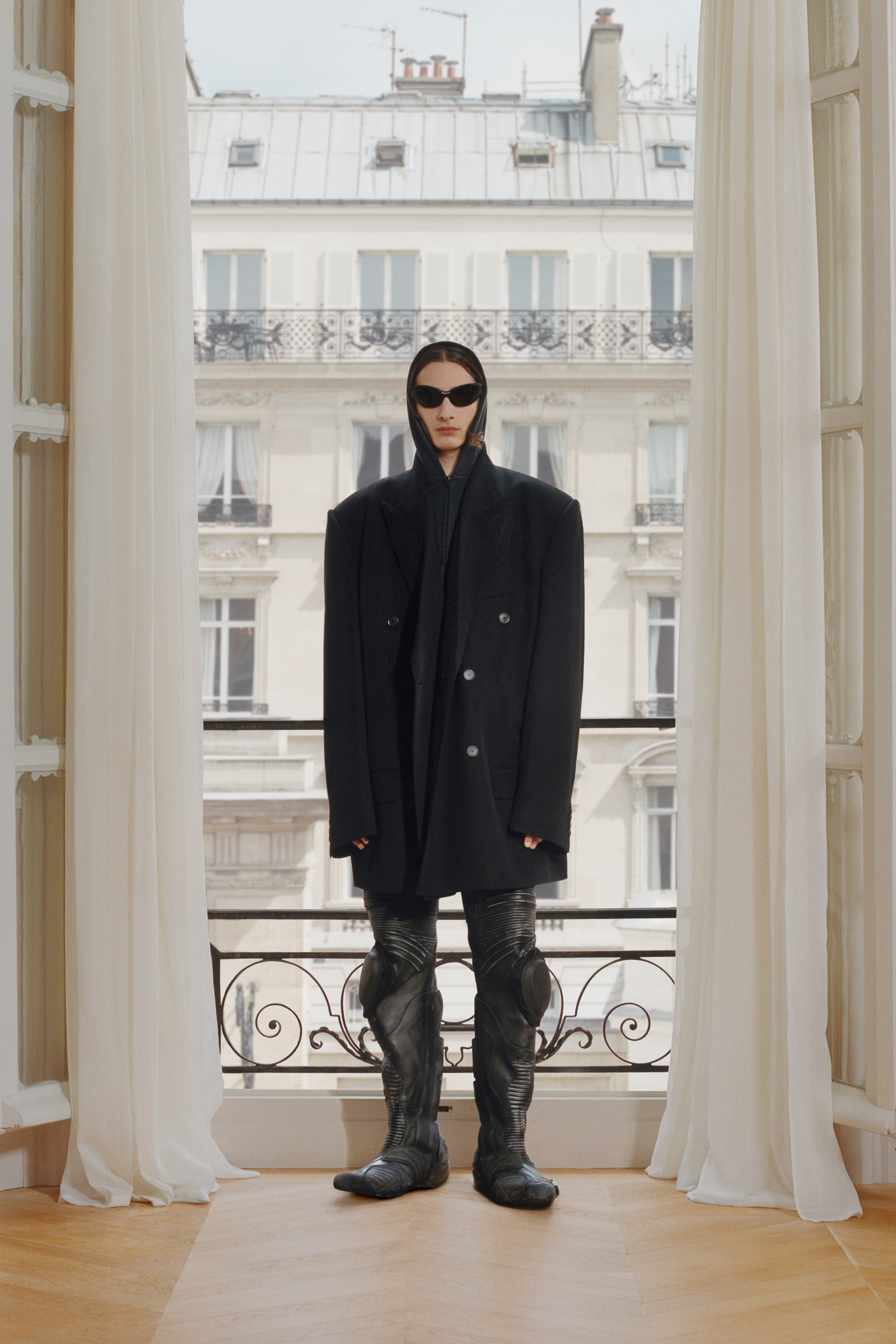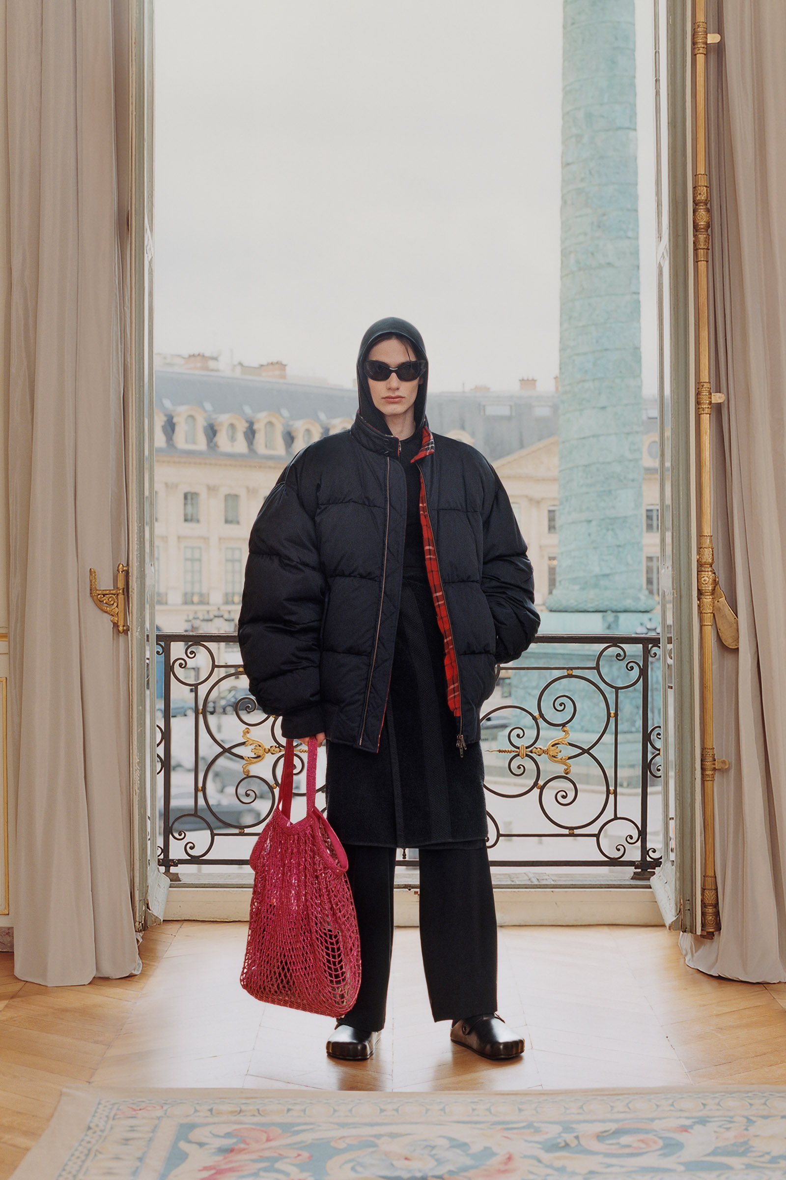 Underlining the fact that Demna is steering the brand narrative back to Paris, and to the house, he punningly named the collection Capital B. His second take on the collection is by way of a lookbook, apparently shot in grand rooms that variously overlook the Place Vendome and the Arc de Triomphe. Here, his perma-silhouettes are clearly in view: the oversized suiting, enveloping trapezoid coats and puffed-up trenches, the hoodies, and the bug-eyed ‘Dynamo round’ shades with almost everything. As a pre-collection it encompasses every Balenciaga category, womenswear and menswear, formal black tailoring to denim, motorcycle leathers and sweatpants. Interspersed are also pieces from the high-luxe ‘Garde-Robe’ collection, which are an annual release, such as the silver-fringed embroidered dress at the end.