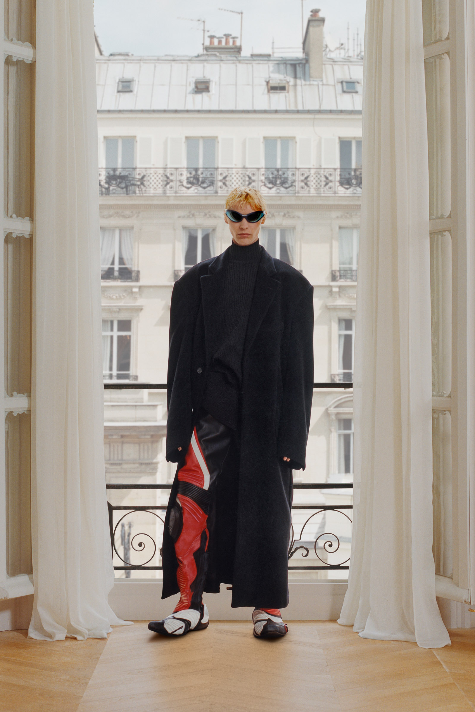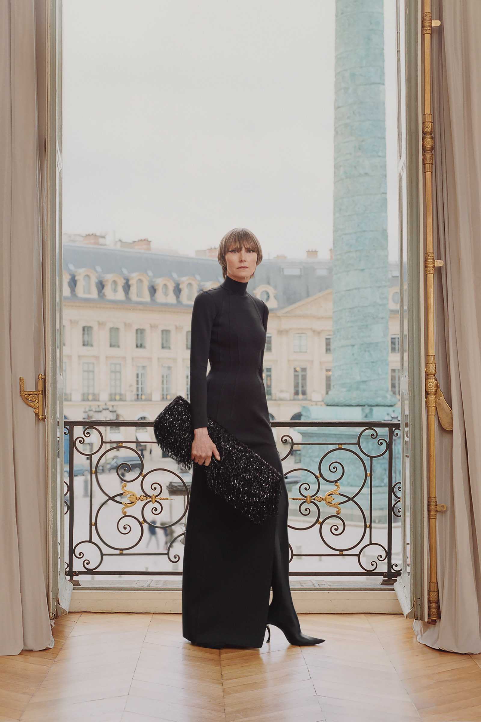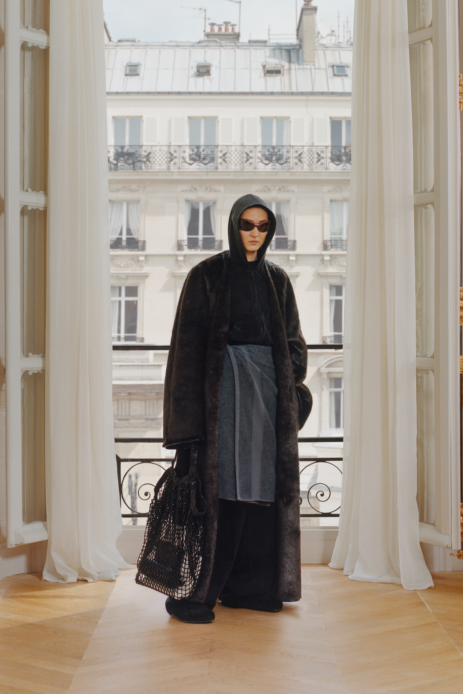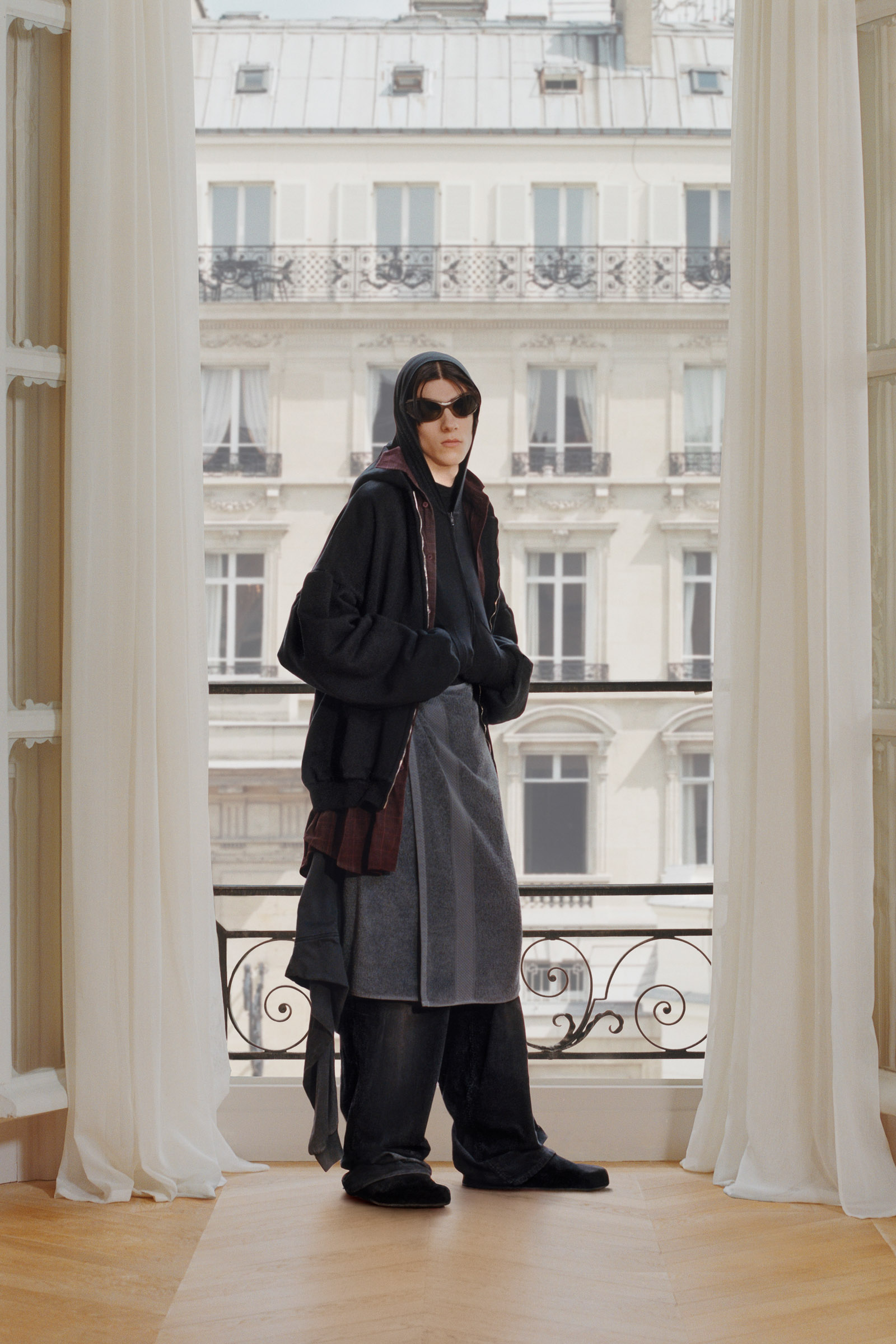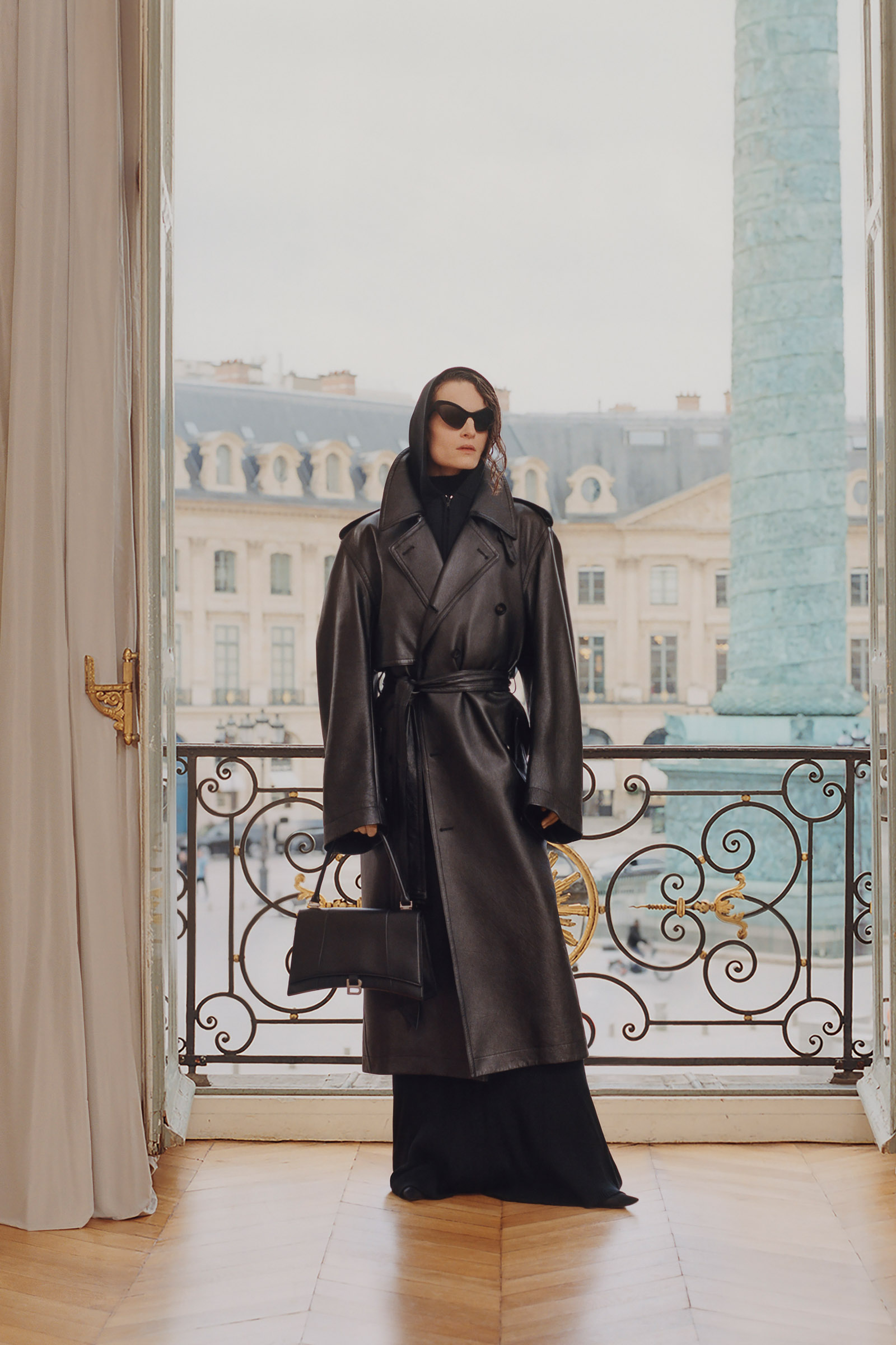 Underlining the fact that Demna is steering the brand narrative back to Paris, and to the house, he punningly named the collection Capital B. His second take on the collection is by way of a lookbook, apparently shot in grand rooms that variously overlook the Place Vendome and the Arc de Triomphe. Here, his perma-silhouettes are clearly in view: the oversized suiting, enveloping trapezoid coats and puffed-up trenches, the hoodies, and the bug-eyed ‘Dynamo round’ shades with almost everything. As a pre-collection it encompasses every Balenciaga category, womenswear and menswear, formal black tailoring to denim, motorcycle leathers and sweatpants. Interspersed are also pieces from the high-luxe ‘Garde-Robe’ collection, which are an annual release, such as the silver-fringed embroidered dress at the end.