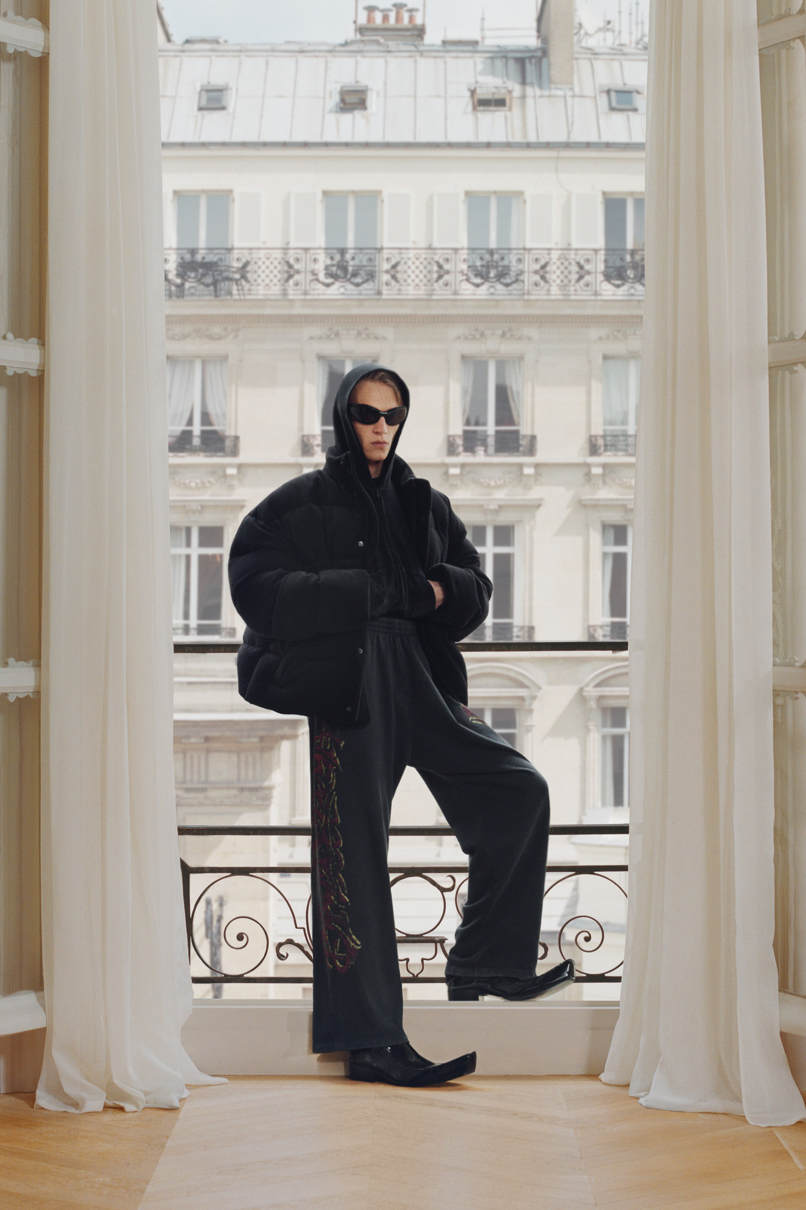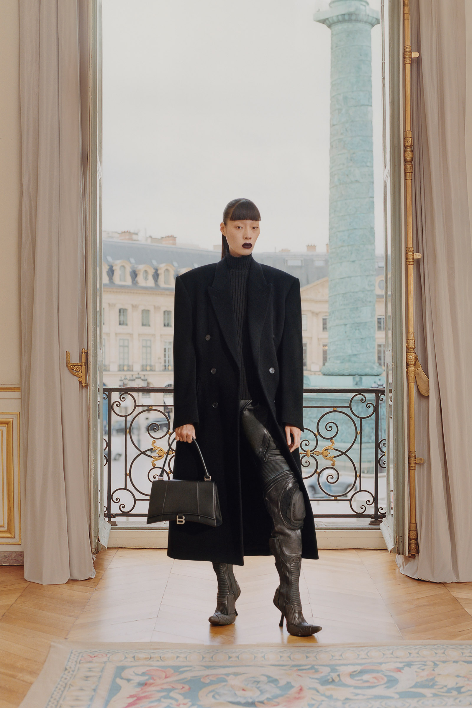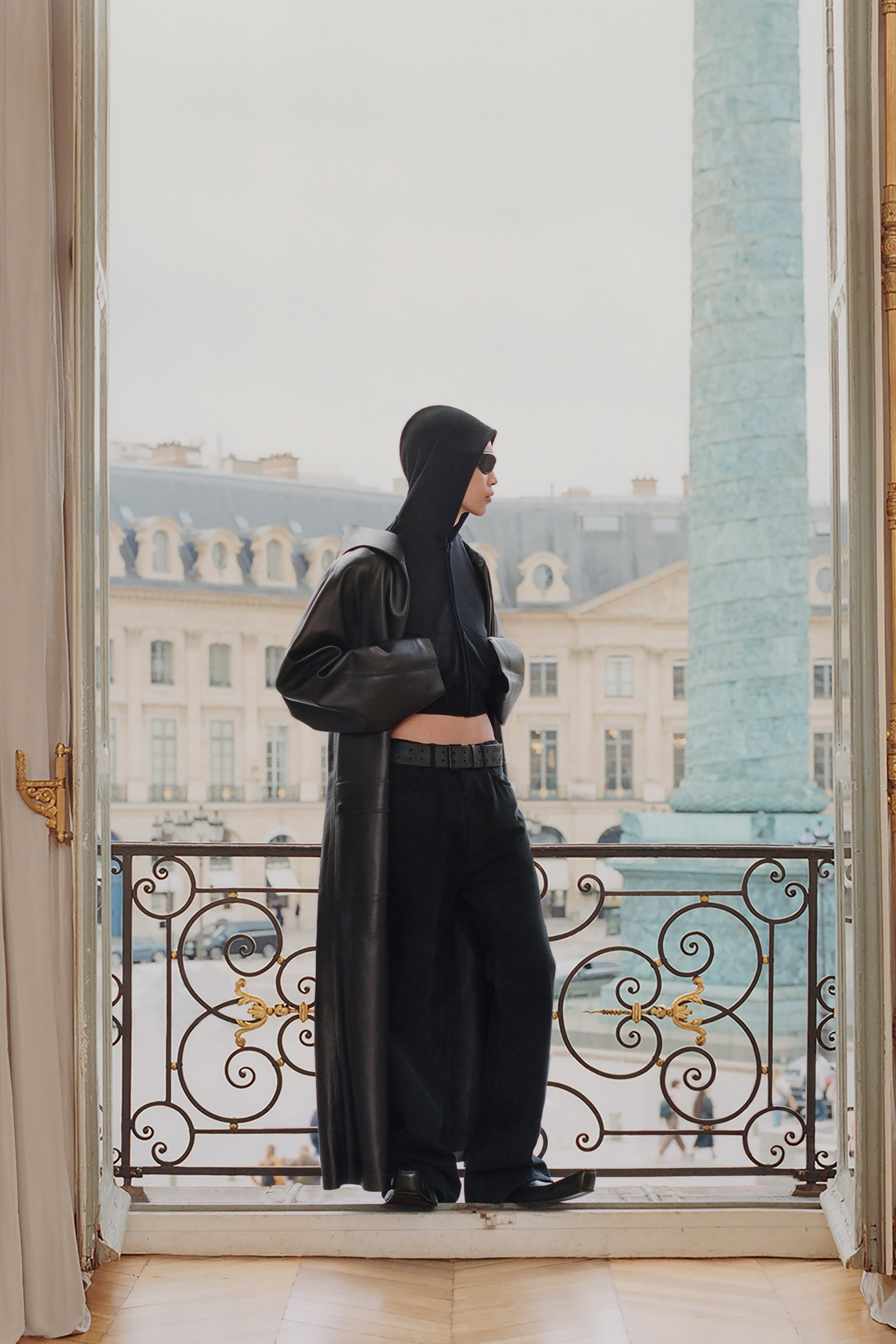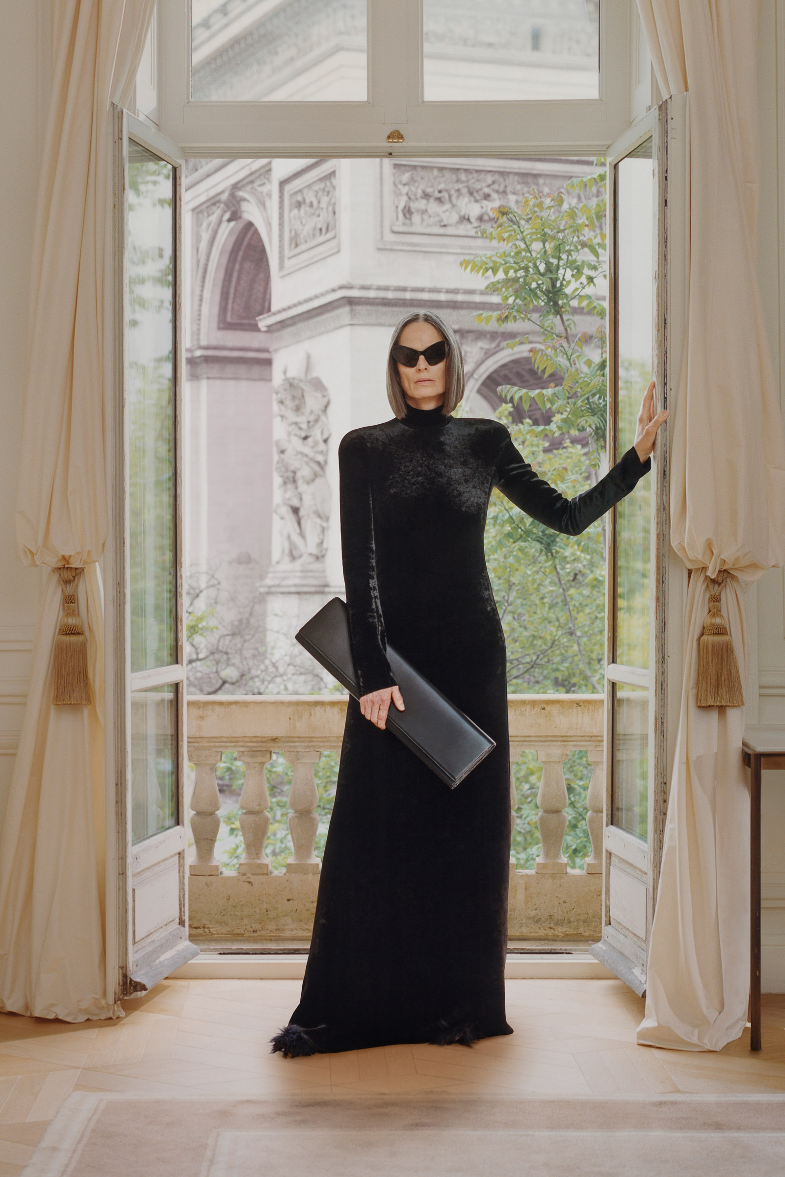 Underlining the fact that Demna is steering the brand narrative back to Paris, and to the house, he punningly named the collection Capital B. His second take on the collection is by way of a lookbook, apparently shot in grand rooms that variously overlook the Place Vendome and the Arc de Triomphe. Here, his perma-silhouettes are clearly in view: the oversized suiting, enveloping trapezoid coats and puffed-up trenches, the hoodies, and the bug-eyed ‘Dynamo round’ shades with almost everything. As a pre-collection it encompasses every Balenciaga category, womenswear and menswear, formal black tailoring to denim, motorcycle leathers and sweatpants. Interspersed are also pieces from the high-luxe ‘Garde-Robe’ collection, which are an annual release, such as the silver-fringed embroidered dress at the end.
