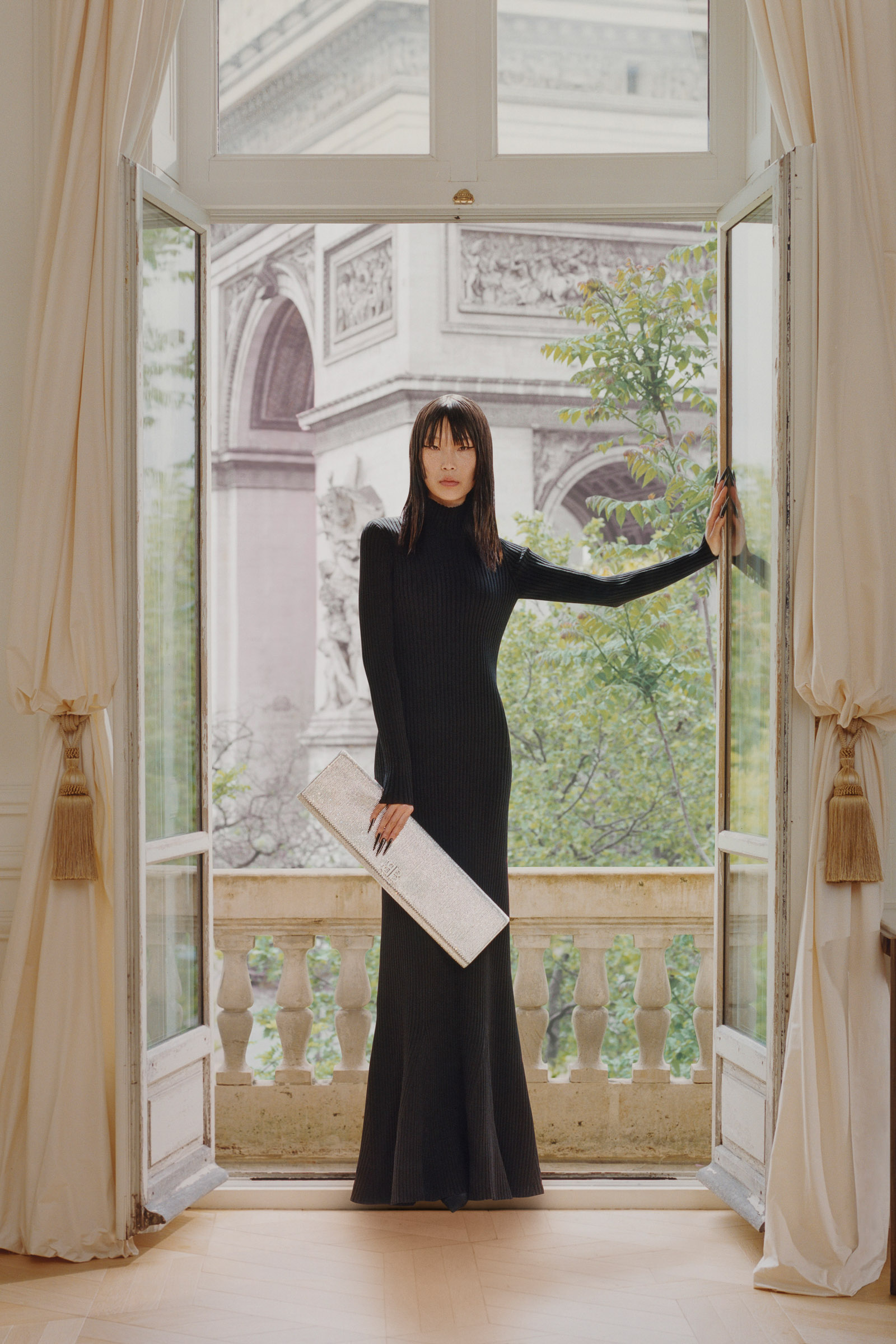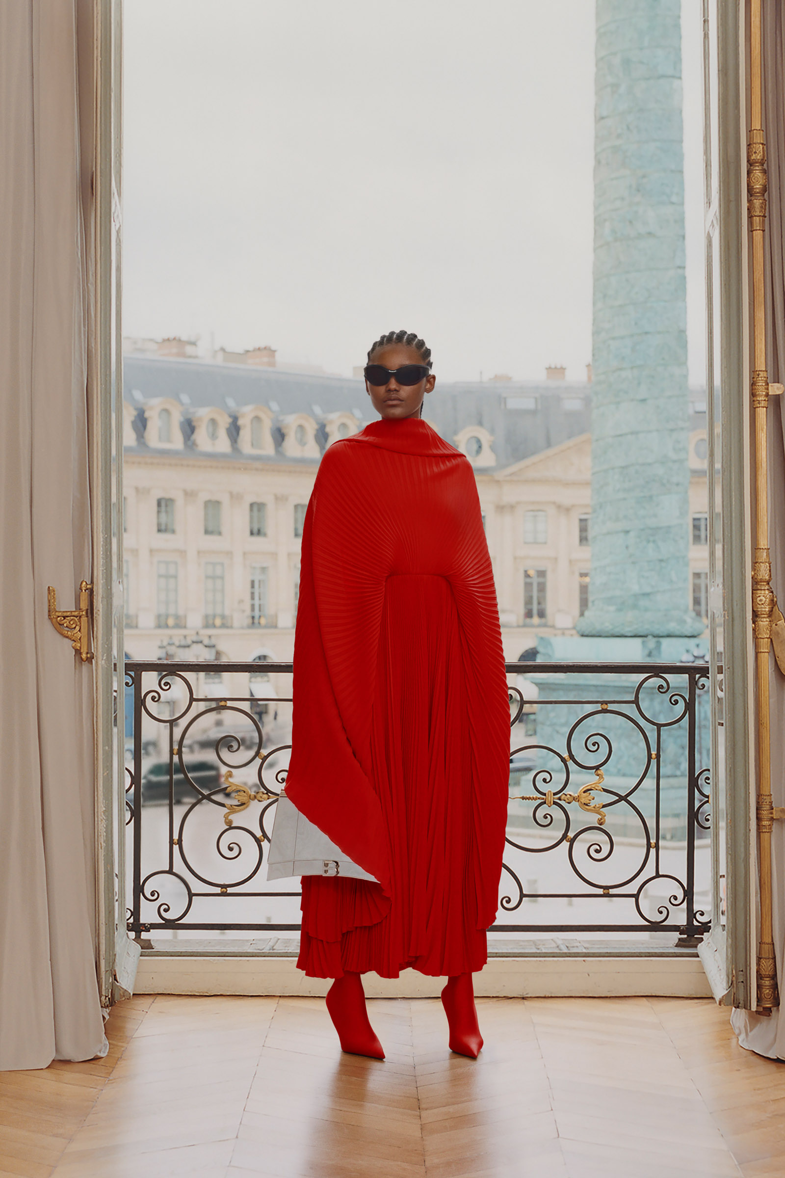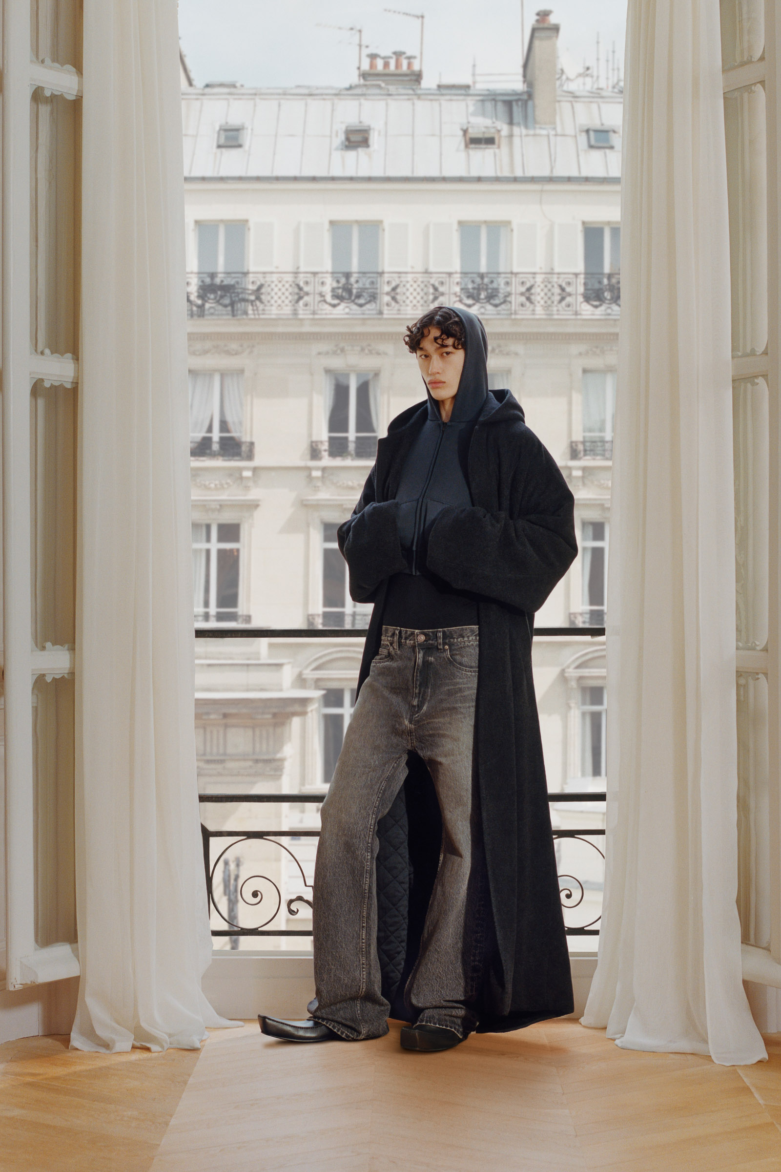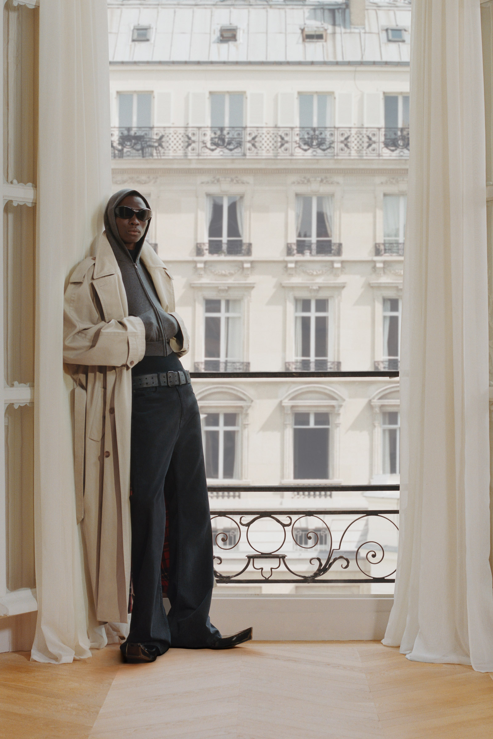 Underlining the fact that Demna is steering the brand narrative back to Paris, and to the house, he punningly named the collection Capital B. His second take on the collection is by way of a lookbook, apparently shot in grand rooms that variously overlook the Place Vendome and the Arc de Triomphe. Here, his perma-silhouettes are clearly in view: the oversized suiting, enveloping trapezoid coats and puffed-up trenches, the hoodies, and the bug-eyed ‘Dynamo round’ shades with almost everything. As a pre-collection it encompasses every Balenciaga category, womenswear and menswear, formal black tailoring to denim, motorcycle leathers and sweatpants. Interspersed are also pieces from the high-luxe ‘Garde-Robe’ collection, which are an annual release, such as the silver-fringed embroidered dress at the end.