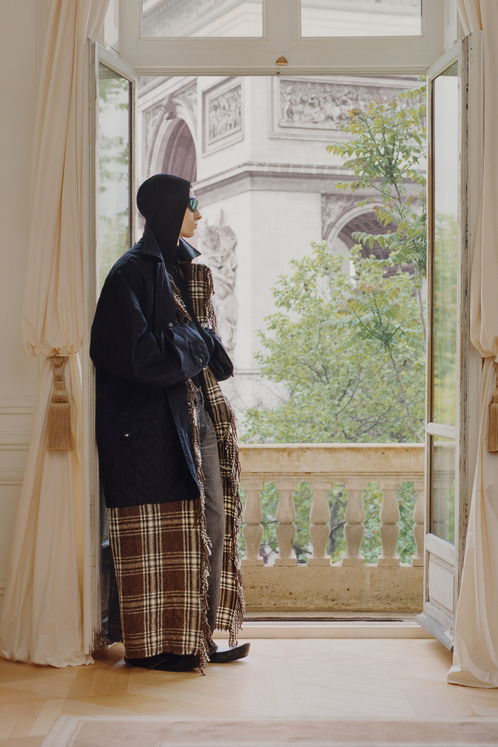 It’s entertaining. We watch as the insider members of the perma-shaded Balenciaga gang deal with the unwonted indignity of being caught in a sudden Parisian downpour. A character, clad in a long beige mackintosh with a tartan lining, saunters from the house looking all cool, until they suddenly panic, pat themselves down, and have to turn back in, realizing they’ve forgotten their keys, or more likely, their phone. Someone else desperately tries to find their Uber, or flag down a cab. Finally, the rain proves a terrible inconvenience to the glamorous personages—are they there for a couture fitting?—who are forced to scuttle into the doorway wearing their silver-sequined floor-length evening dresses, right in the middle of the day.