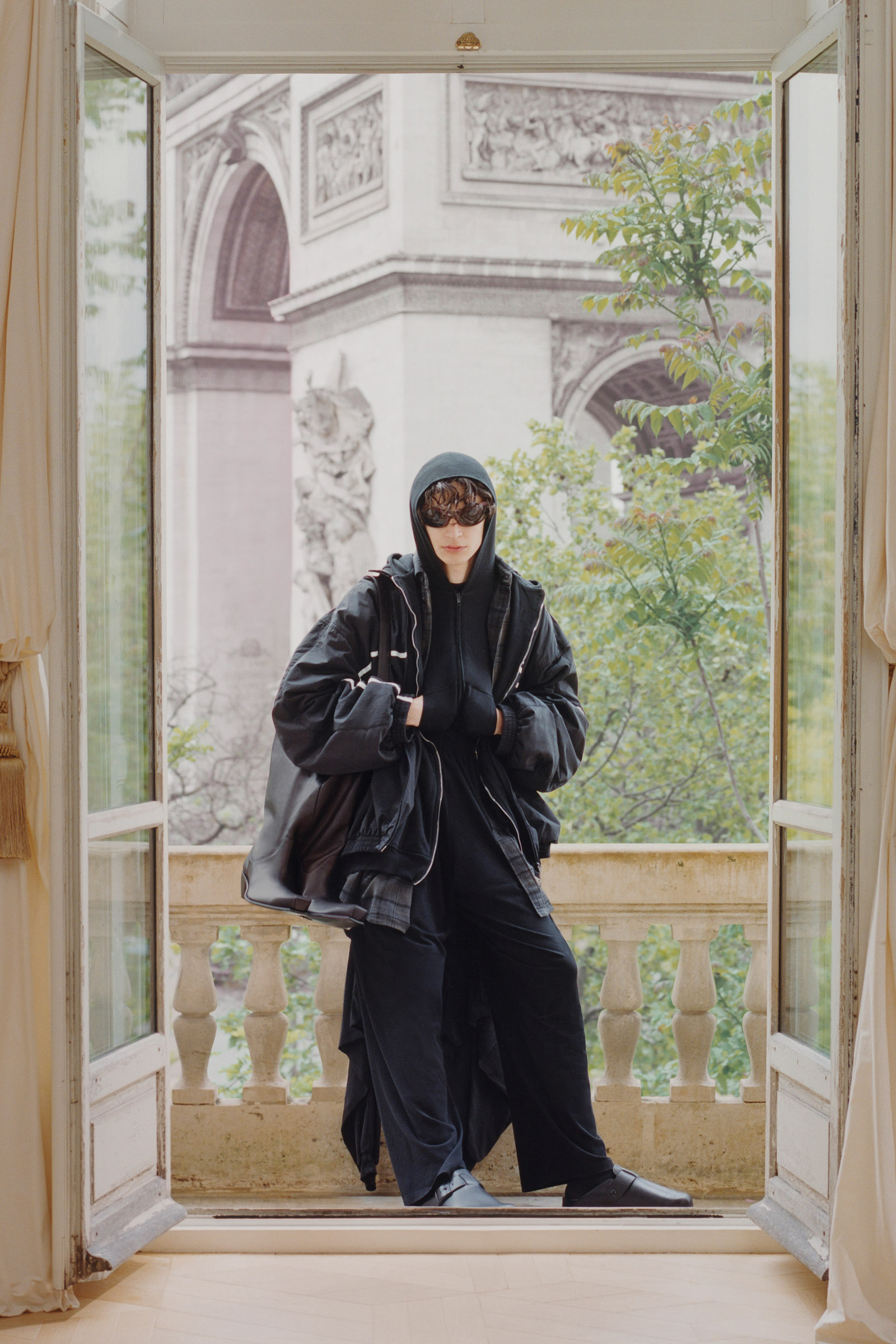Ever since Demna founded Vetements, wry observation of how people dress on the street and for various occupations has always been a dynamic behind his design. The scenario playing out in his new Balenciaga video is very much that way, except that this time the street is the Avenue Georges V. The time-lapse slice-of-life captures people busily going in and out of the Balenciaga maison at number 10, or passing by. Whether they’re denim-clad teens, a motorcycle delivery person, a bourgeois dog walker, a skateboarder, or the retinues of black-clad hoodie-up fashion people going about their business—this is how the whole monde would look if everyone dressed in Balenciaga.