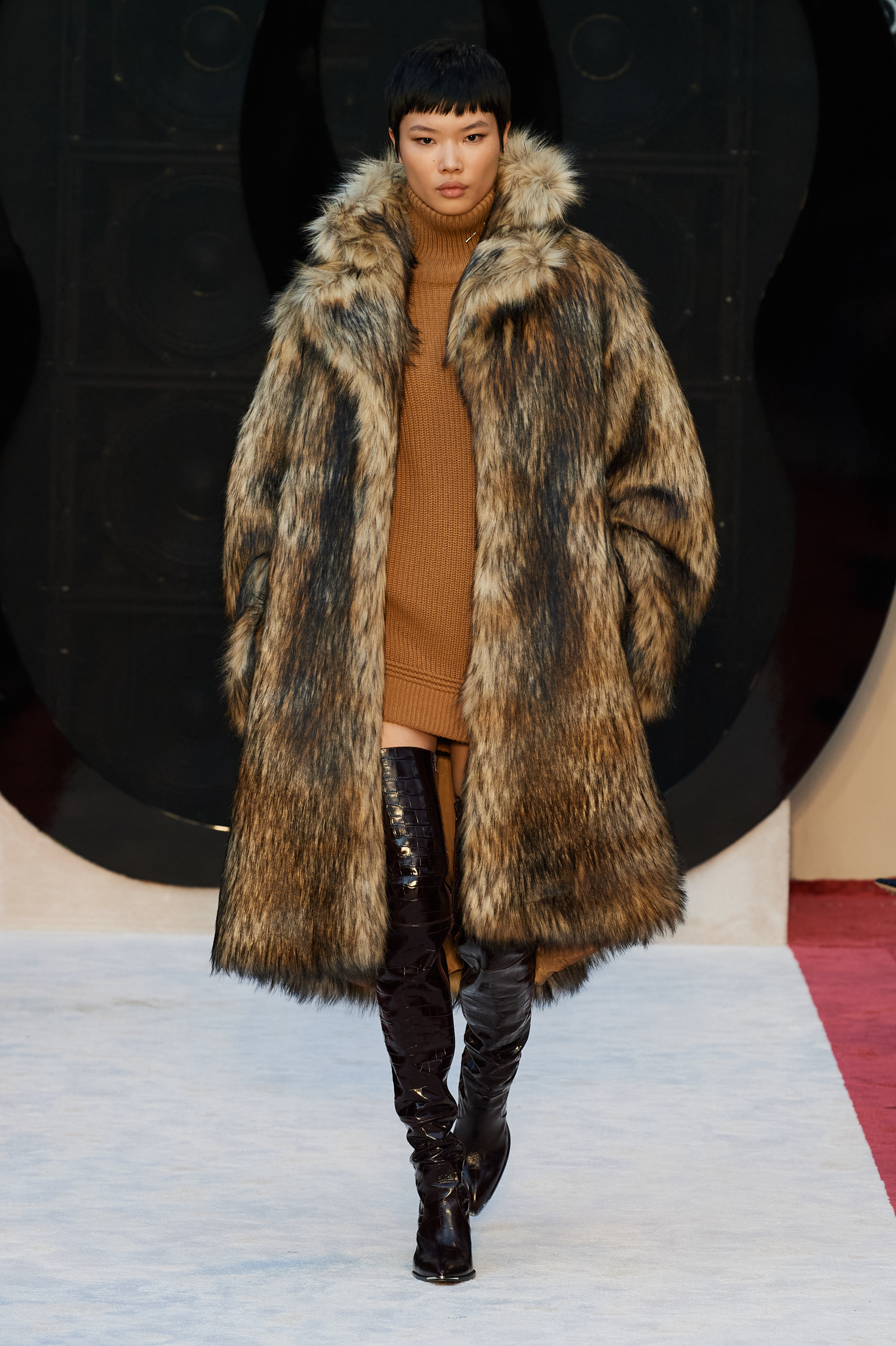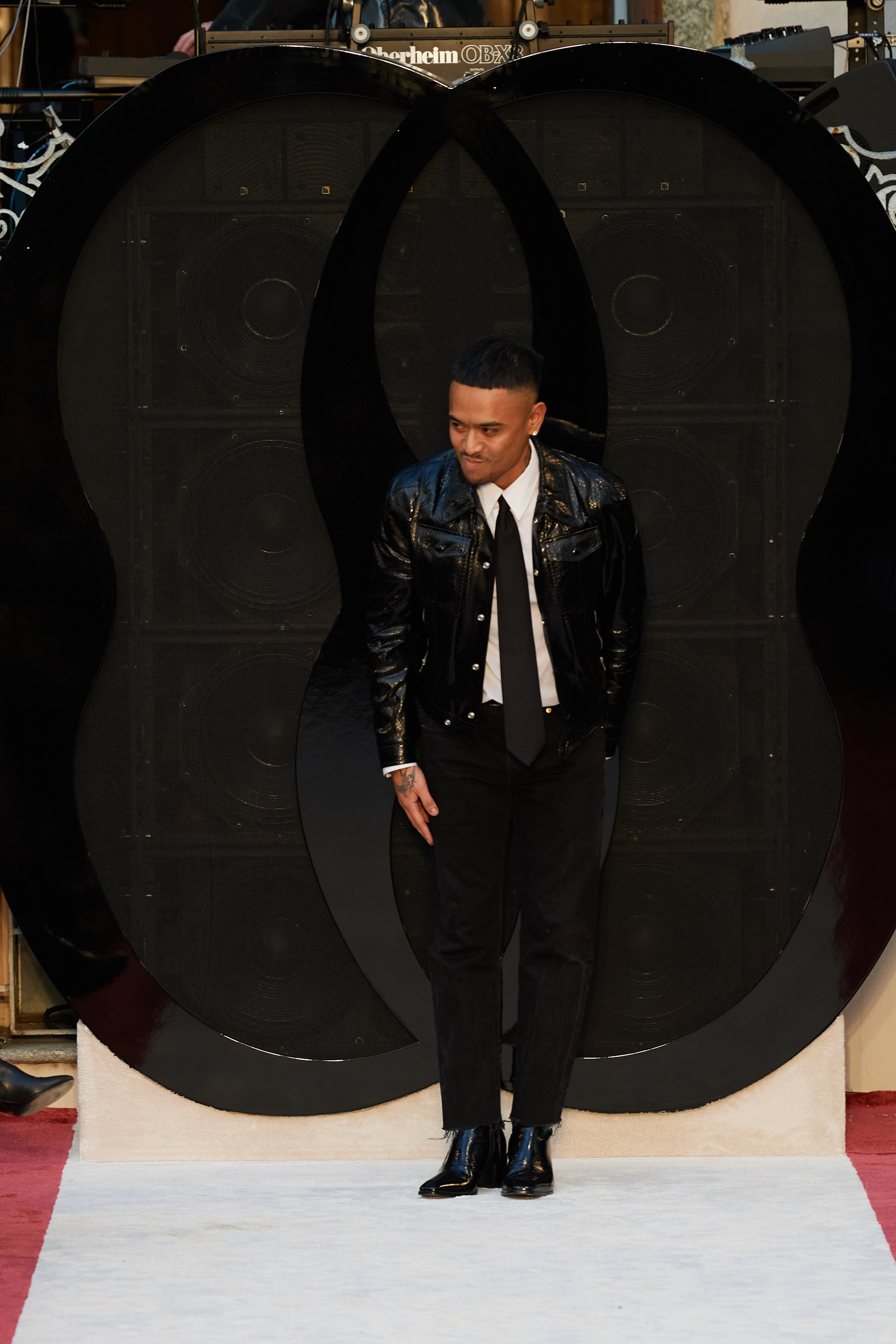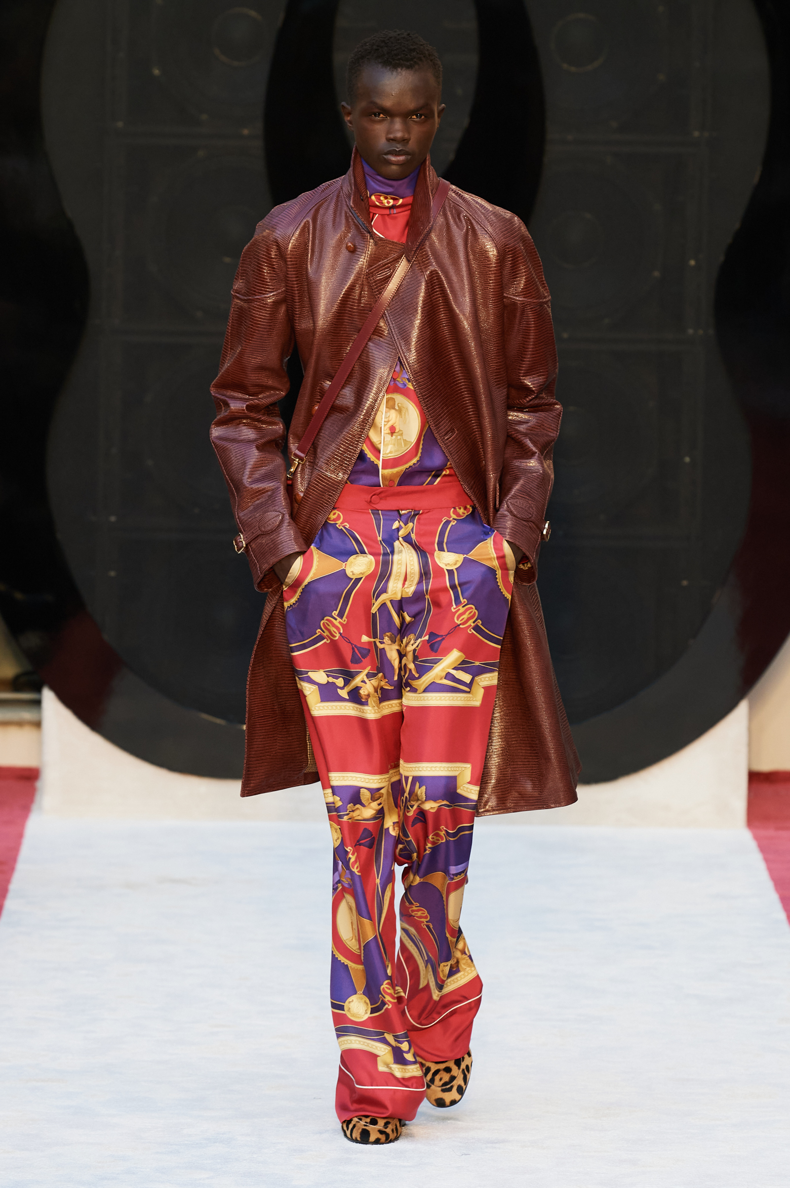 Cheetah print horse hair slippers, leather down jackets shivering with velvet bows, a great oversized leather quilted parka with water snake paneling, animal print 2.5-inch heeled Chelsea boots, and a purple shearling hoodie worn above a black beaded crystal-studded skirt were among Villaseñor’s other opulent offerings. The closing dress hung from the model’s right shoulder and a strap passed along her left: from behind the house name was advertised south east across her shoulder blade in proud gold lettering. Villaseñor said that some in his team had advised him to disrupt—aka “fuck up”—his retro urge with shots of modernity (sneakers and so forth) but he had declined. “Because the most fucked up thing is where I walk out after and I’m not a guy who comes from here or this,” he said. “There’s no silver spoon.”