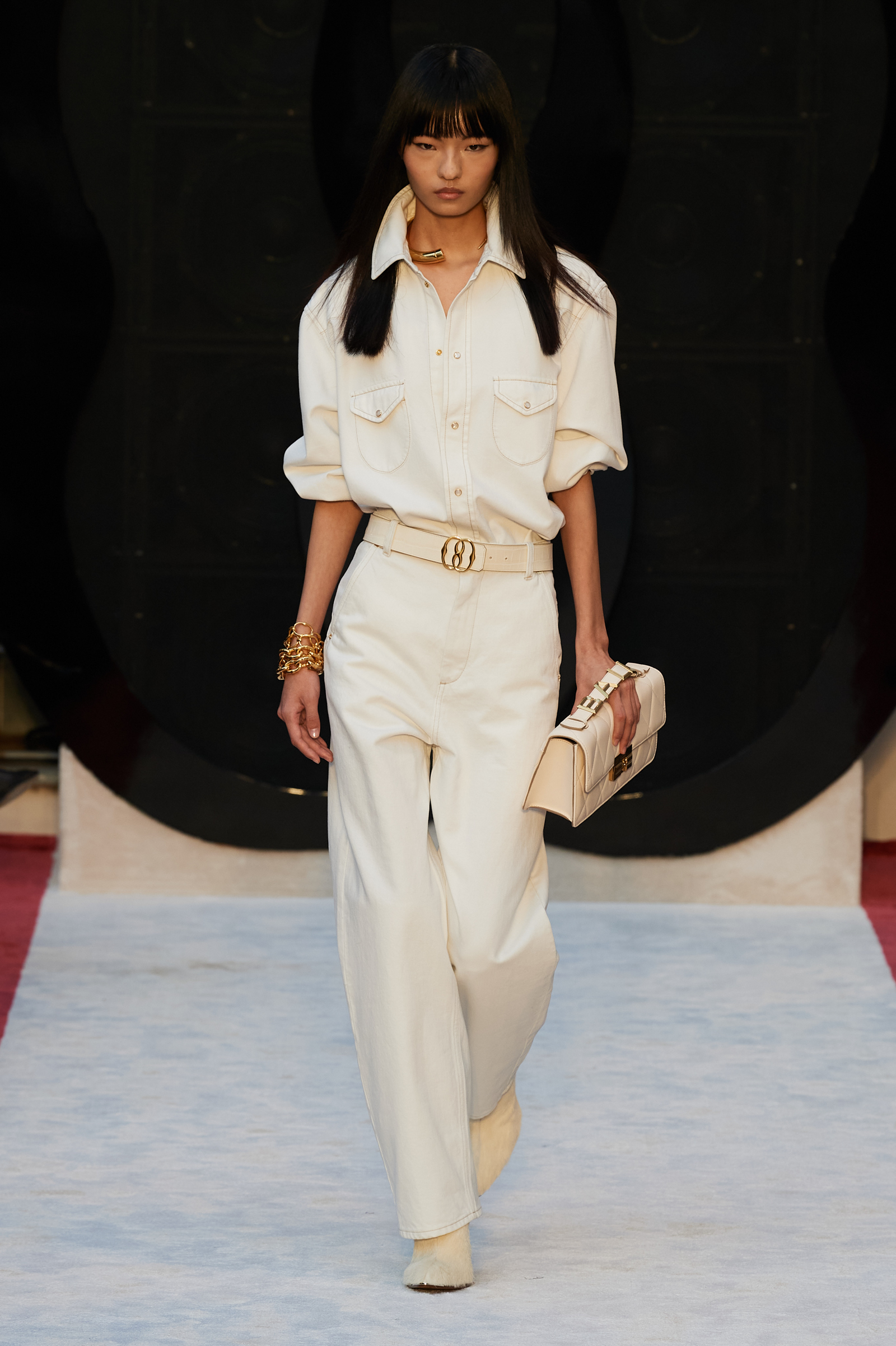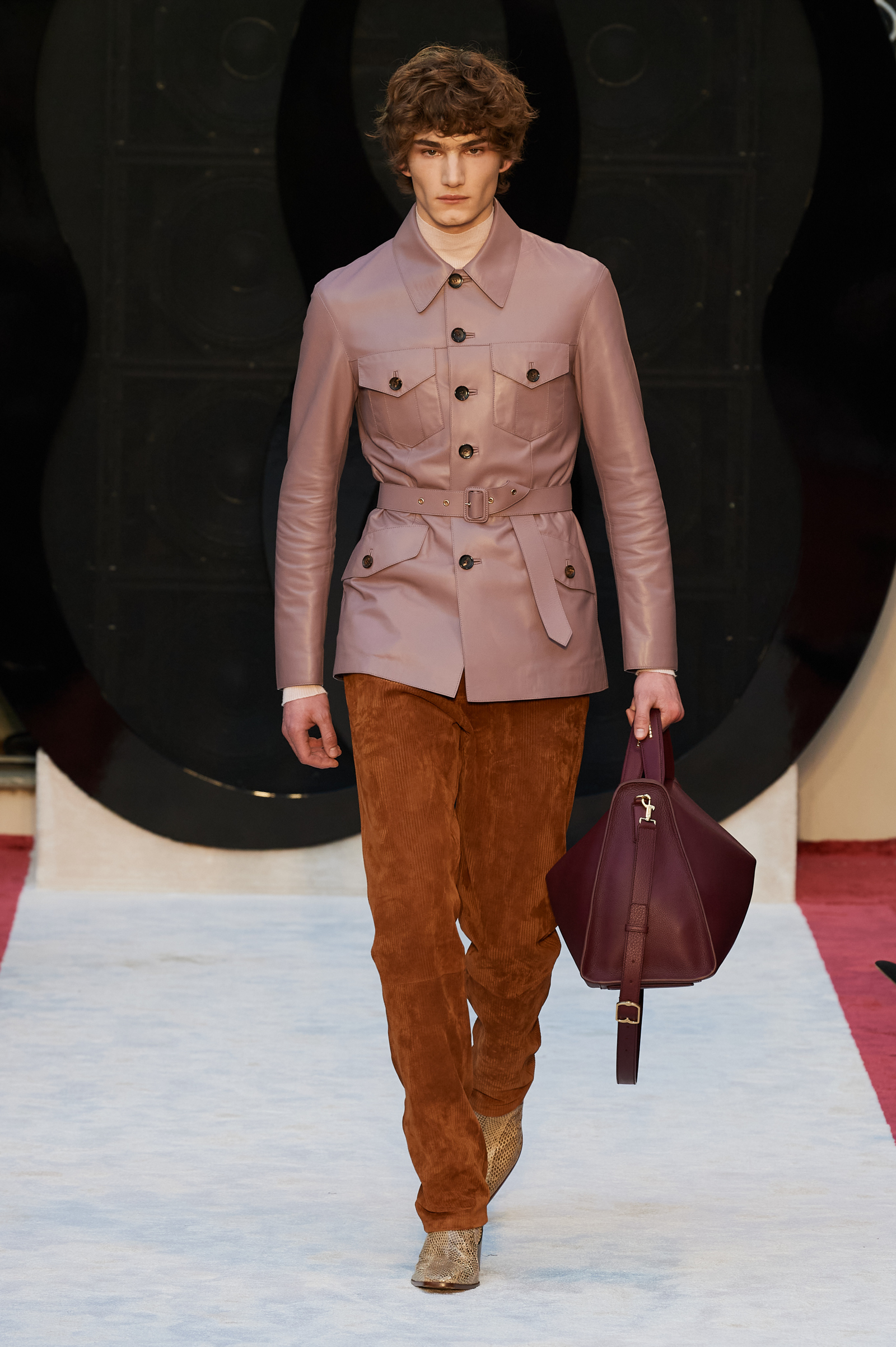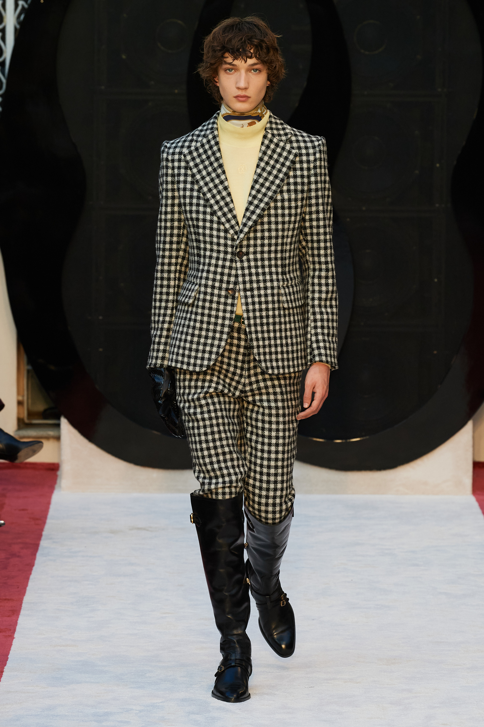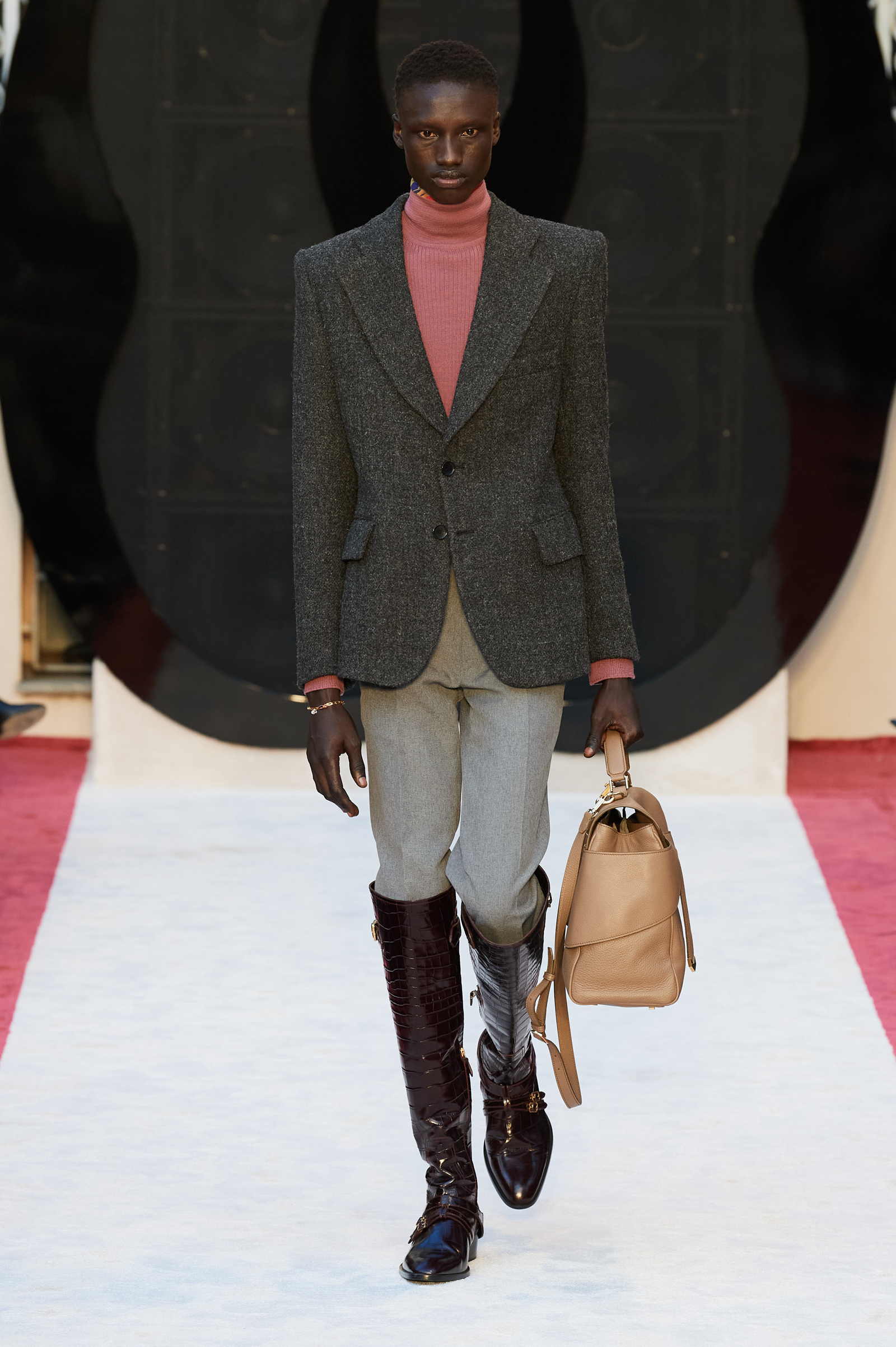 “It’s about slow travel,” said Villaseñor of his 20th century wardrobe shaped by a 21st century mindset. Non-literal references included Tommy Nutter shapes in the suiting, equestrian exclusivity in the boots, mercurial Miles Davis at Montreux in the archive-quilt black leather looks, Yves Saint Laurent in the hooded dresses, and all the foulard competitors in the straight-cut silk pants (for men) and handbags dressed in scarfs. Said Villaseñor: “When I was in my little corner of California reading Town & Country, trying to imagine myself eating truffles, this is what it looked like. It’s really opulent.”