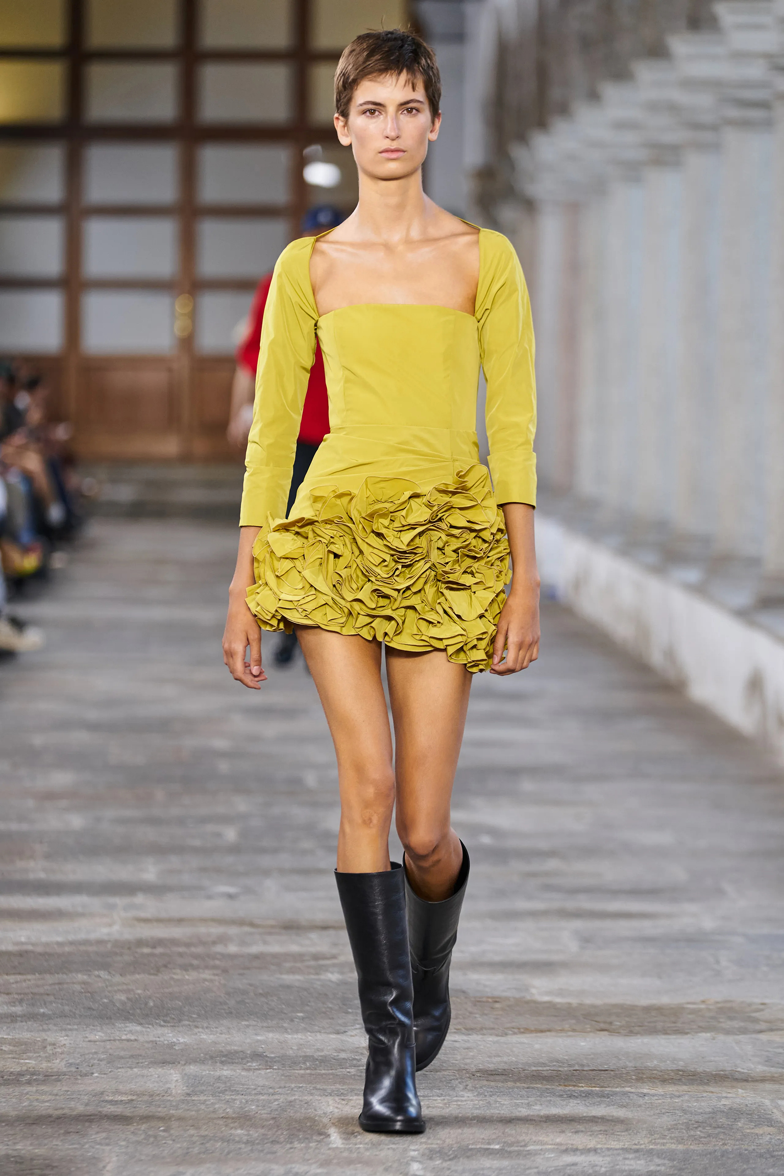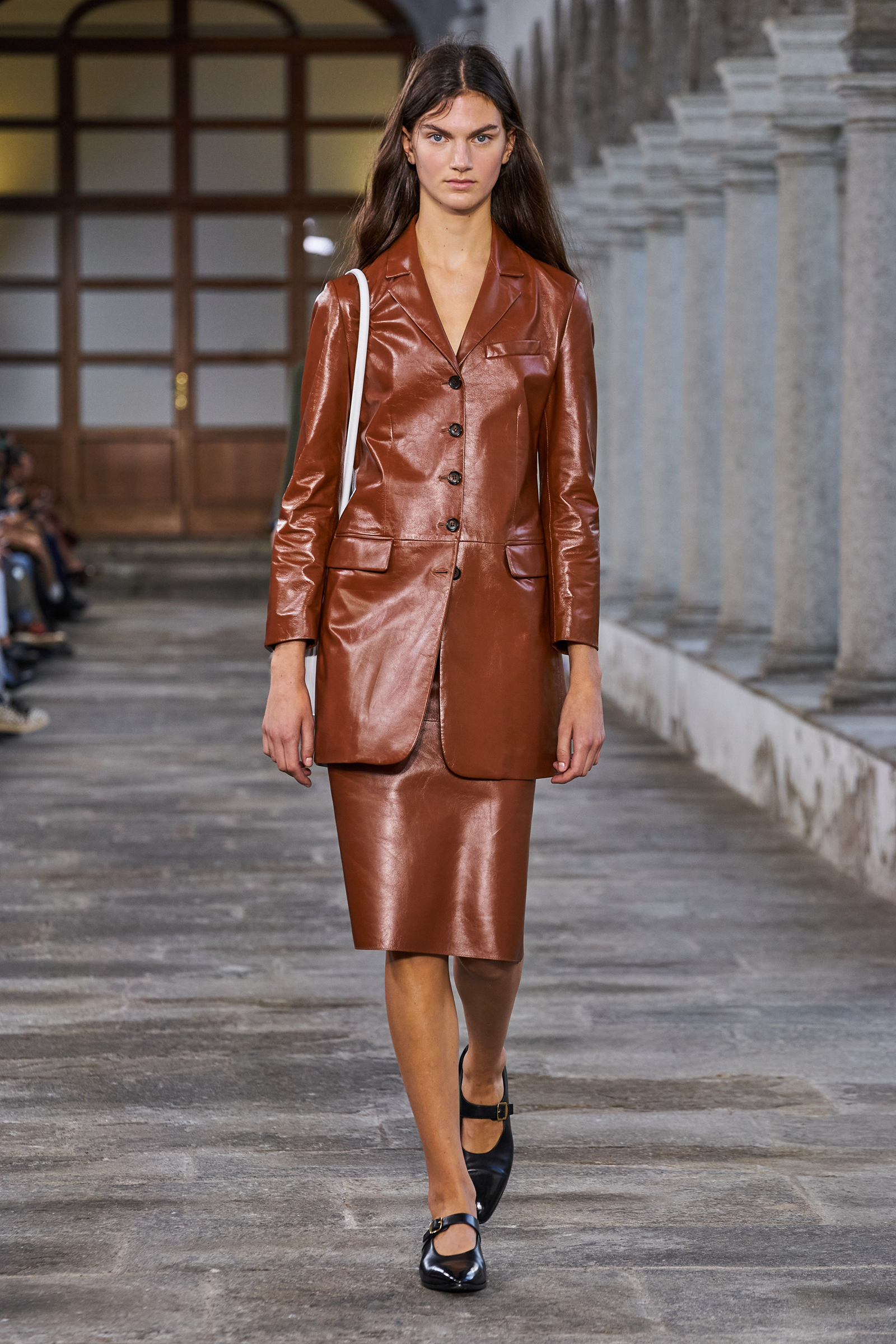 For both genders, outerwear was the collection’s core, cut with soft precision mostly in high-quality leather. Elongated straight-line or boxy blazers paired with matching shorts, pencil skirts or relaxed trousers were offered alongside A-line dusters and sleeveless zippered bombers and treated with a fresh, youthful approach. Eccentricity and the “out-of-control element,” as Bellotti put out, came by way of taffeta minicrinis, poufy ultra-short ballerina skirts or minuscule tutus made from swirls of rosettes and girandoles, peeking out from masculine trench hcoats in shiny black leather, or paired with a short-sleeved, square-cut office shirt in crisp Swiss poplin.